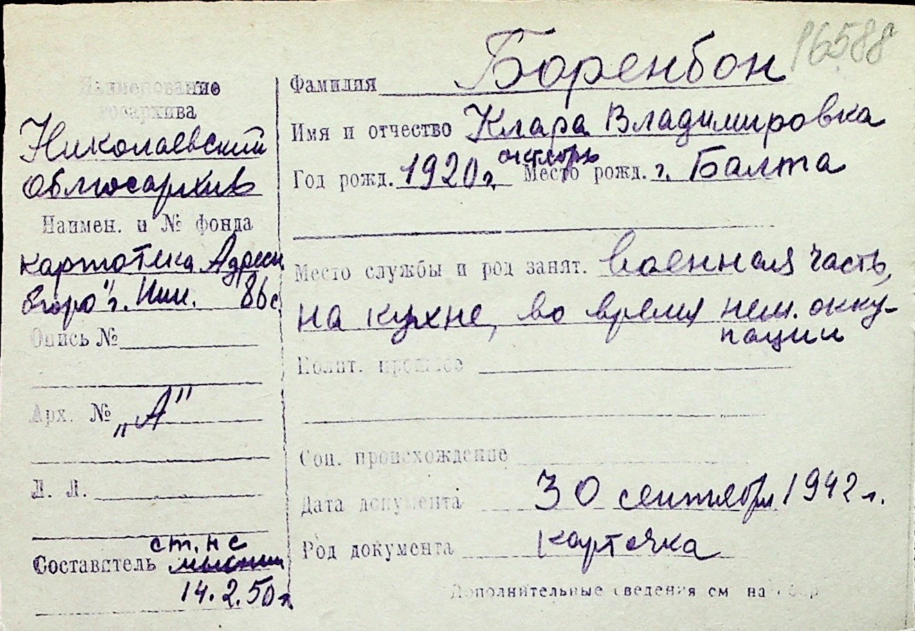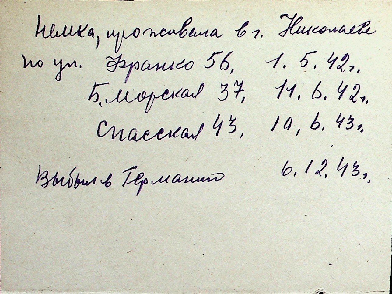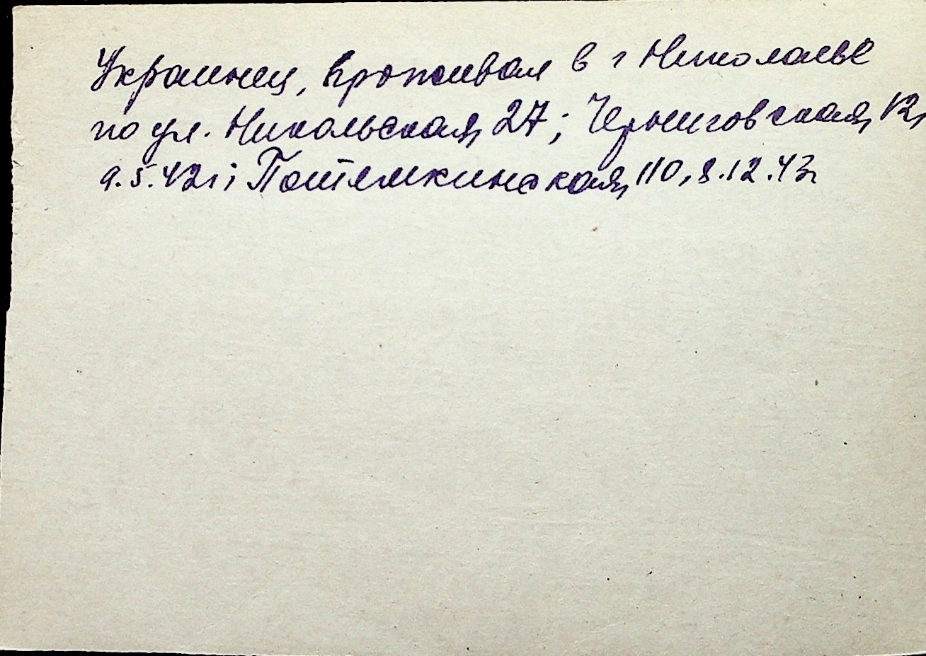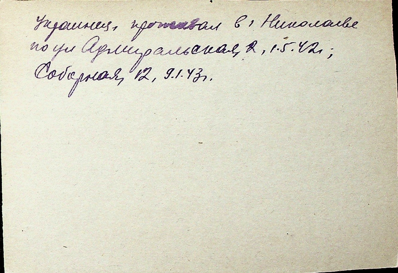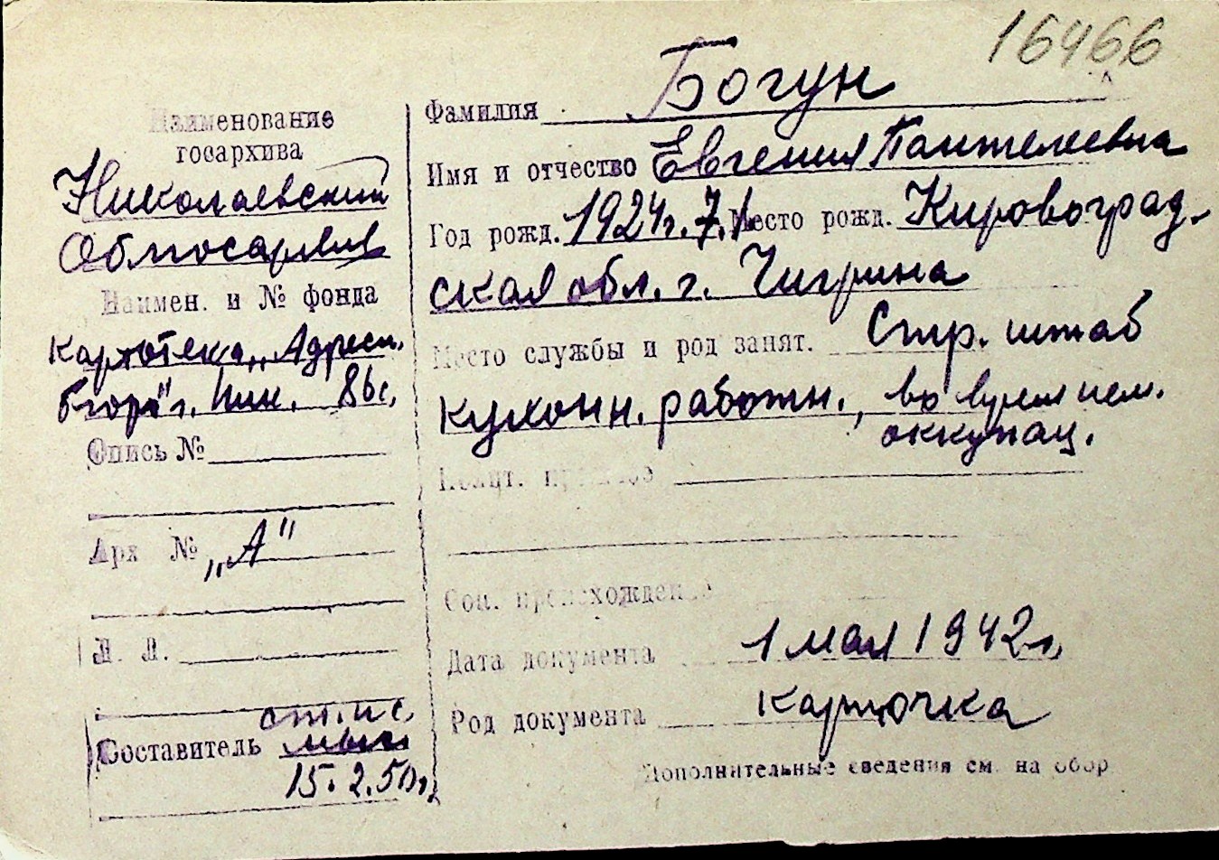 ◦ ◦ Перелік карток на осіб, які мешкали у м. Миколаїв у період окупації 1941–1944 років