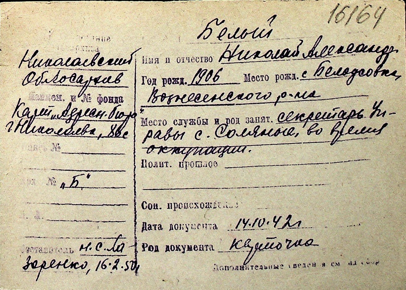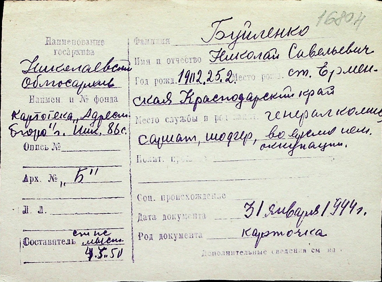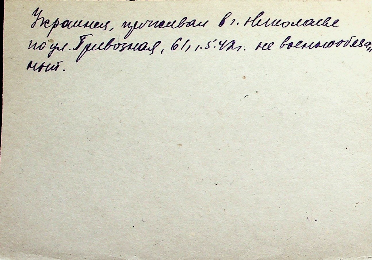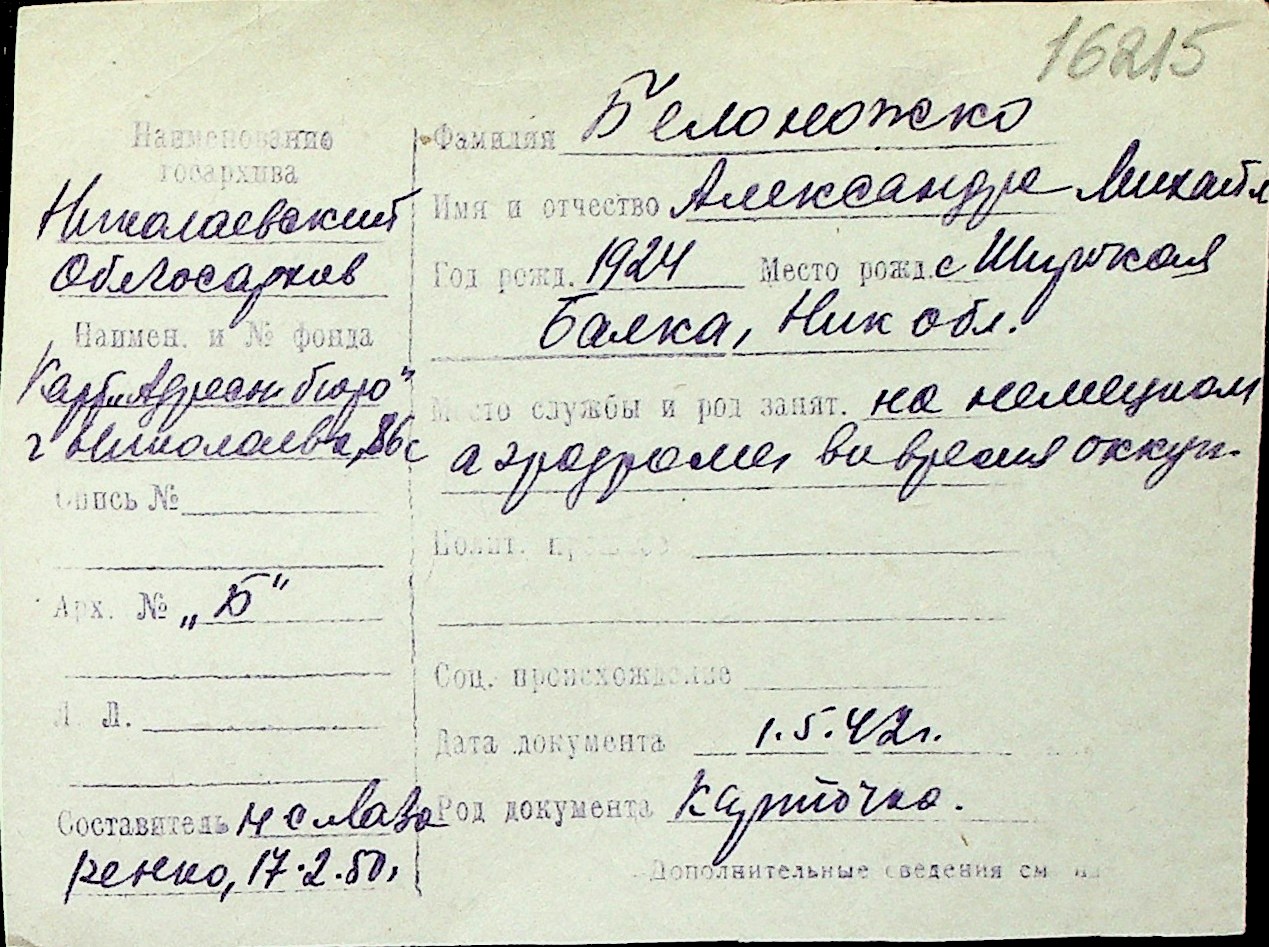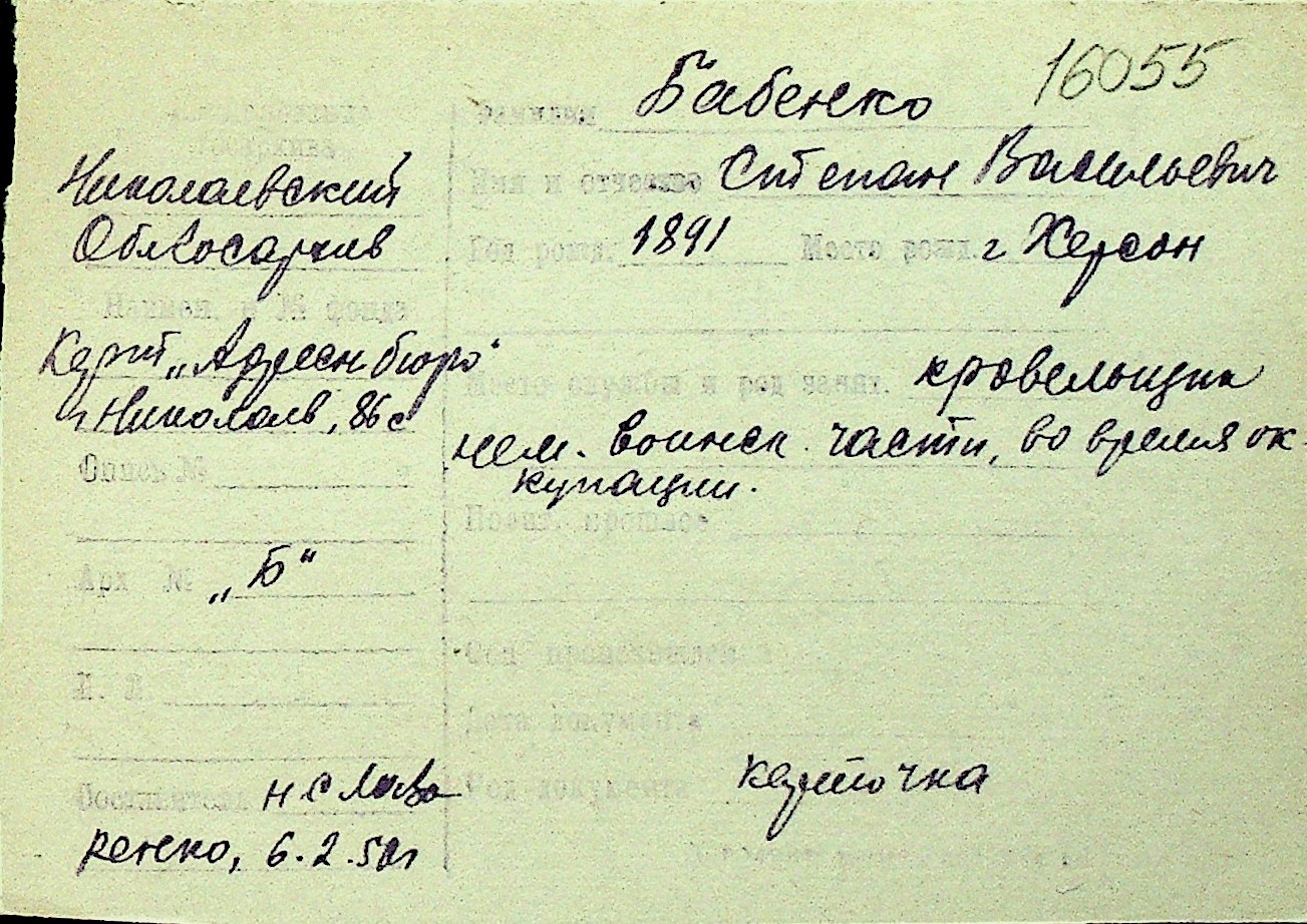 ◦ ◦ Перелік карток на осіб, які мешкали у м. Миколаїв у період окупації 1941–1944 років