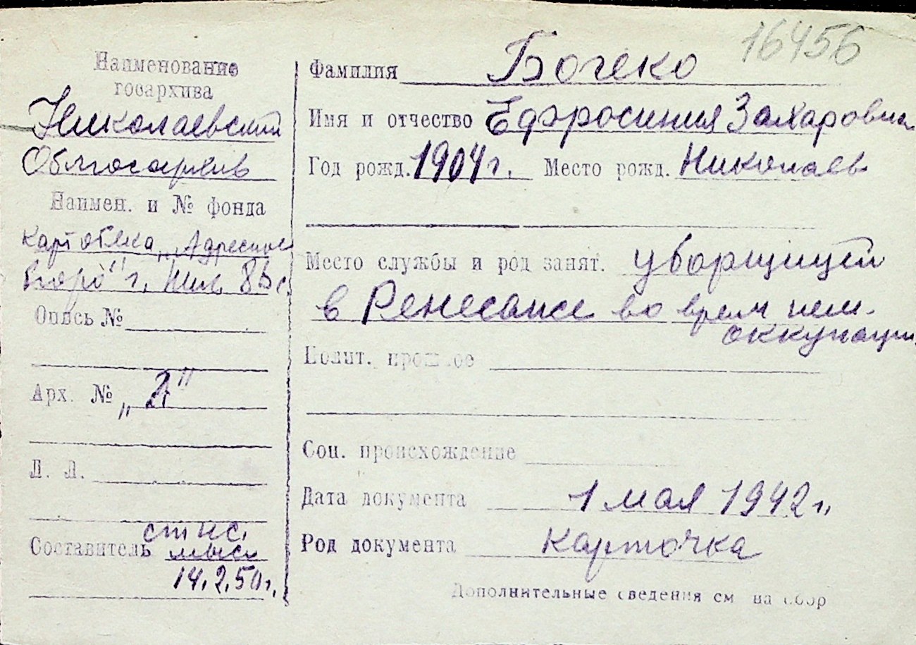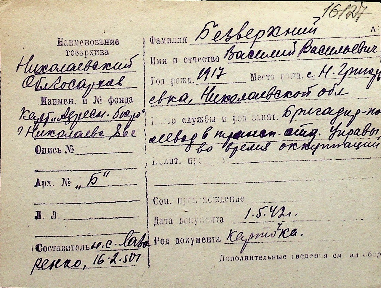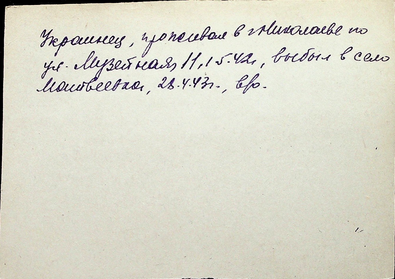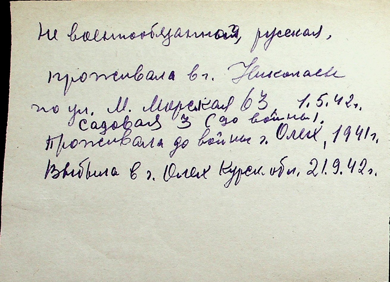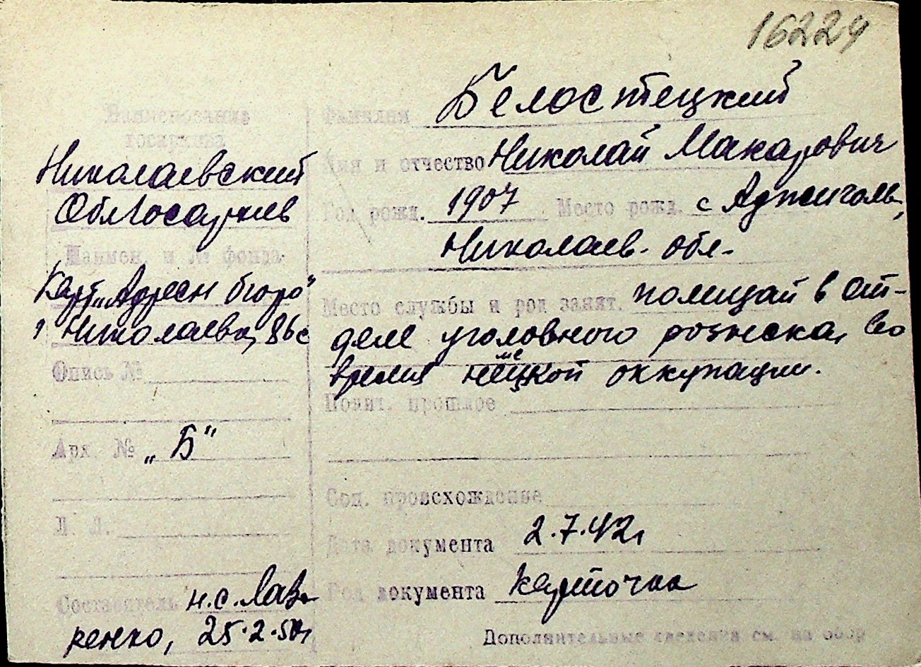 ◦ ◦ Перелік карток на осіб, які мешкали у м. Миколаїв у період окупації 1941–1944 років