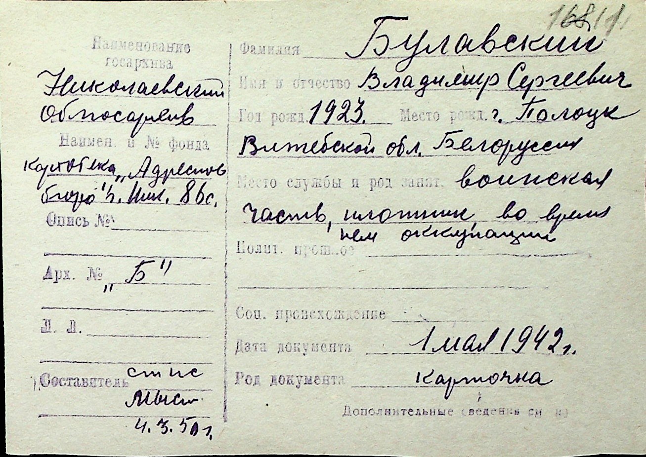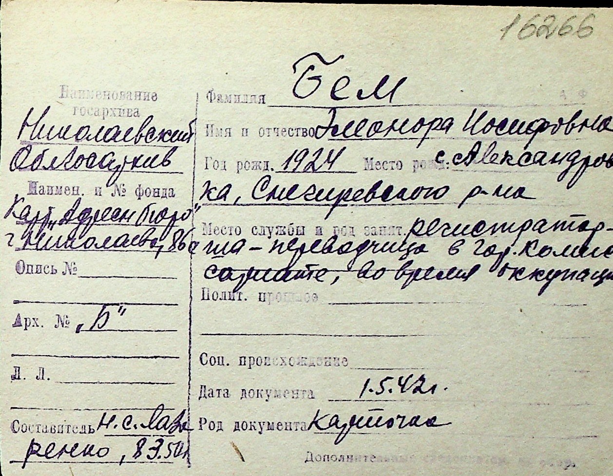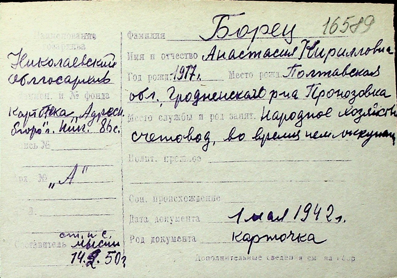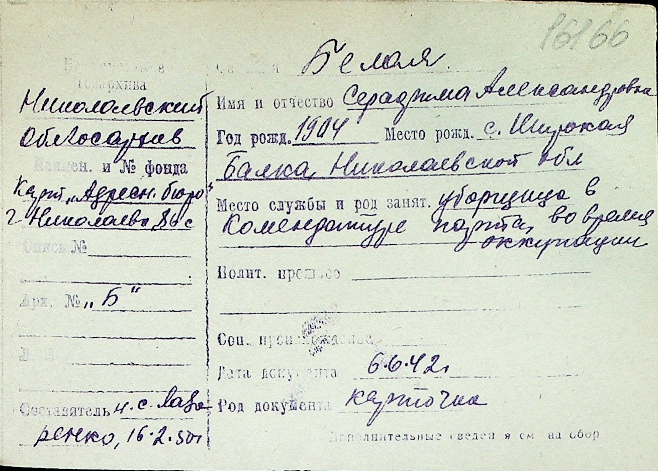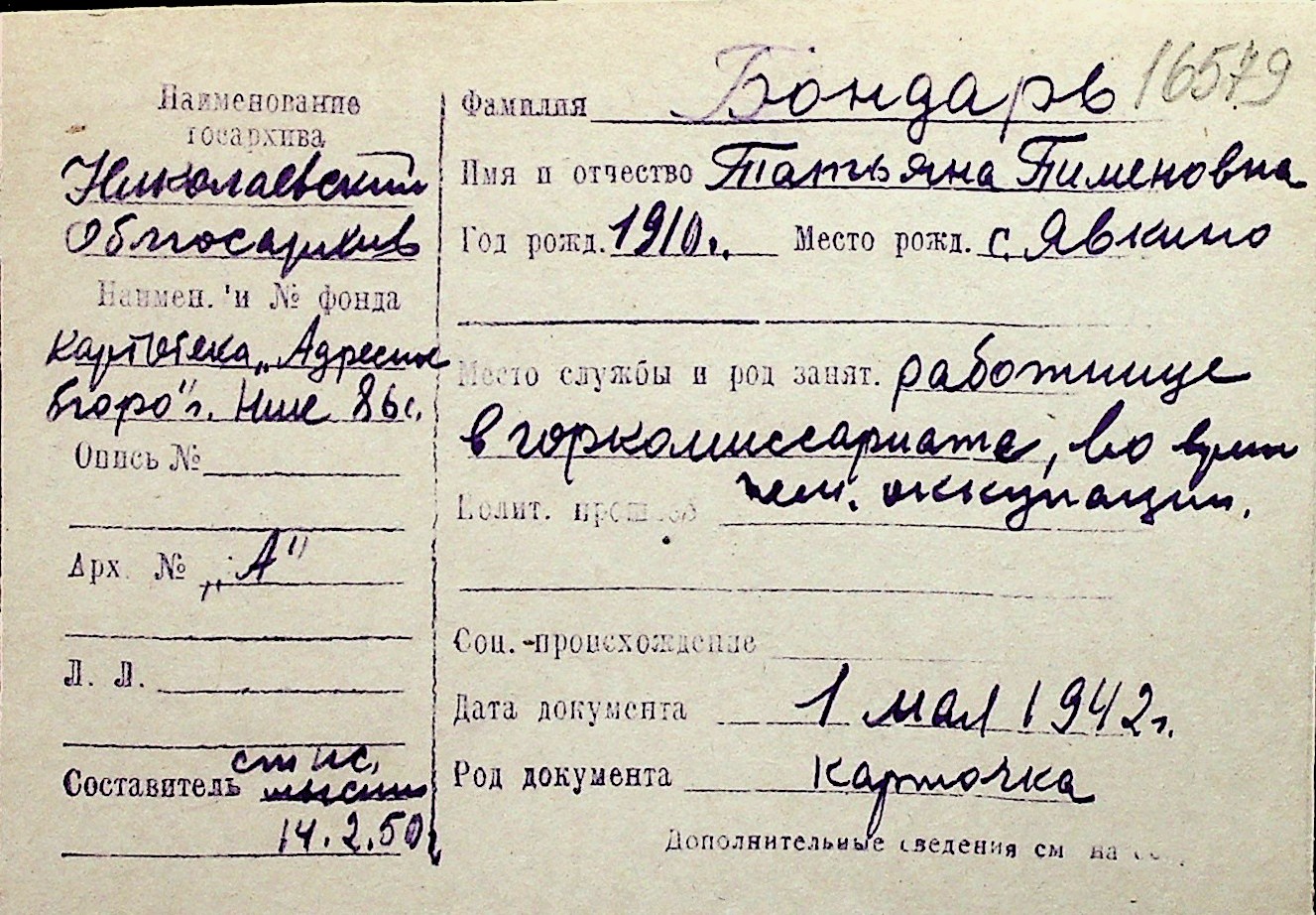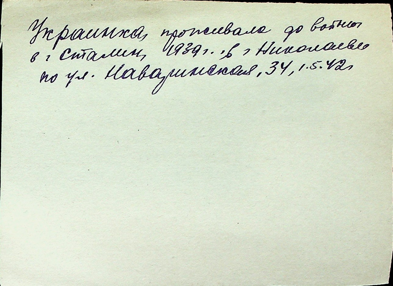 ◦ ◦ Перелік карток на осіб, які мешкали у м. Миколаїв у період окупації 1941–1944 років
