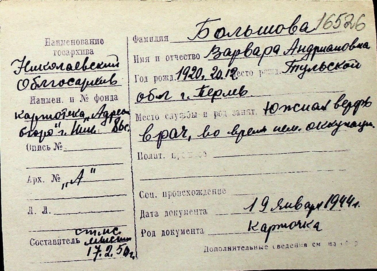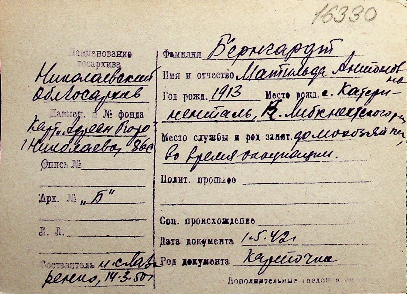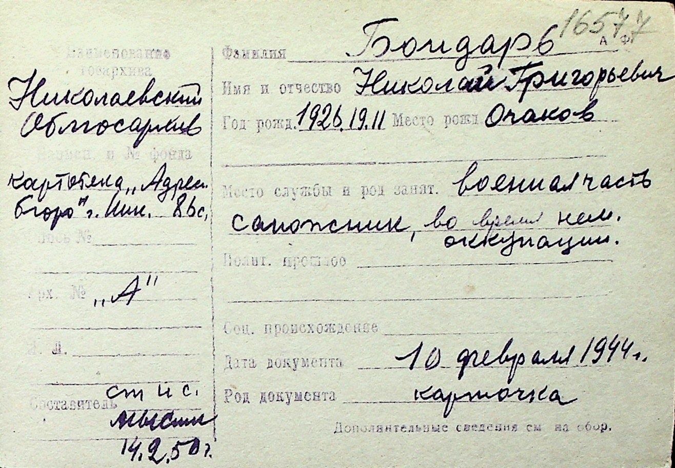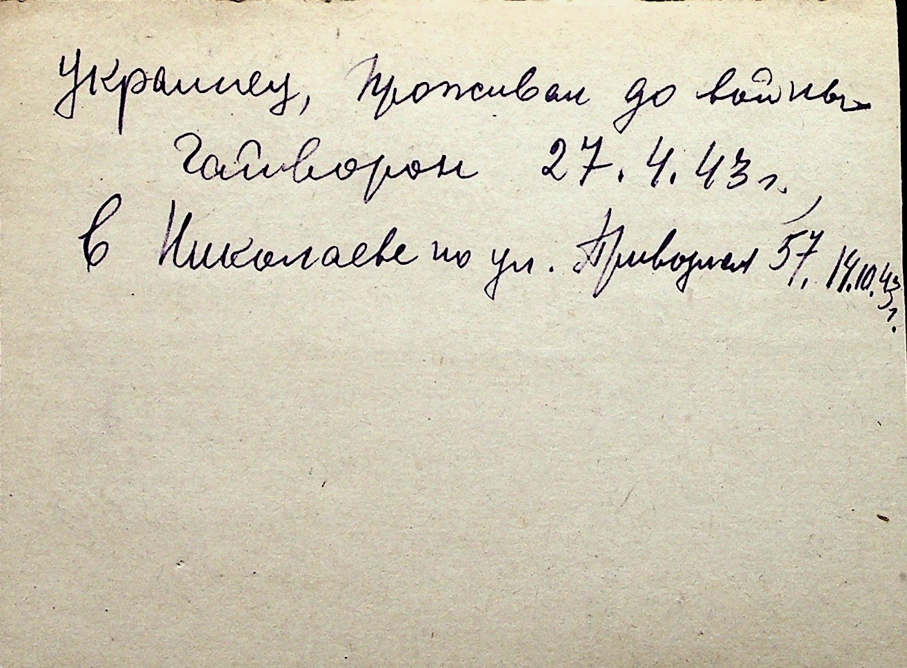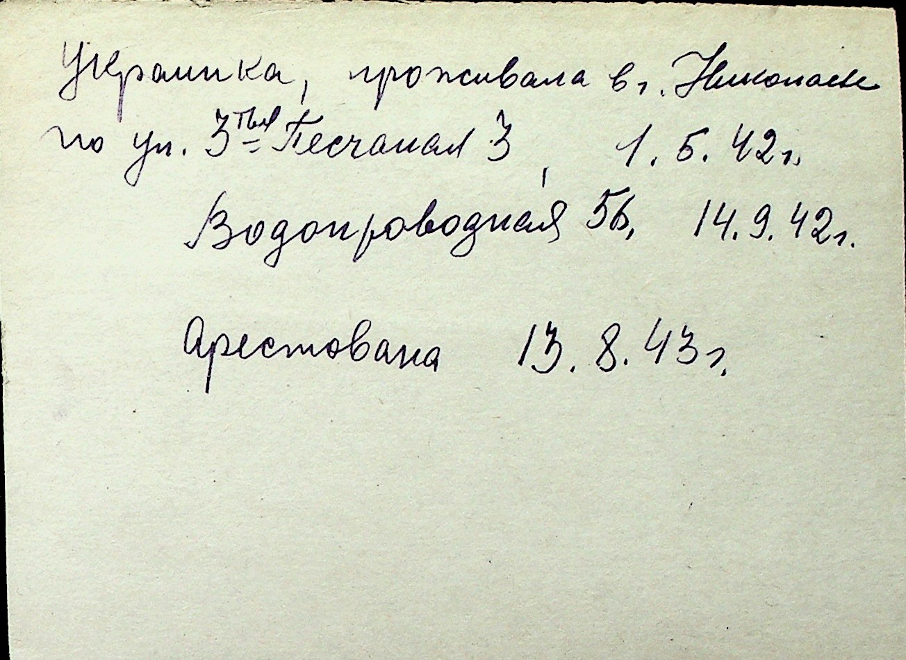 ◦ ◦ Перелік карток на осіб, які мешкали у м. Миколаїв у період окупації 1941–1944 років