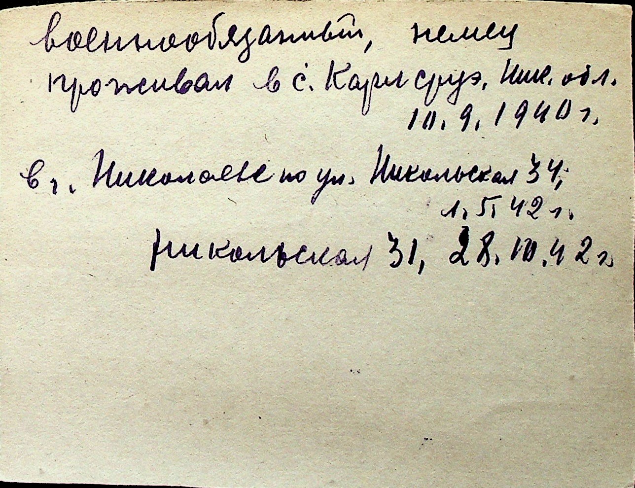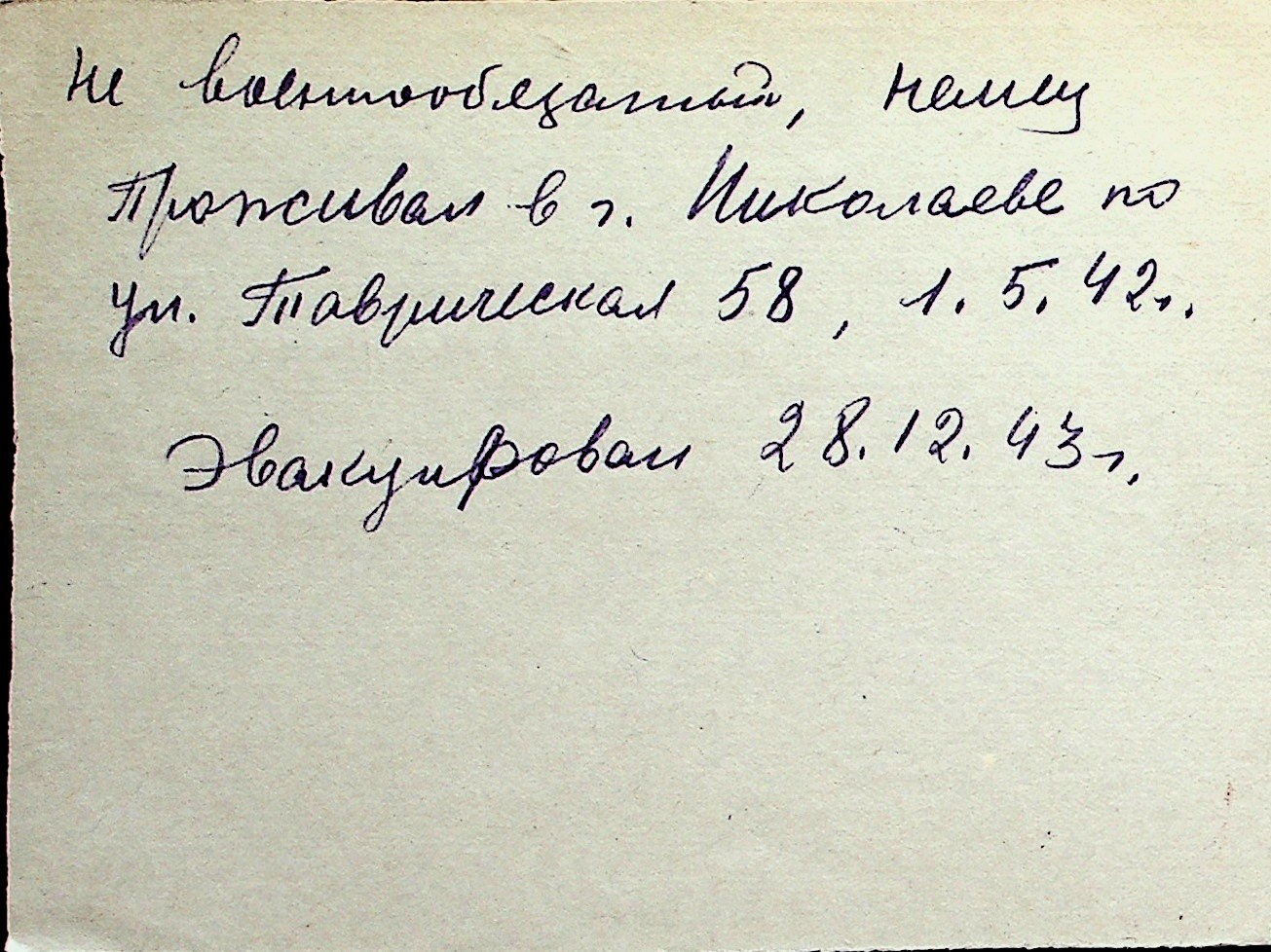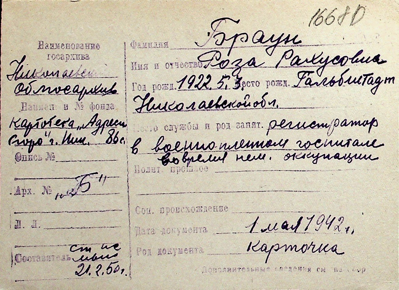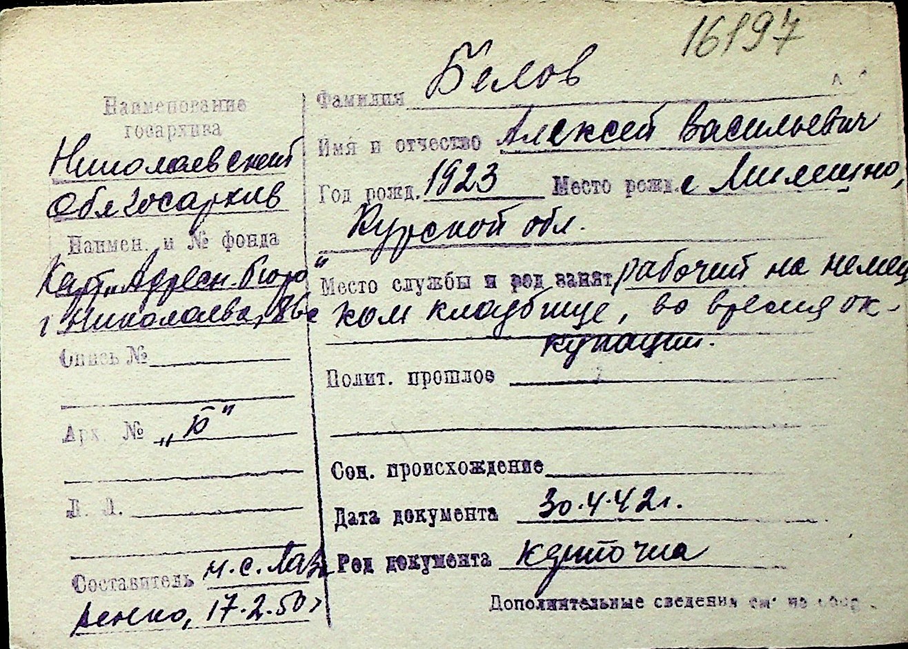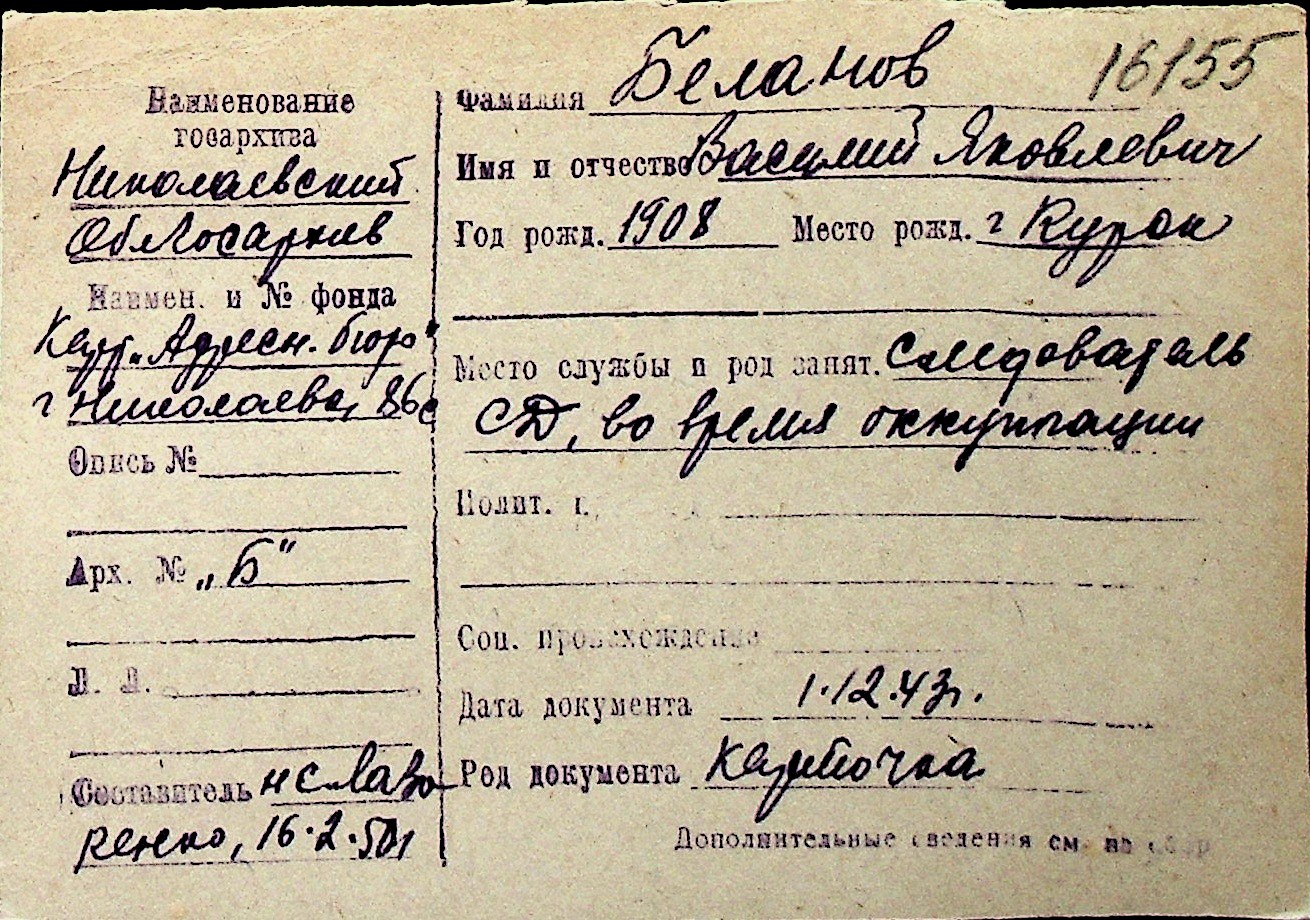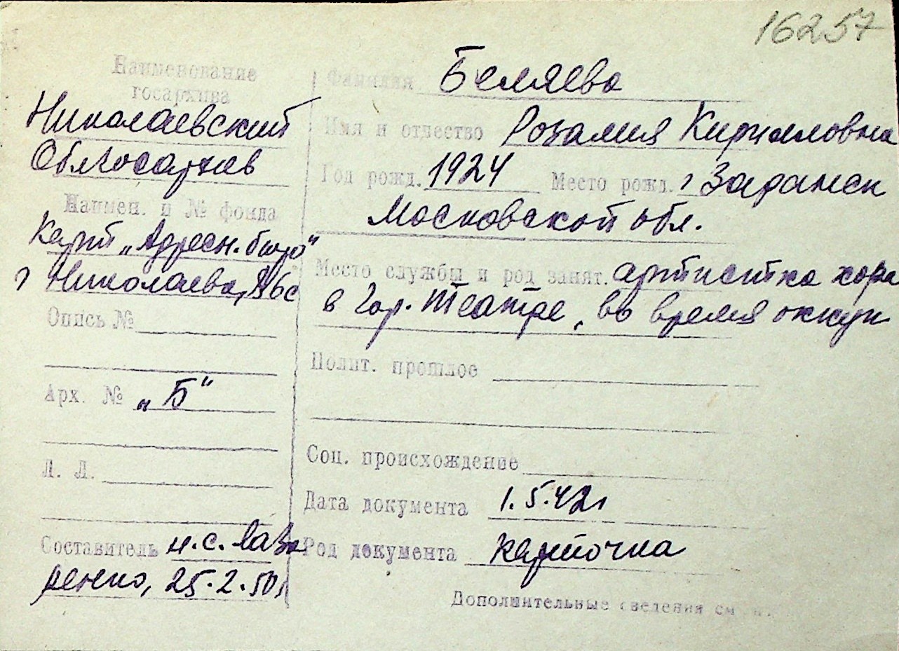 ◦ ◦ Перелік карток на осіб, які мешкали у м. Миколаїв у період окупації 1941–1944 років