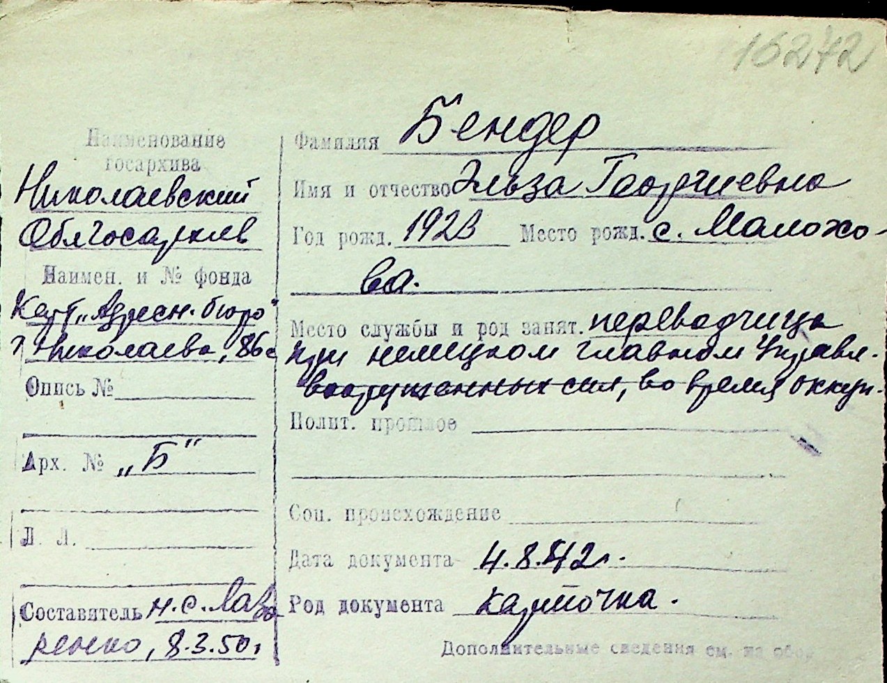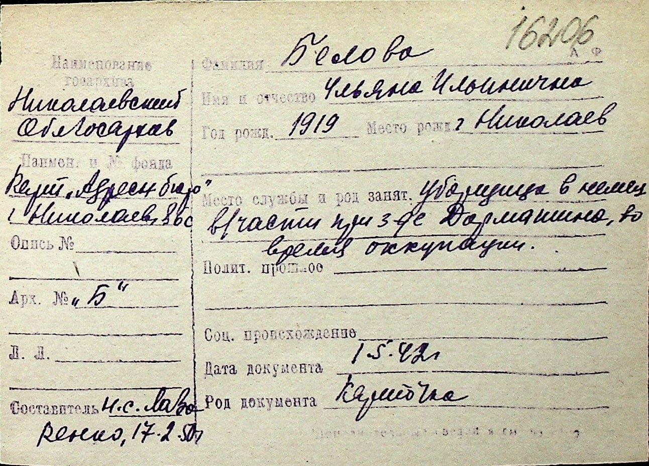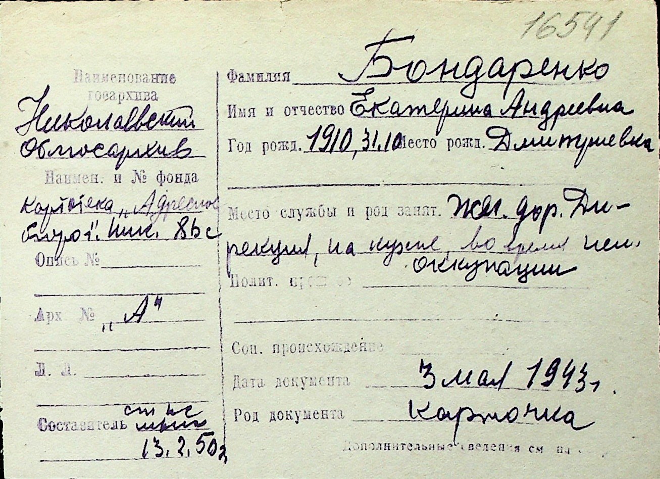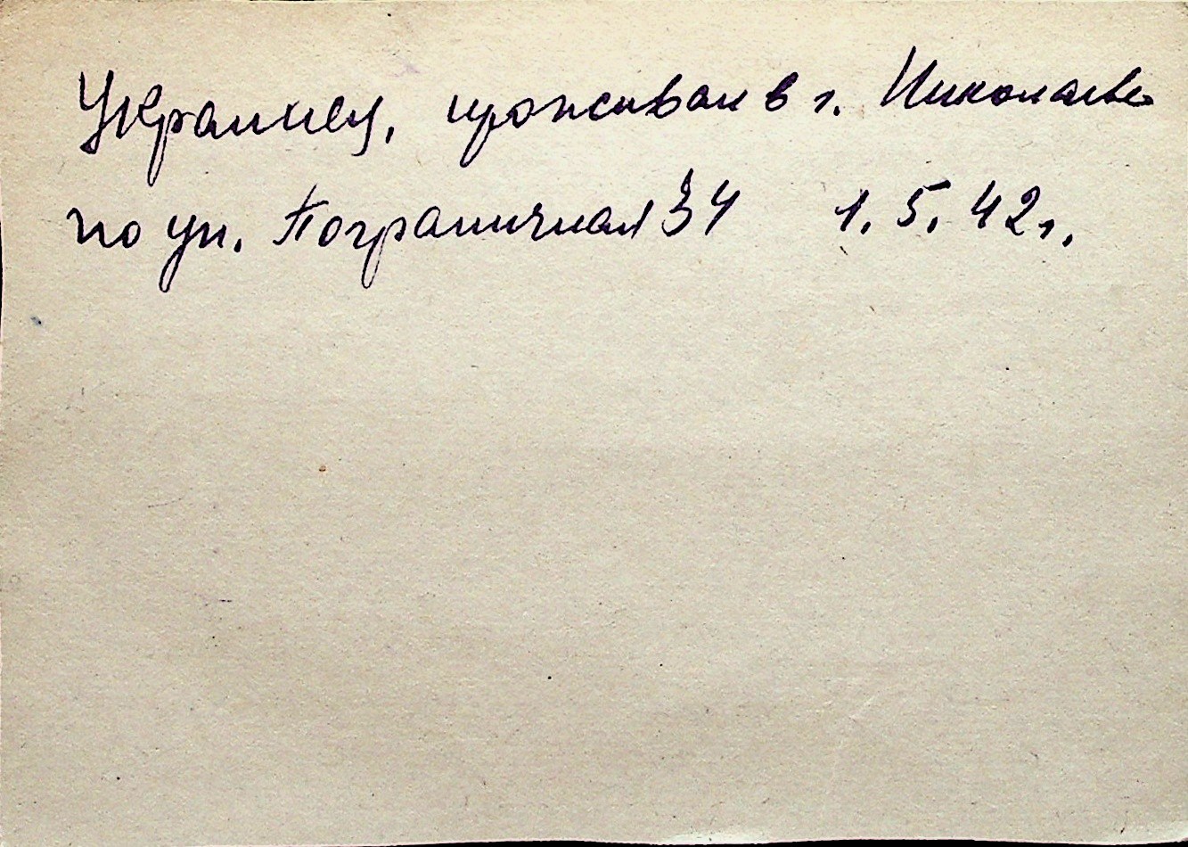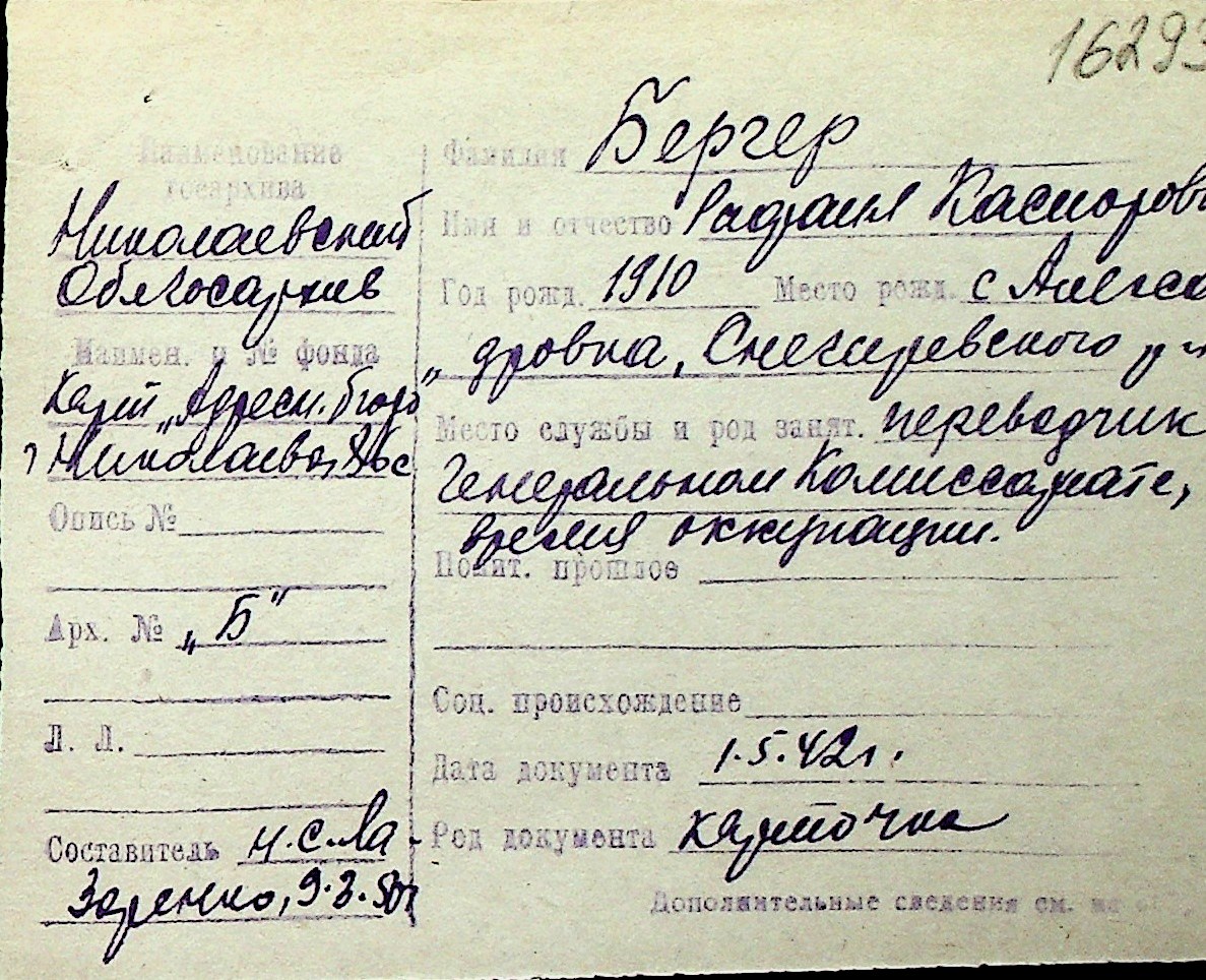 ◦ ◦ Перелік карток на осіб, які мешкали у м. Миколаїв у період окупації 1941–1944 років