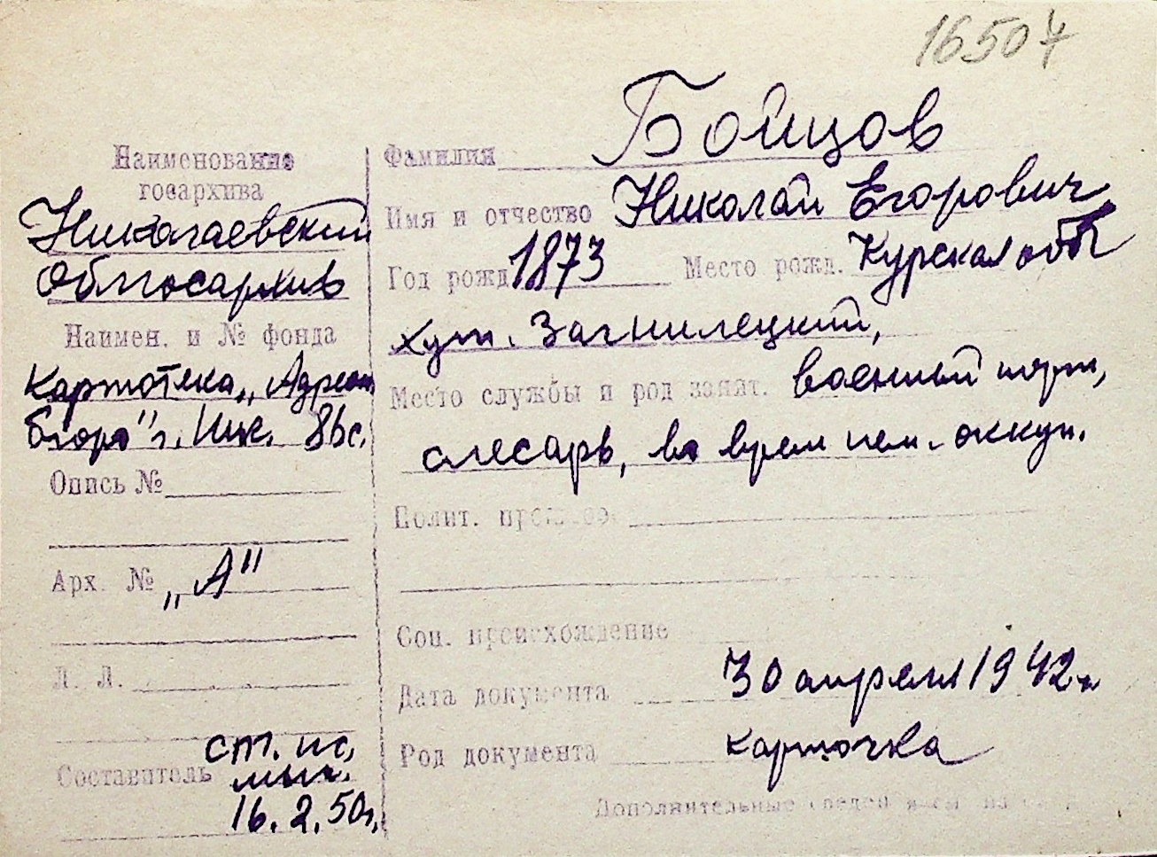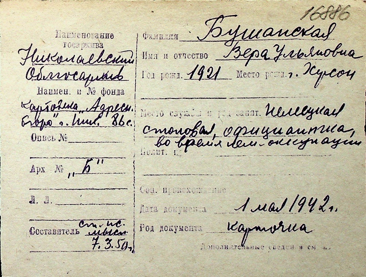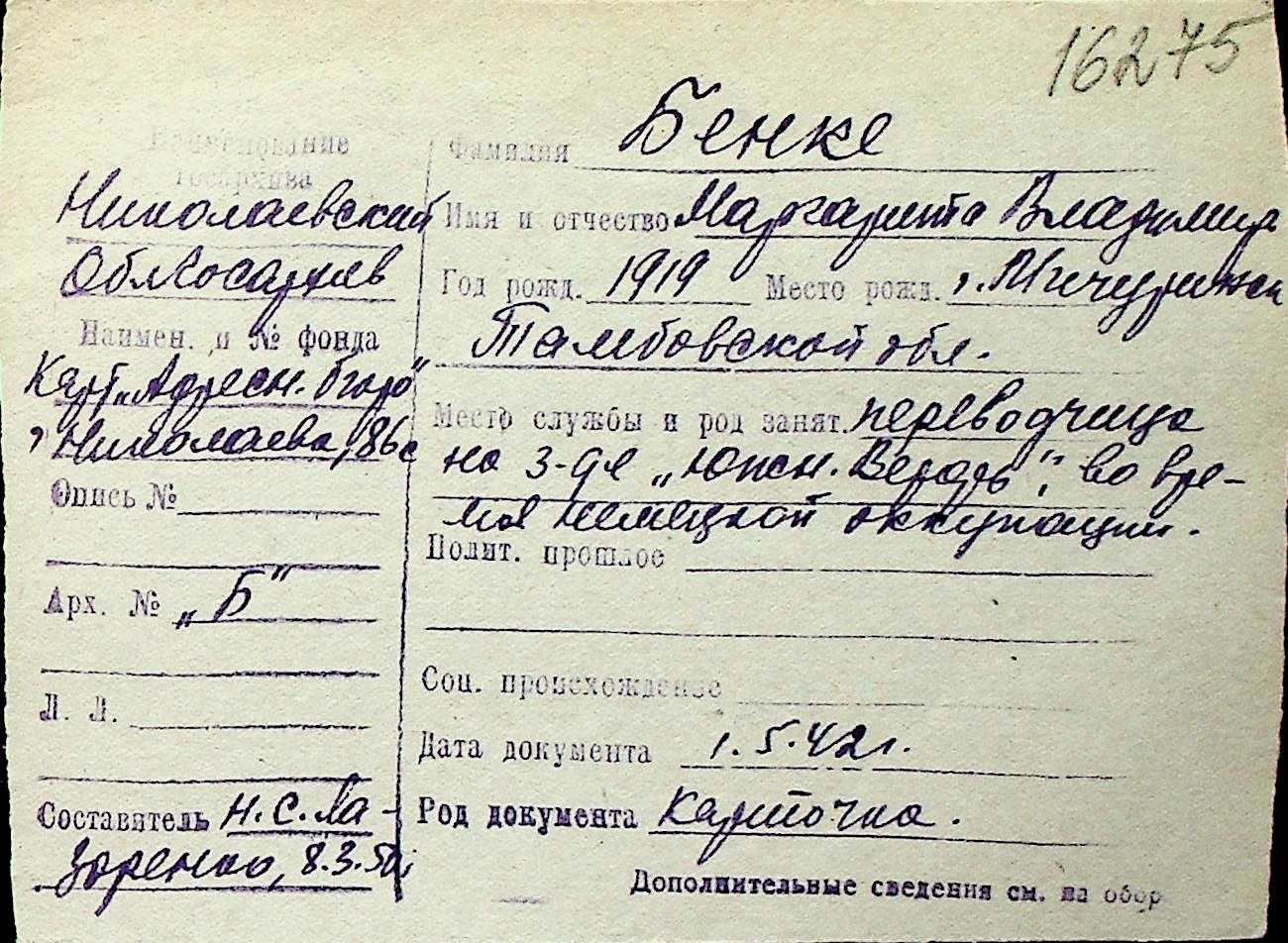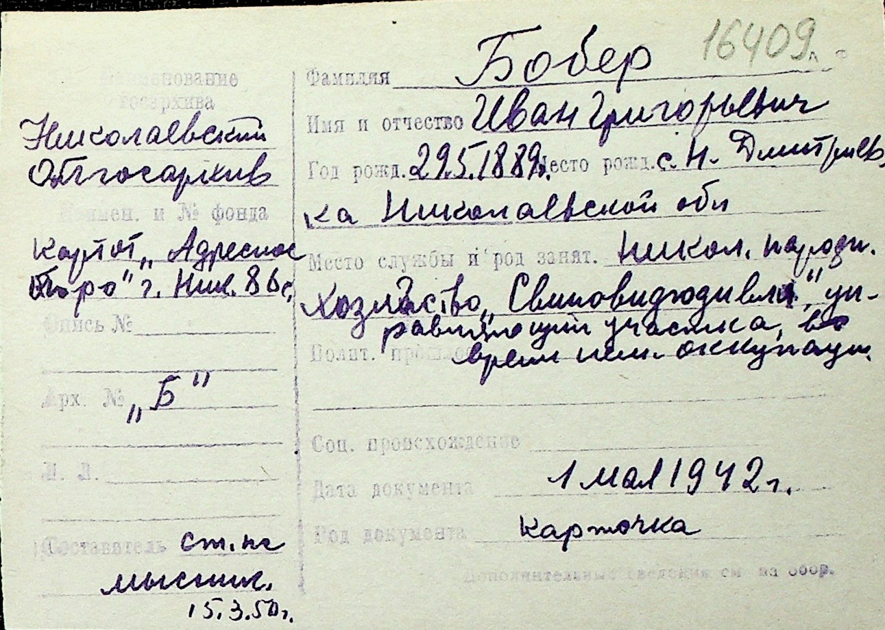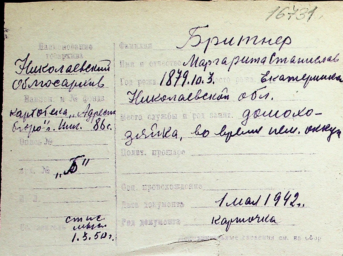 ◦ ◦ Перелік карток на осіб, які мешкали у м. Миколаїв у період окупації 1941–1944 років