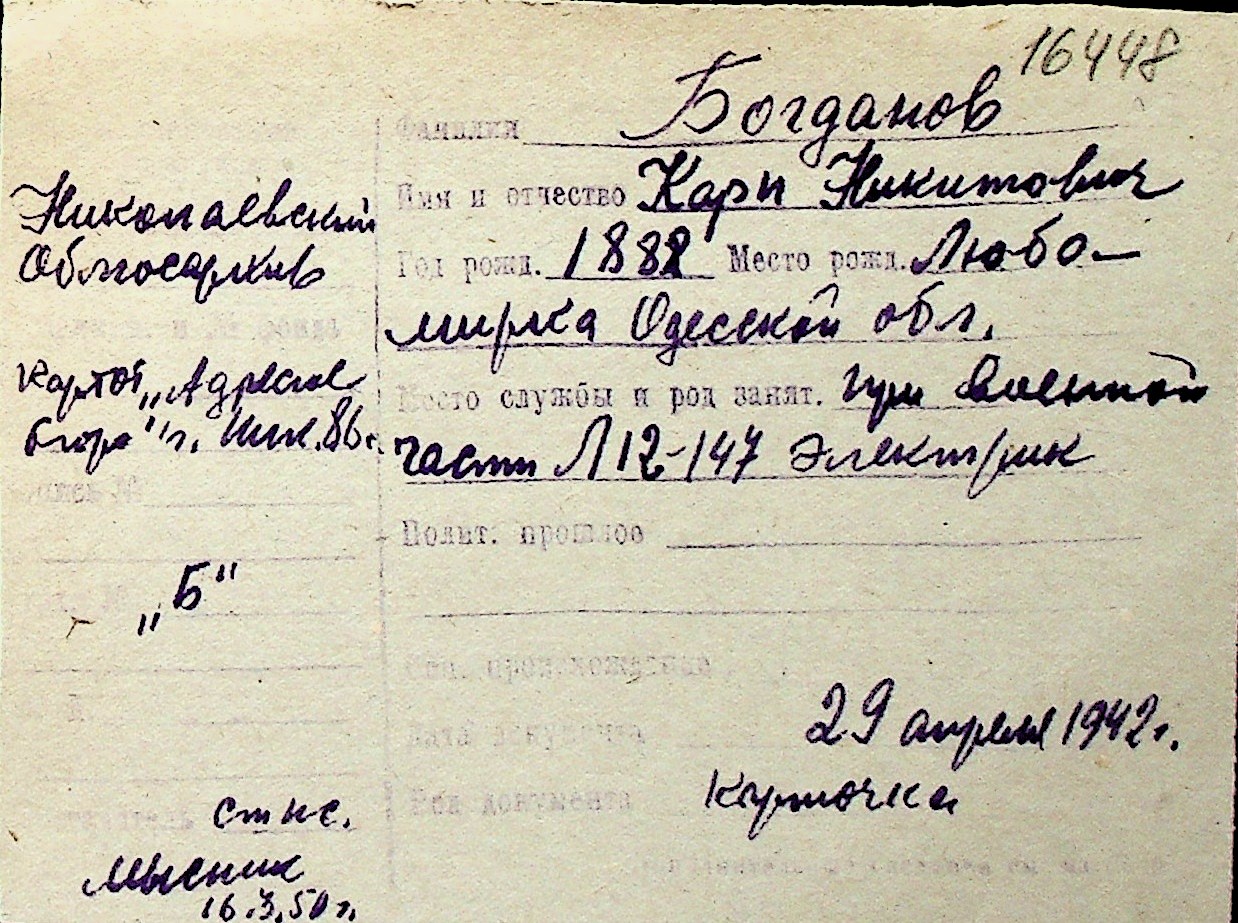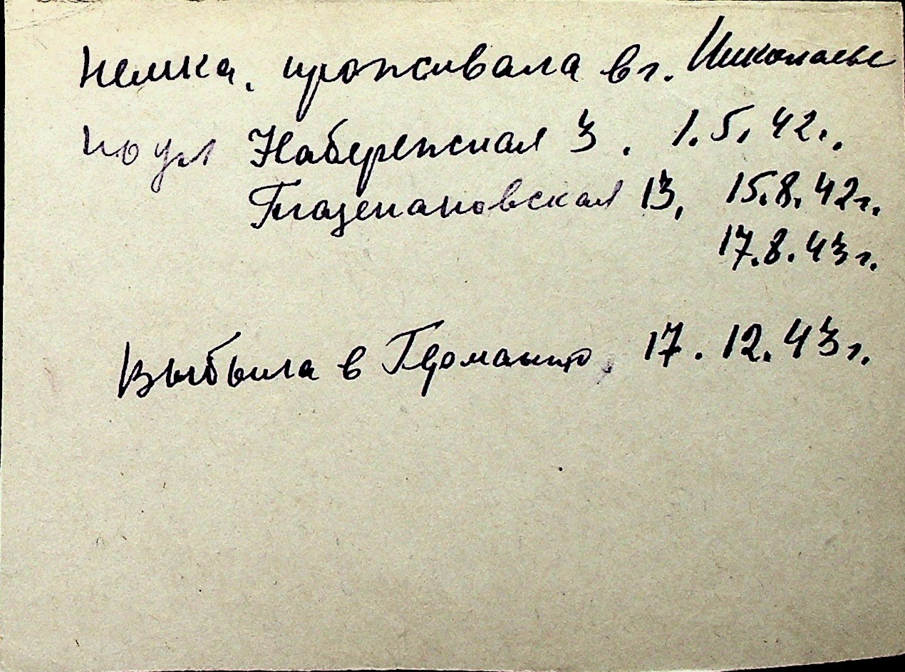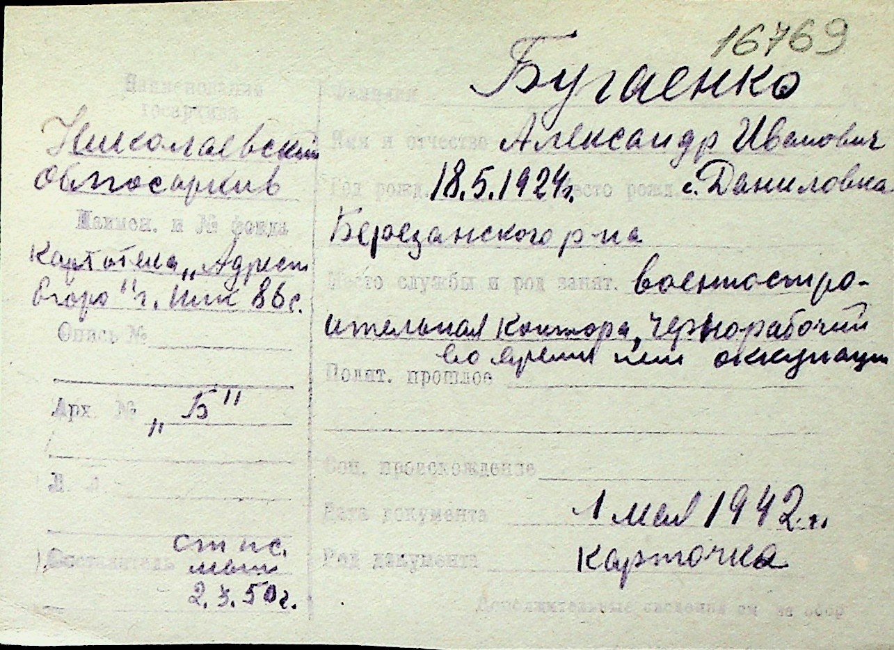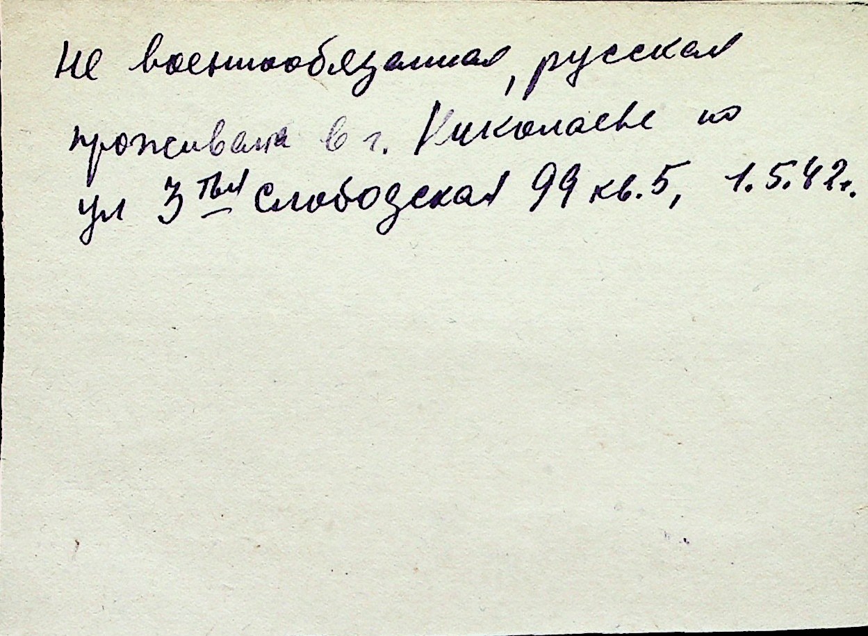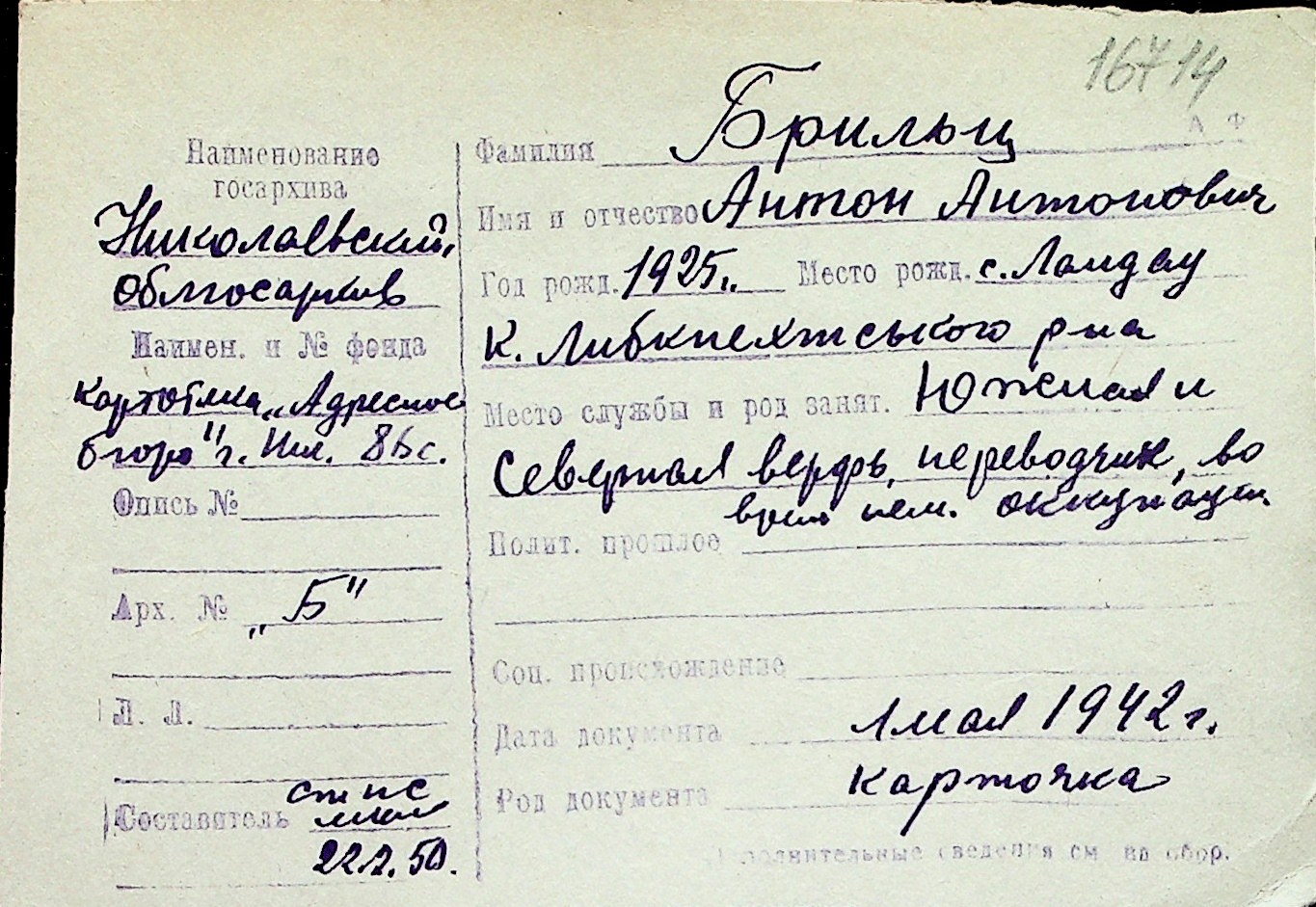 ◦ ◦ Перелік карток на осіб, які мешкали у м. Миколаїв у період окупації 1941–1944 років