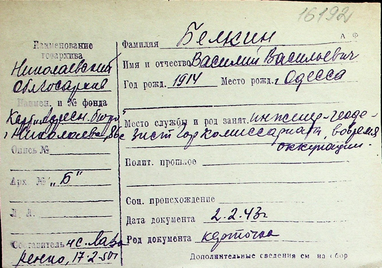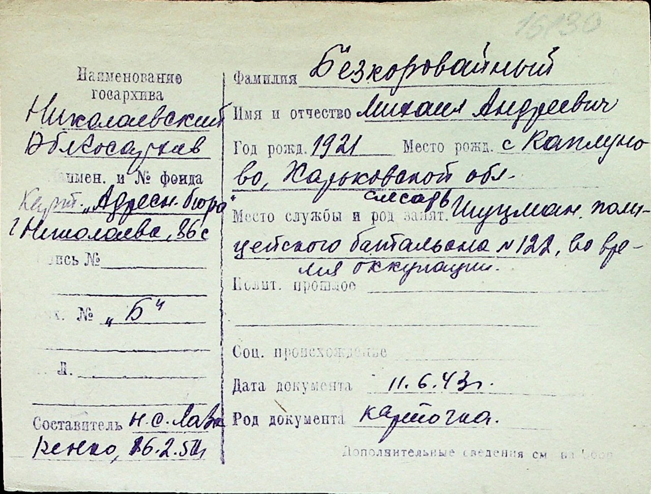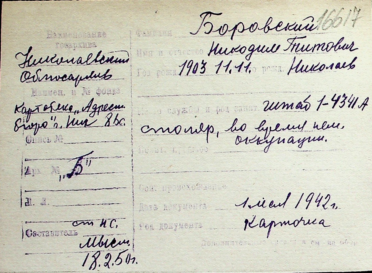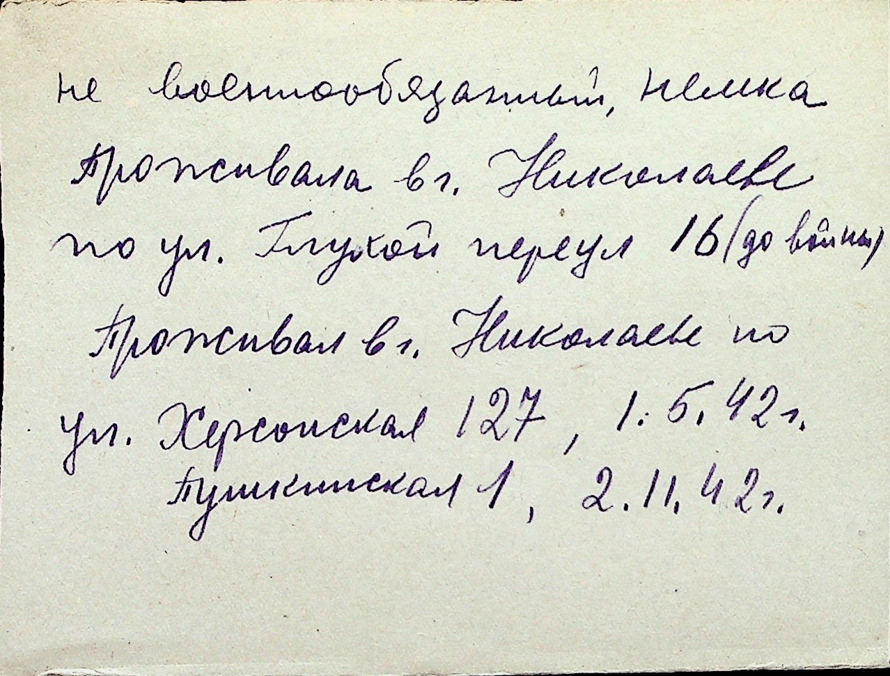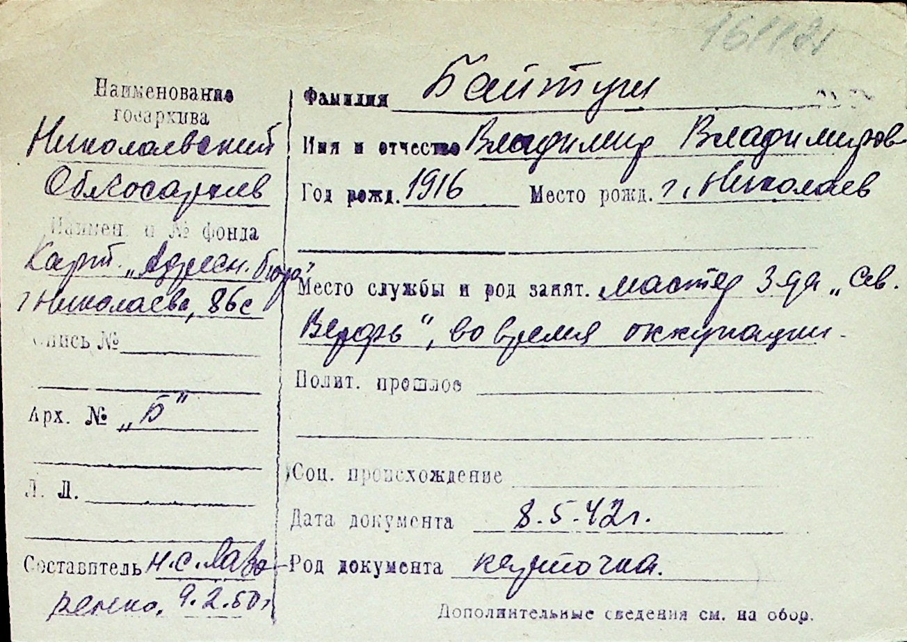 ◦ ◦ Перелік карток на осіб, які мешкали у м. Миколаїв у період окупації 1941–1944 років