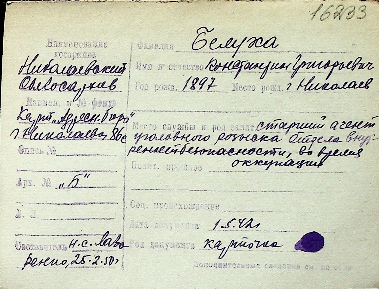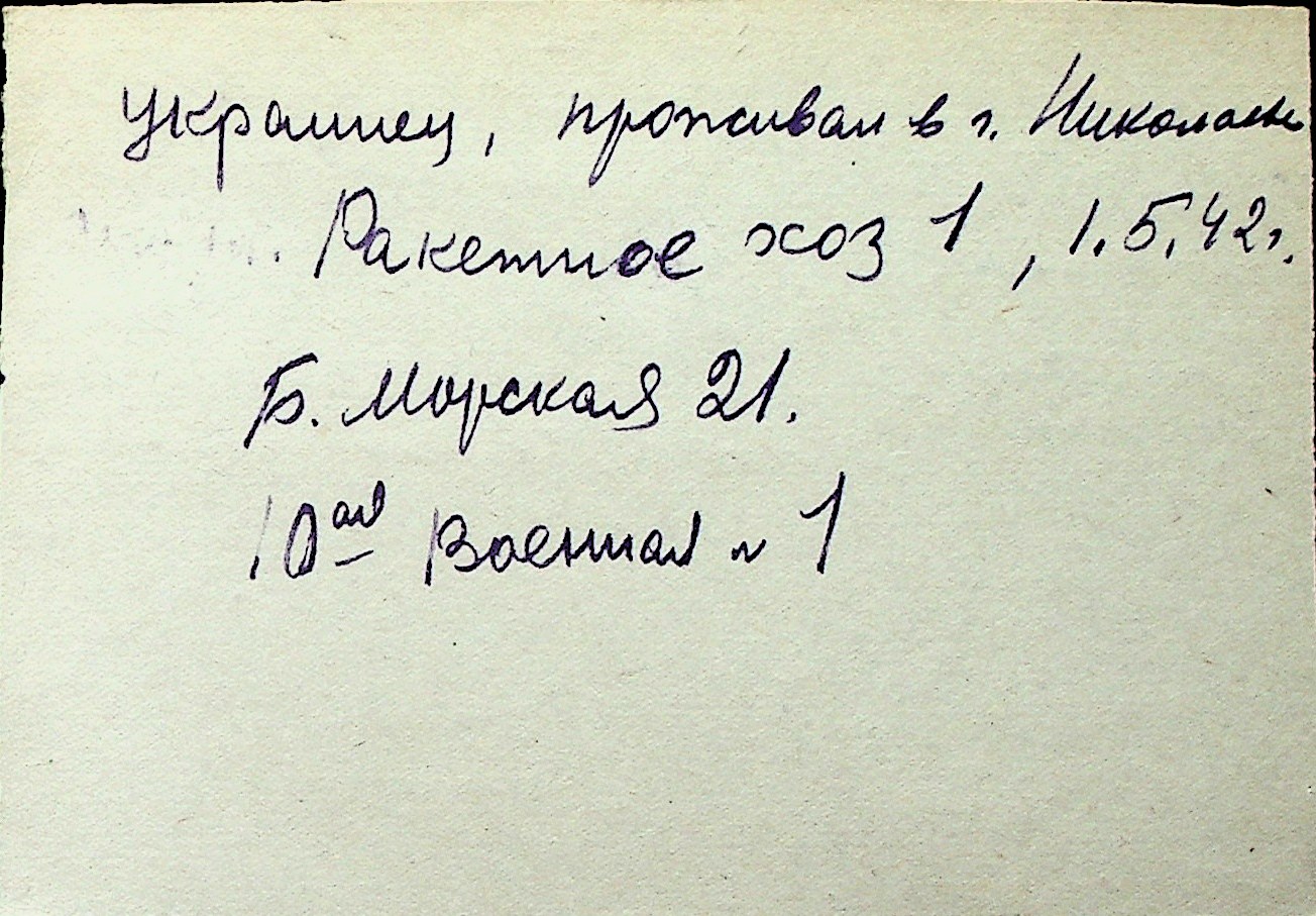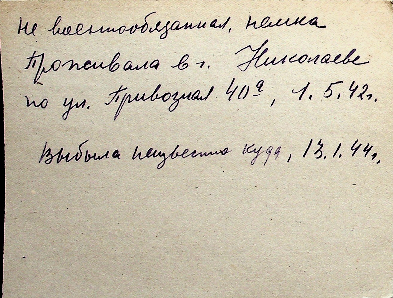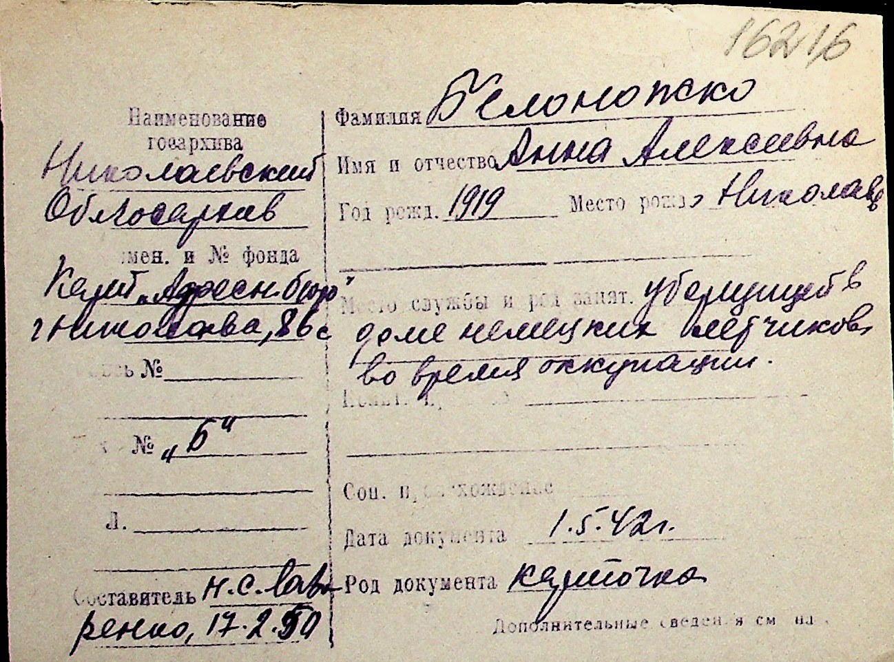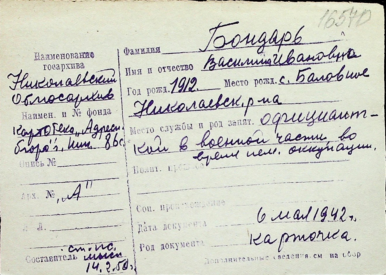 ◦ ◦ Перелік карток на осіб, які мешкали у м. Миколаїв у період окупації 1941–1944 років