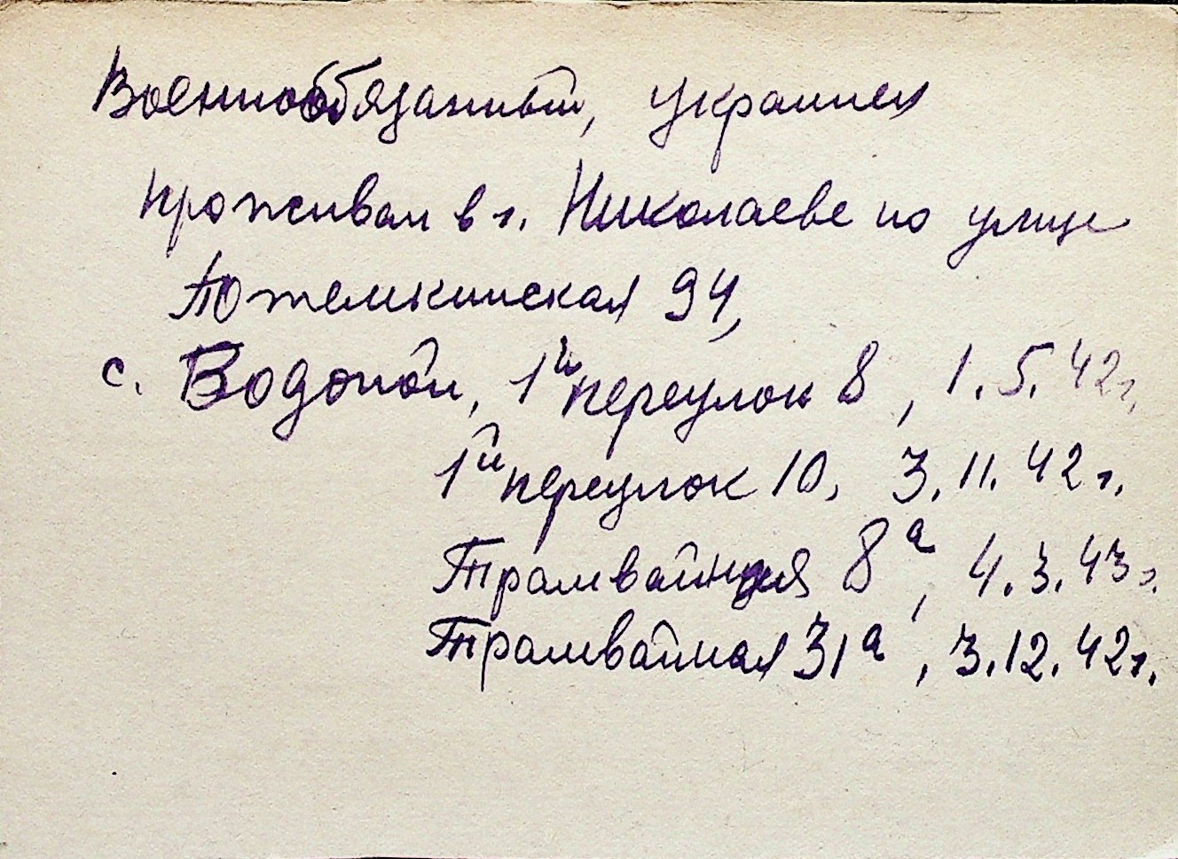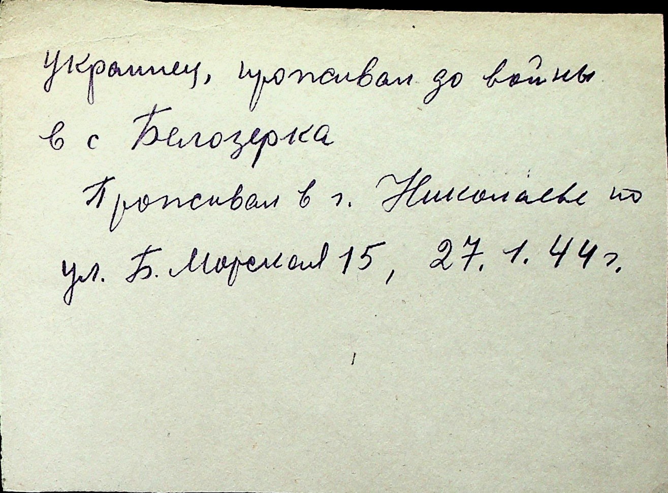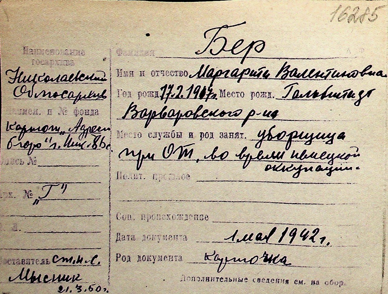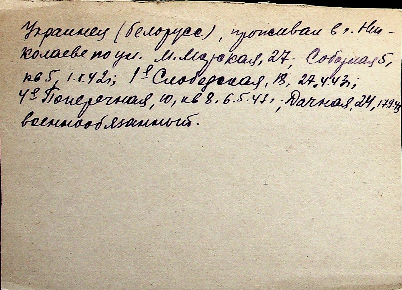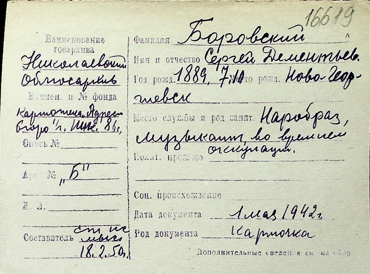 ◦ ◦ Перелік карток на осіб, які мешкали у м. Миколаїв у період окупації 1941–1944 років
