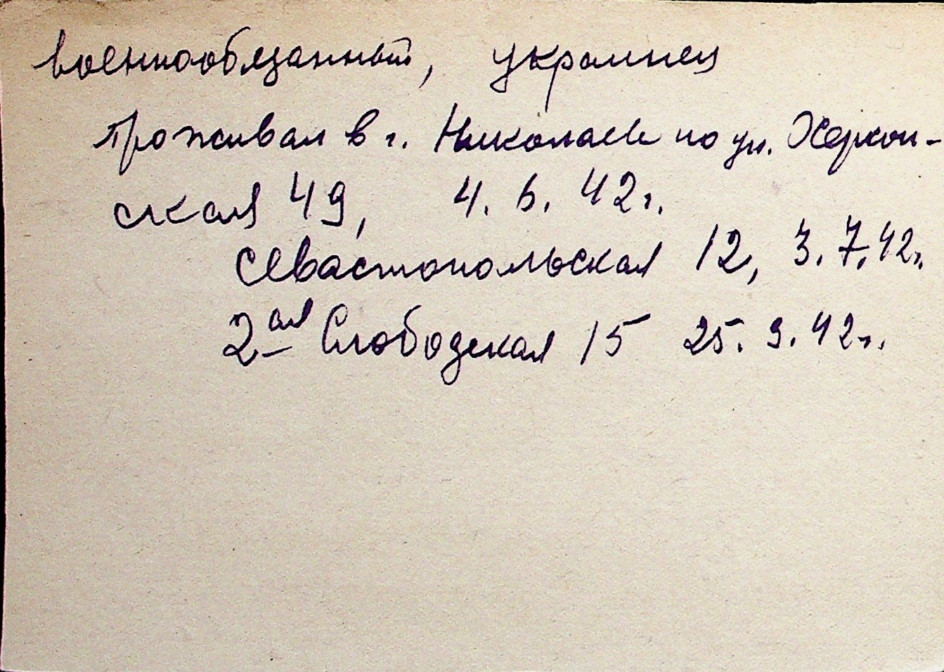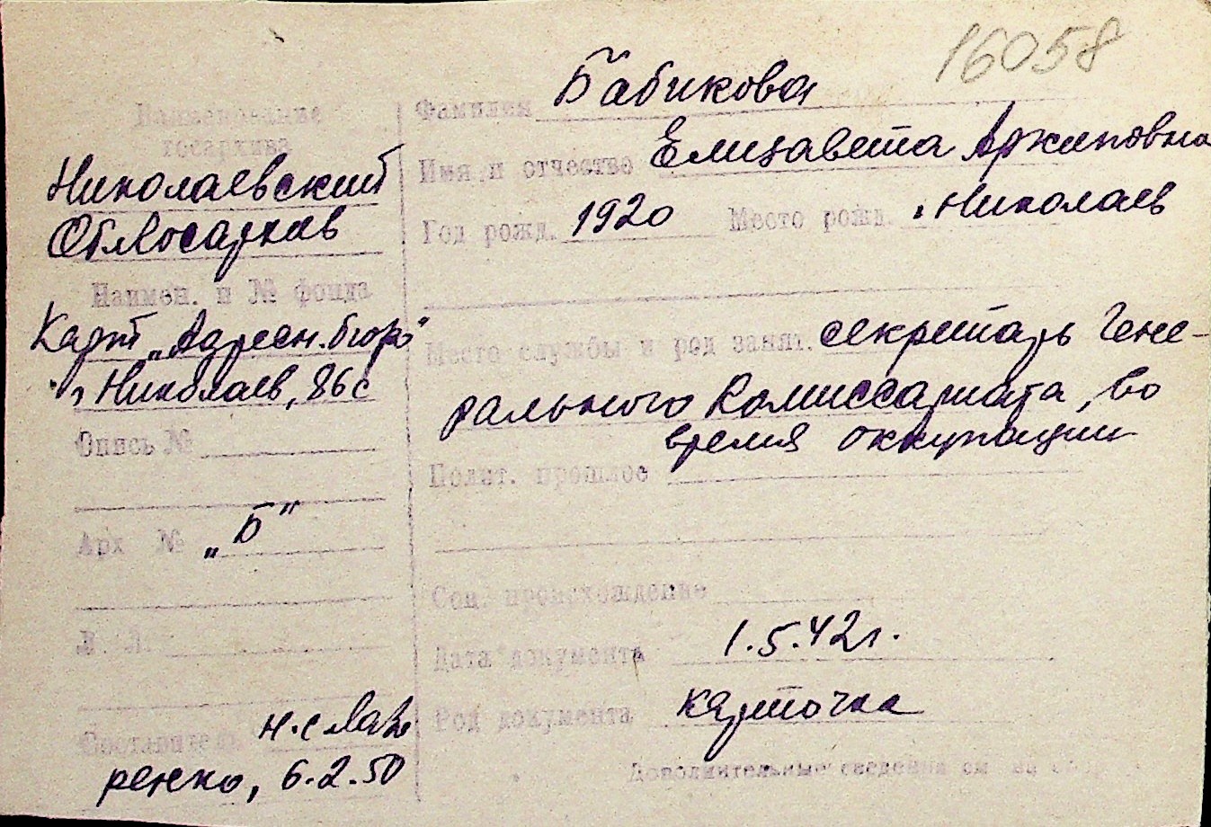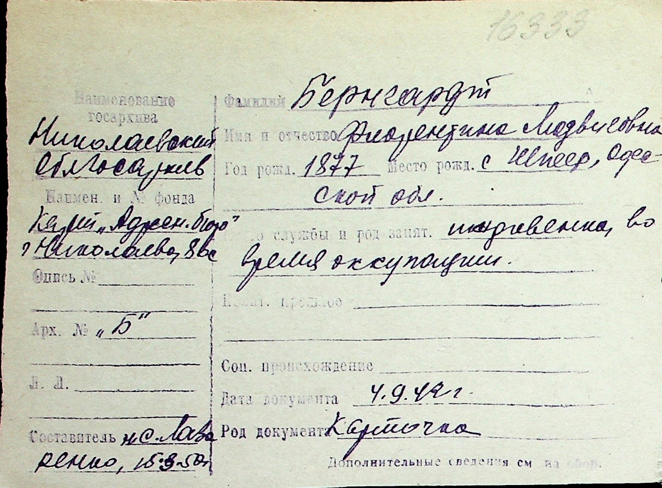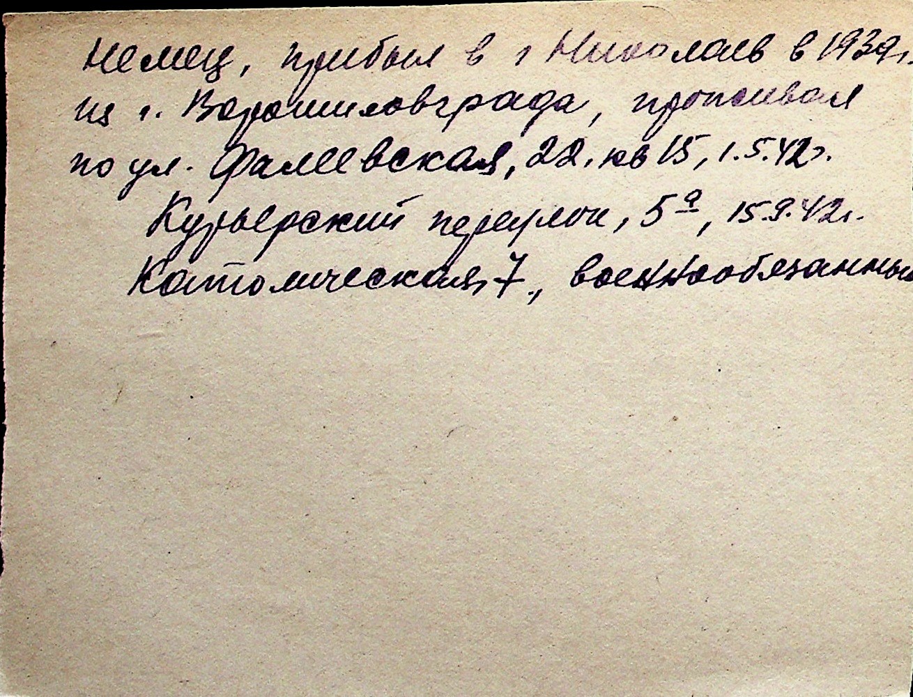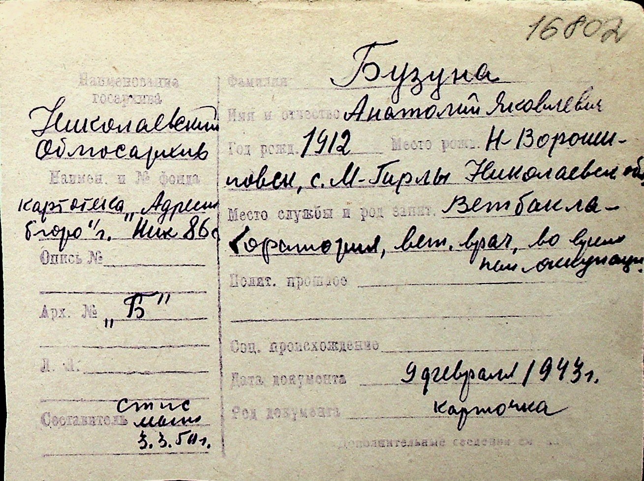 ◦ ◦ Перелік карток на осіб, які мешкали у м. Миколаїв у період окупації 1941–1944 років