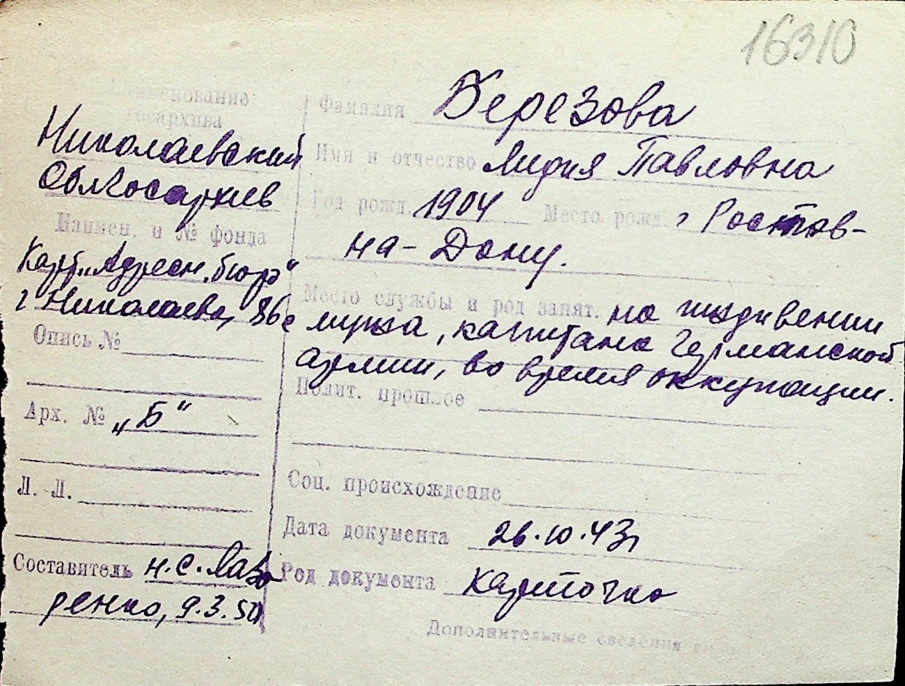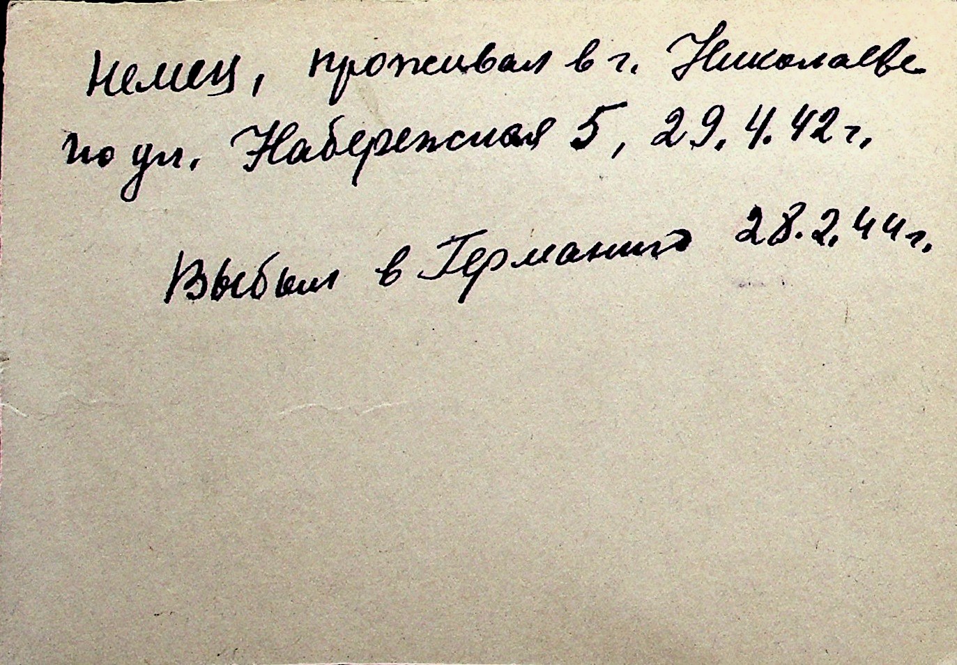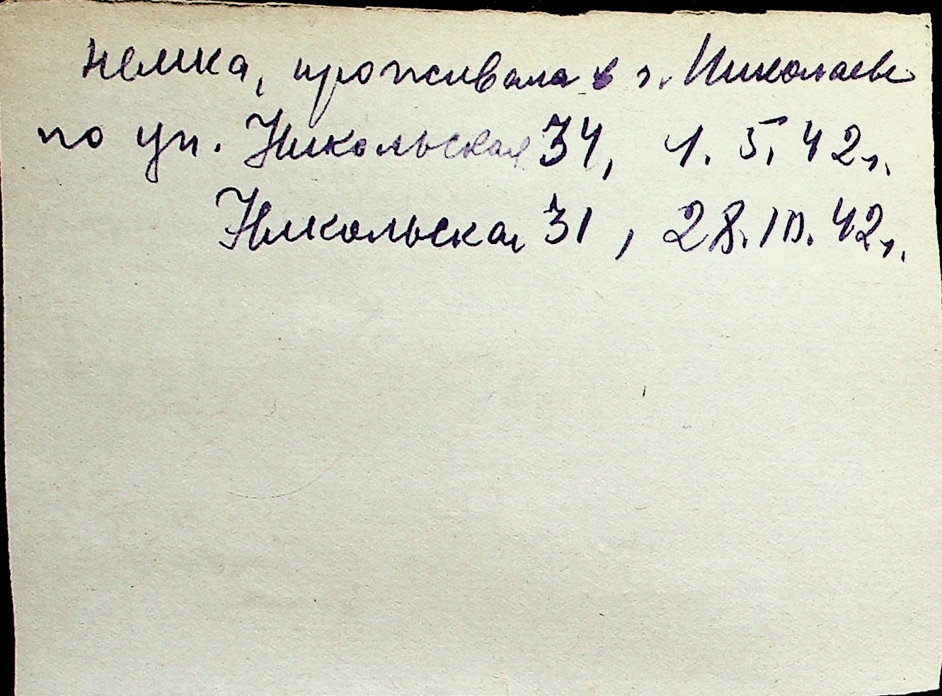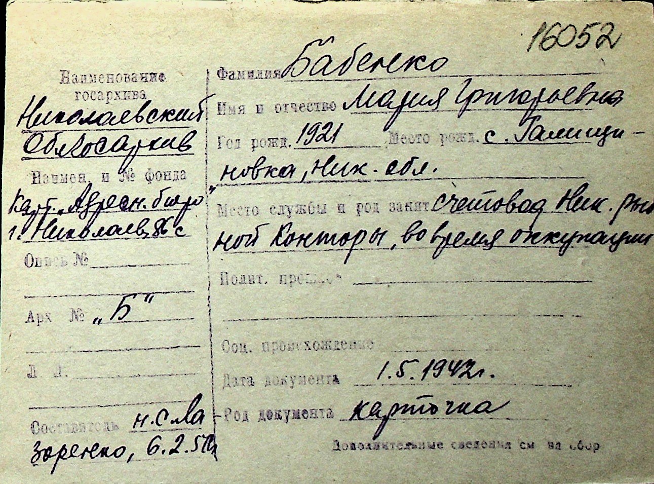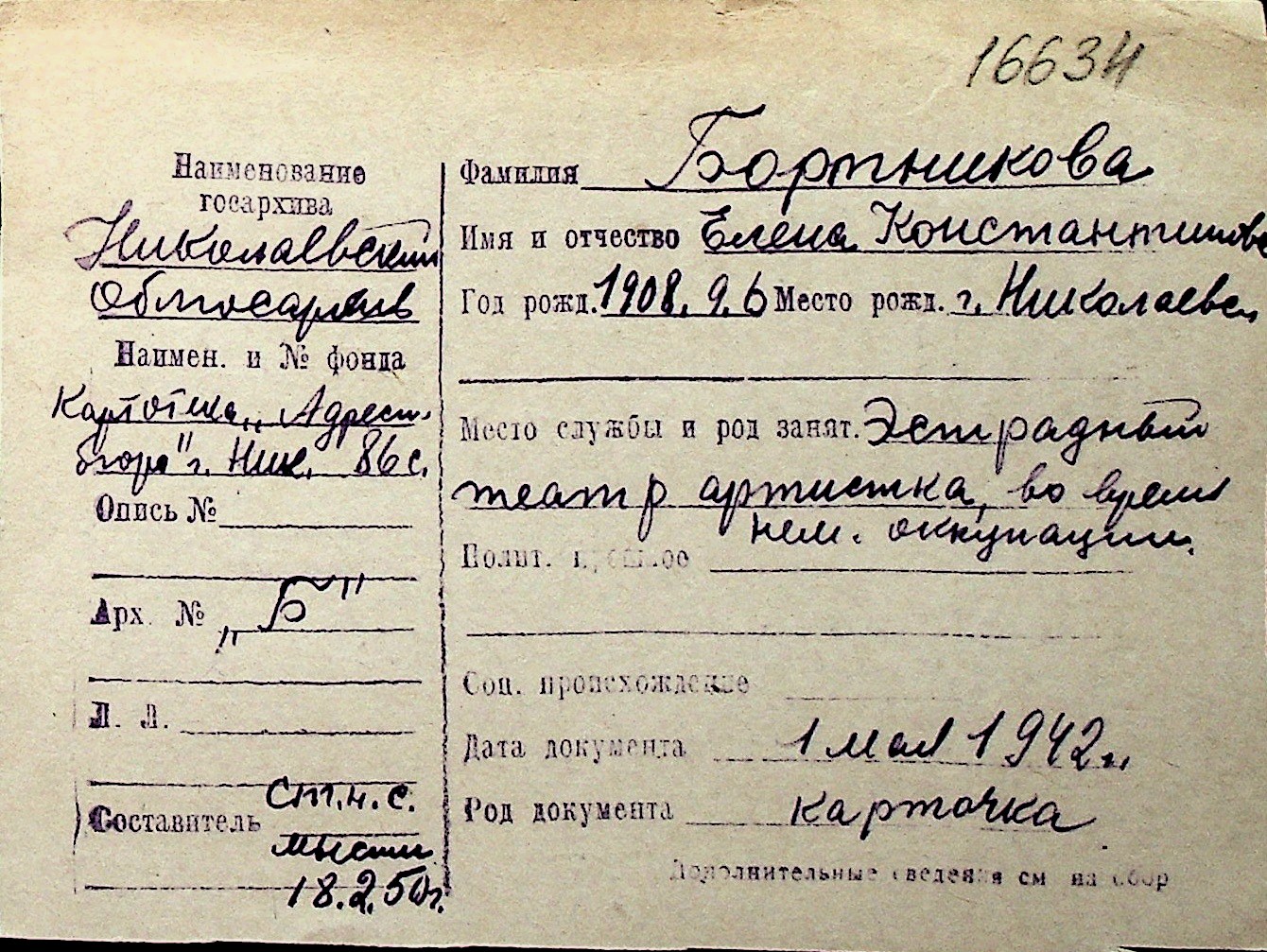 ◦ ◦ Перелік карток на осіб, які мешкали у м. Миколаїв у період окупації 1941–1944 років