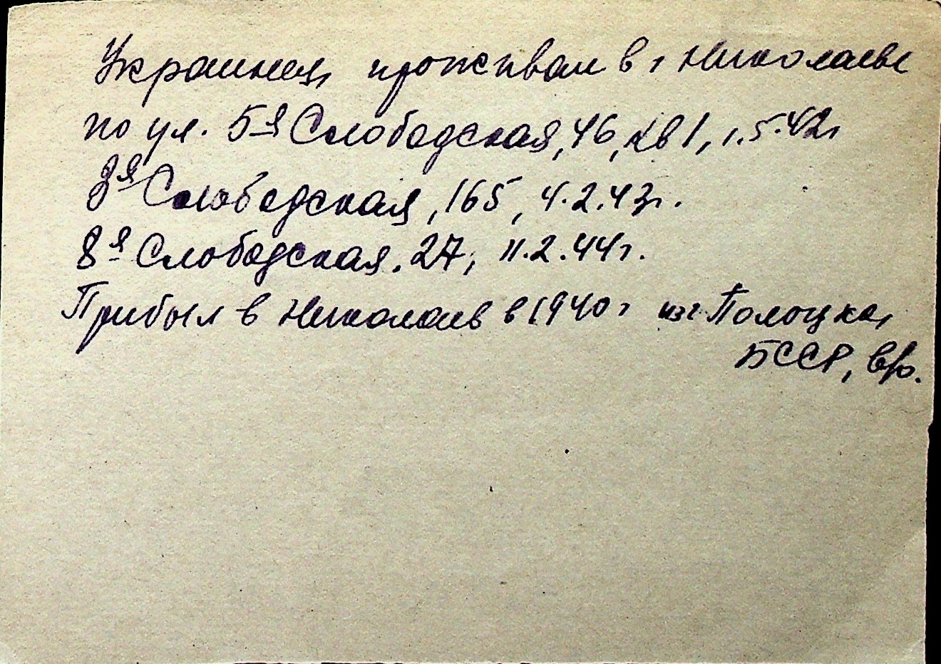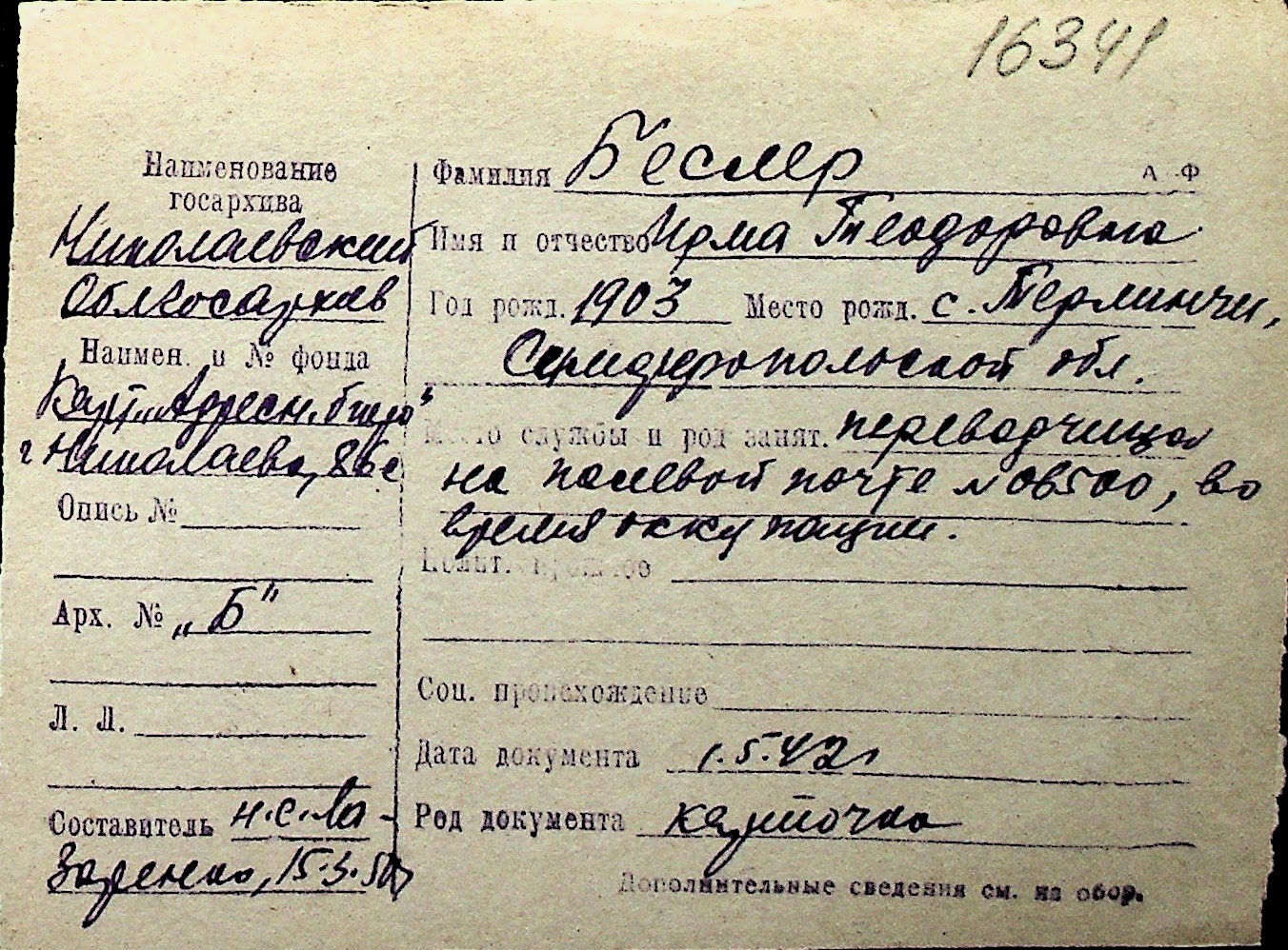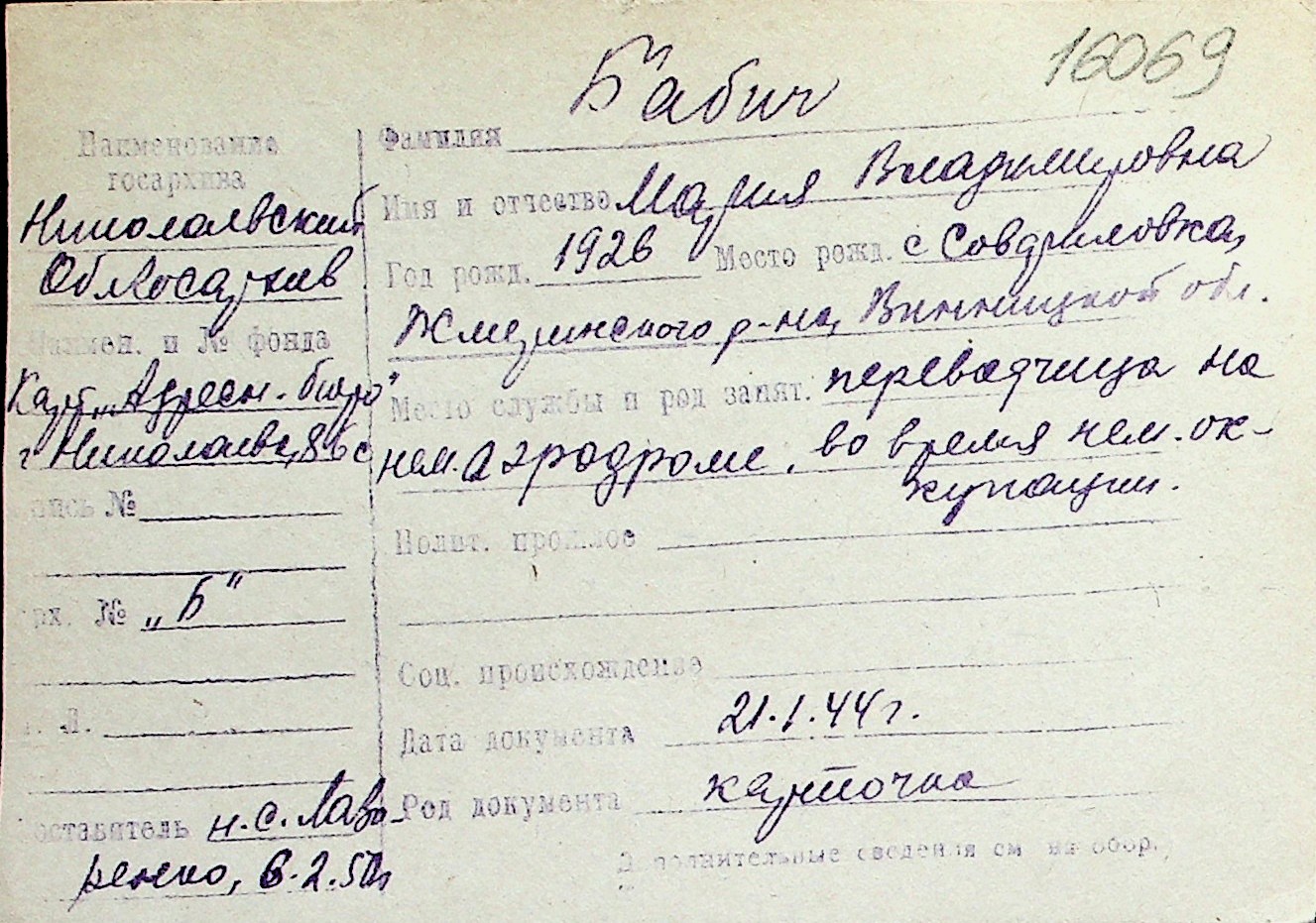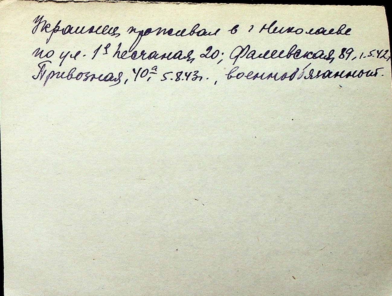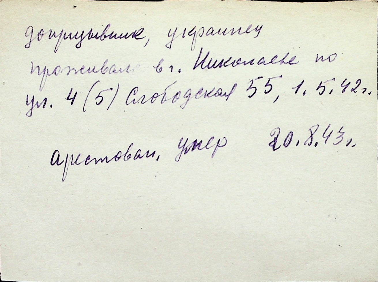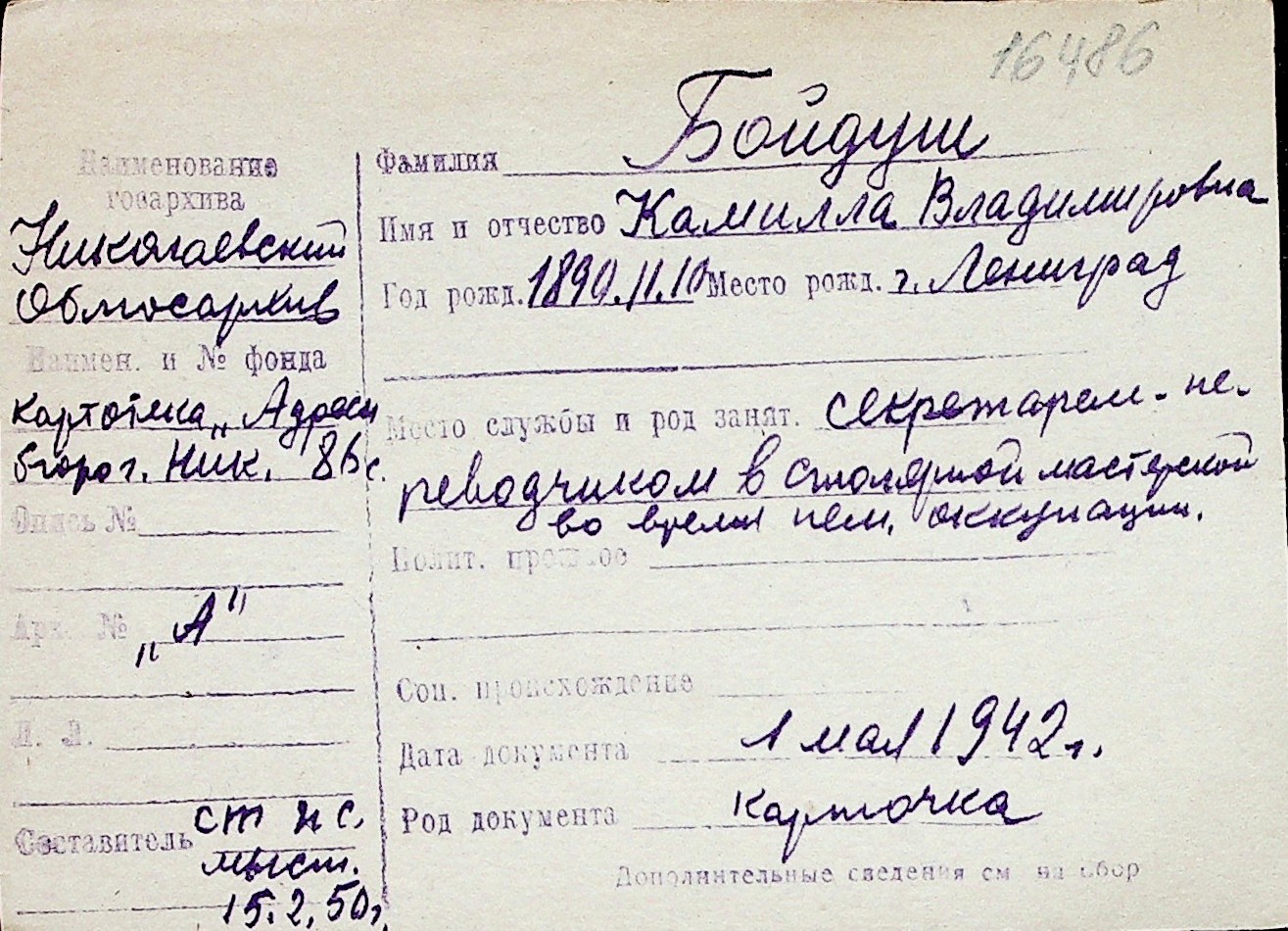 ◦ ◦ Перелік карток на осіб, які мешкали у м. Миколаїв у період окупації 1941–1944 років