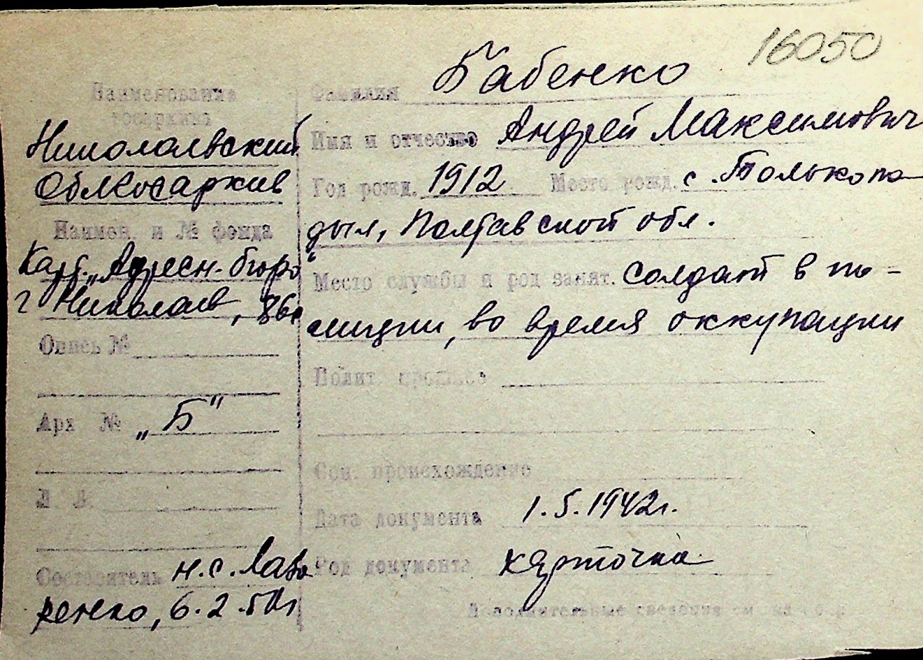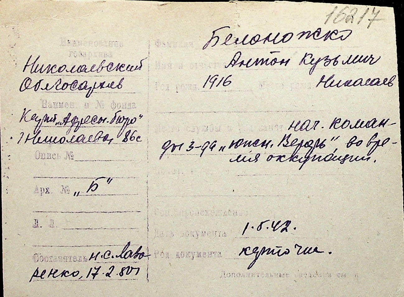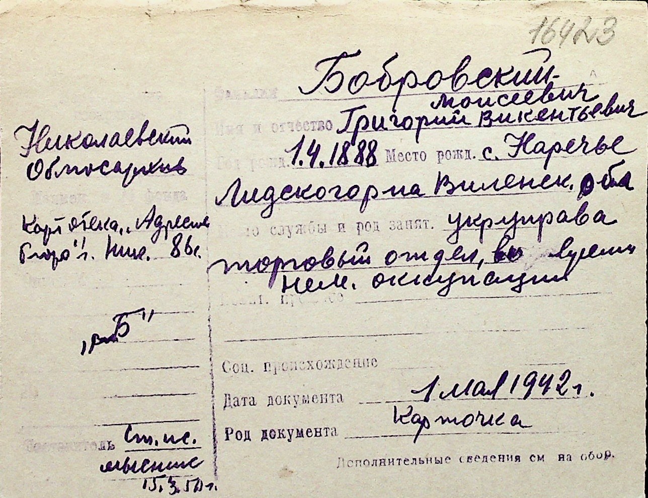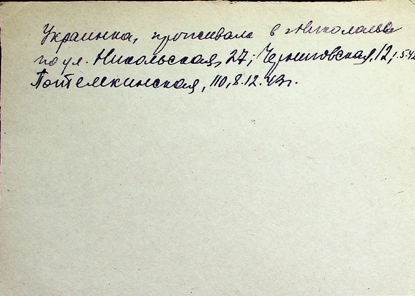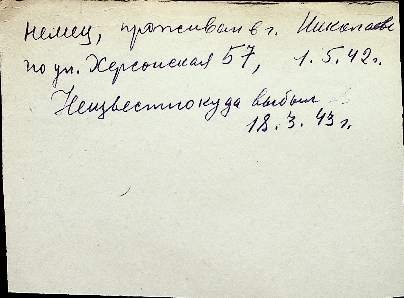 ◦ ◦ Перелік карток на осіб, які мешкали у м. Миколаїв у період окупації 1941–1944 років