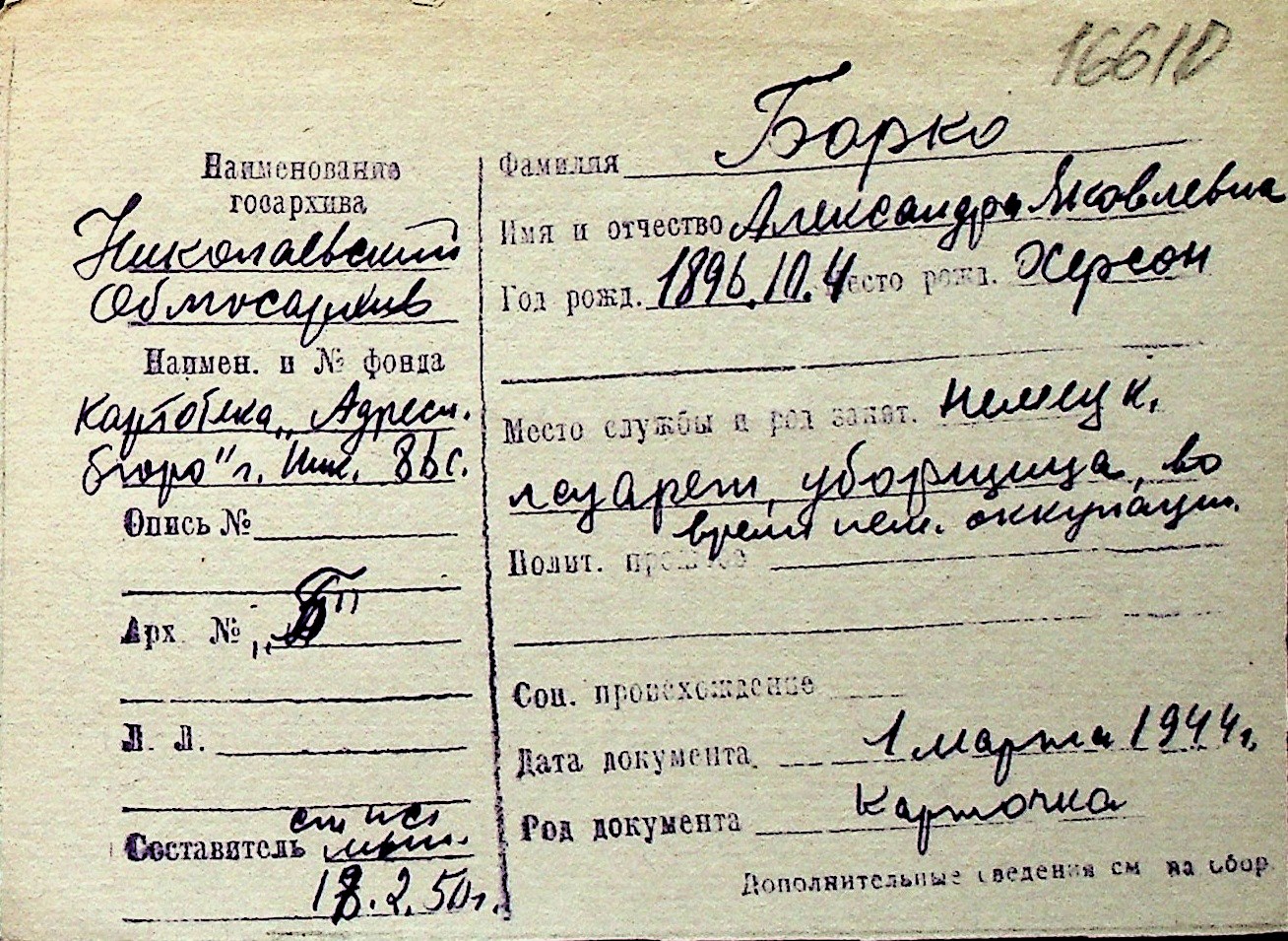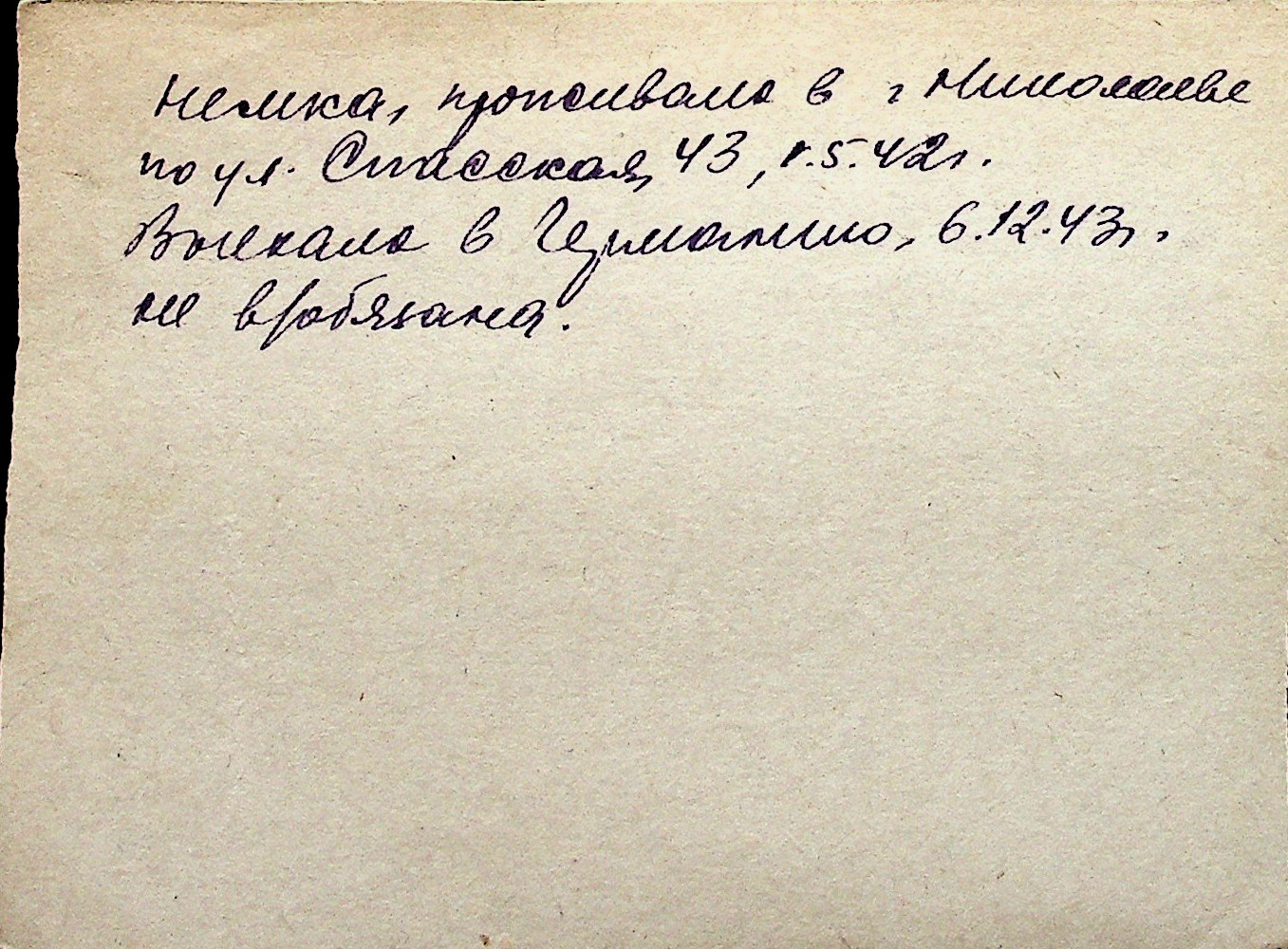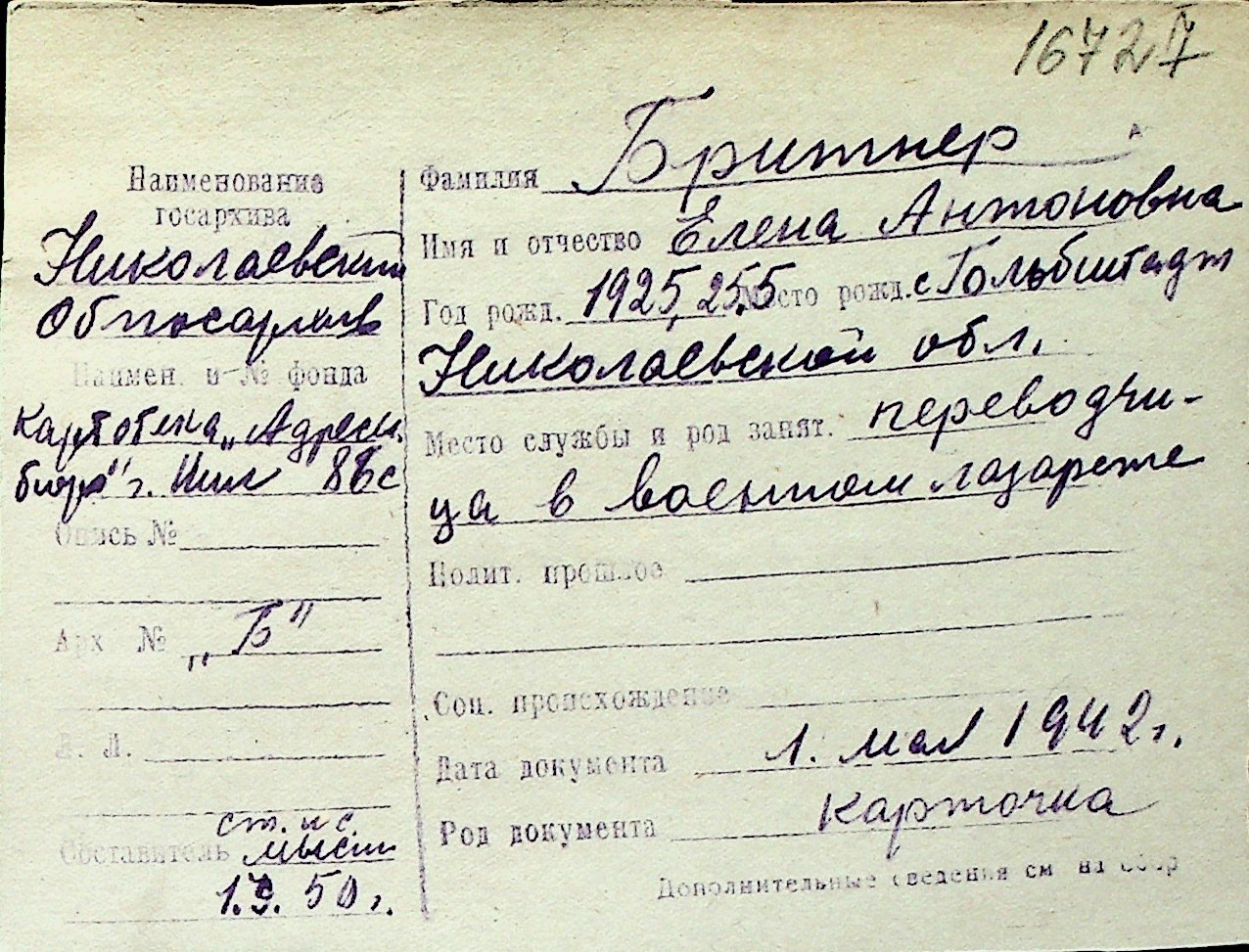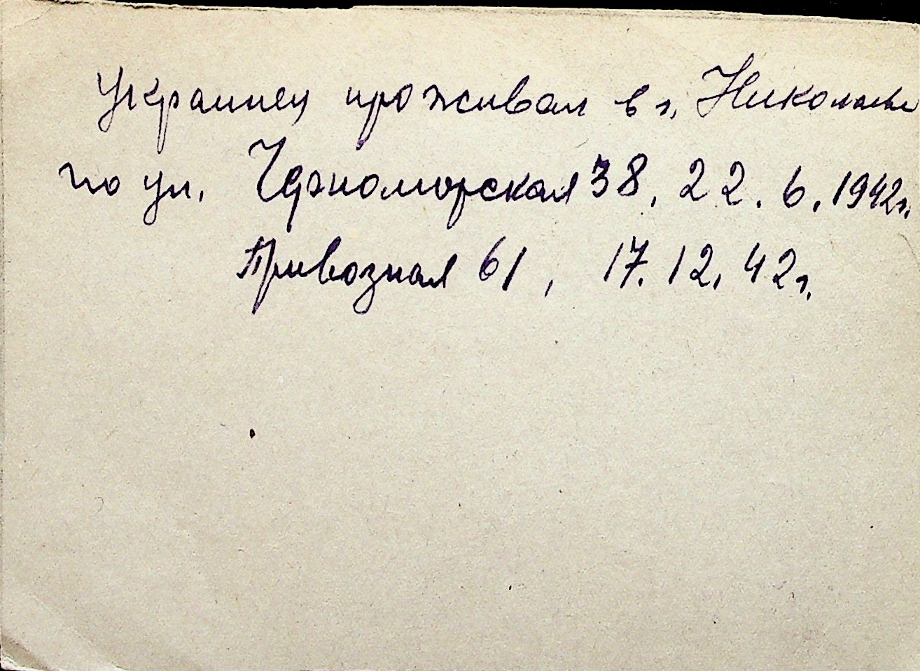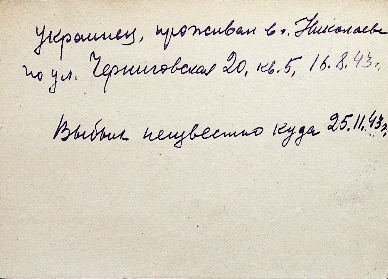 ◦ ◦ Перелік карток на осіб, які мешкали у м. Миколаїв у період окупації 1941–1944 років