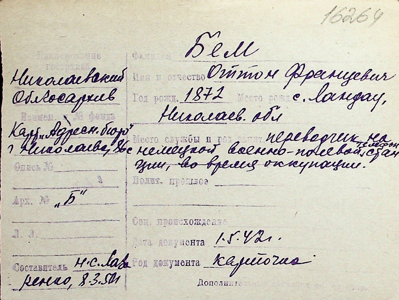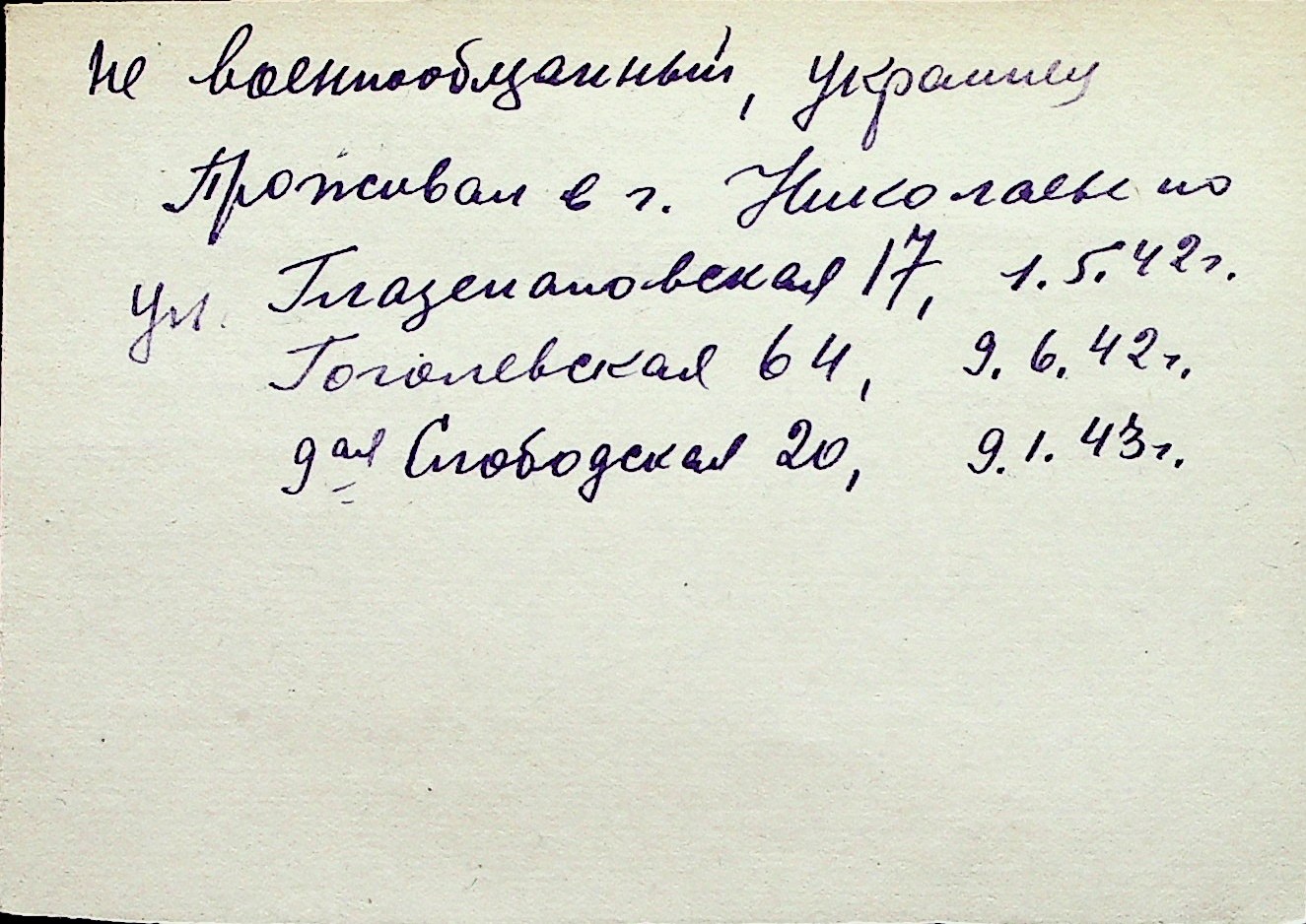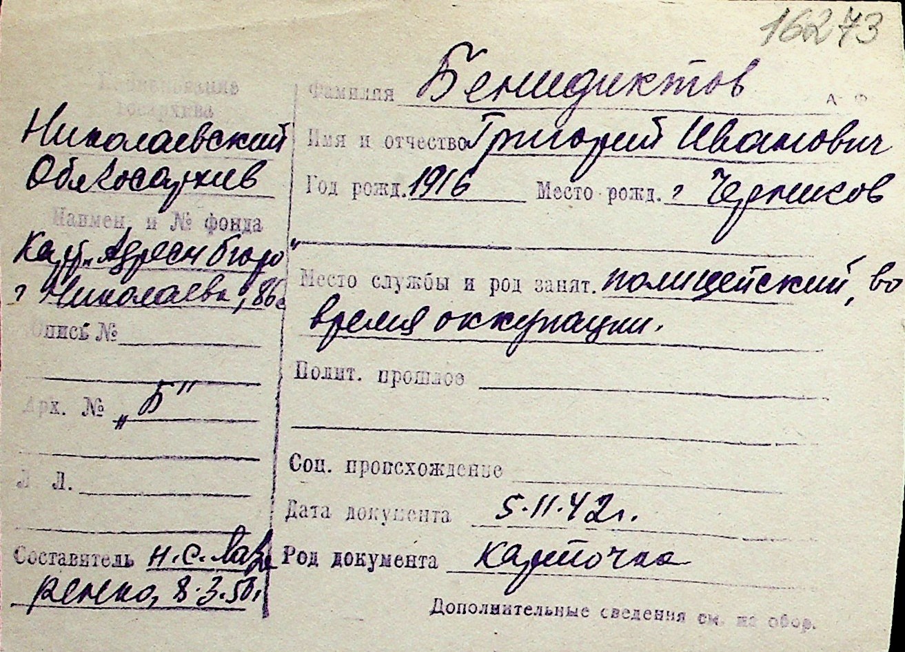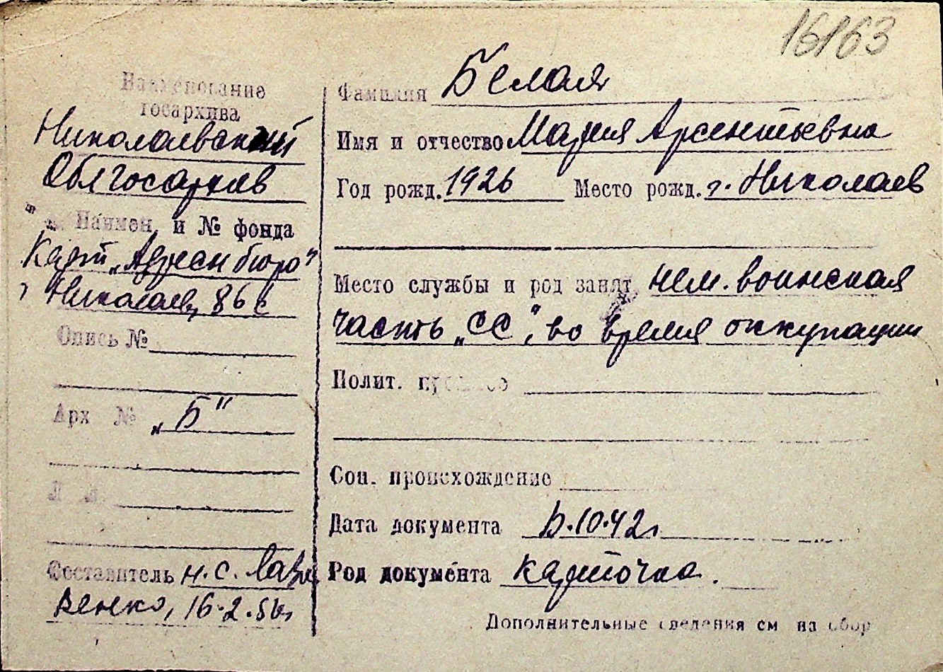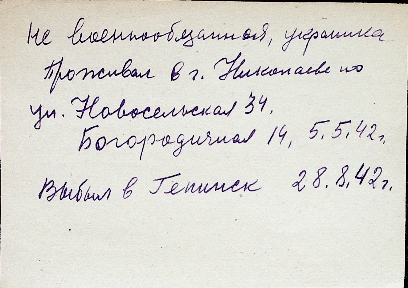 ◦ ◦ Перелік карток на осіб, які мешкали у м. Миколаїв у період окупації 1941–1944 років
