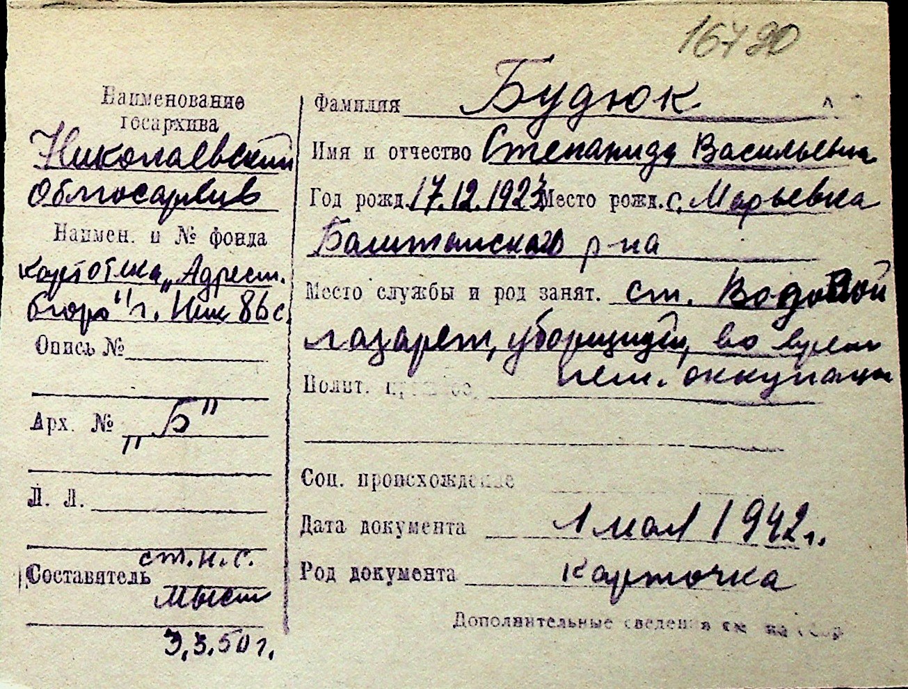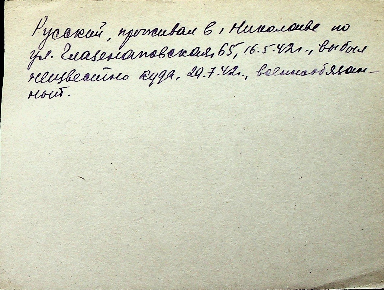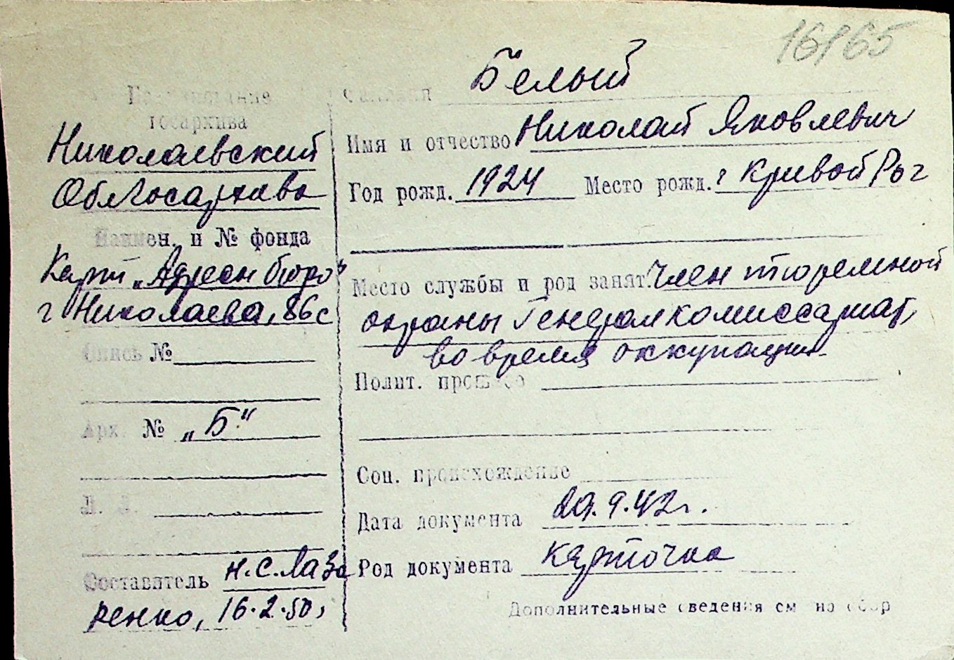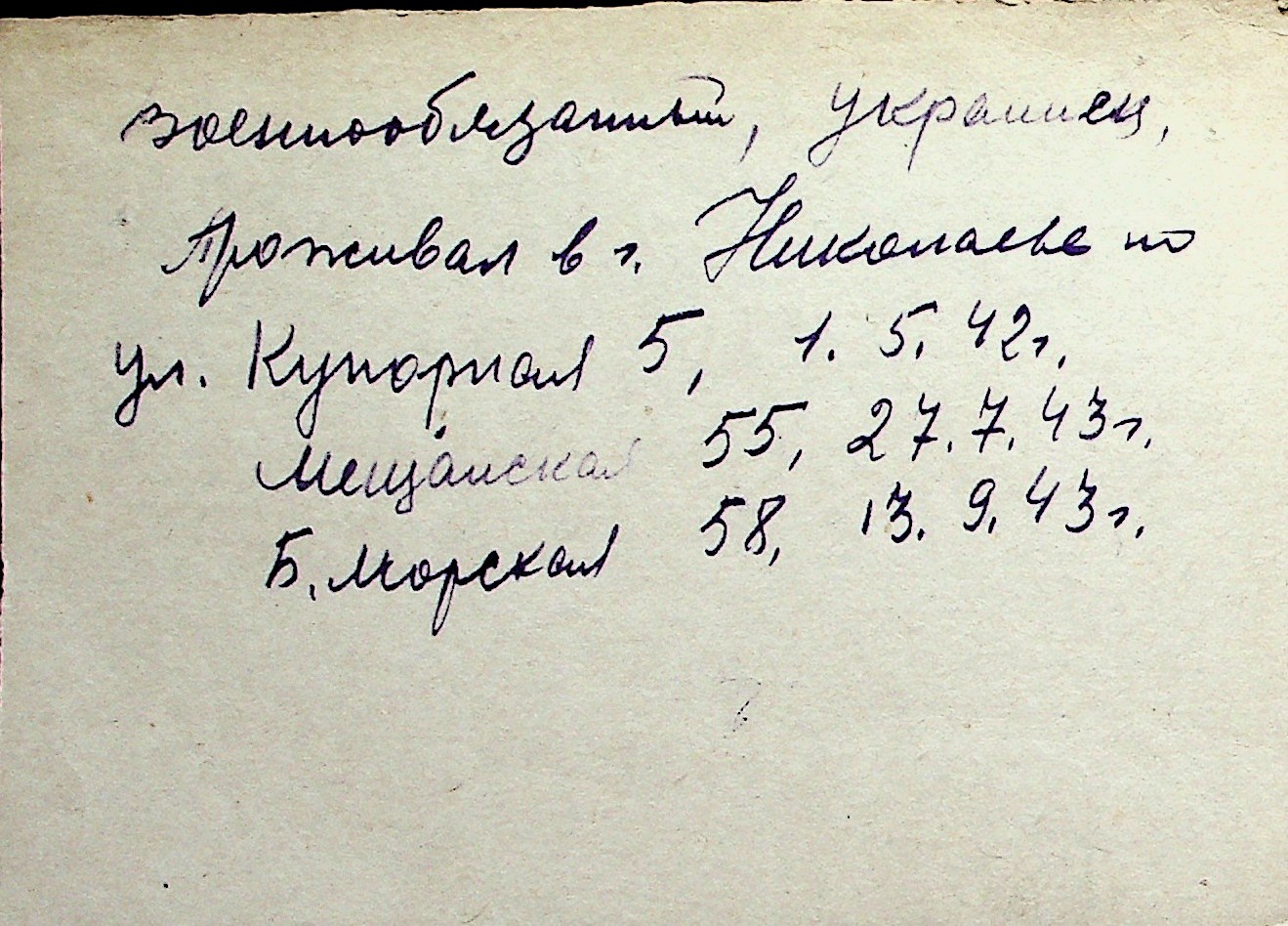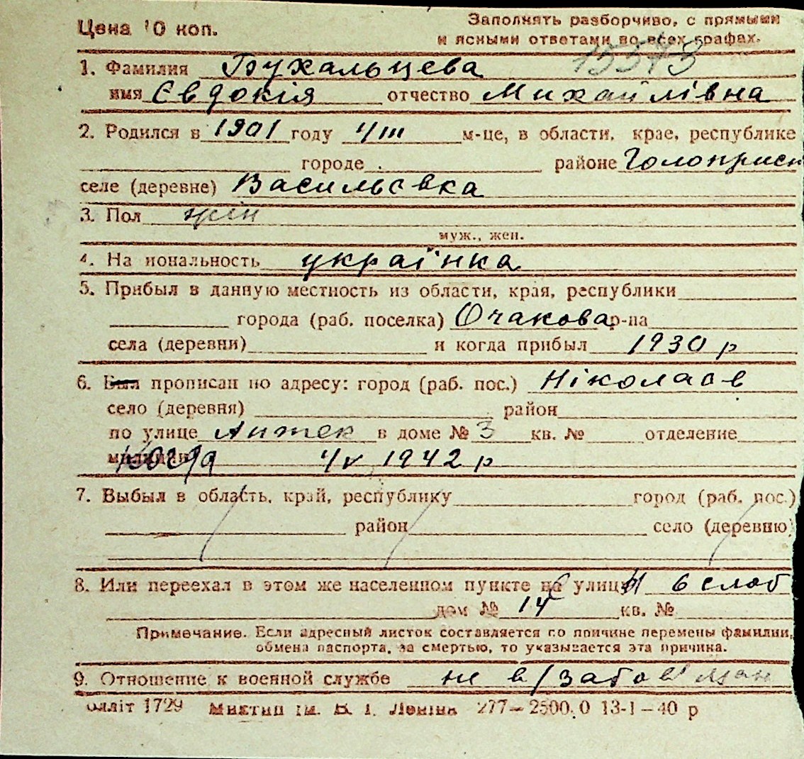 ◦ ◦ Перелік карток на осіб, які мешкали у м. Миколаїв у період окупації 1941–1944 років