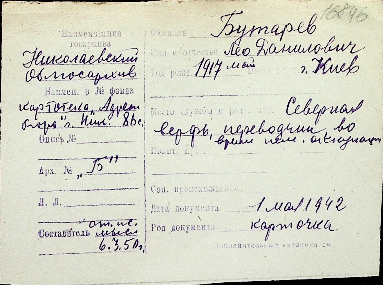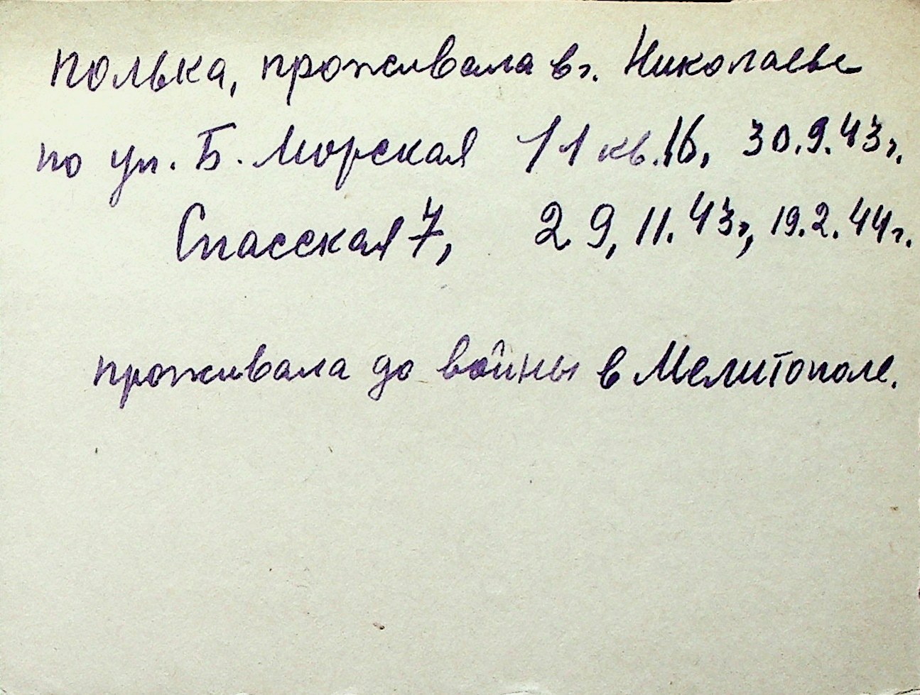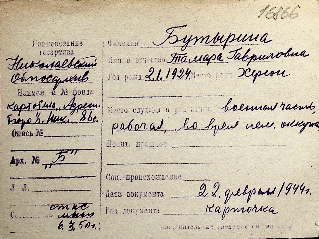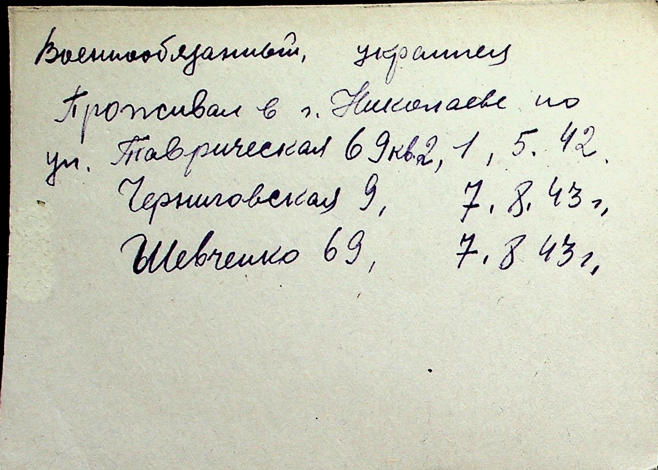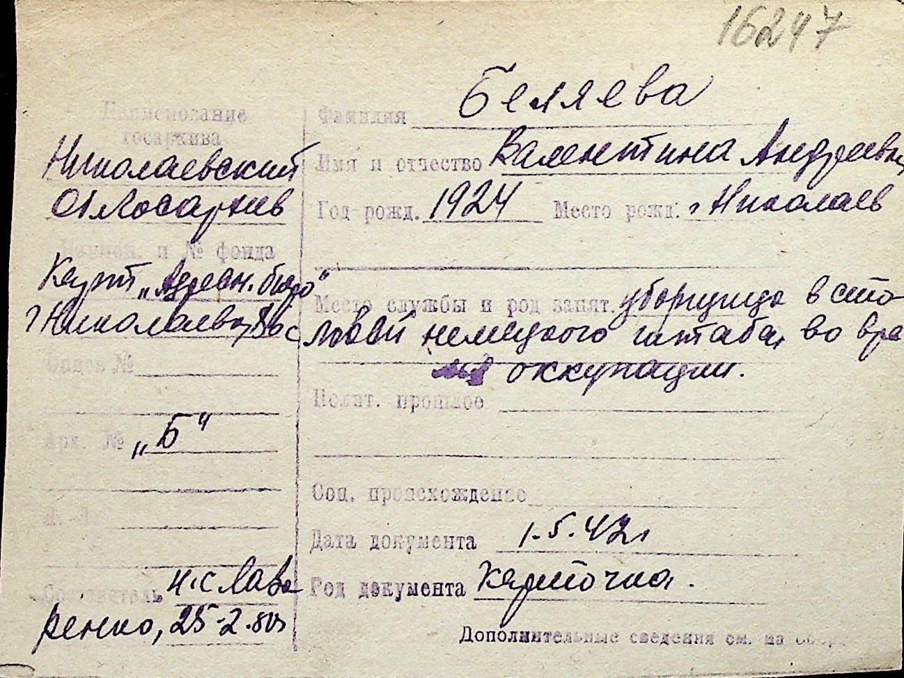 ◦ ◦ Перелік карток на осіб, які мешкали у м. Миколаїв у період окупації 1941–1944 років