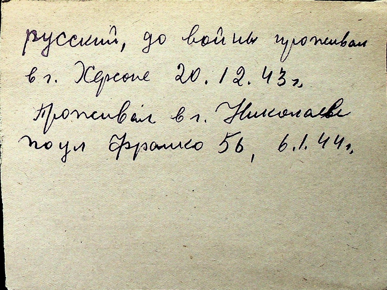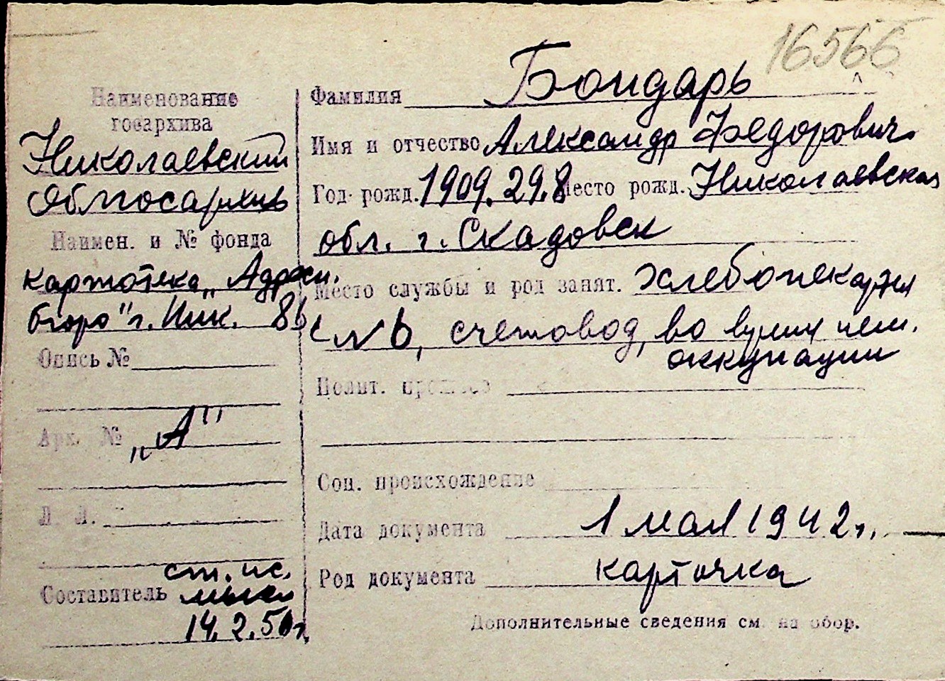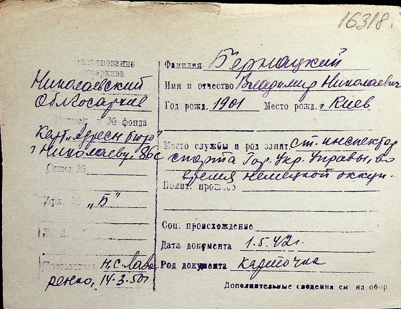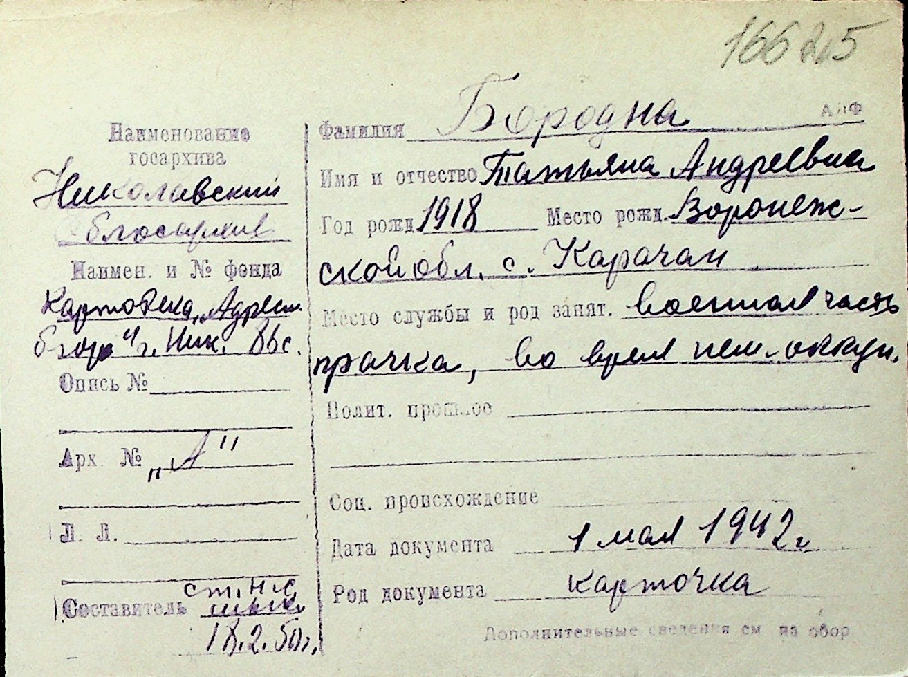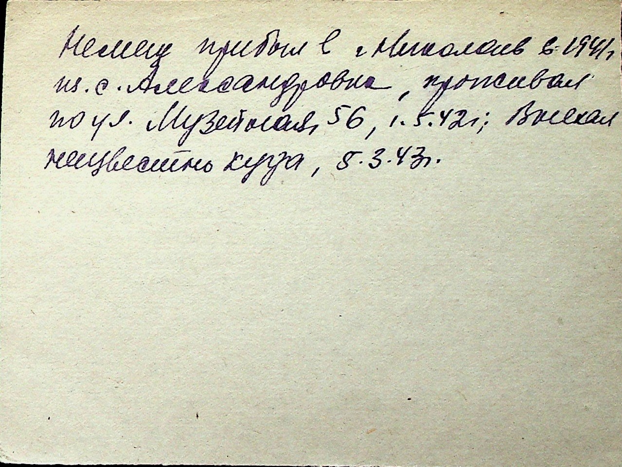 ◦ ◦ Перелік карток на осіб, які мешкали у м. Миколаїв у період окупації 1941–1944 років