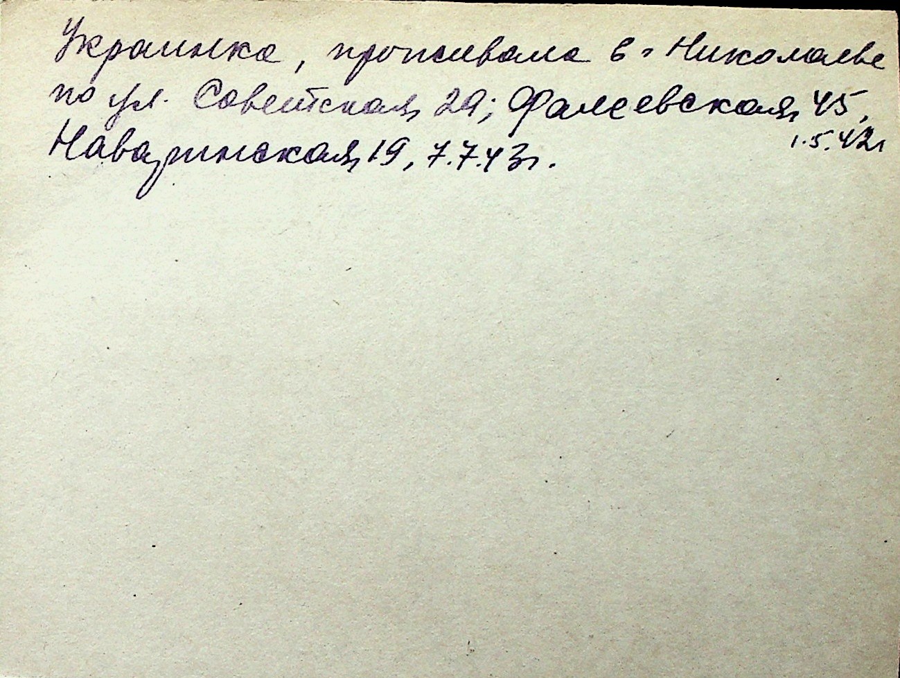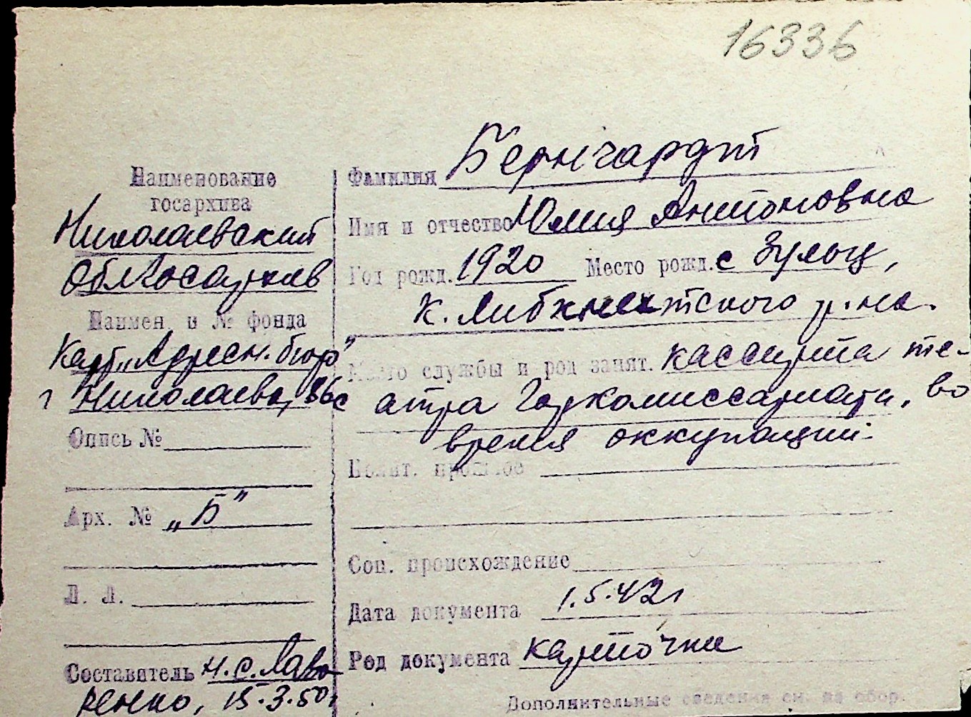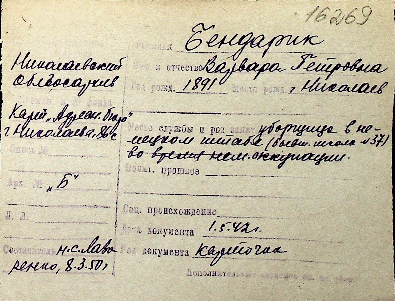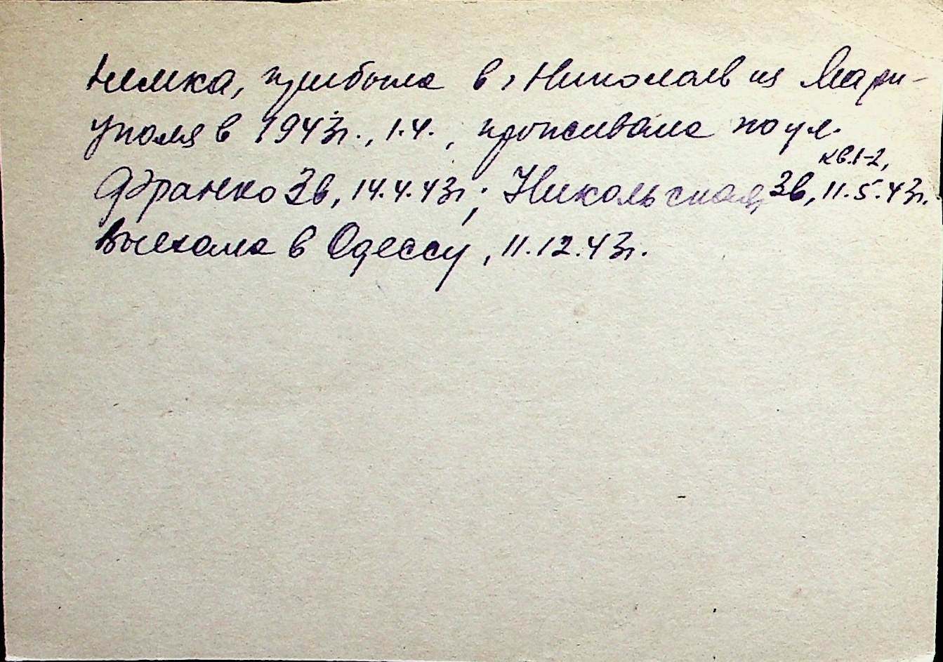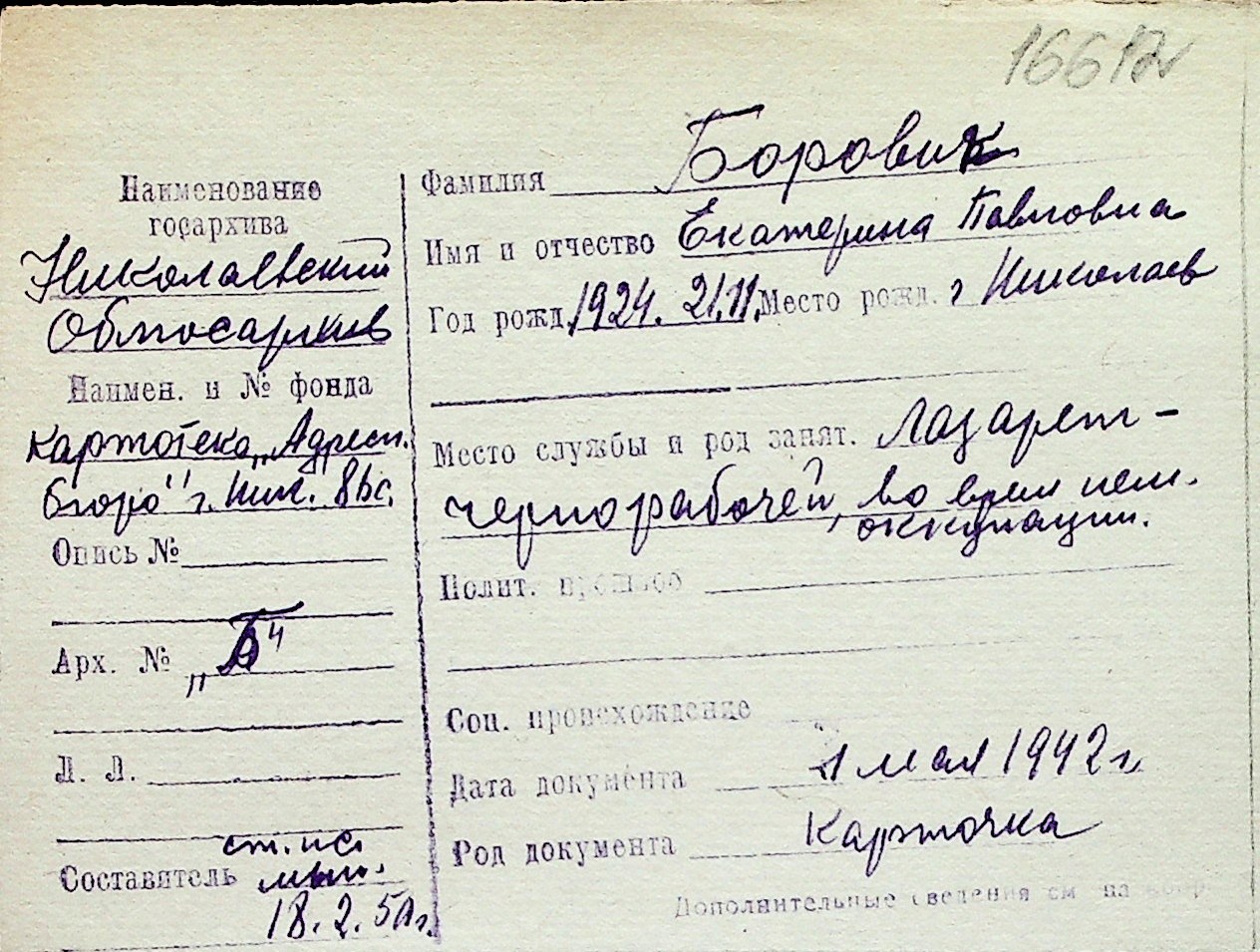◦ ◦ Перелік карток на осіб, які мешкали у м. Миколаїв у період окупації 1941–1944 років