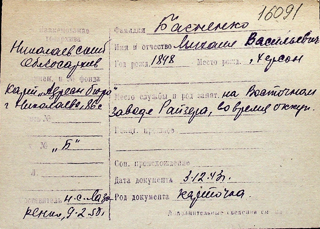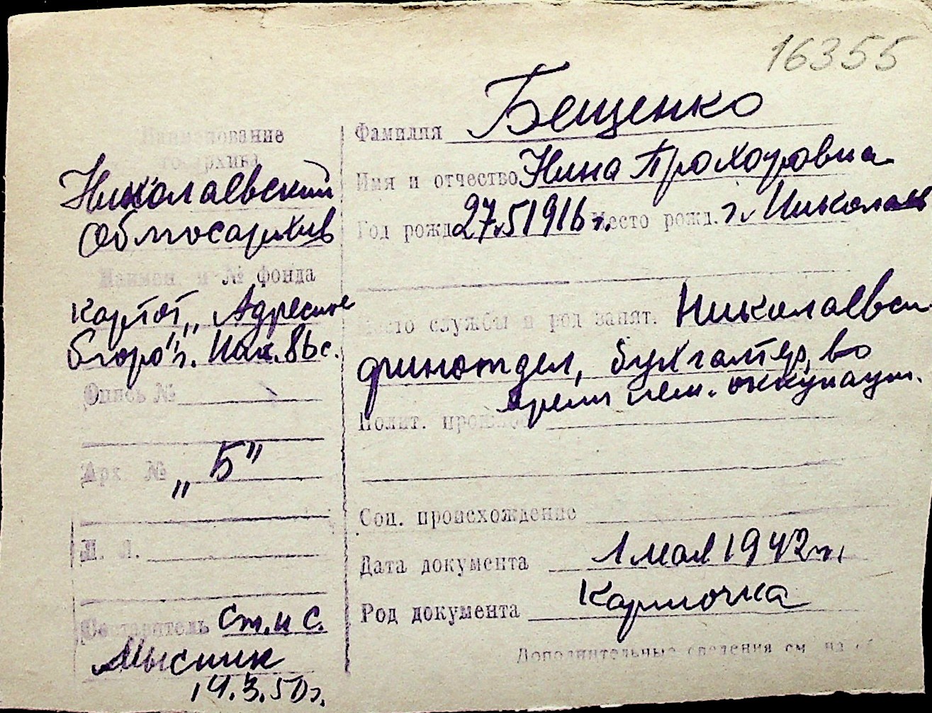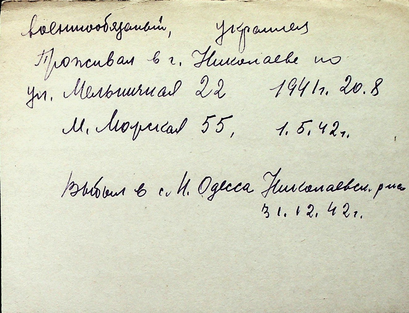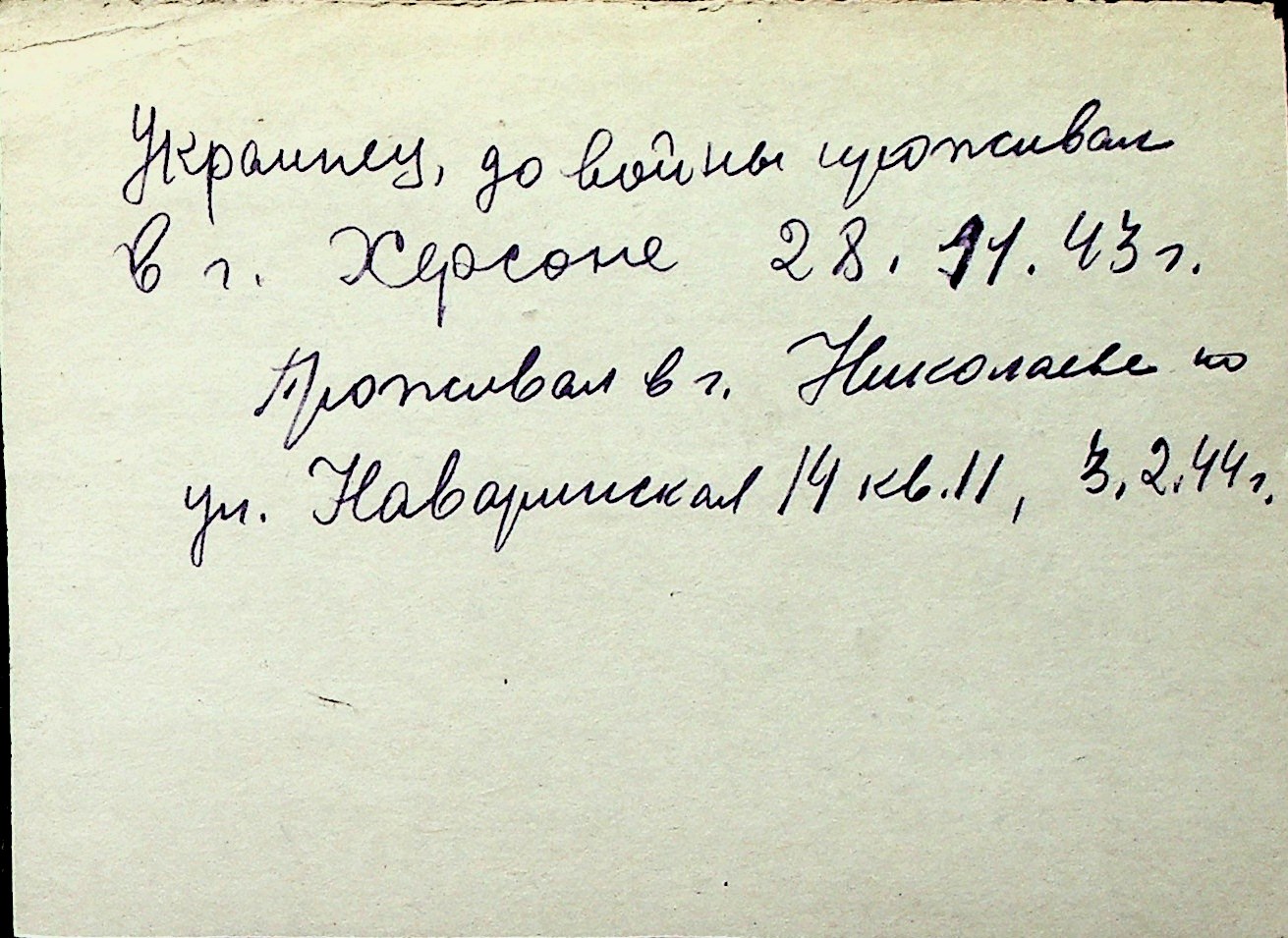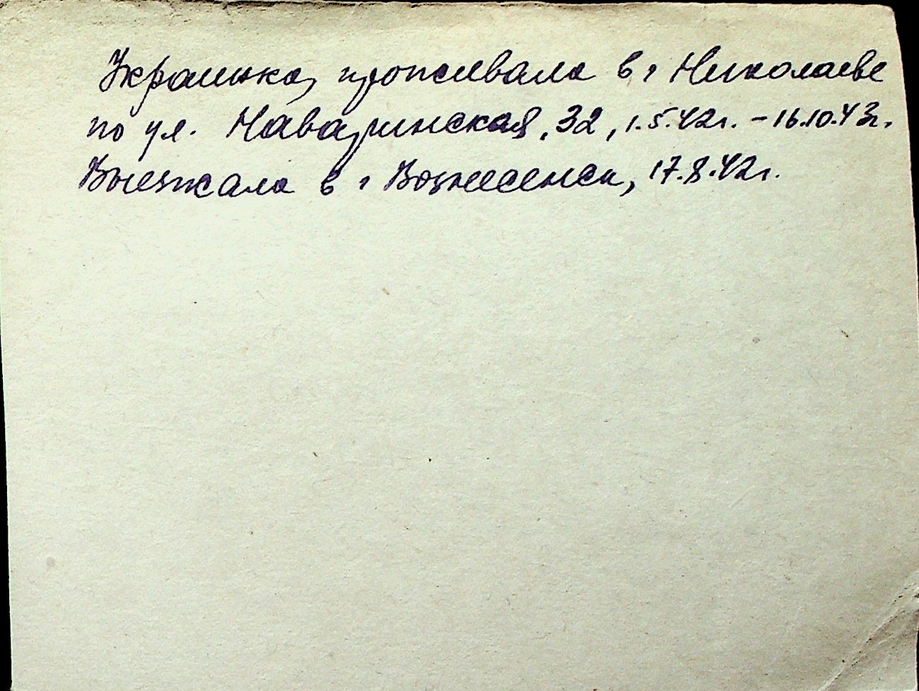 ◦ ◦ Перелік карток на осіб, які мешкали у м. Миколаїв у період окупації 1941–1944 років