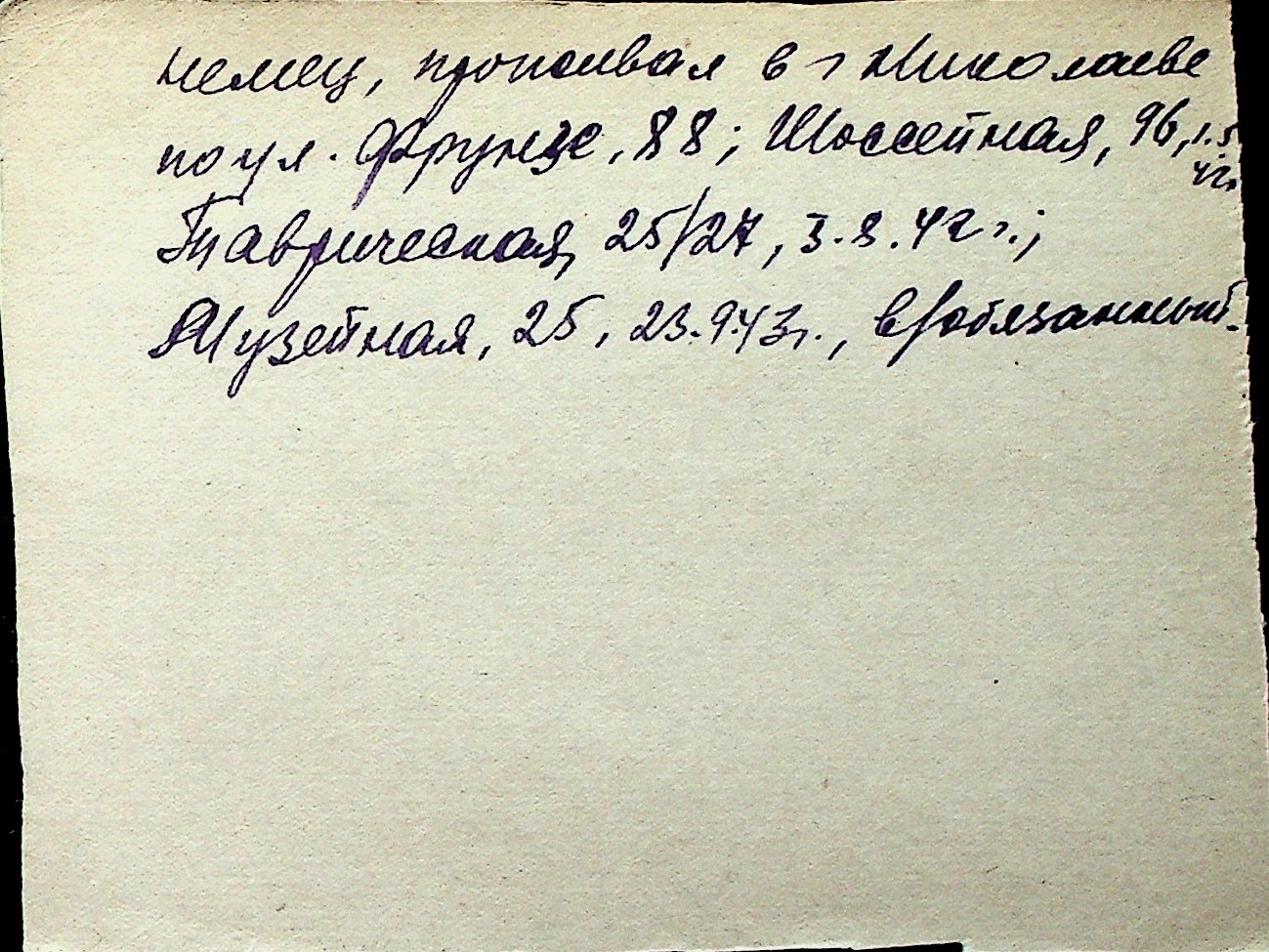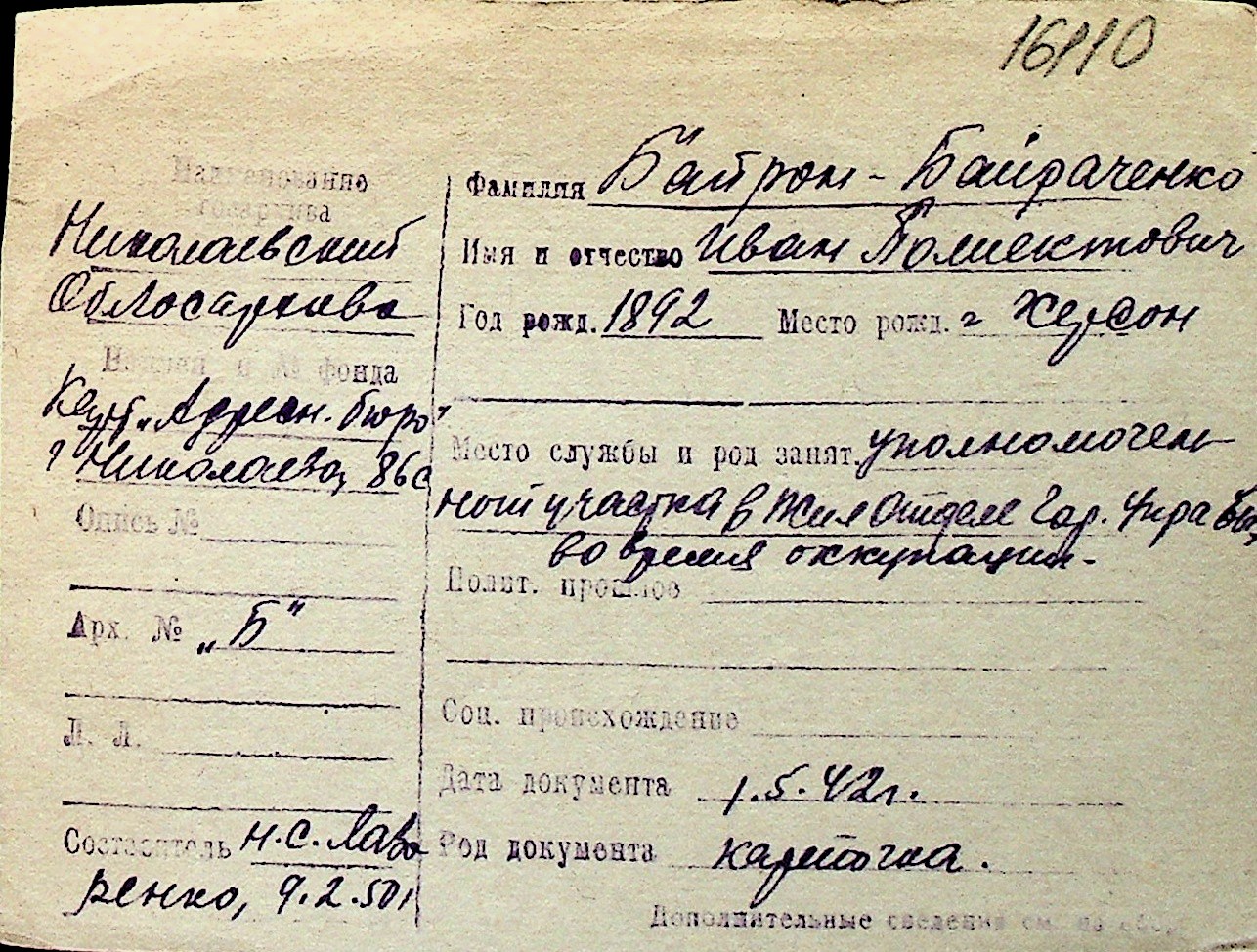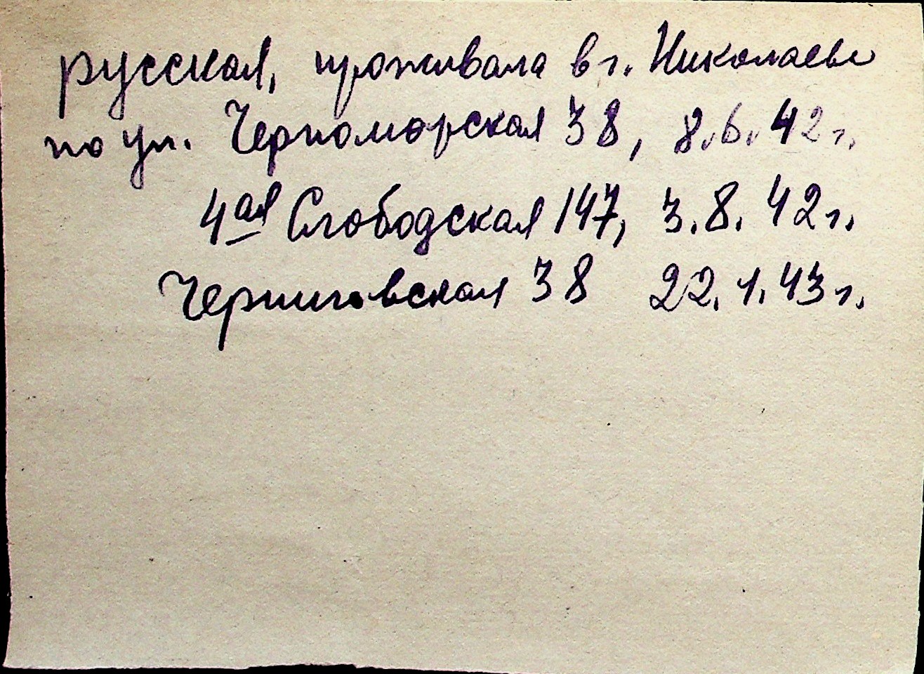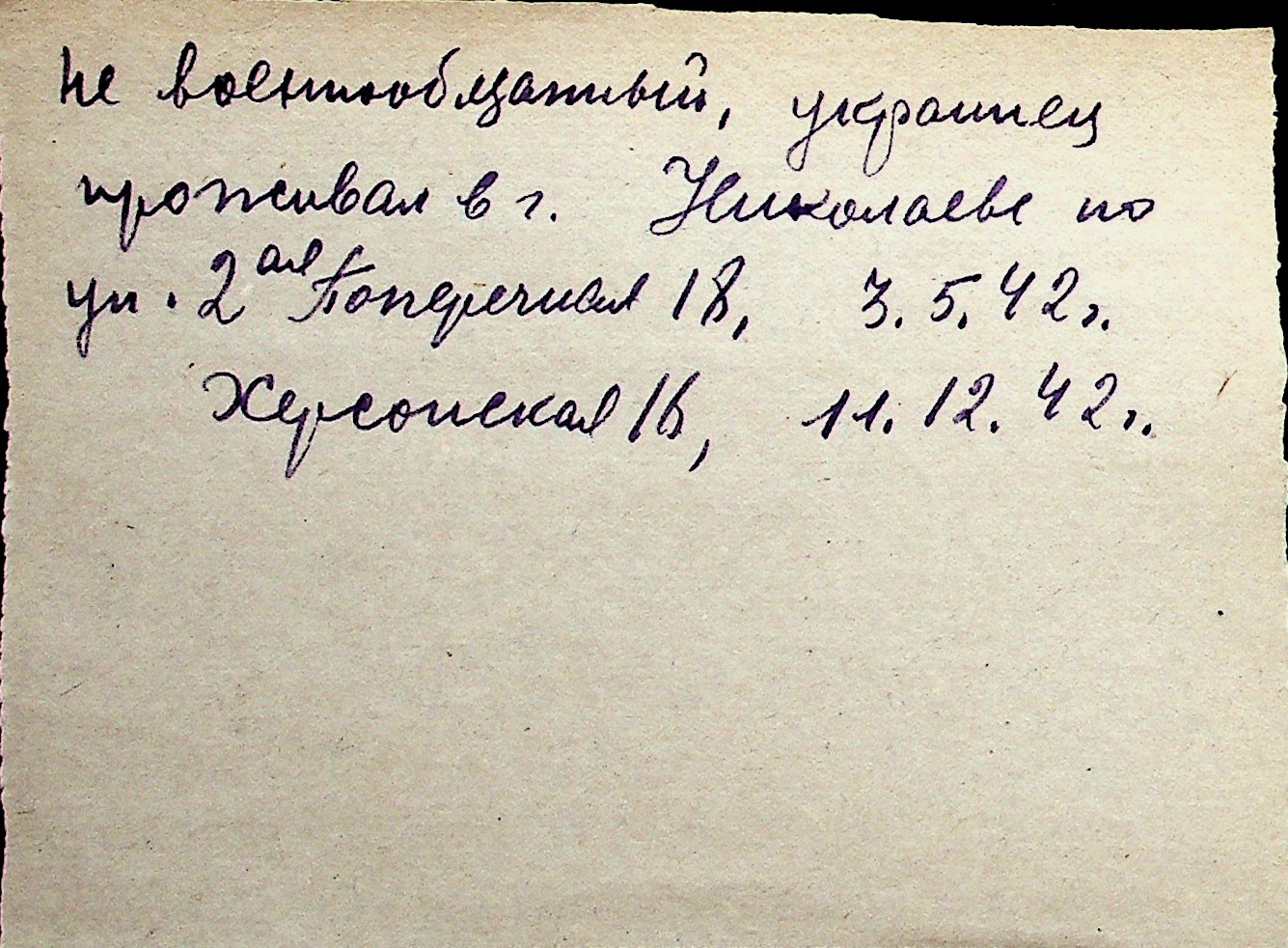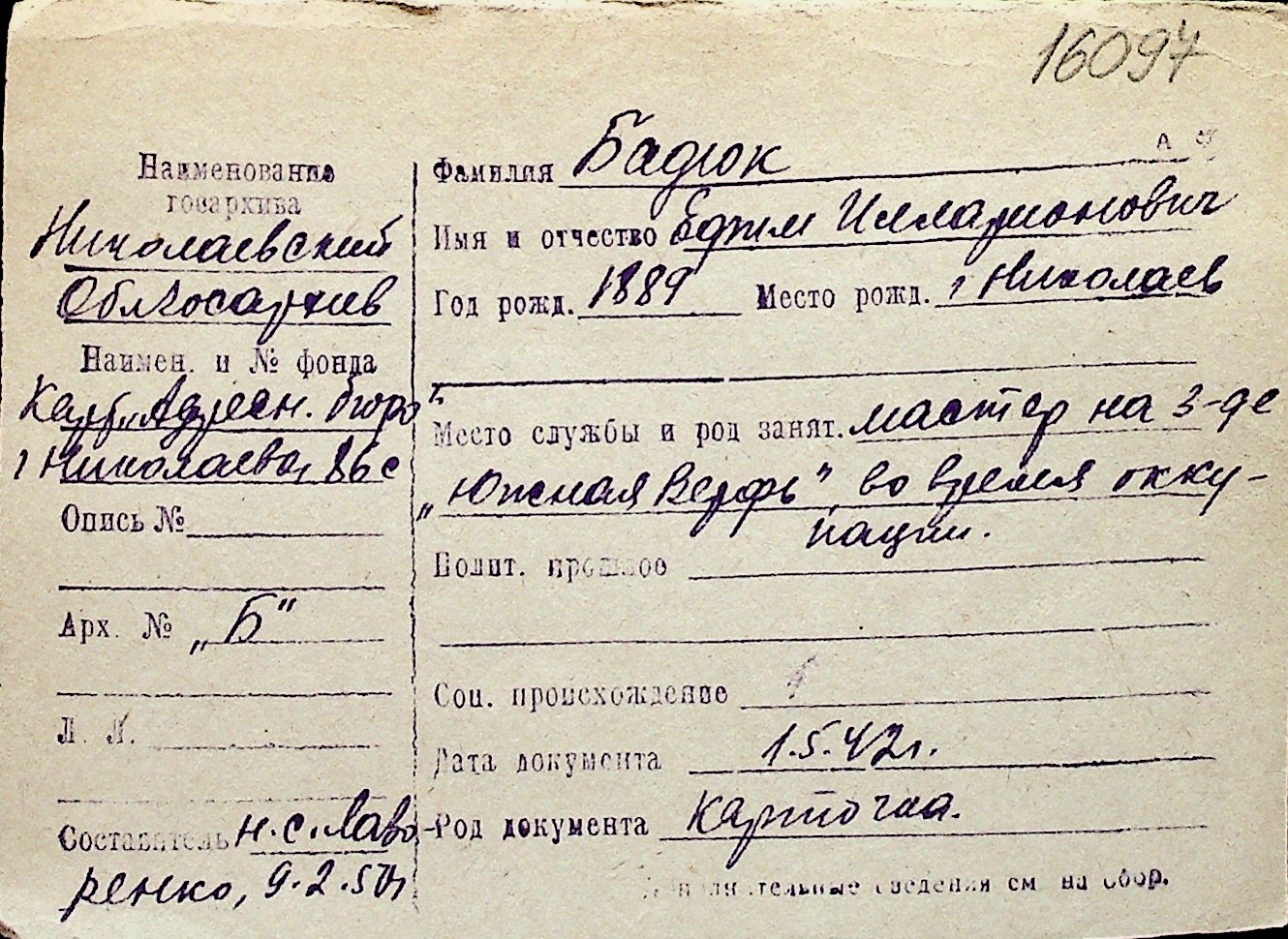 ◦ ◦ Перелік карток на осіб, які мешкали у м. Миколаїв у період окупації 1941–1944 років