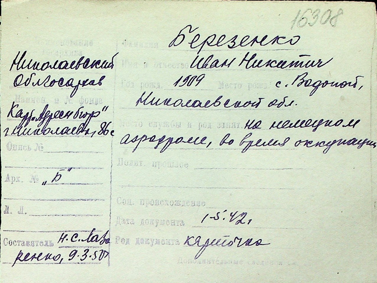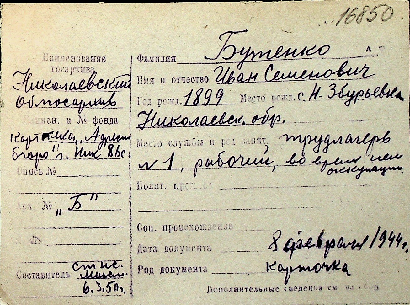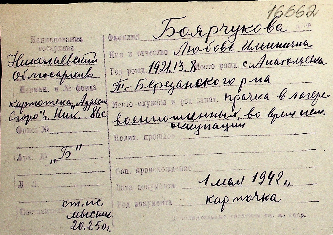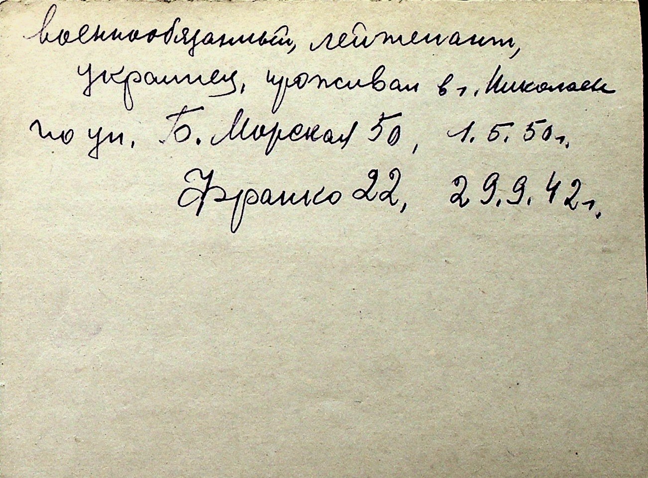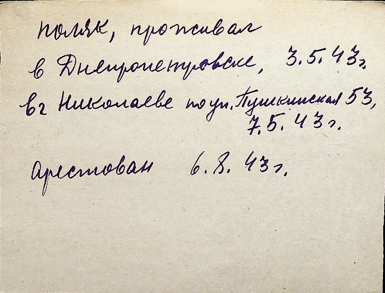 ◦ ◦ Перелік карток на осіб, які мешкали у м. Миколаїв у період окупації 1941–1944 років