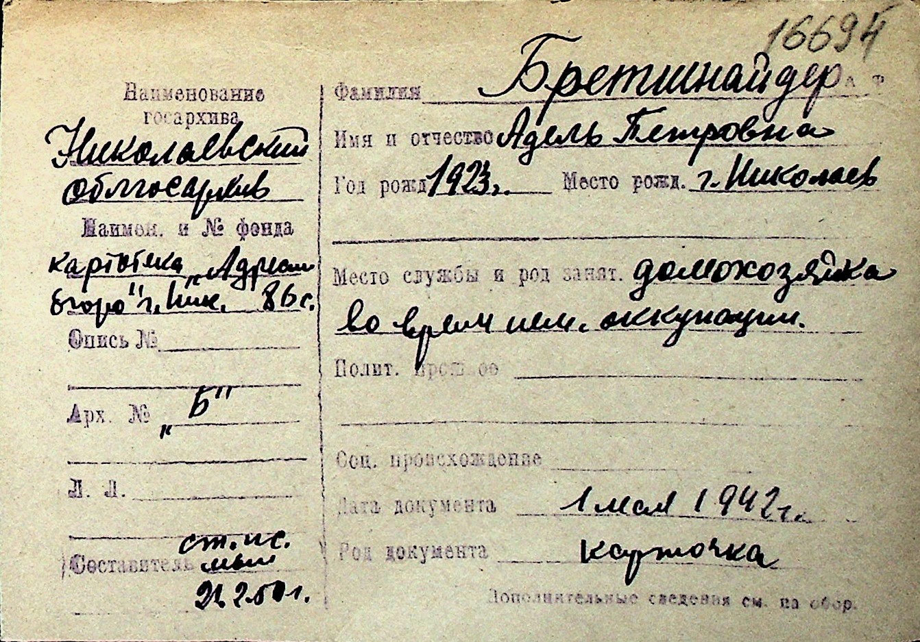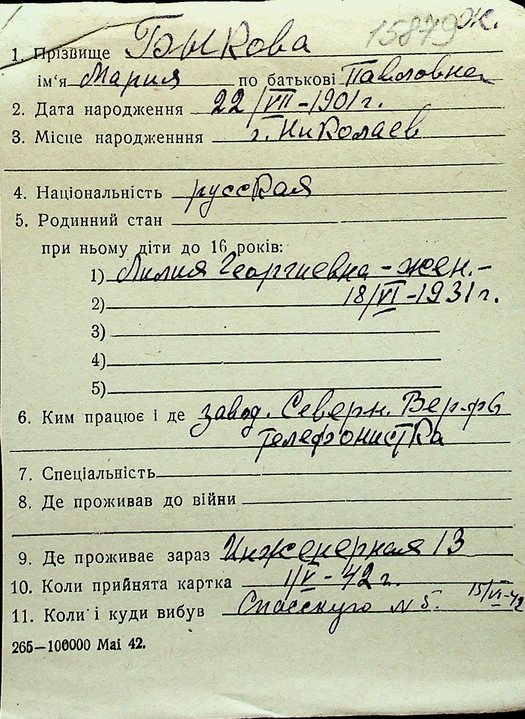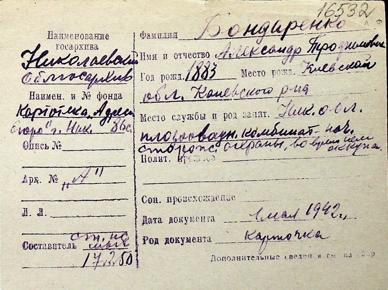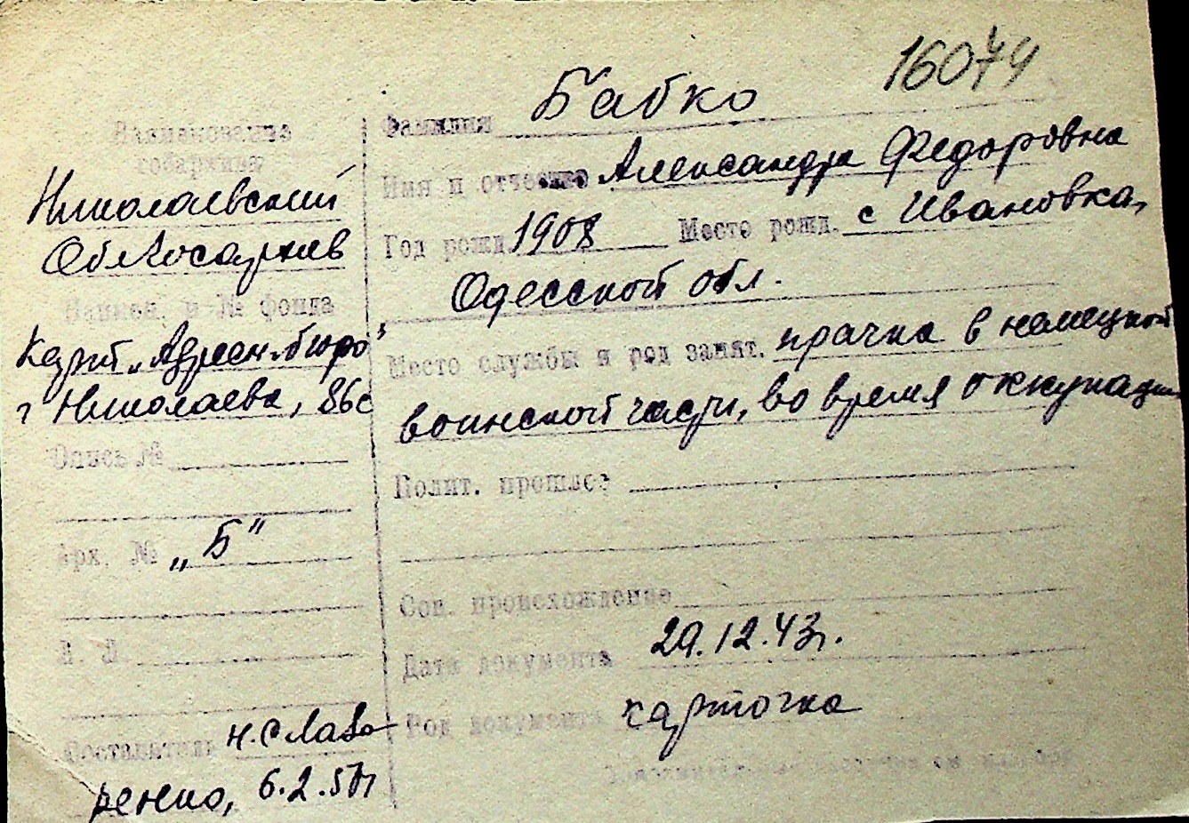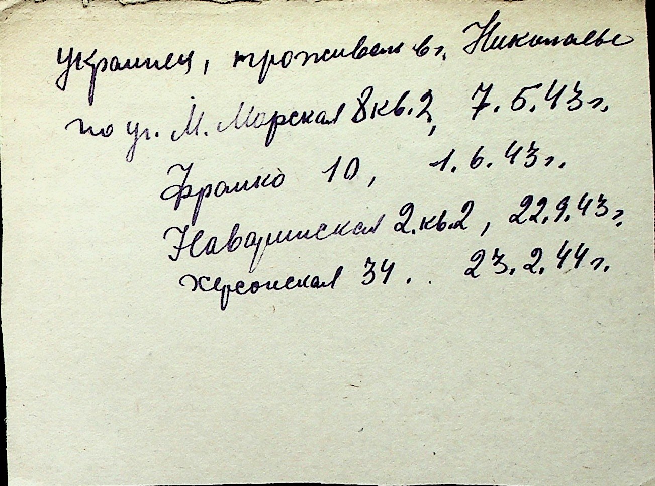 ◦ ◦ Перелік карток на осіб, які мешкали у м. Миколаїв у період окупації 1941–1944 років