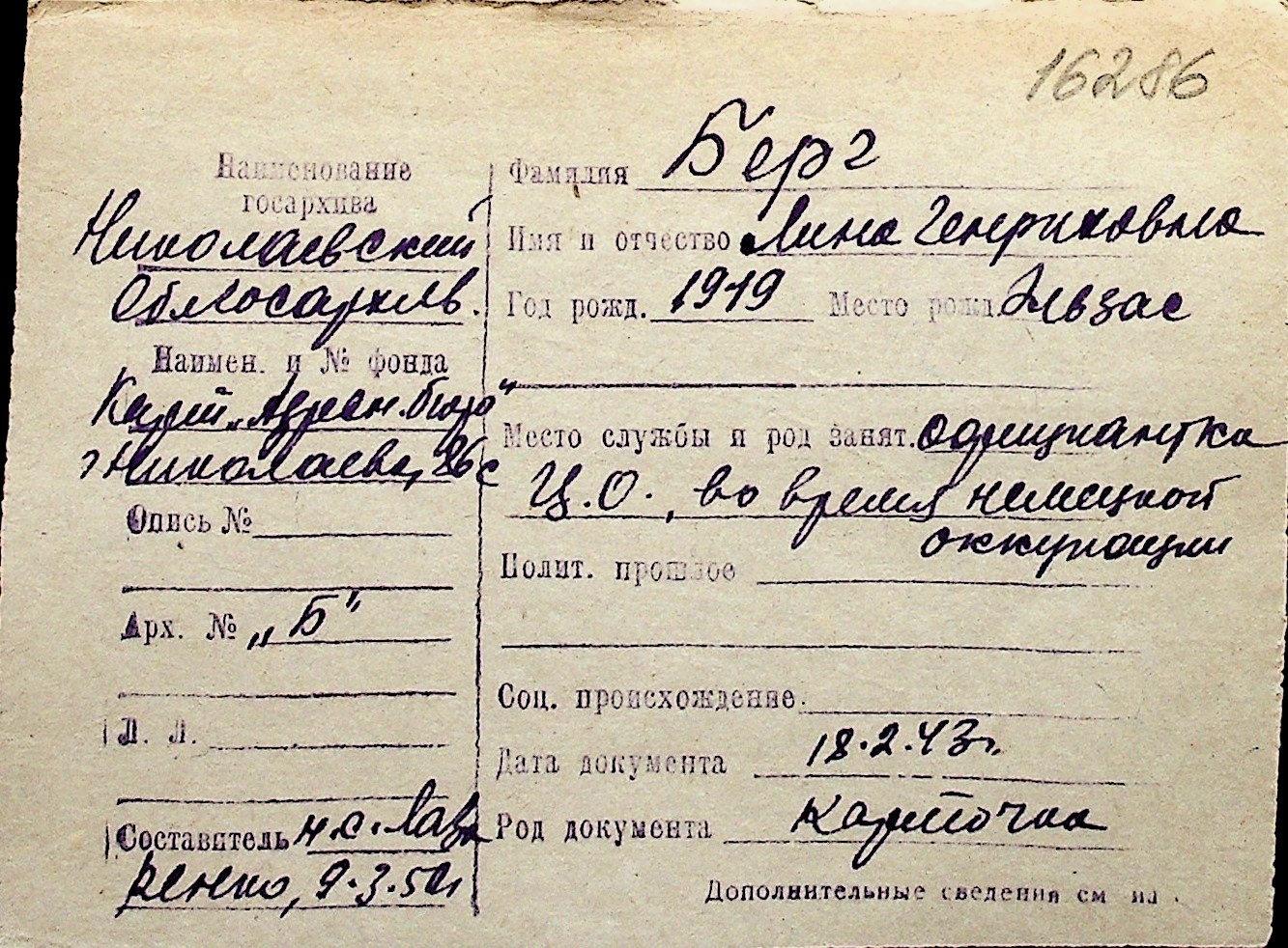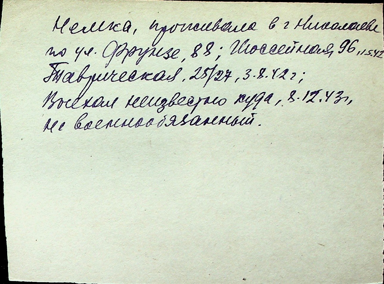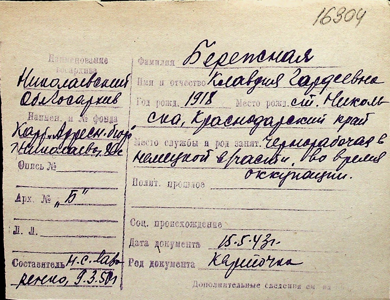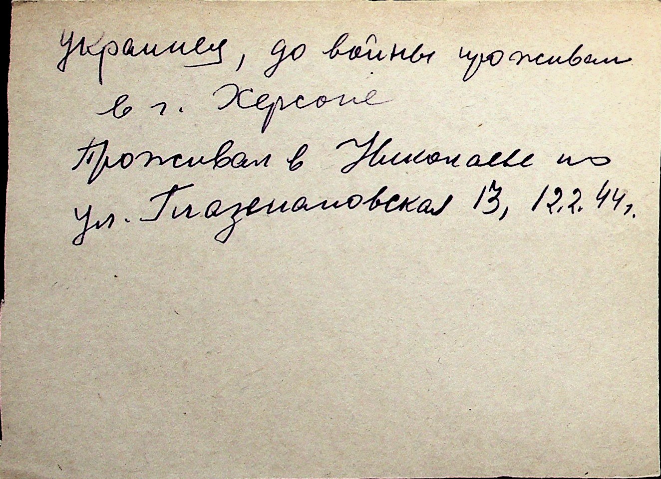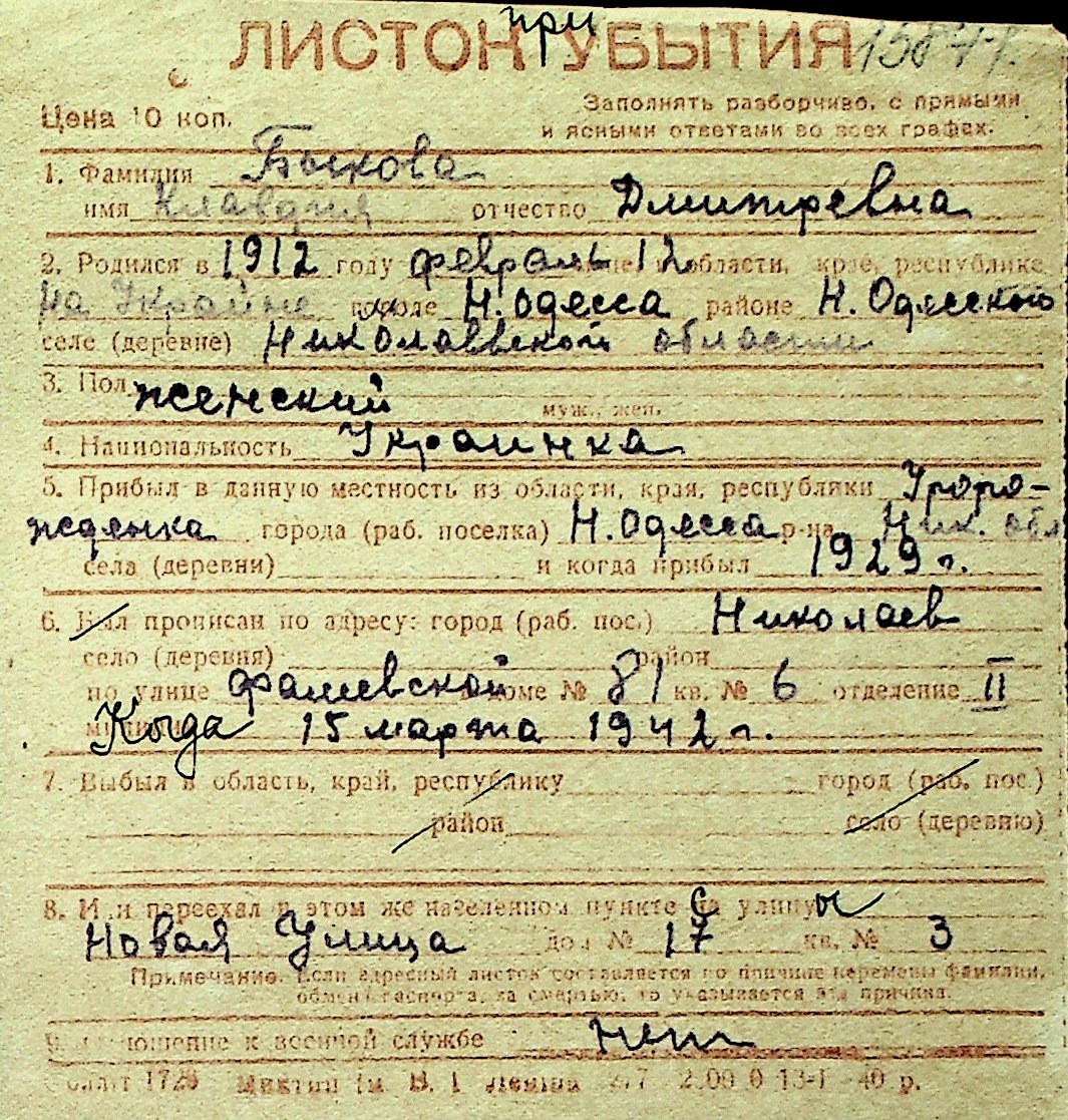 ◦ ◦ Перелік карток на осіб, які мешкали у м. Миколаїв у період окупації 1941–1944 років