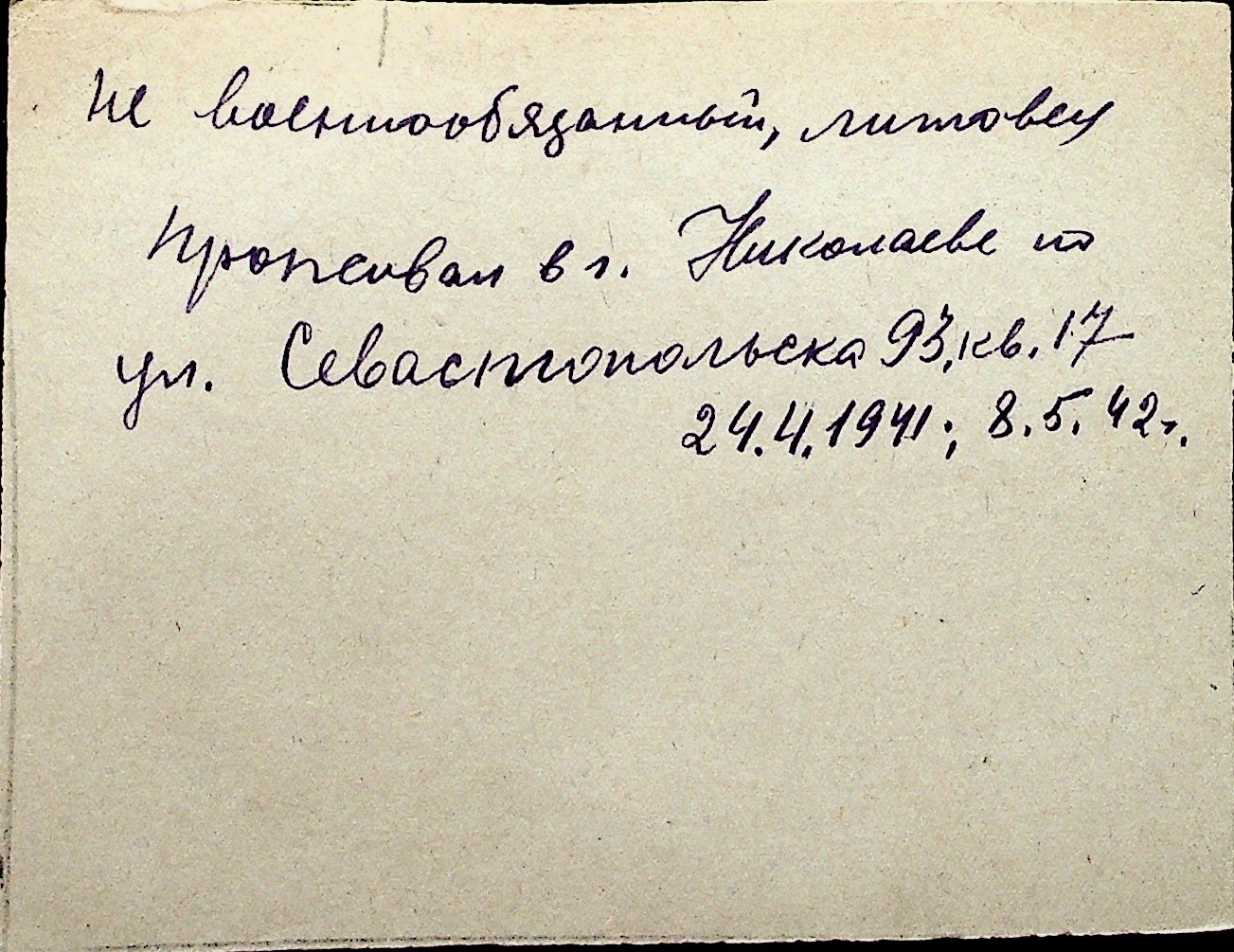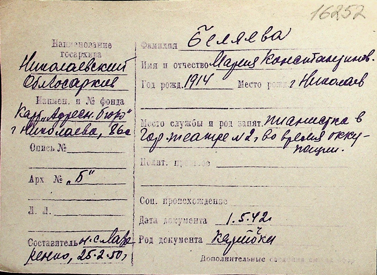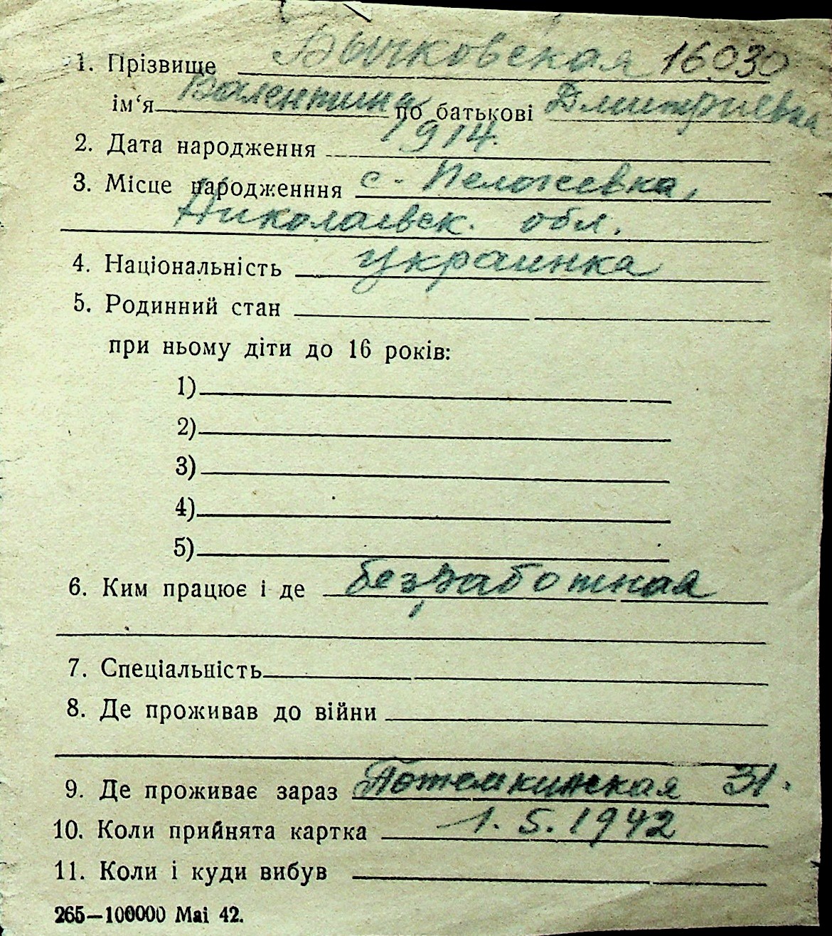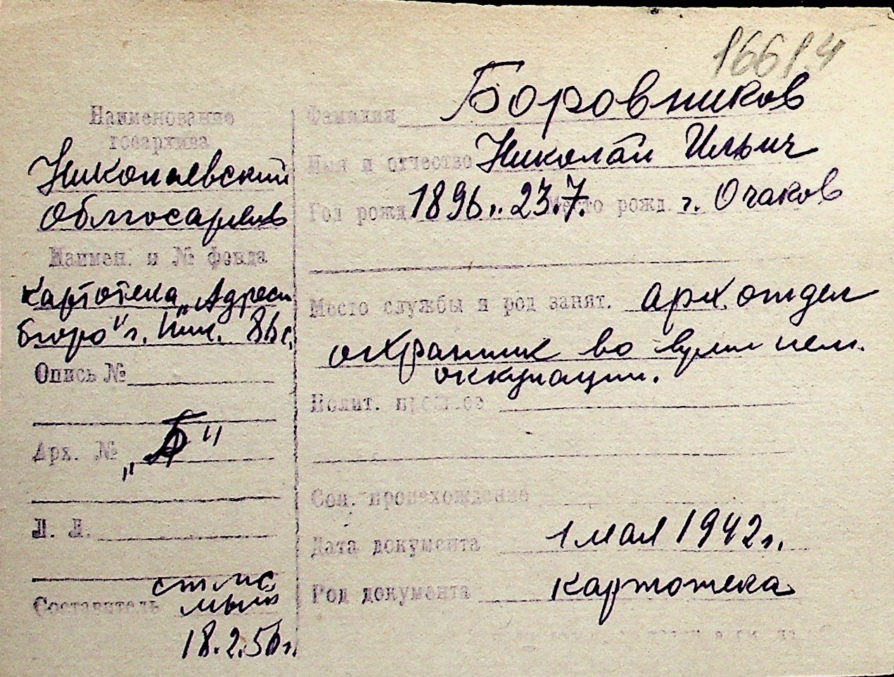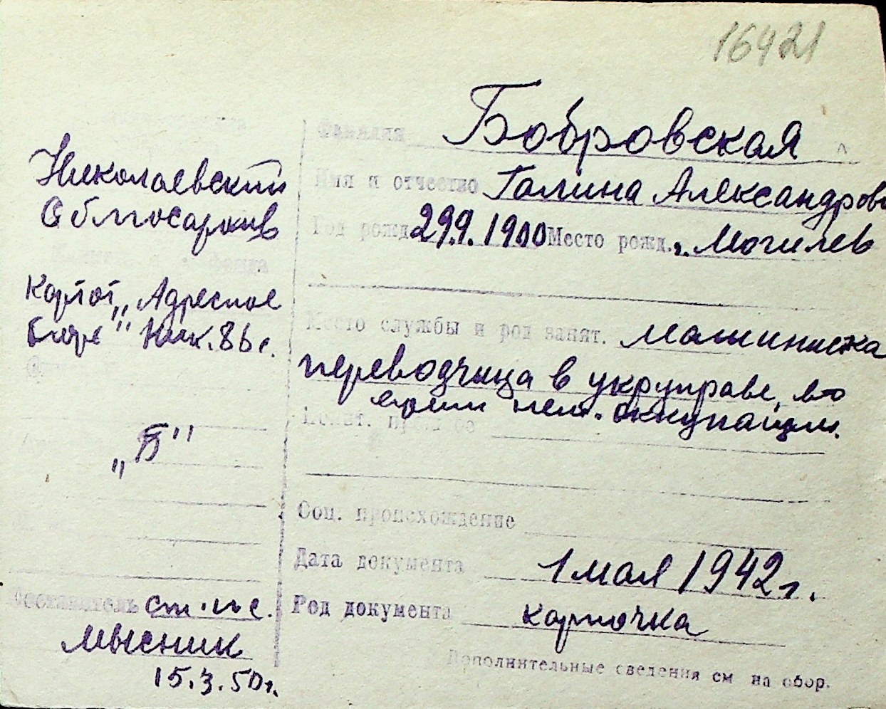 ◦ ◦ Перелік карток на осіб, які мешкали у м. Миколаїв у період окупації 1941–1944 років