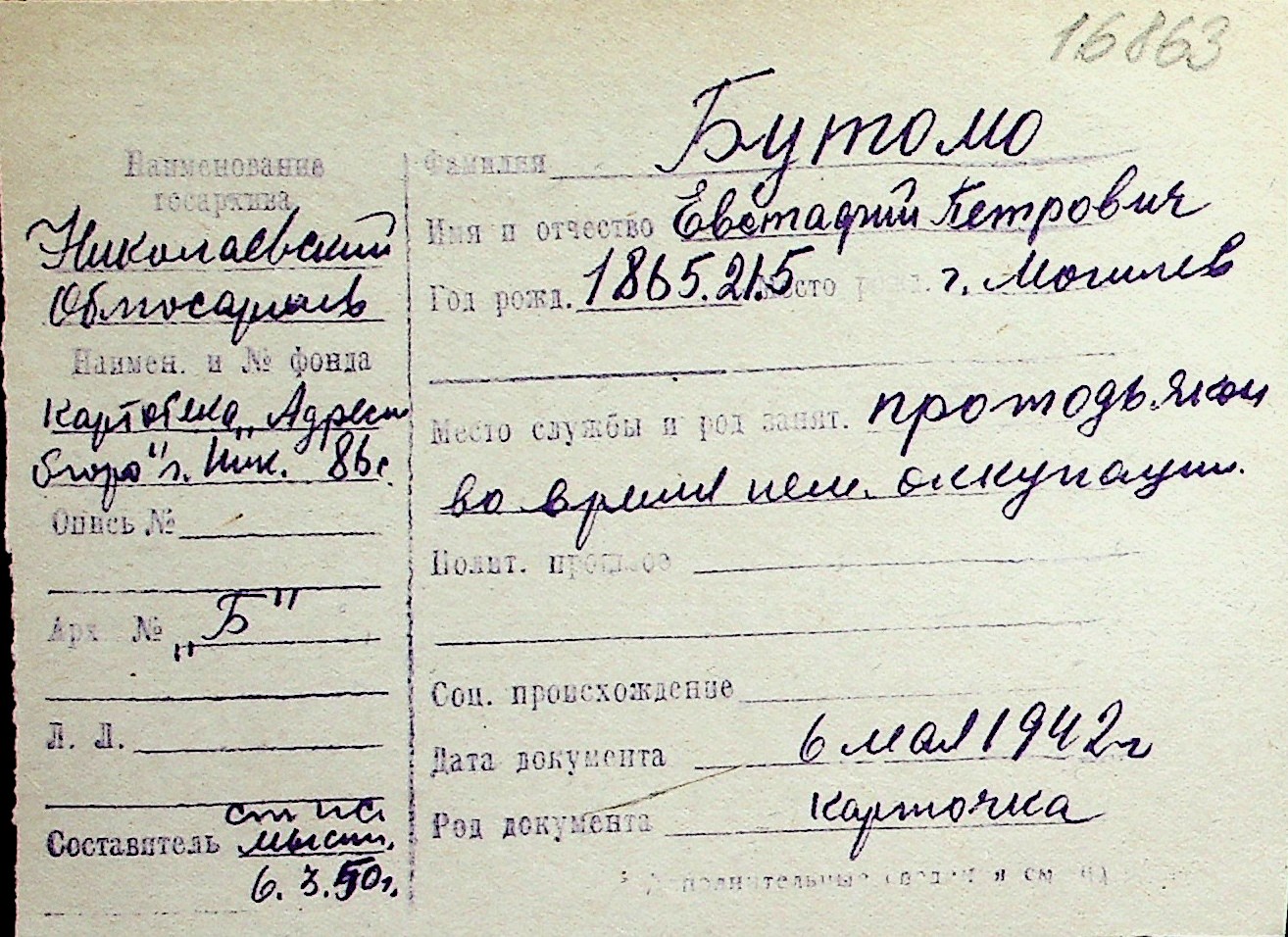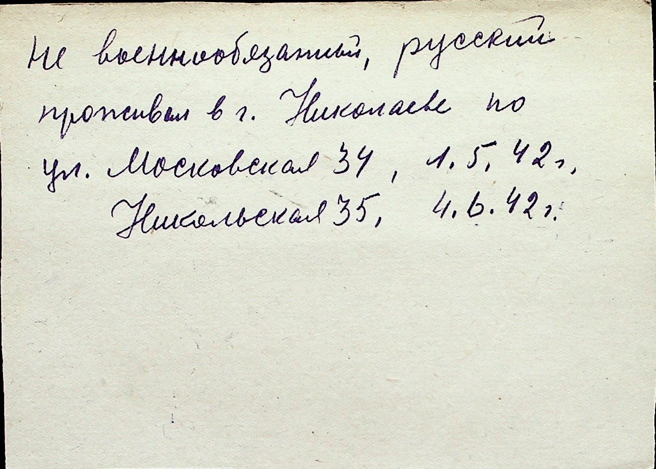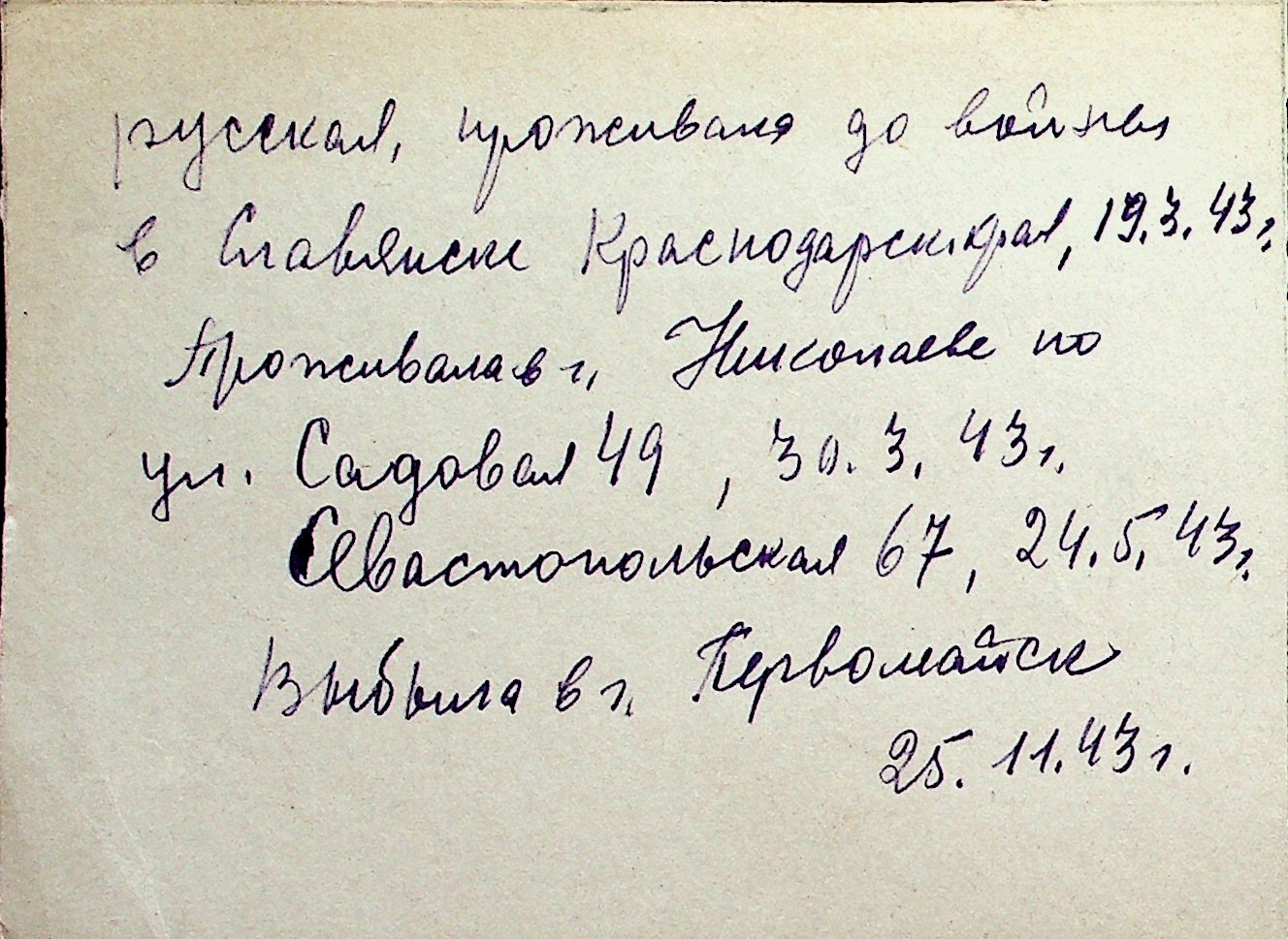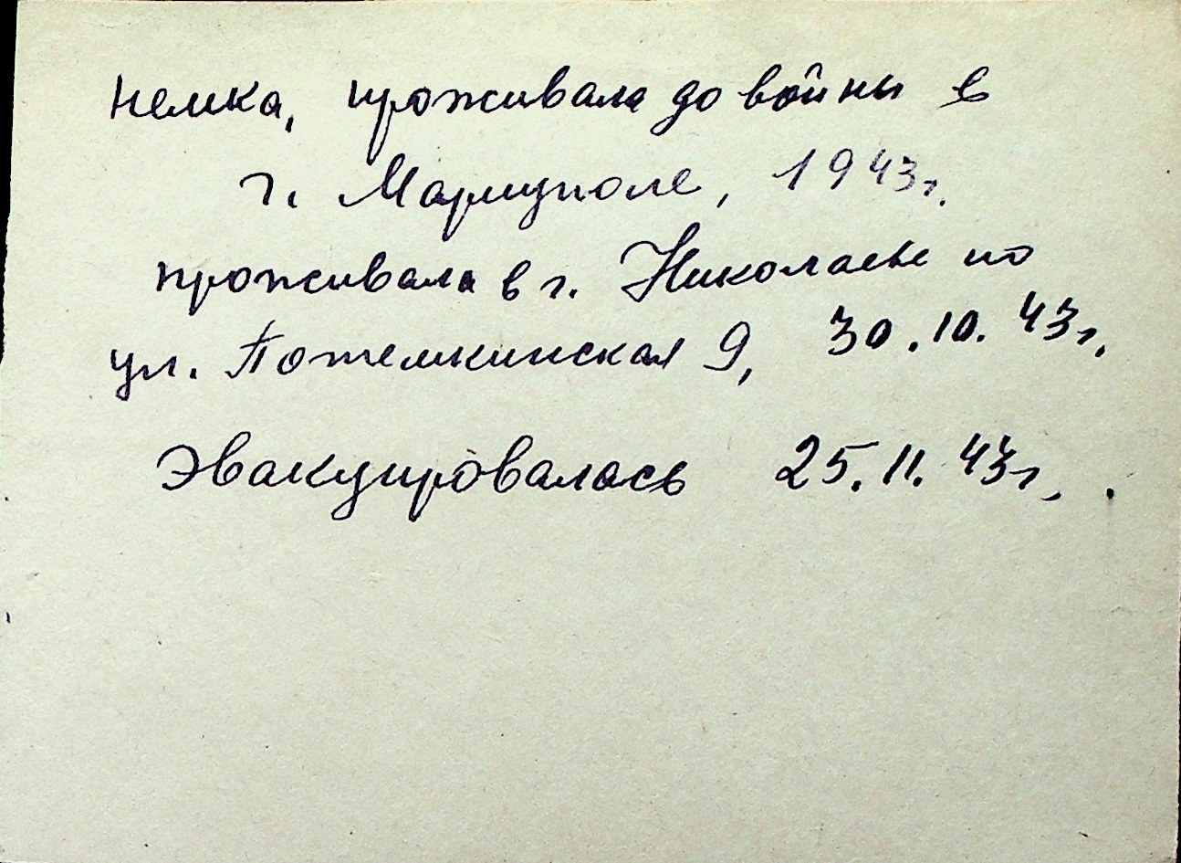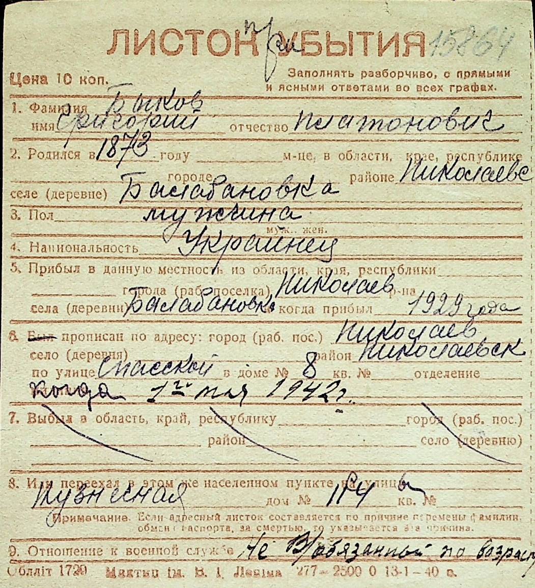 ◦ ◦ Перелік карток на осіб, які мешкали у м. Миколаїв у період окупації 1941–1944 років