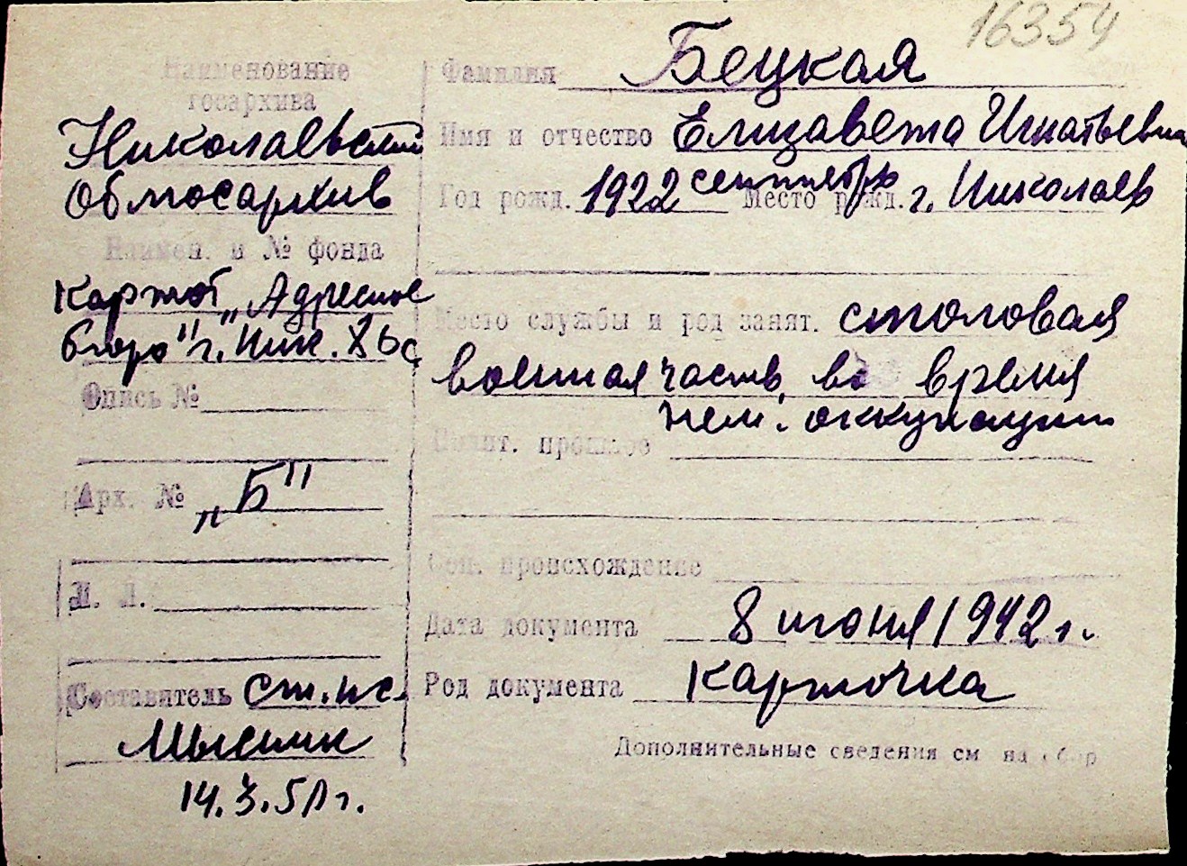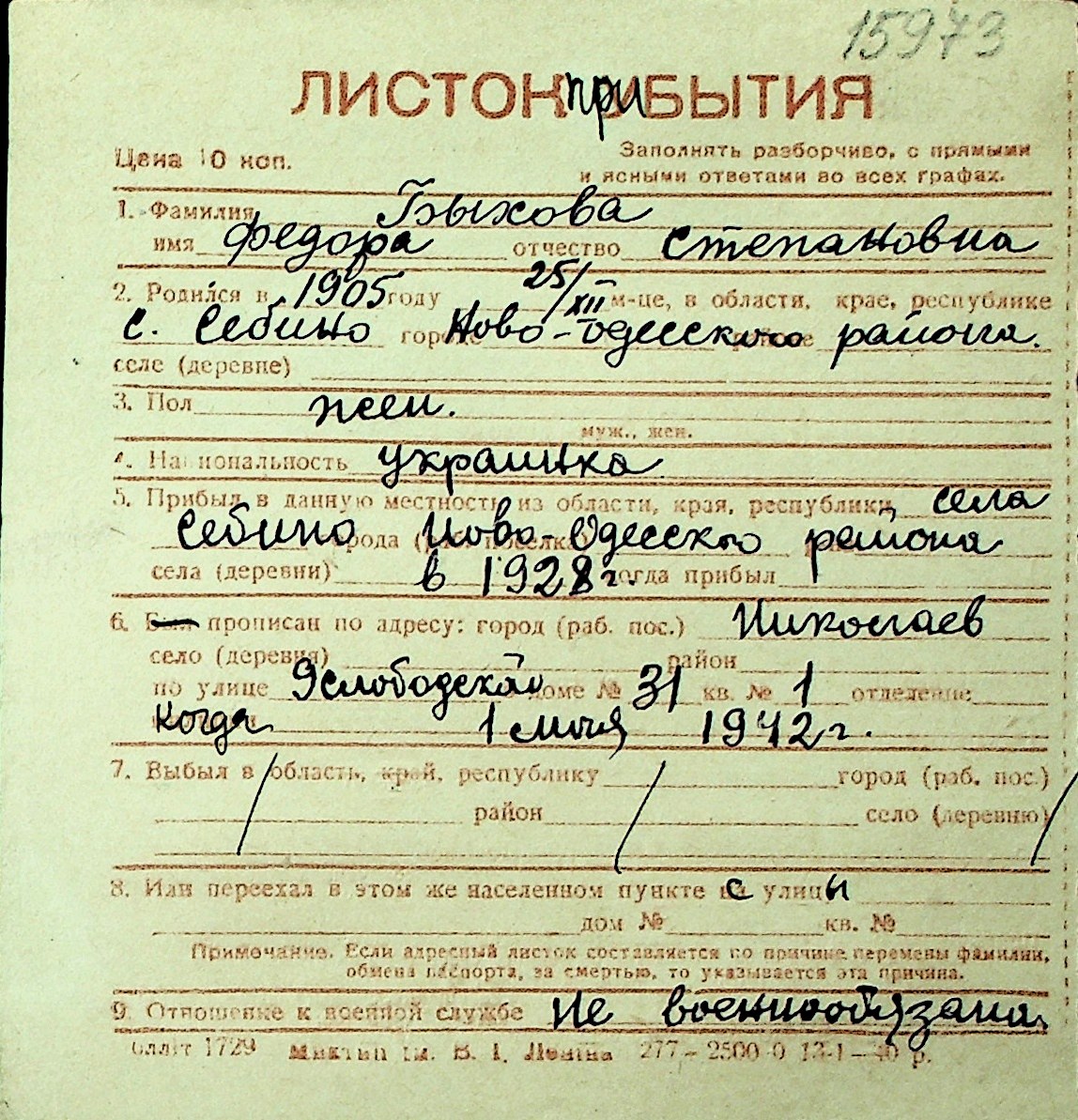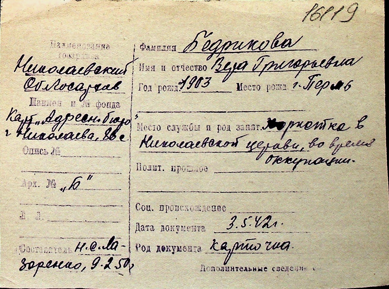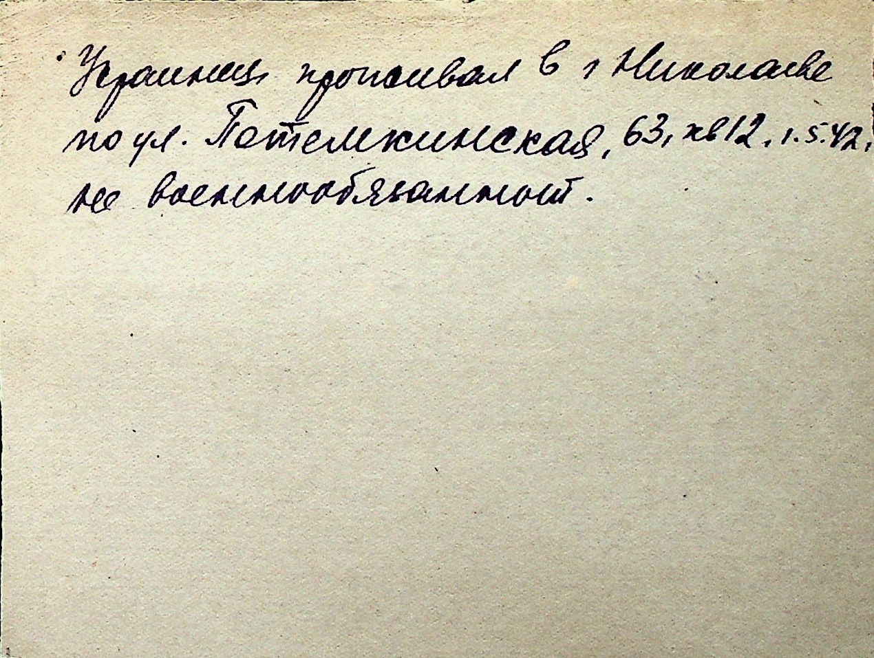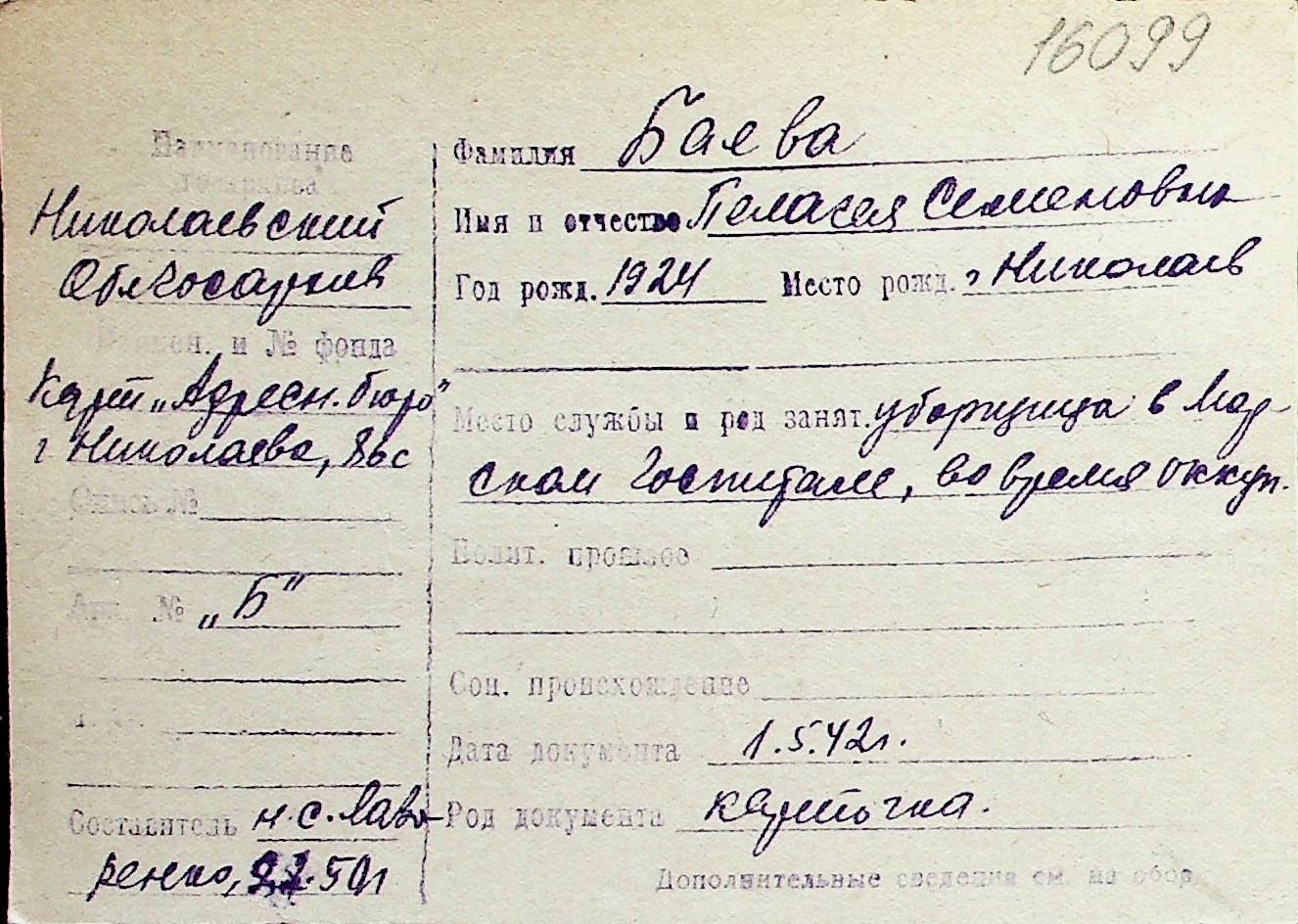 ◦ ◦ Перелік карток на осіб, які мешкали у м. Миколаїв у період окупації 1941–1944 років