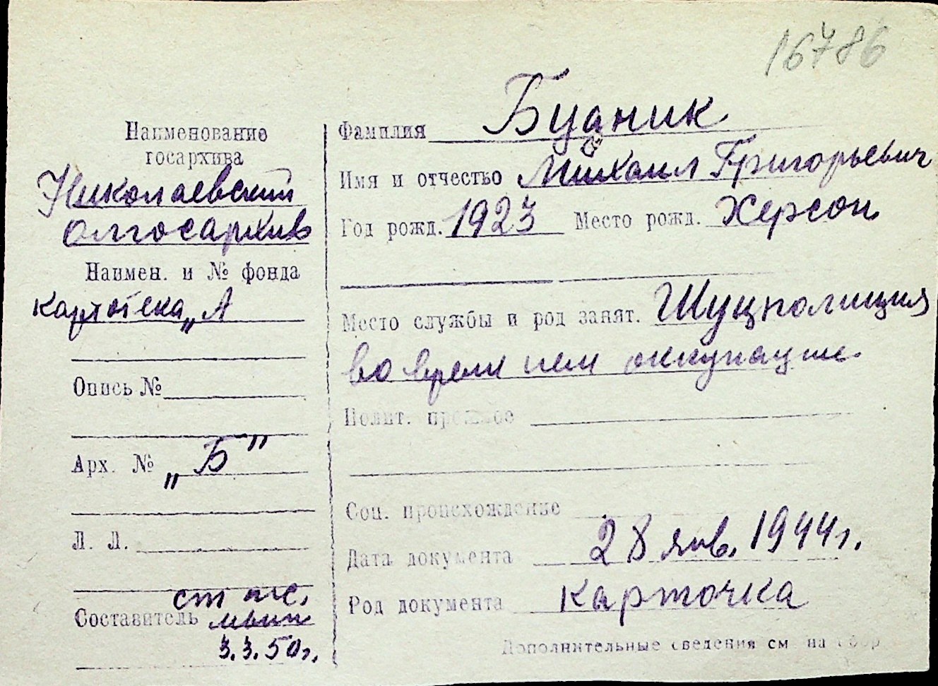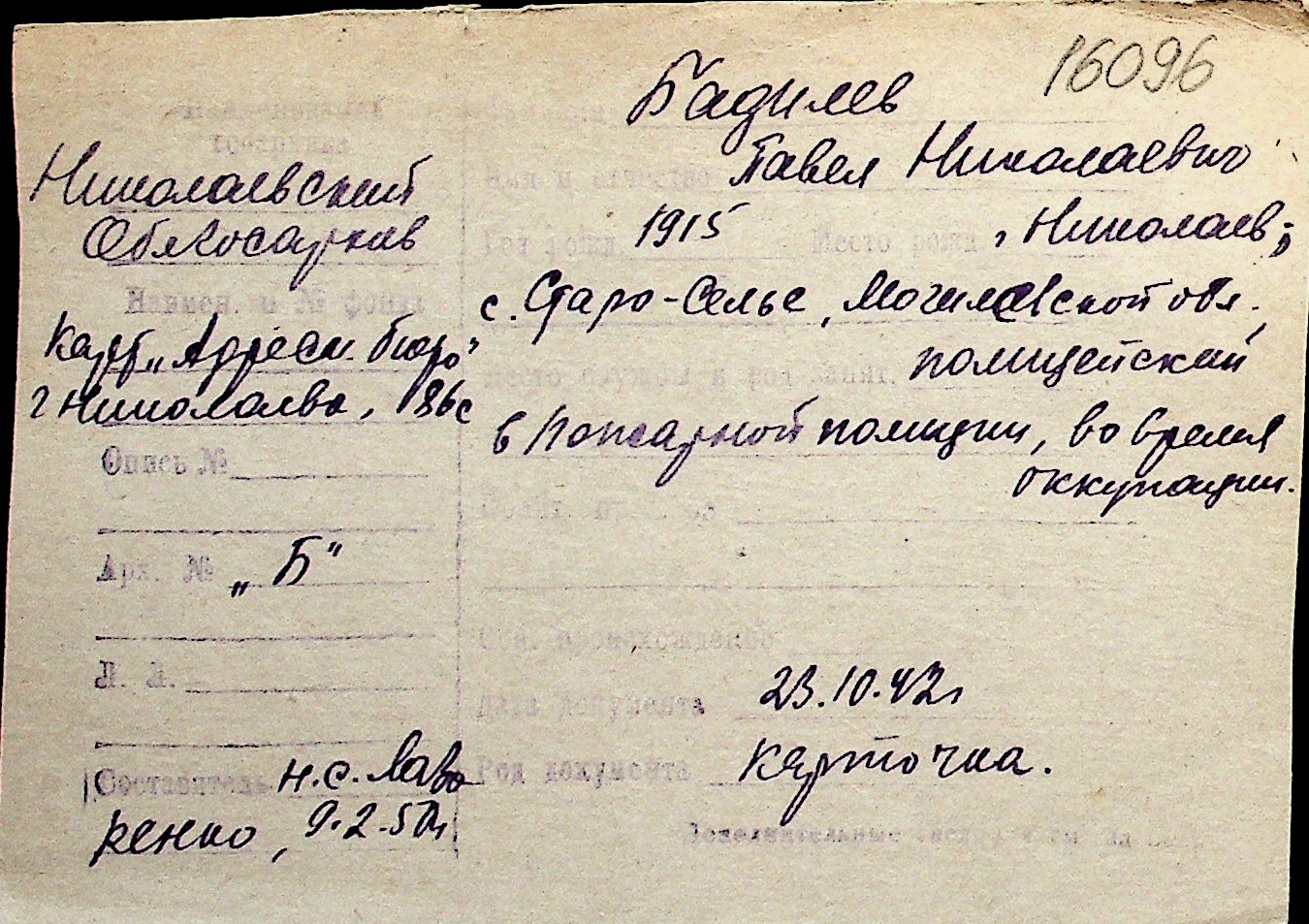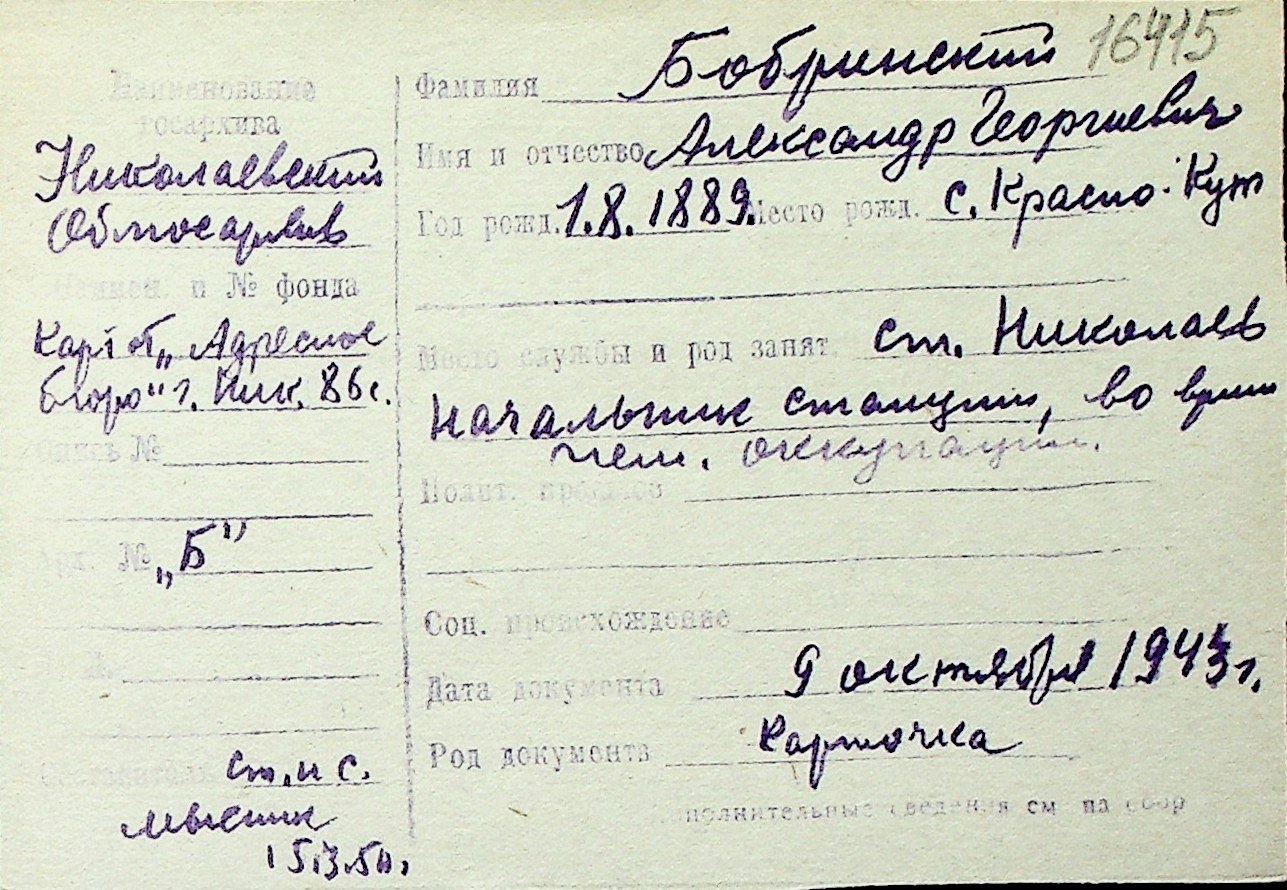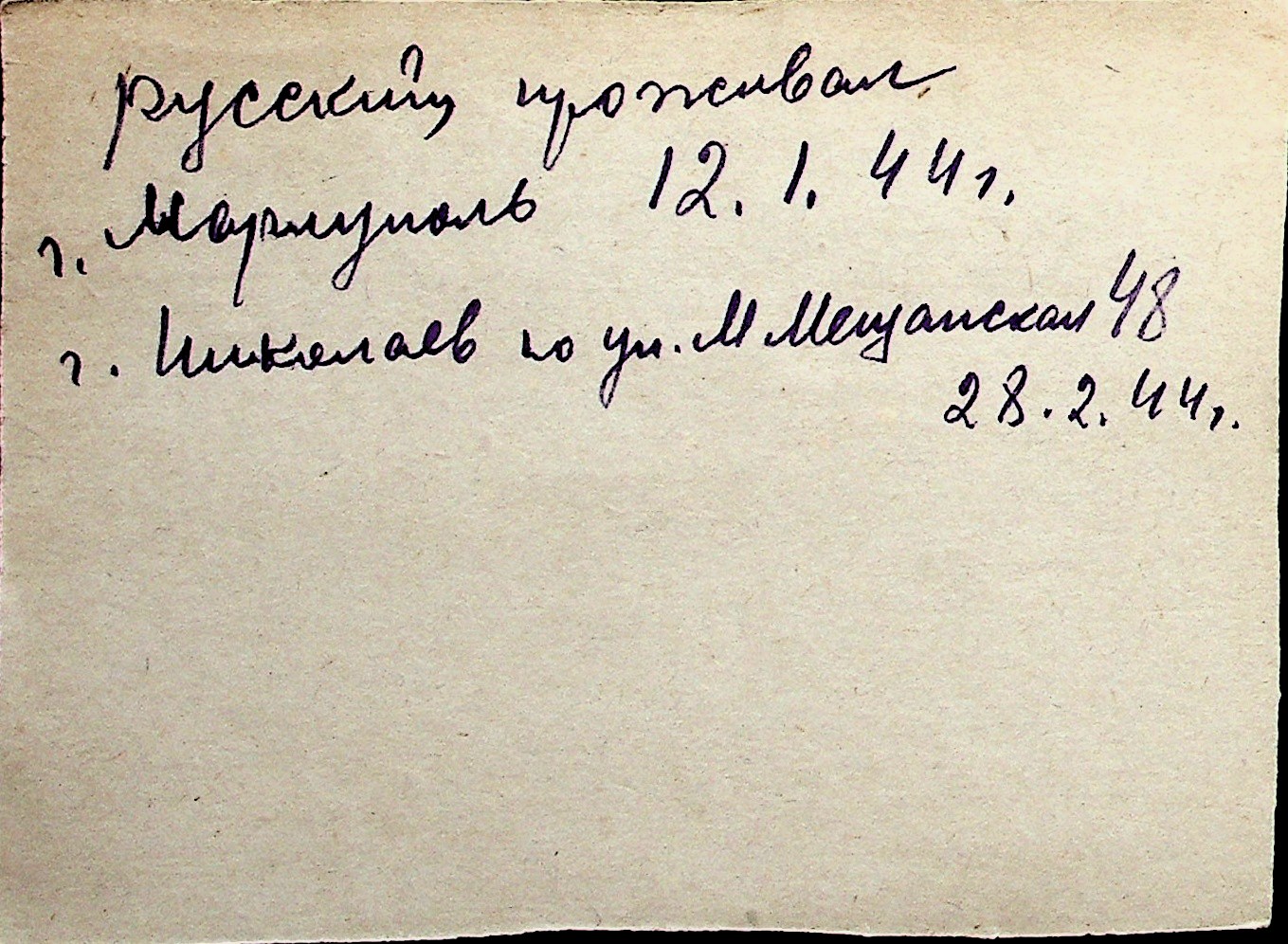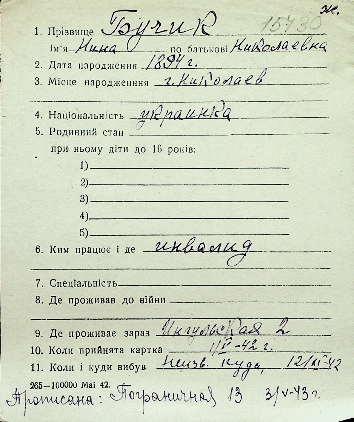◦ ◦ Перелік карток на осіб, які мешкали у м. Миколаїв у період окупації 1941–1944 років