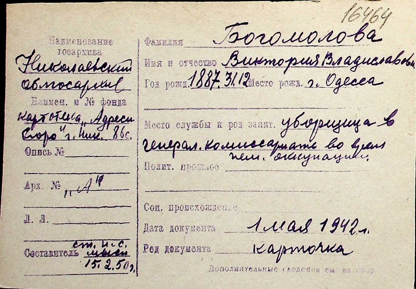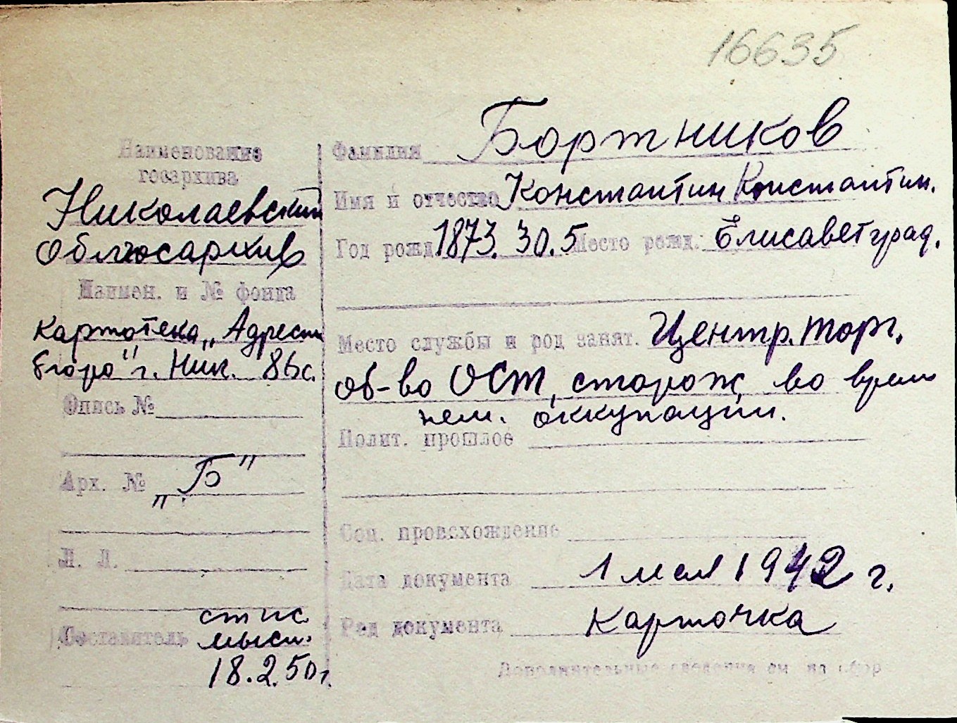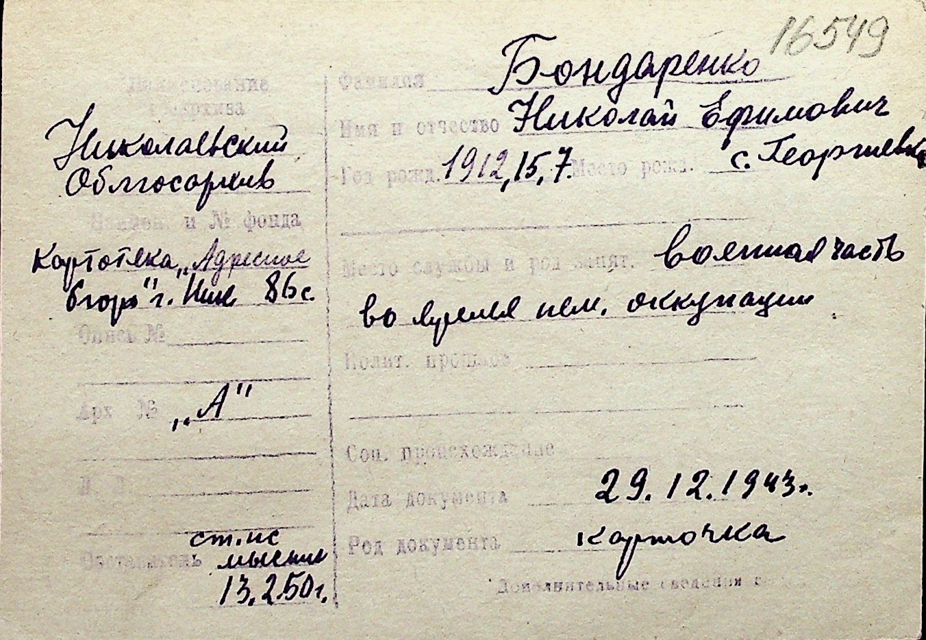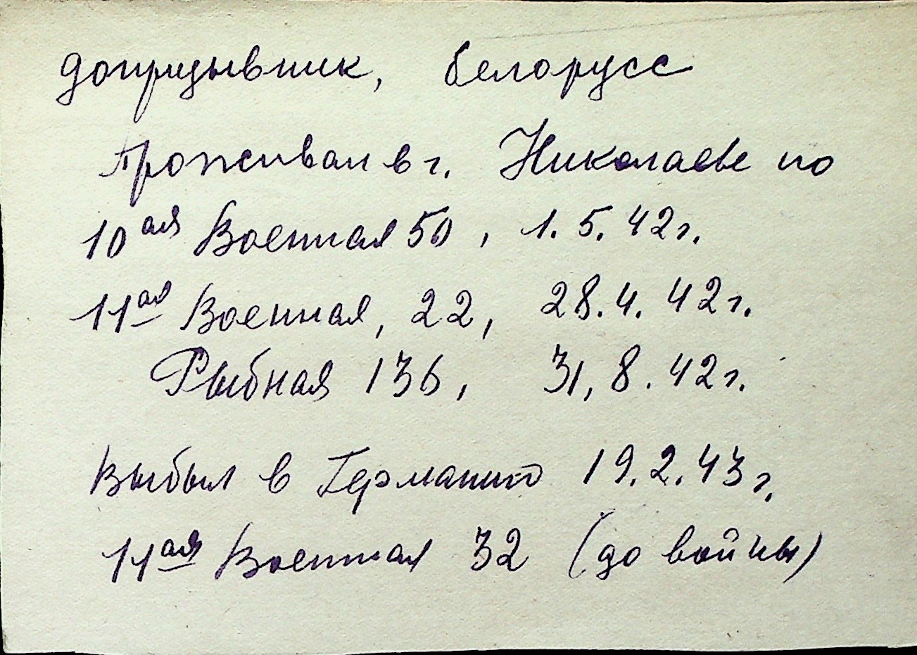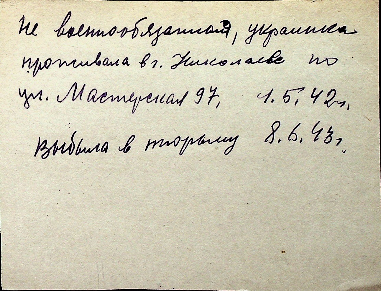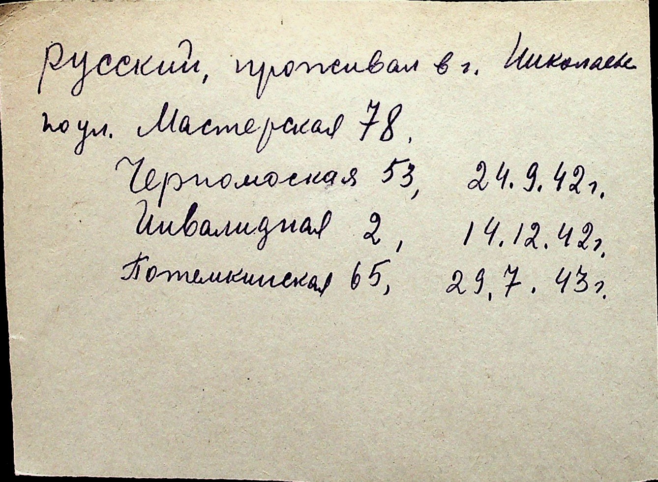 ◦ ◦ Перелік карток на осіб, які мешкали у м. Миколаїв у період окупації 1941–1944 років