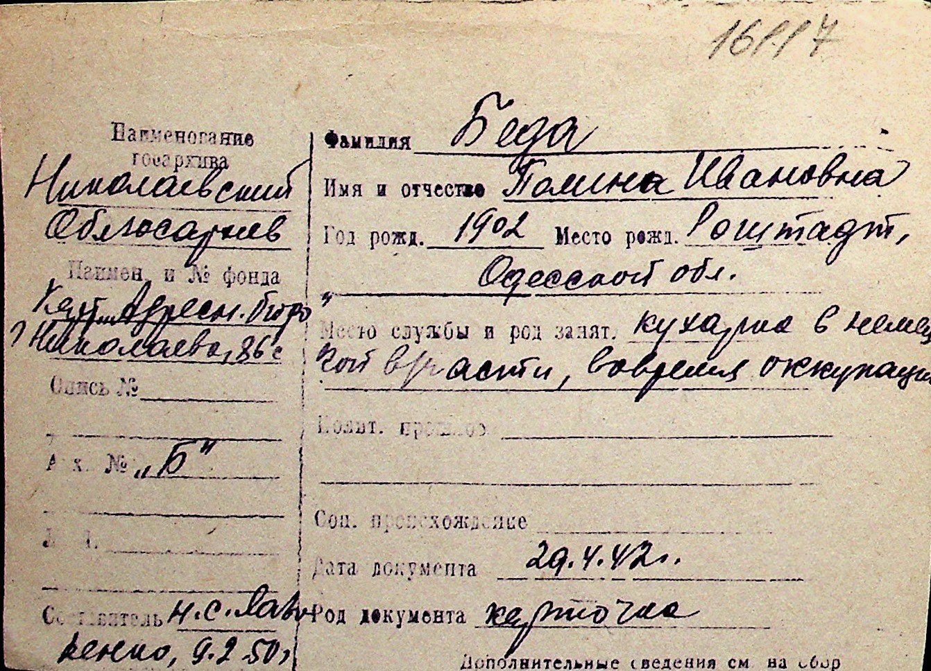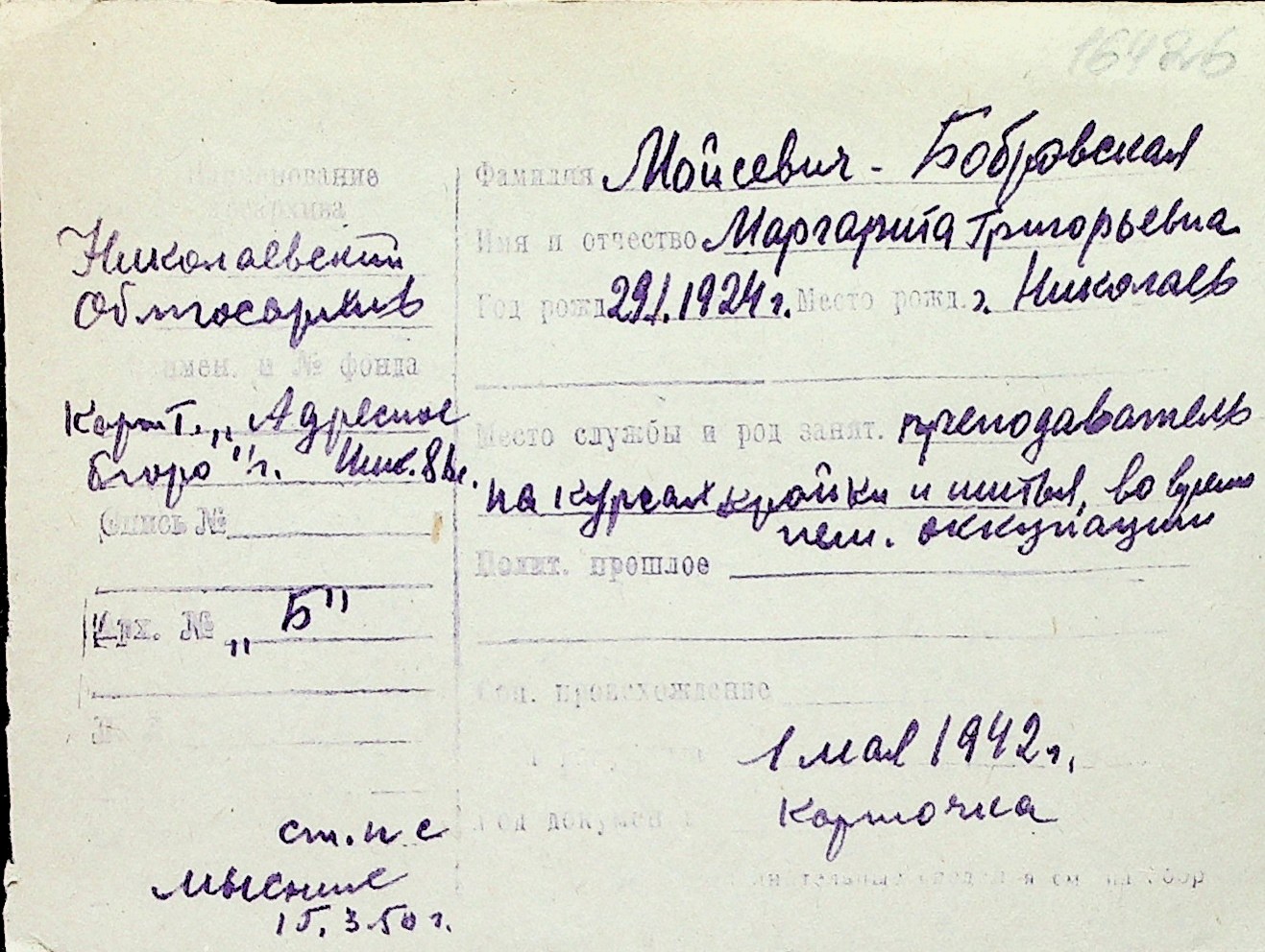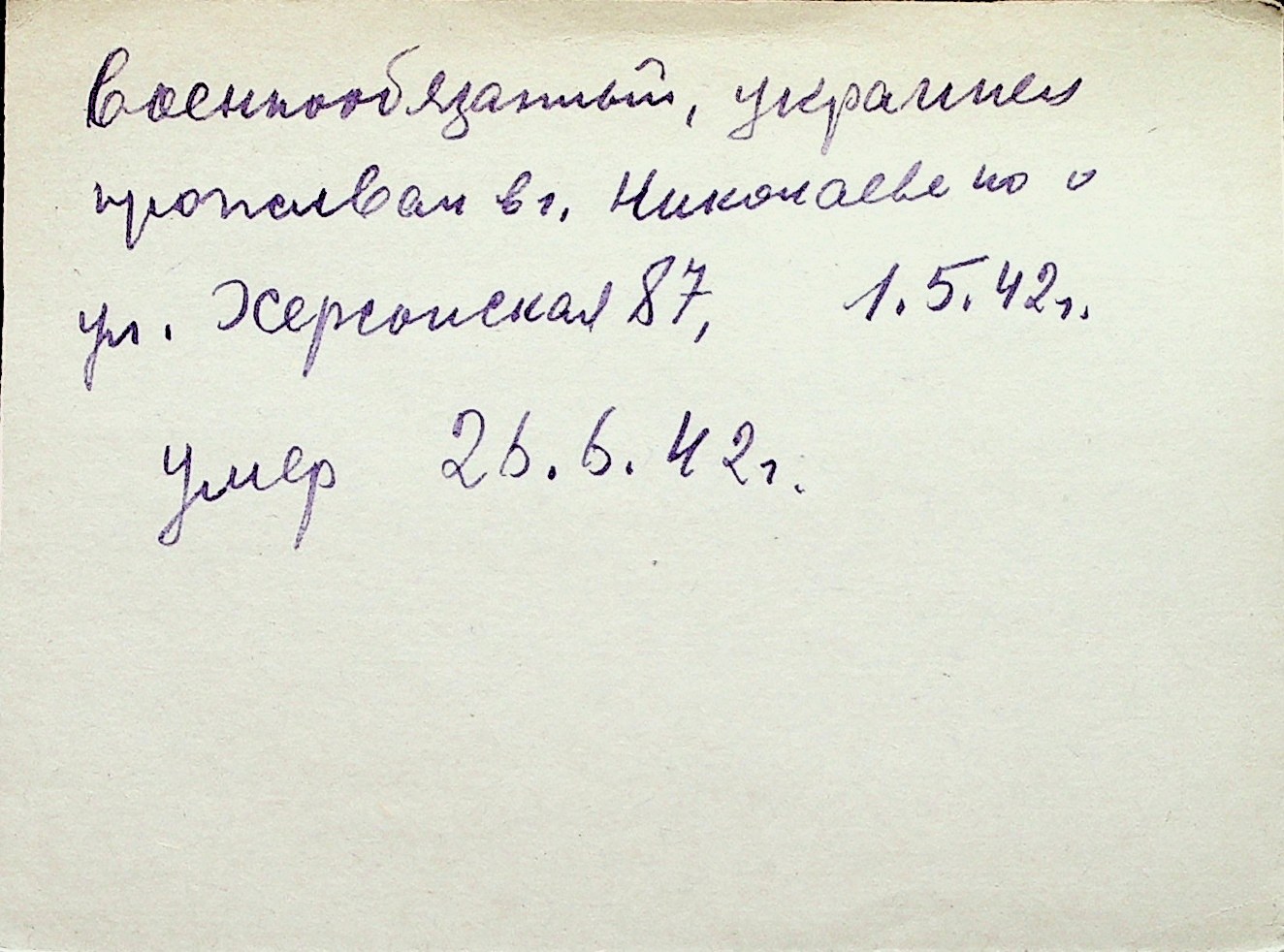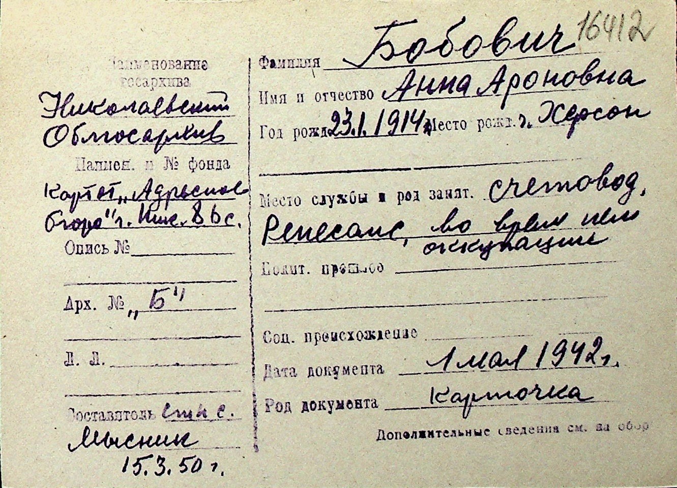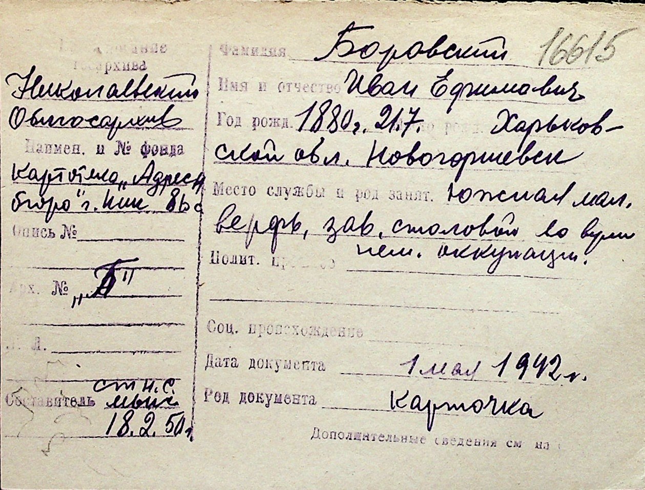◦ ◦ Перелік карток на осіб, які мешкали у м. Миколаїв у період окупації 1941–1944 років