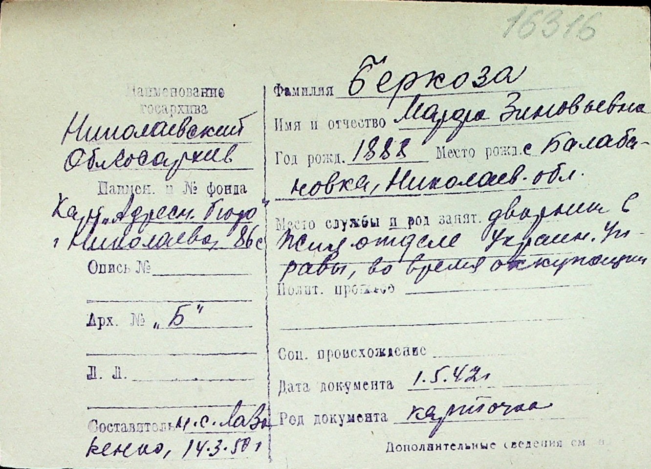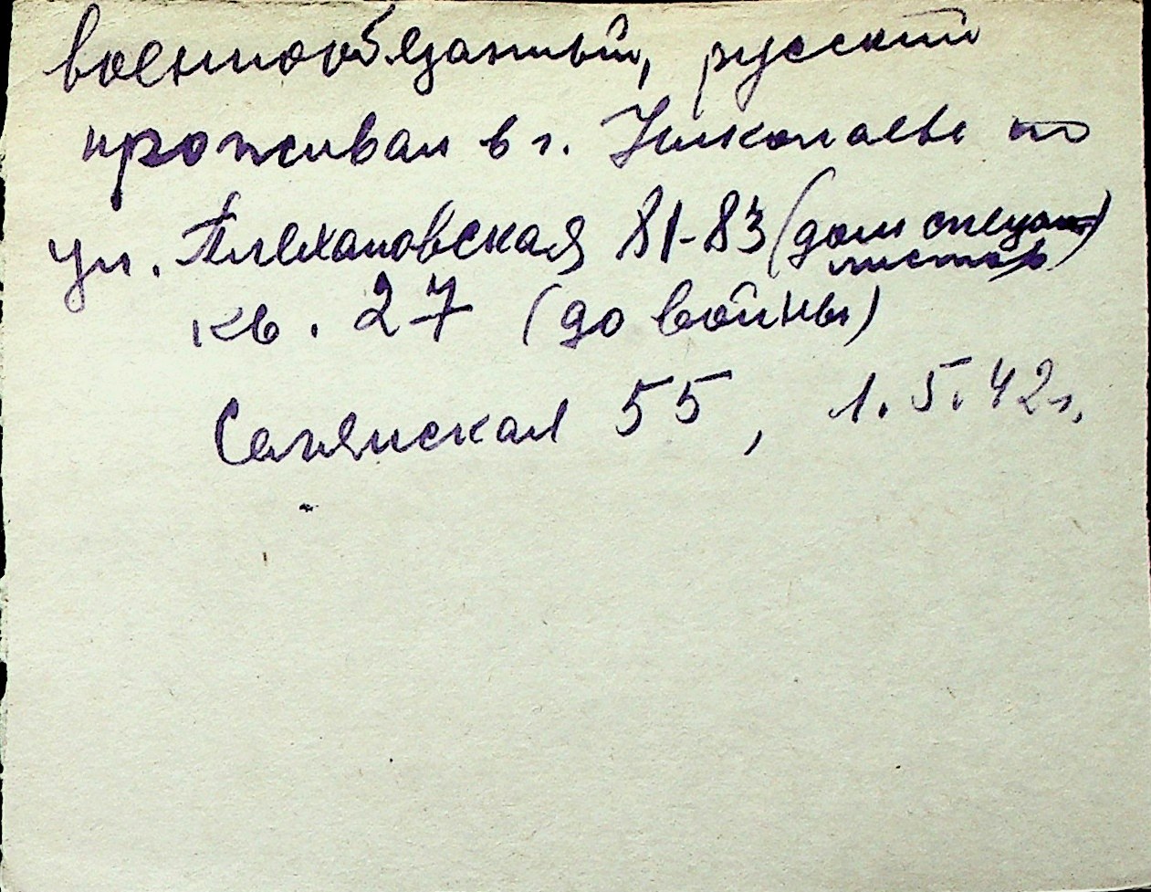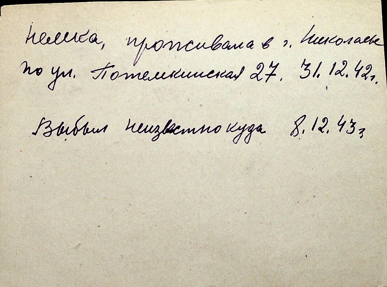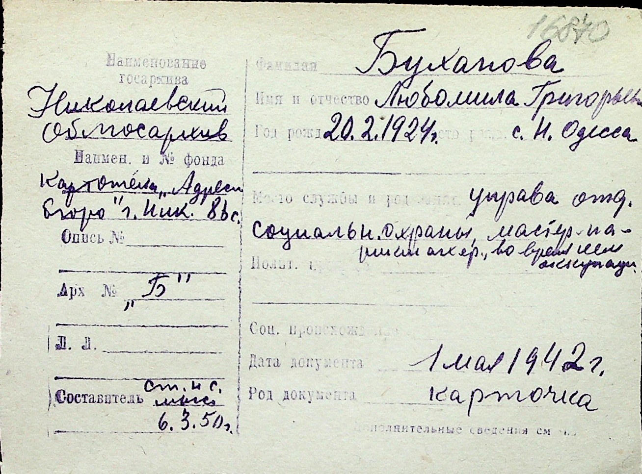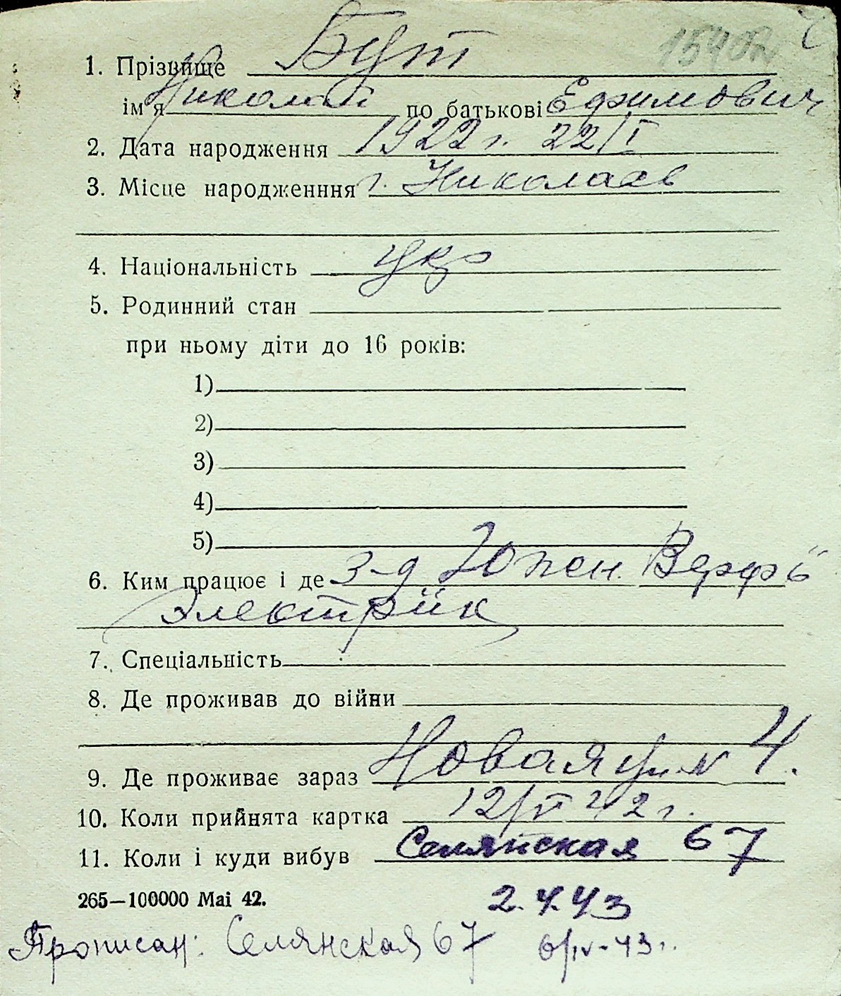 ◦ ◦ Перелік карток на осіб, які мешкали у м. Миколаїв у період окупації 1941–1944 років