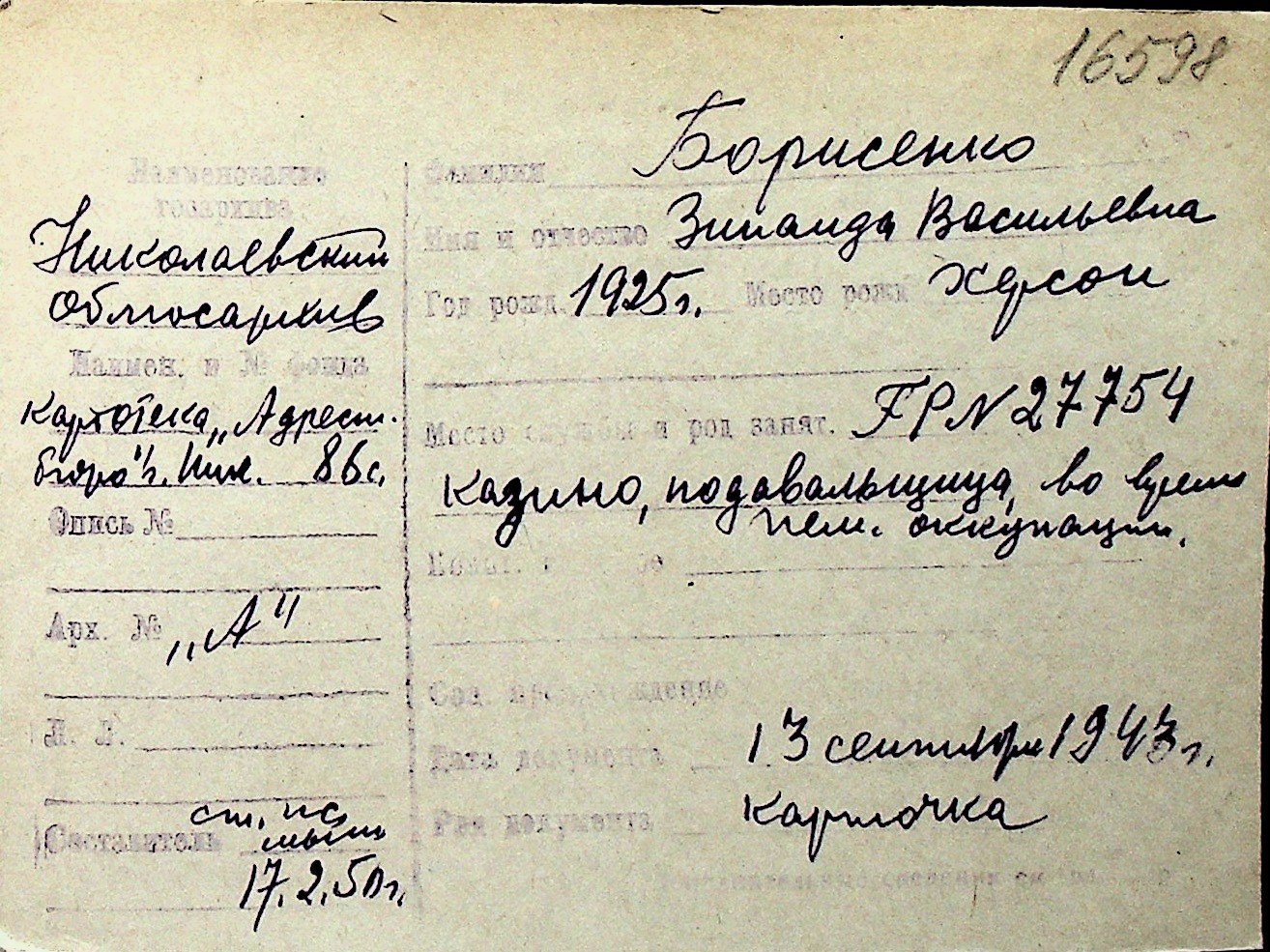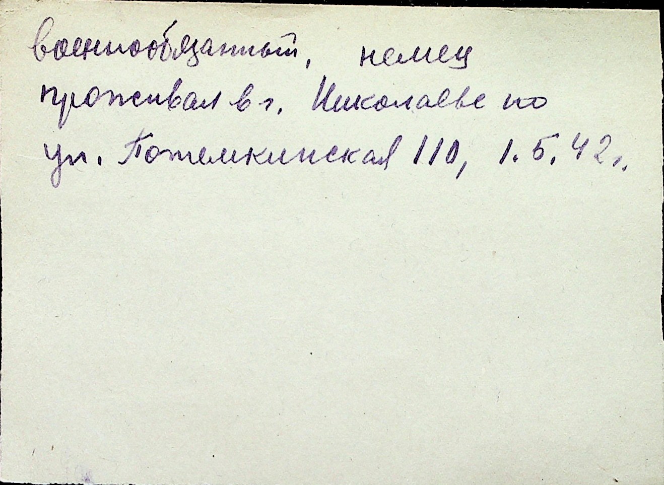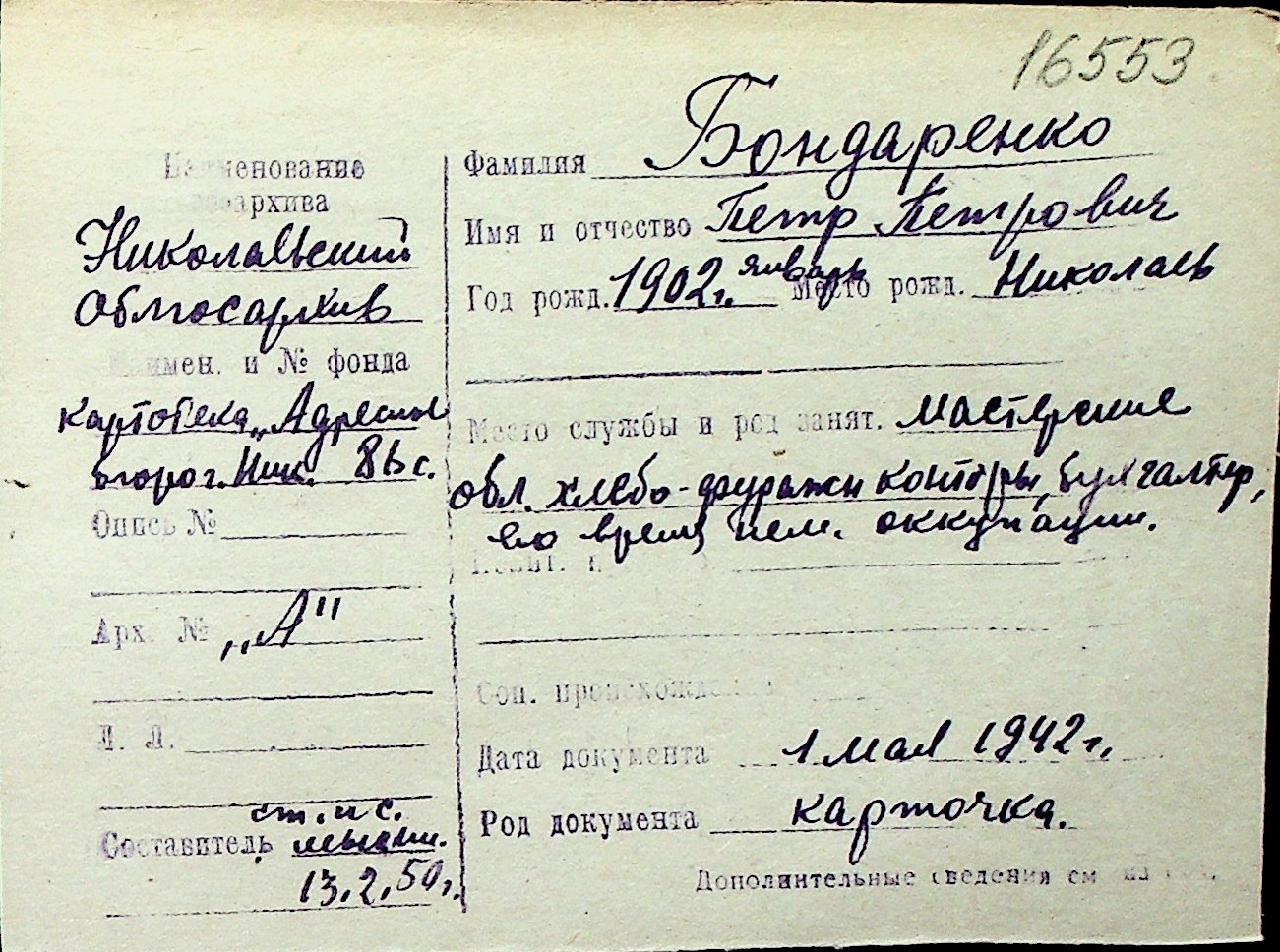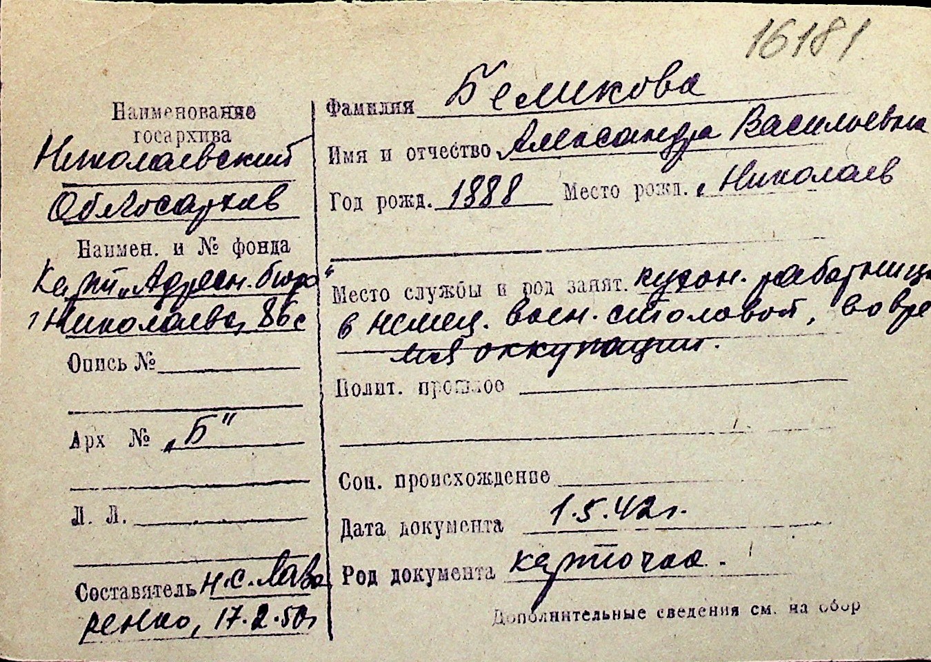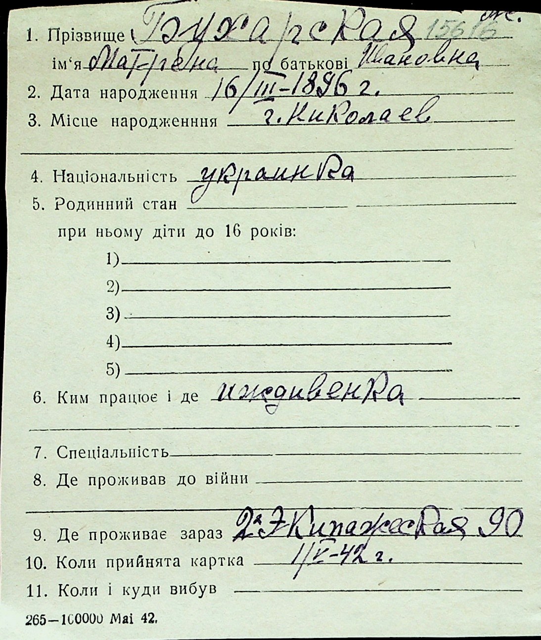 ◦ ◦ Перелік карток на осіб, які мешкали у м. Миколаїв у період окупації 1941–1944 років
