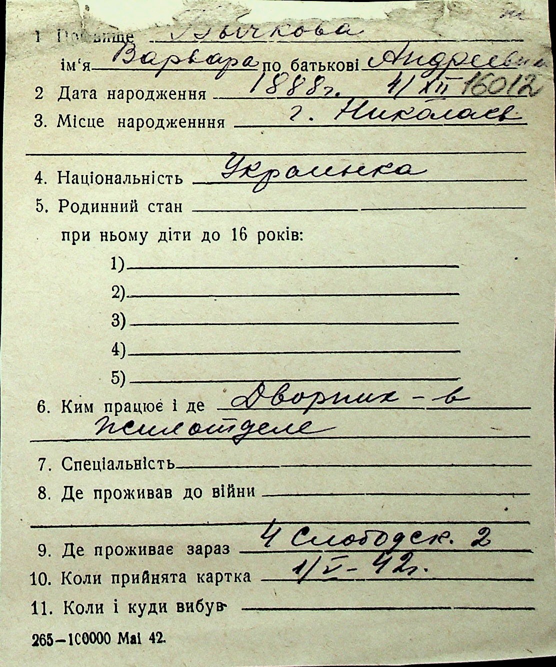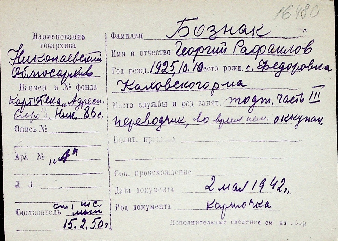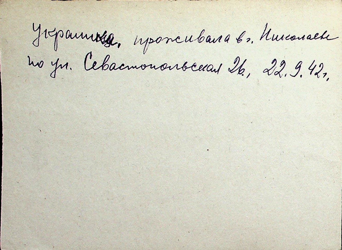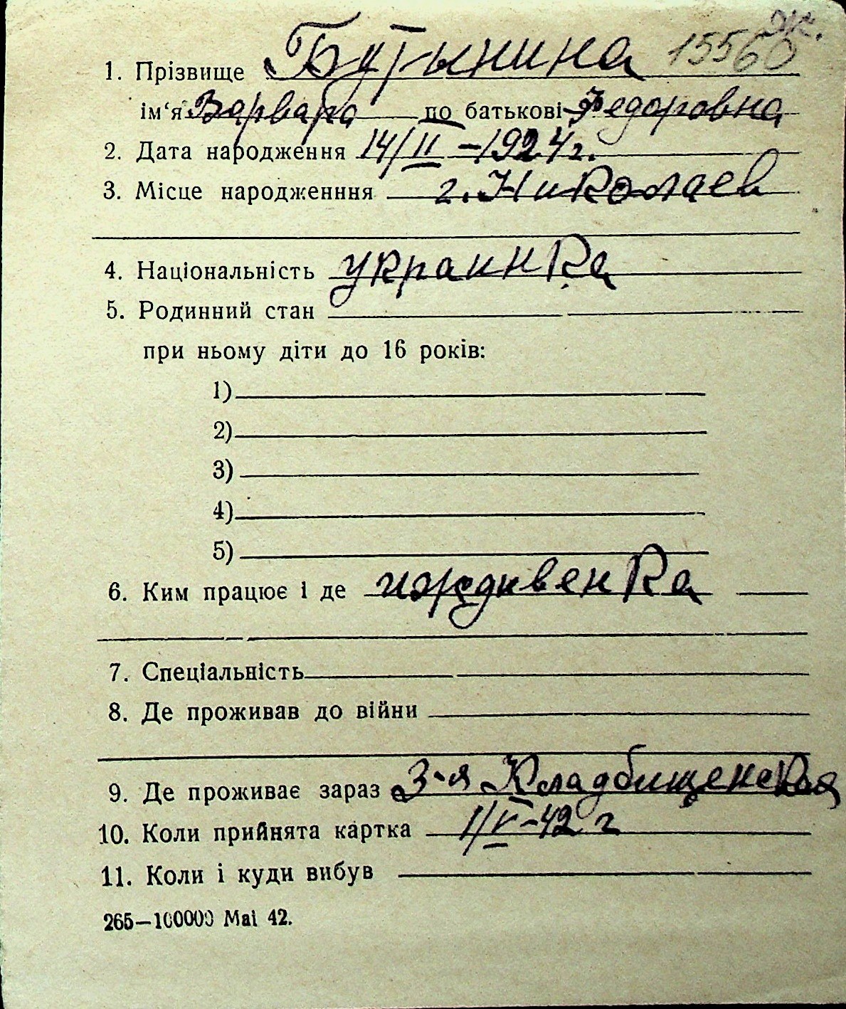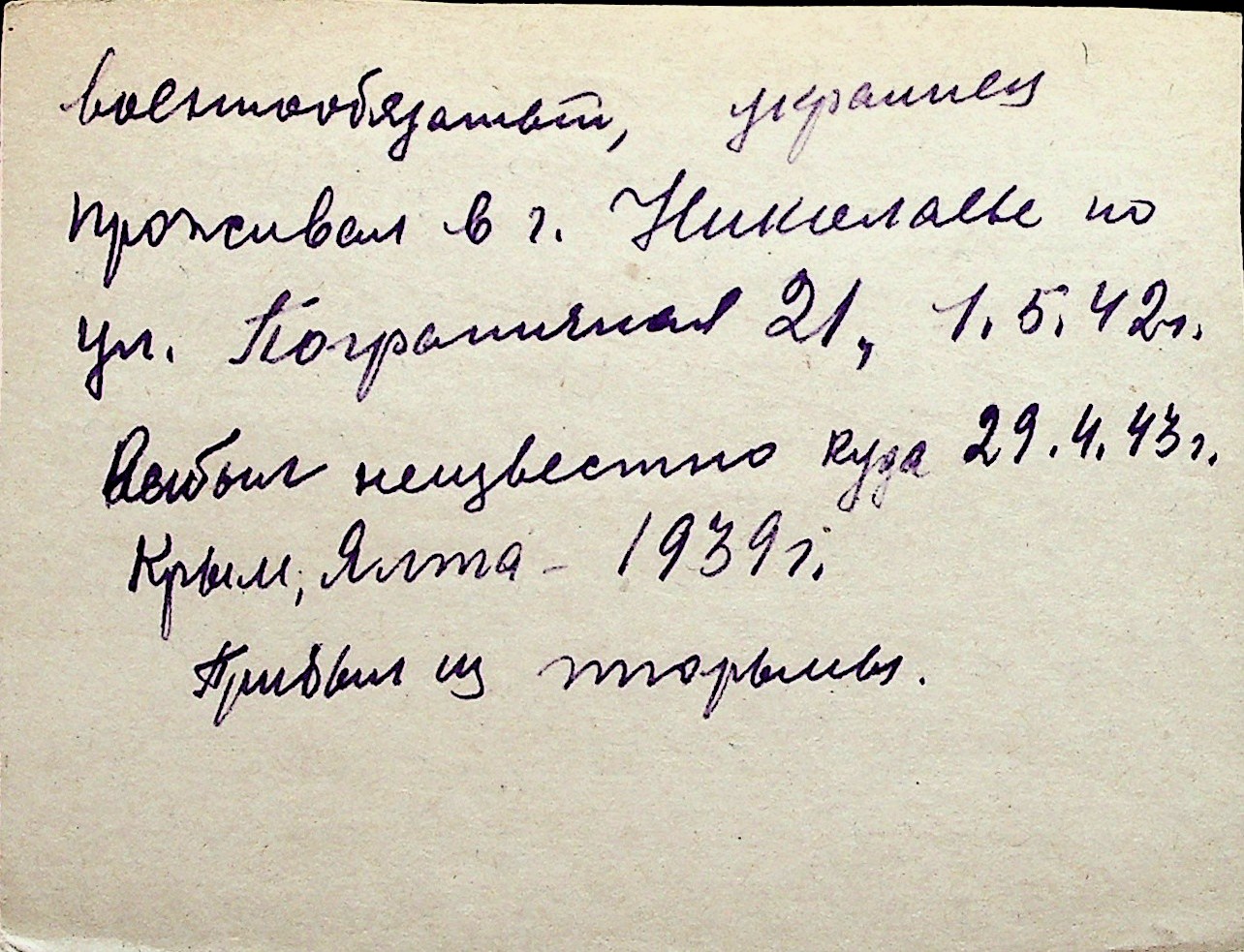 ◦ ◦ Перелік карток на осіб, які мешкали у м. Миколаїв у період окупації 1941–1944 років