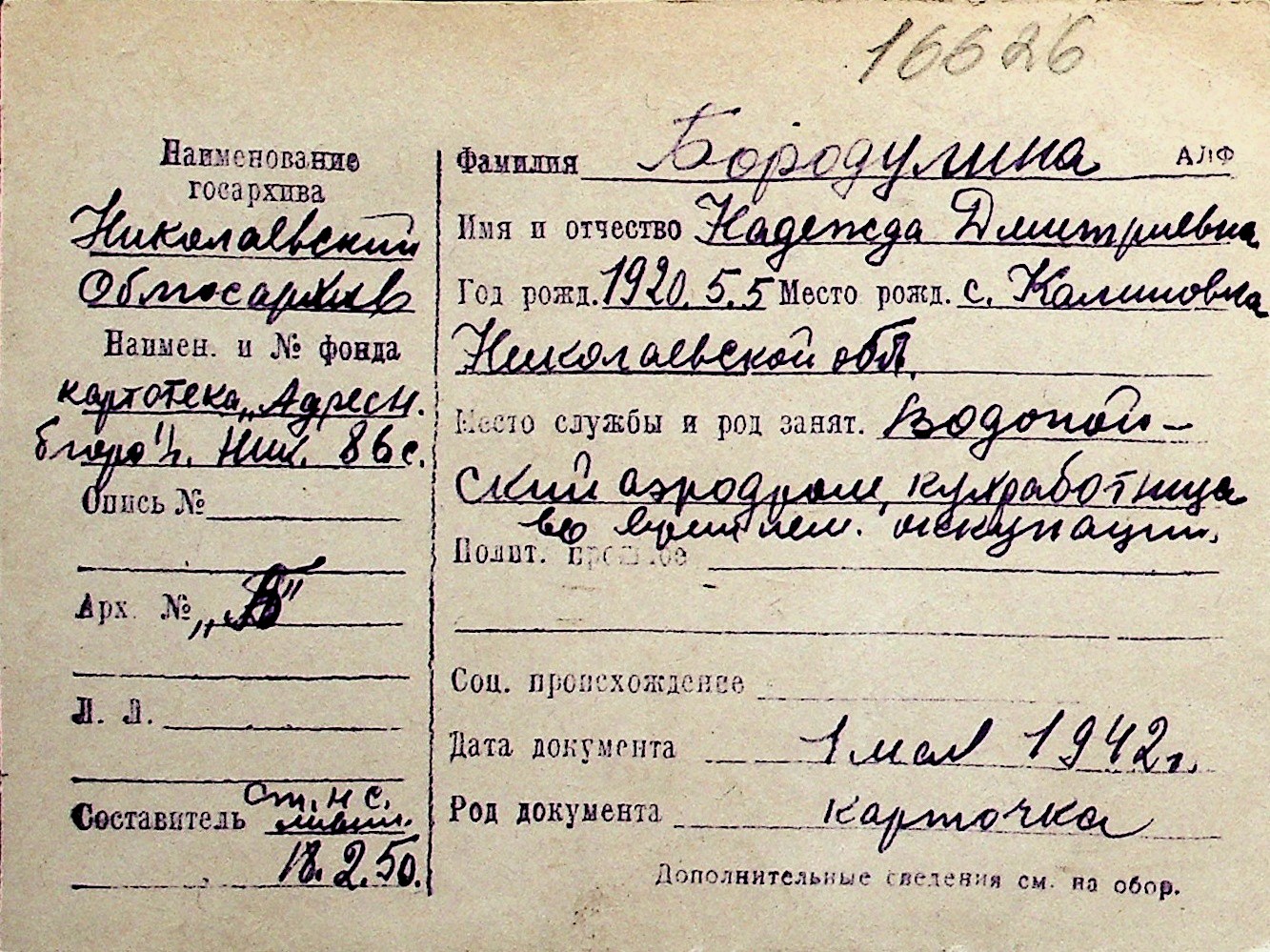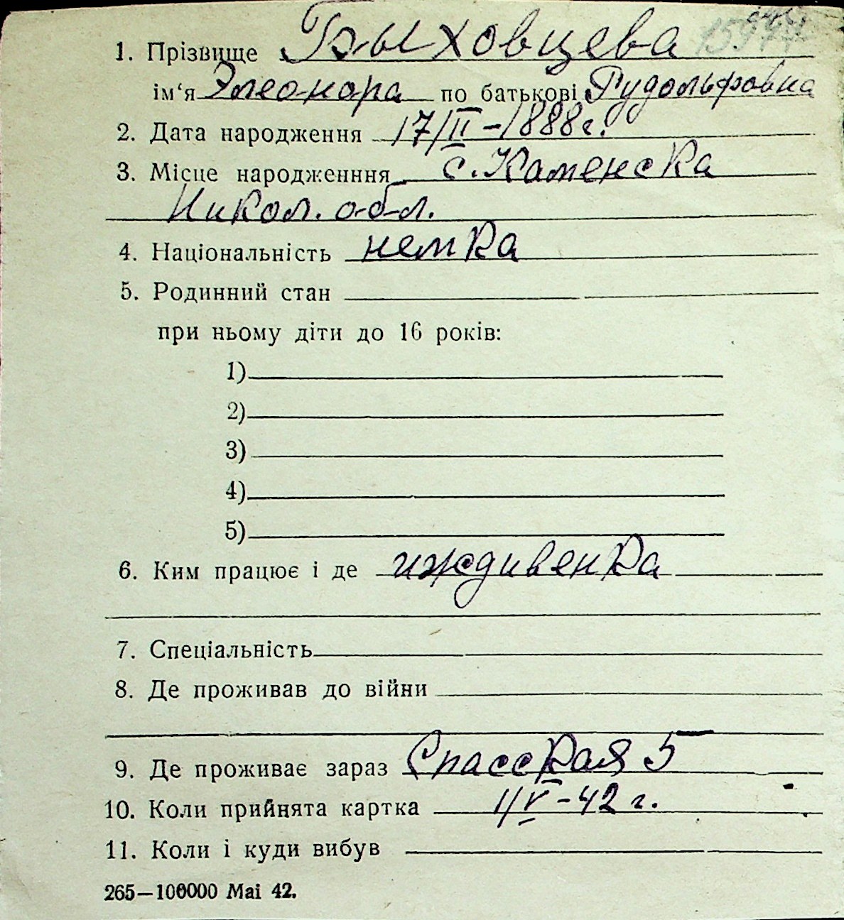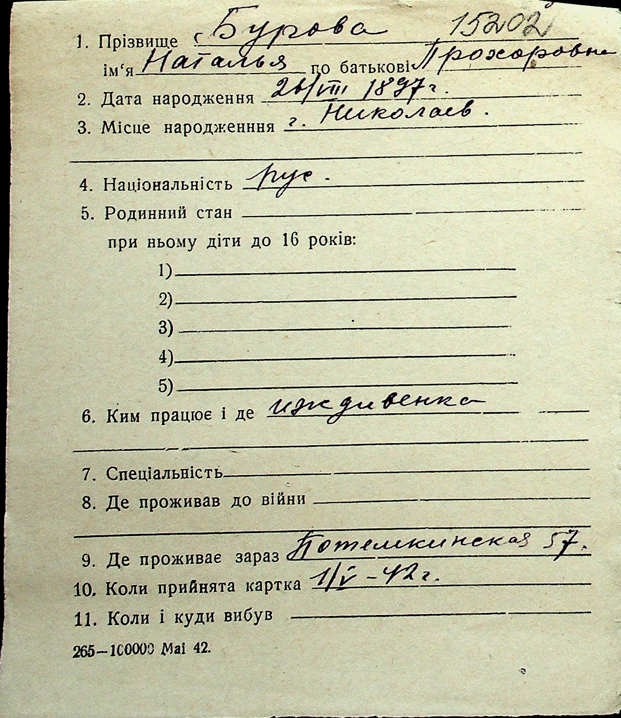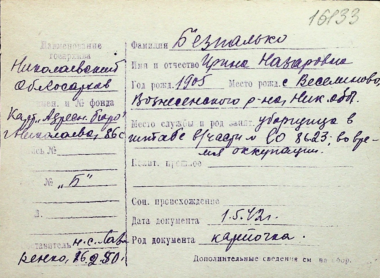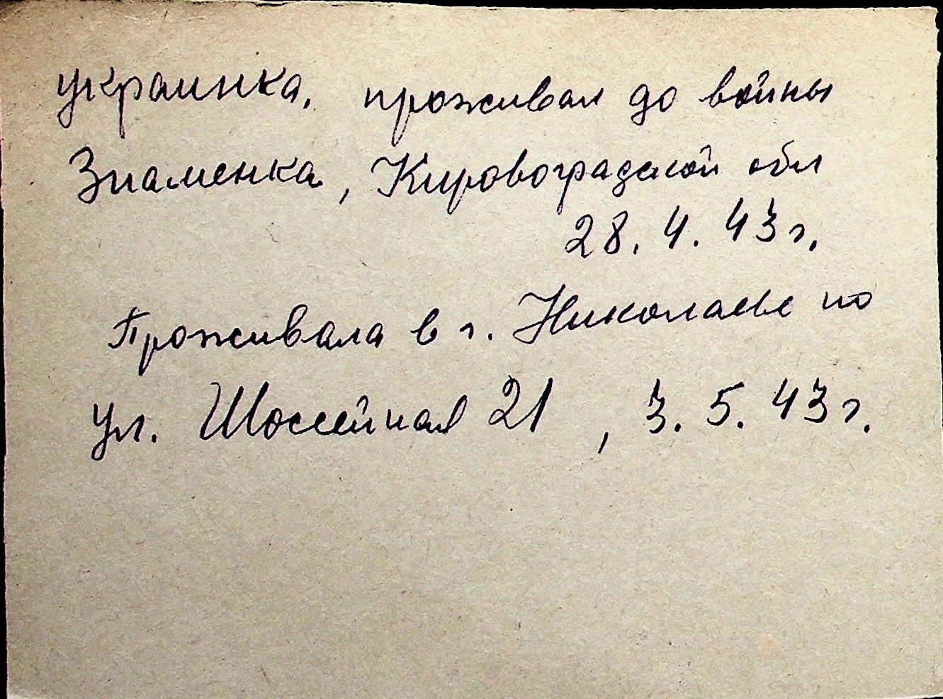 ◦ ◦ Перелік карток на осіб, які мешкали у м. Миколаїв у період окупації 1941–1944 років