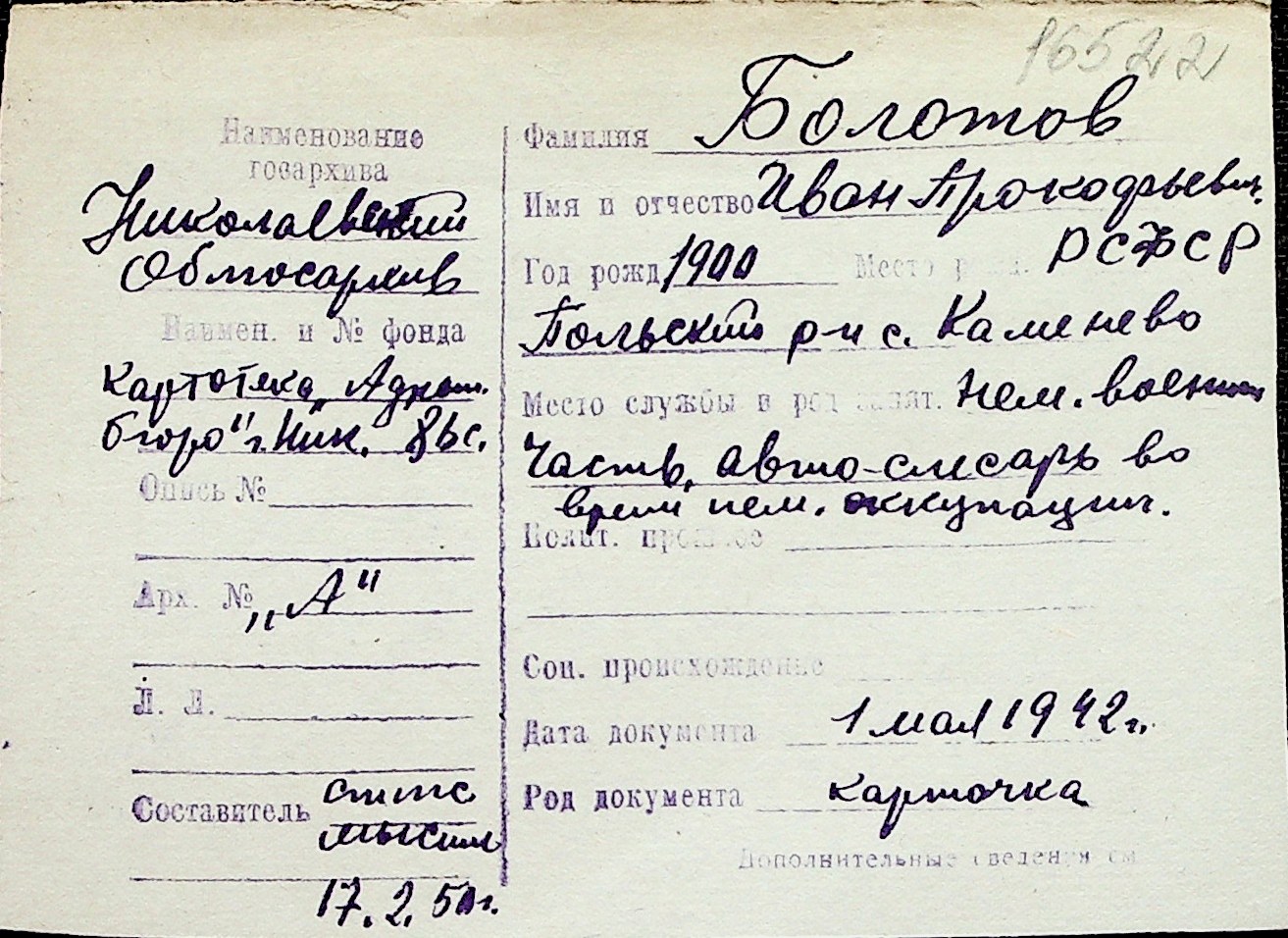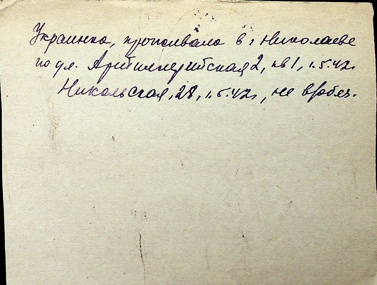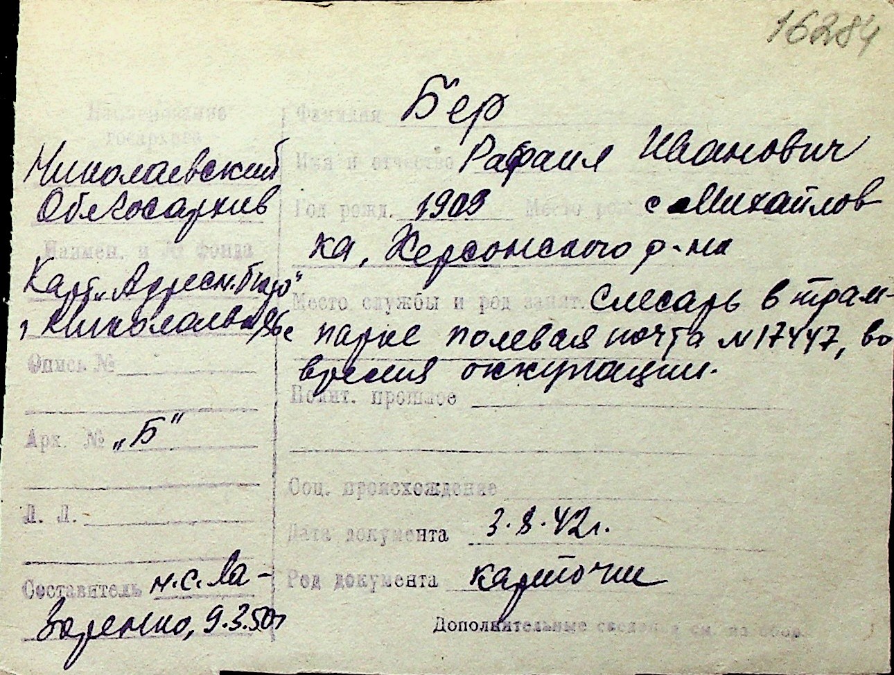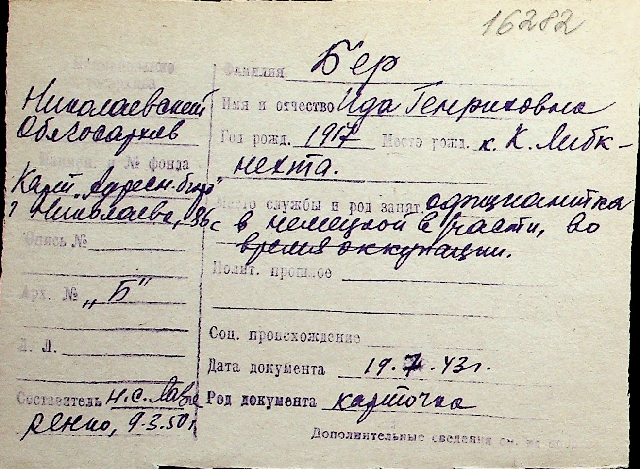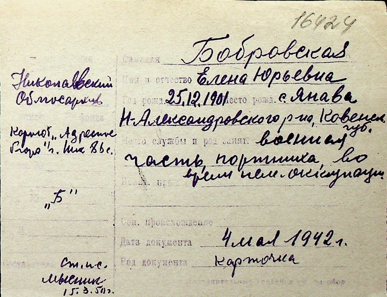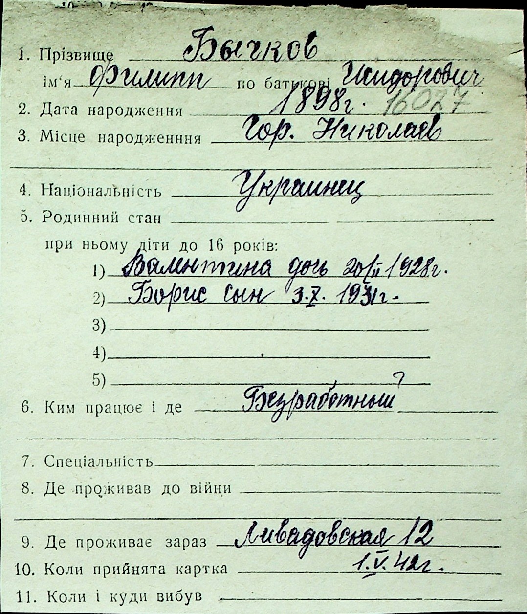 ◦ ◦ Перелік карток на осіб, які мешкали у м. Миколаїв у період окупації 1941–1944 років