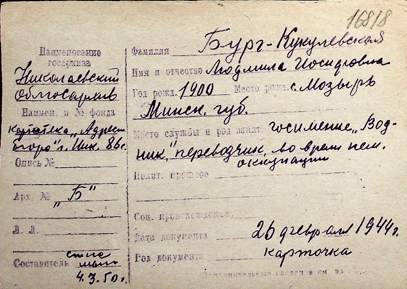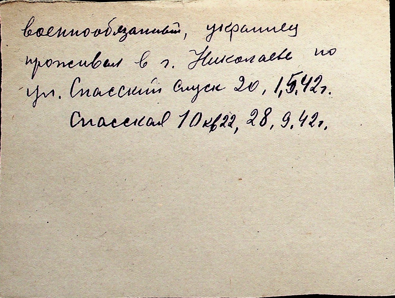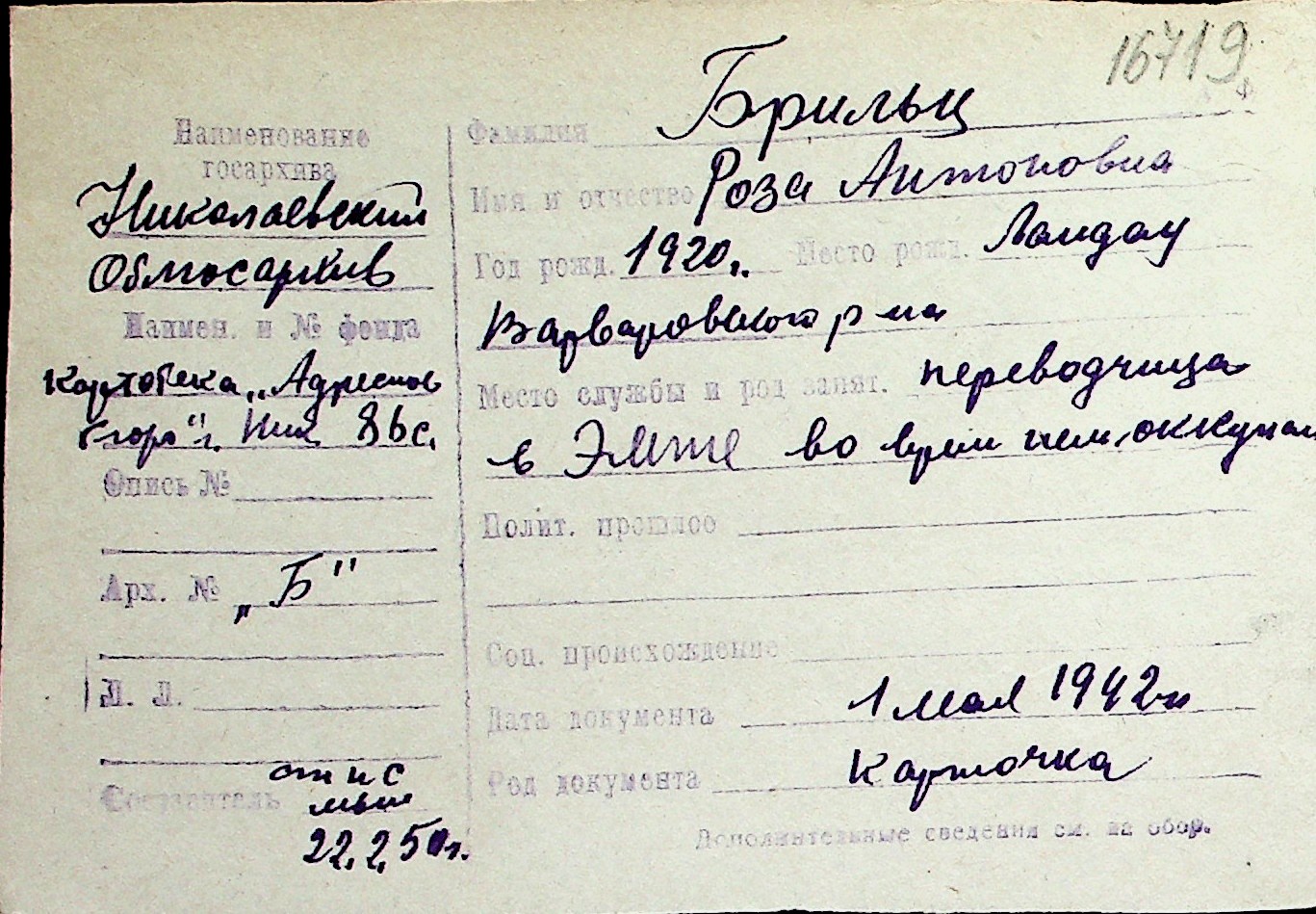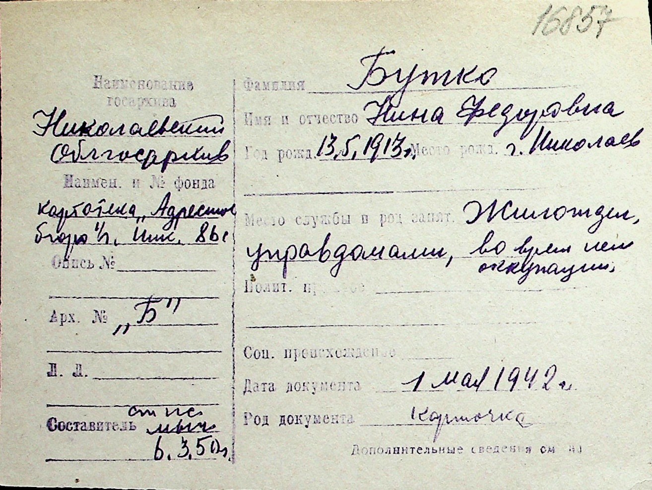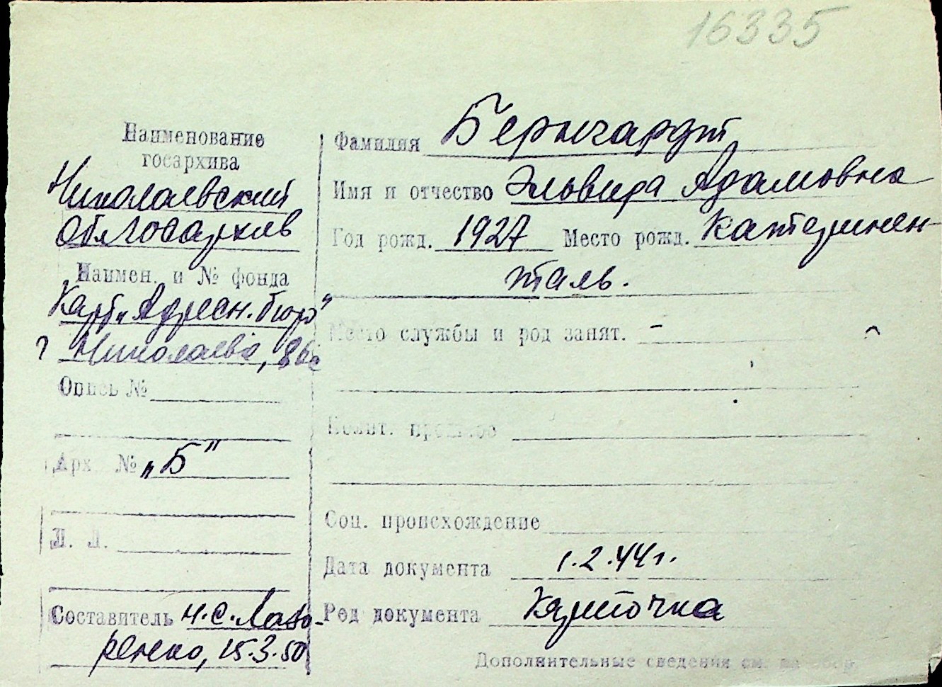 ◦ ◦ Перелік карток на осіб, які мешкали у м. Миколаїв у період окупації 1941–1944 років