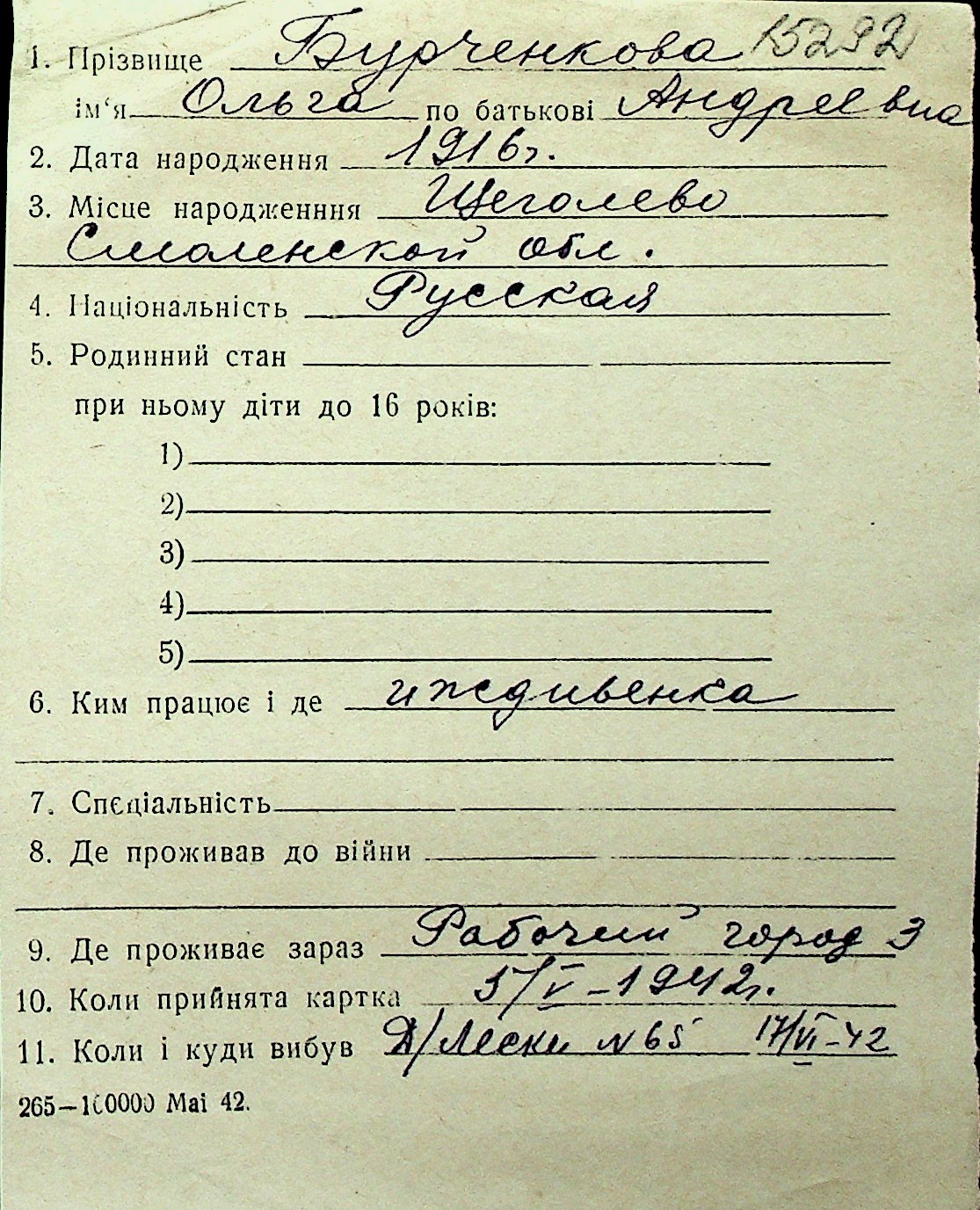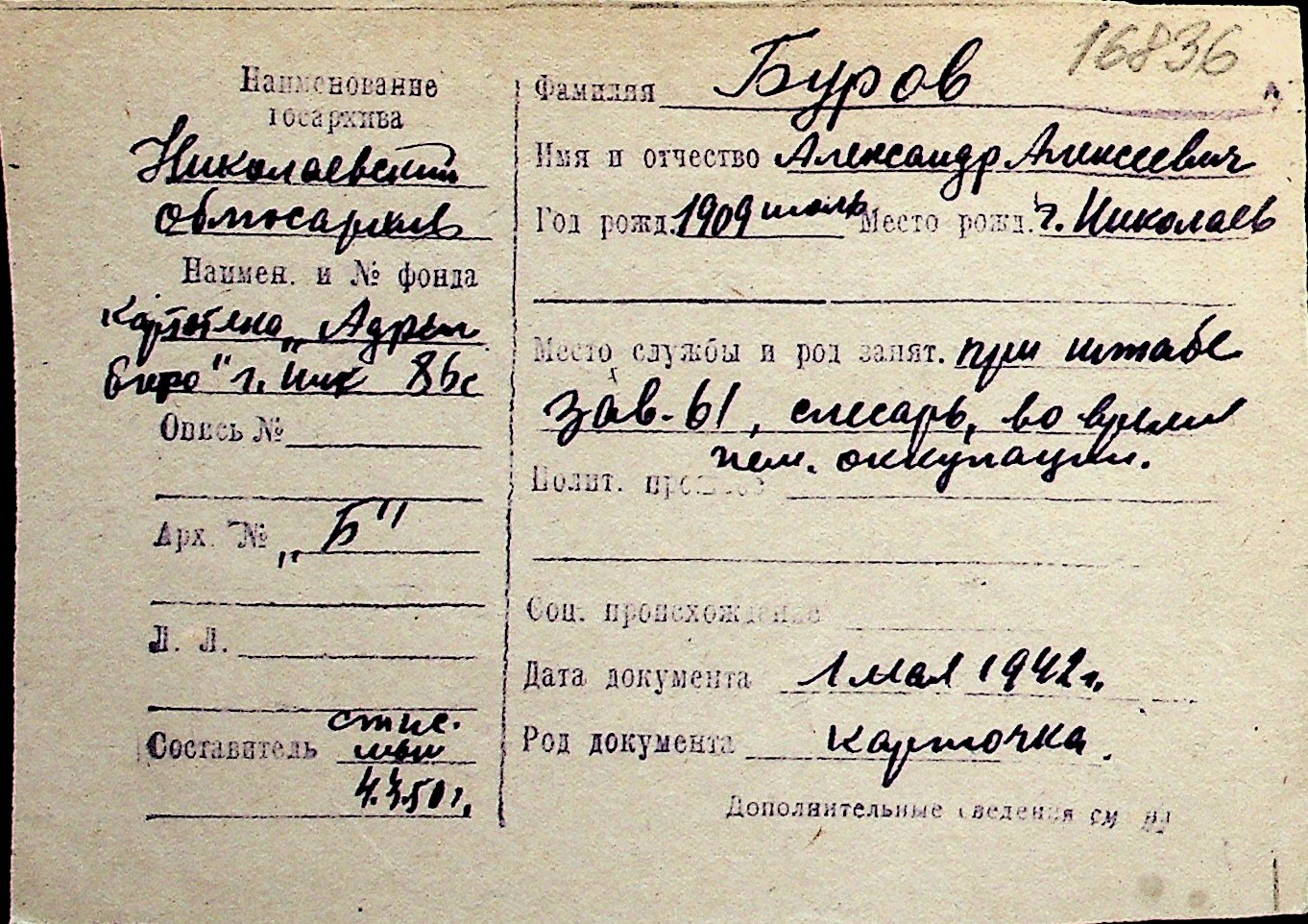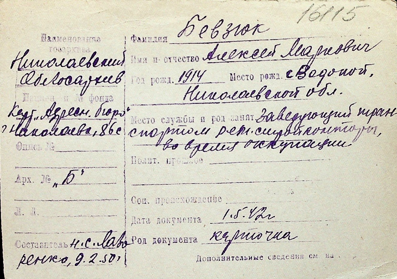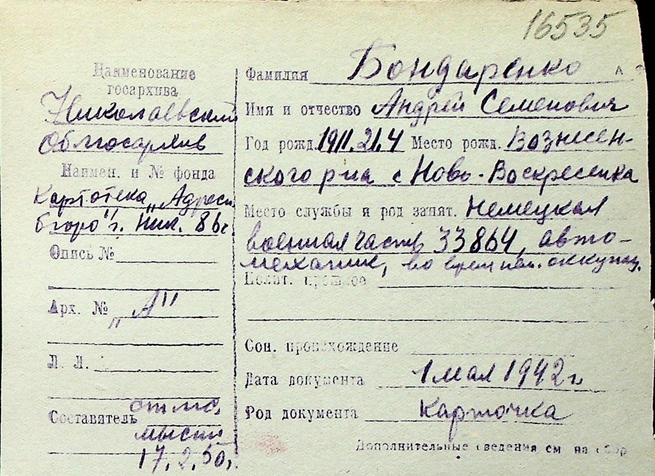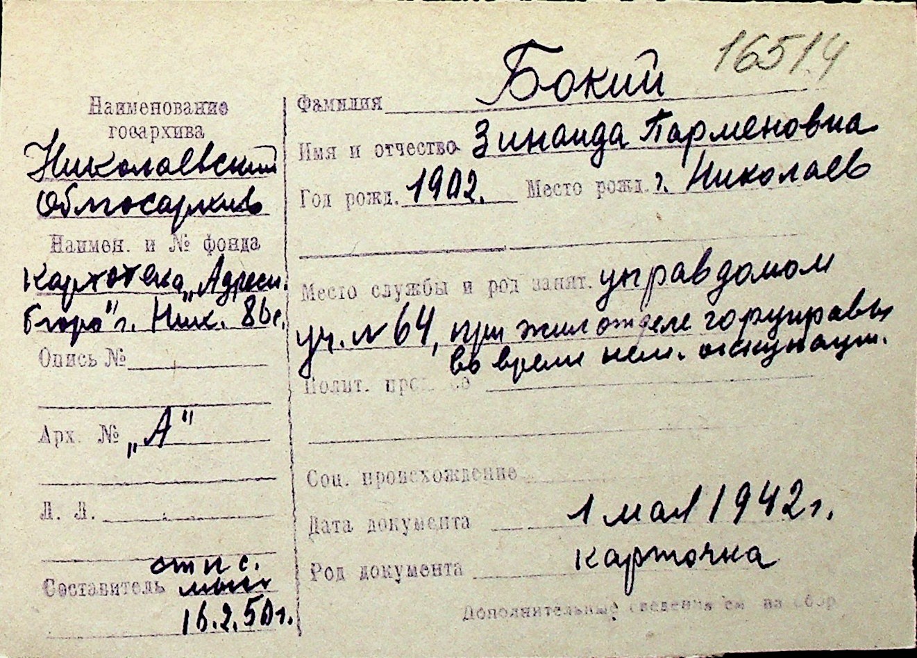 ◦ ◦ Перелік карток на осіб, які мешкали у м. Миколаїв у період окупації 1941–1944 років