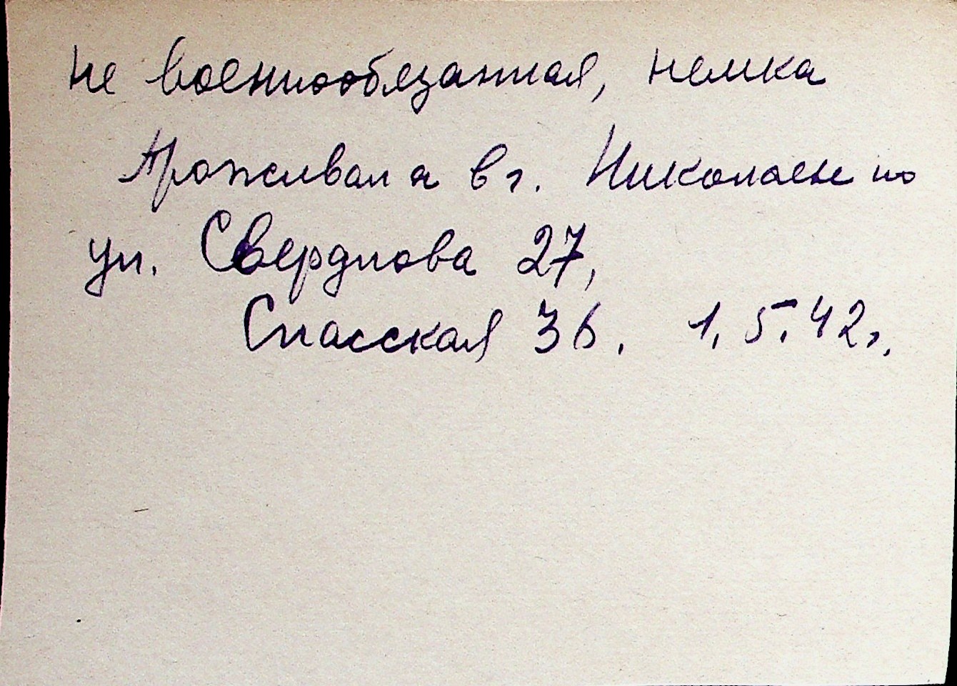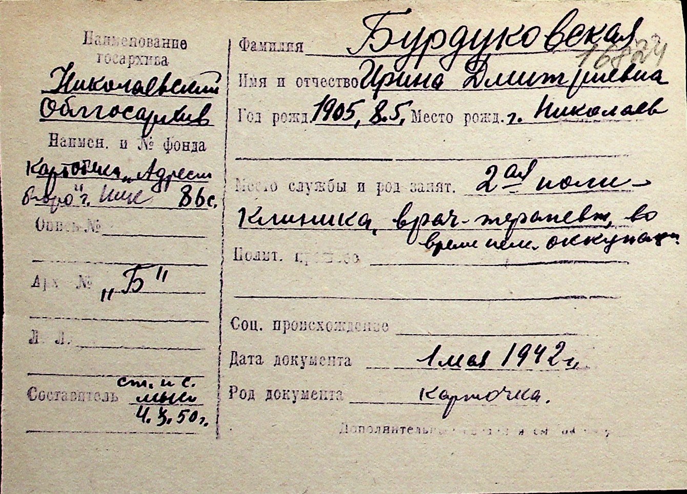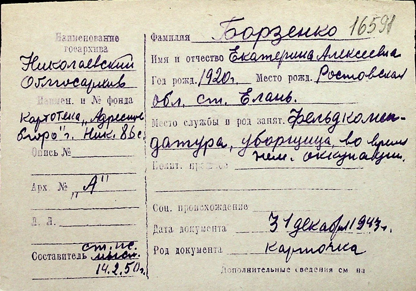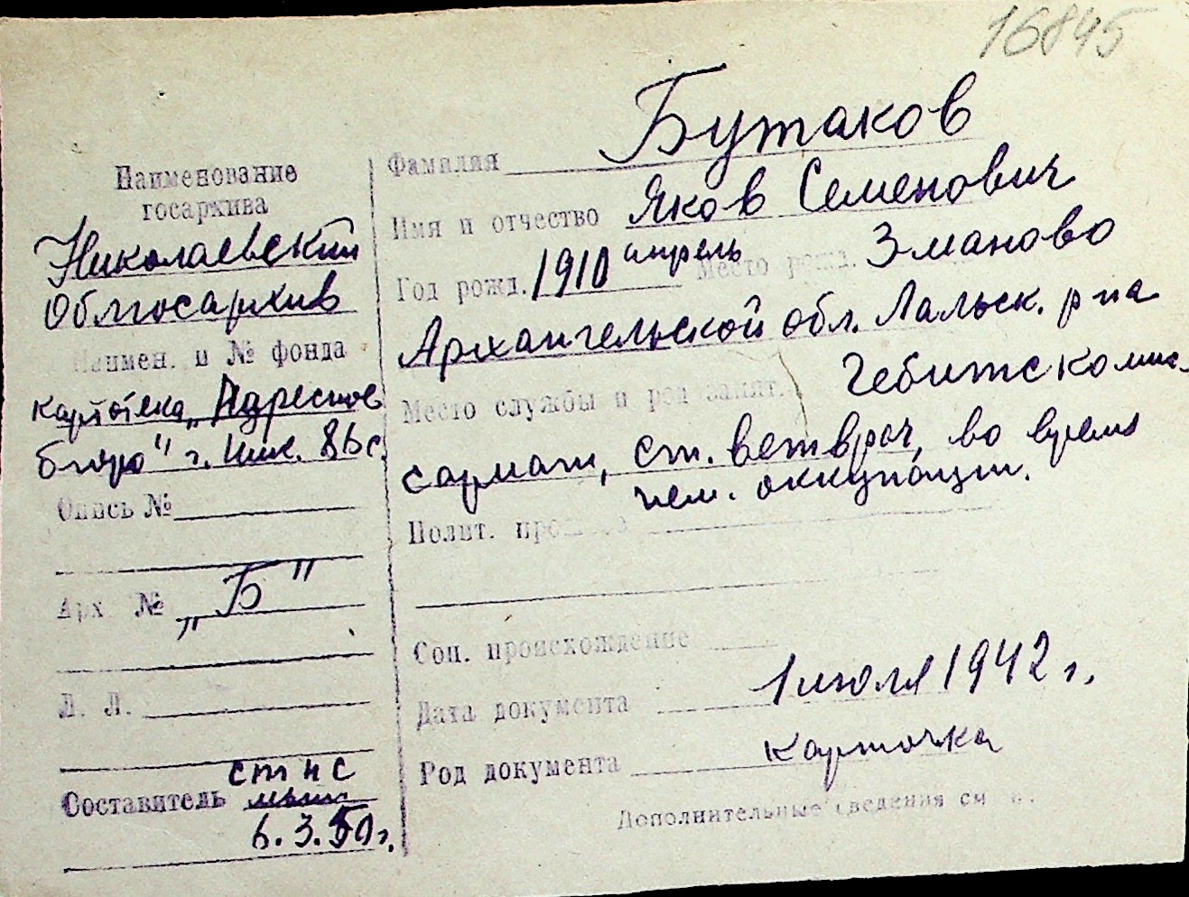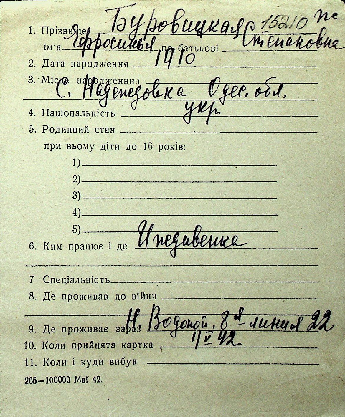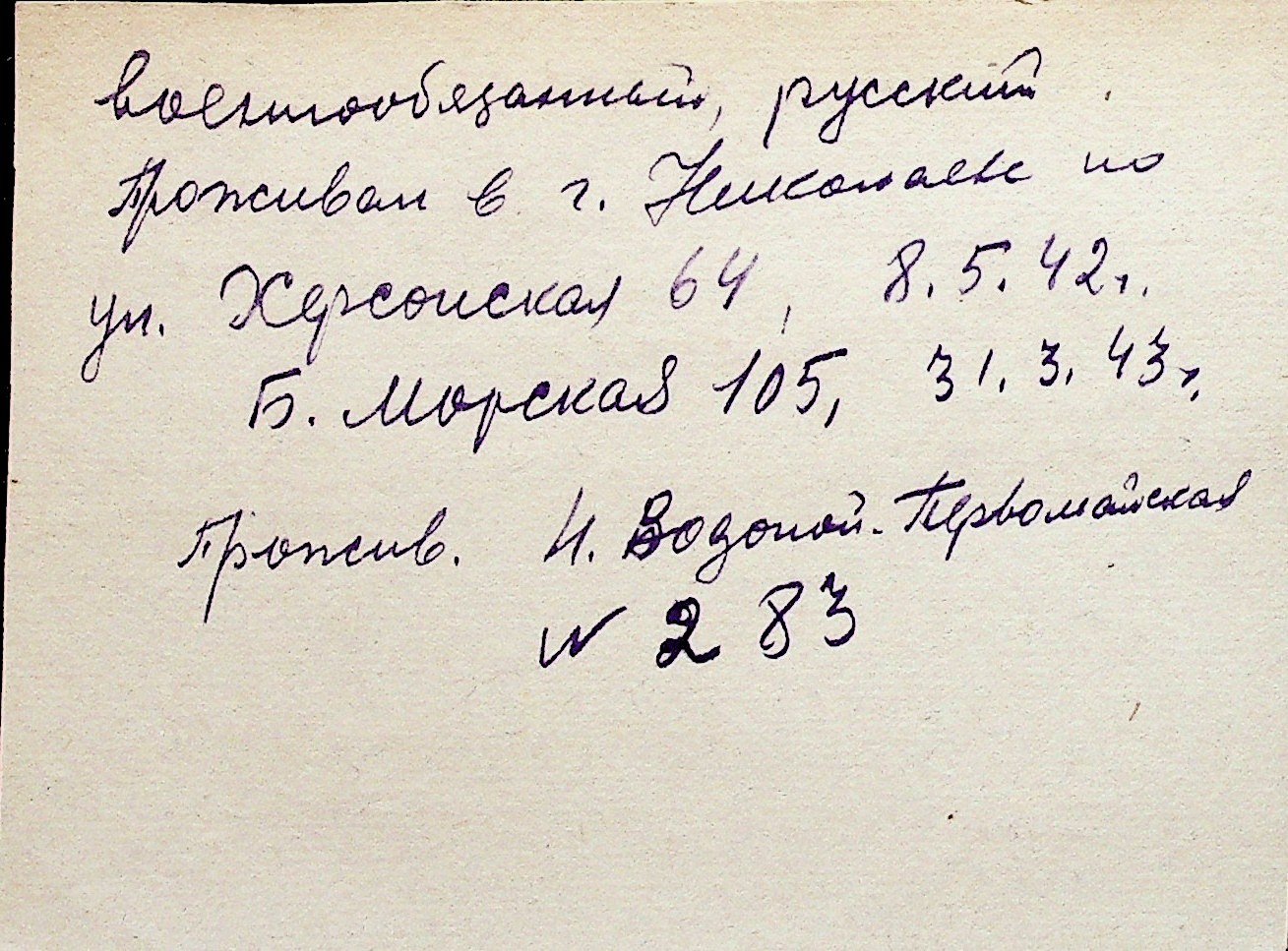 ◦ ◦ Перелік карток на осіб, які мешкали у м. Миколаїв у період окупації 1941–1944 років