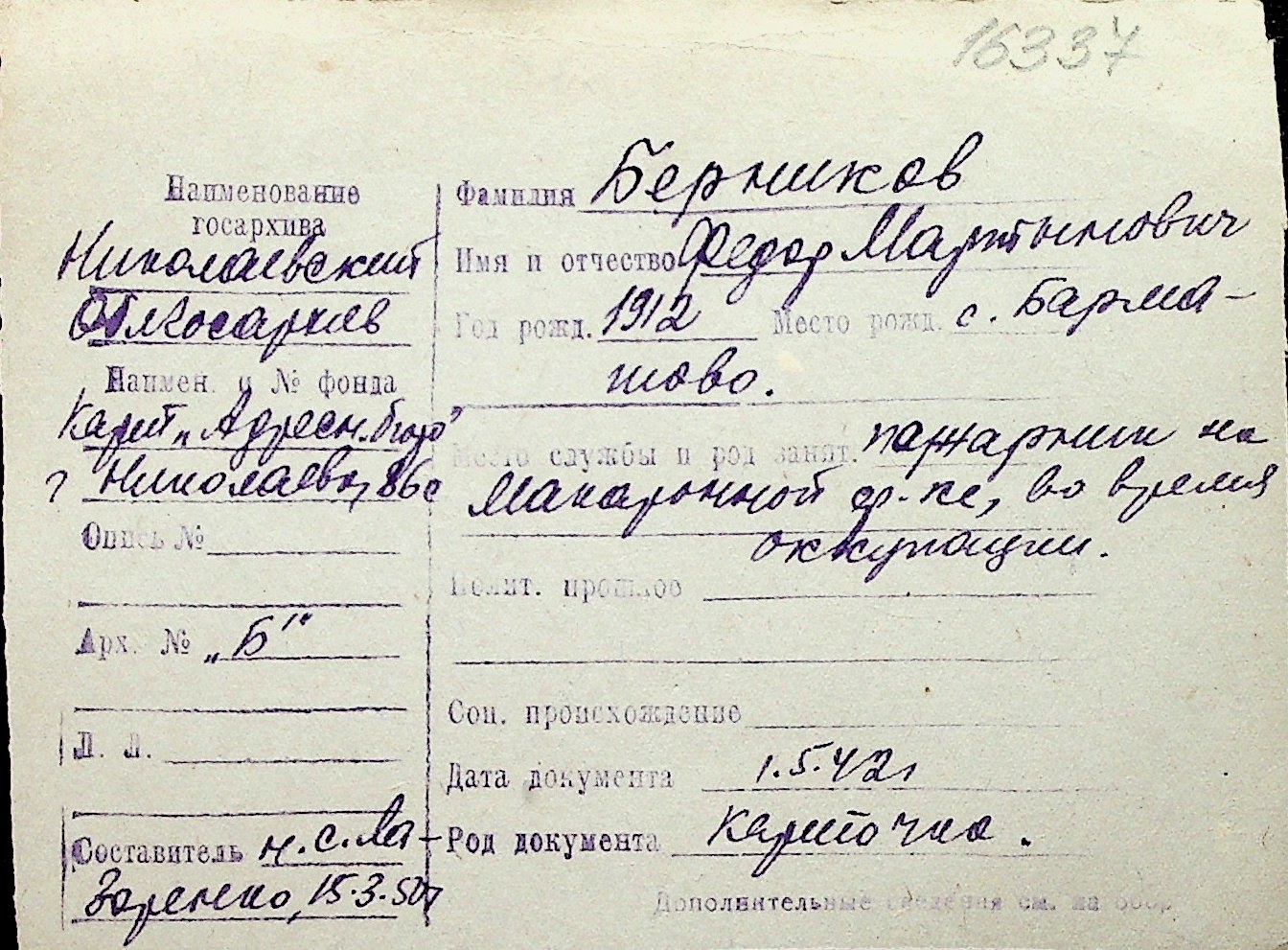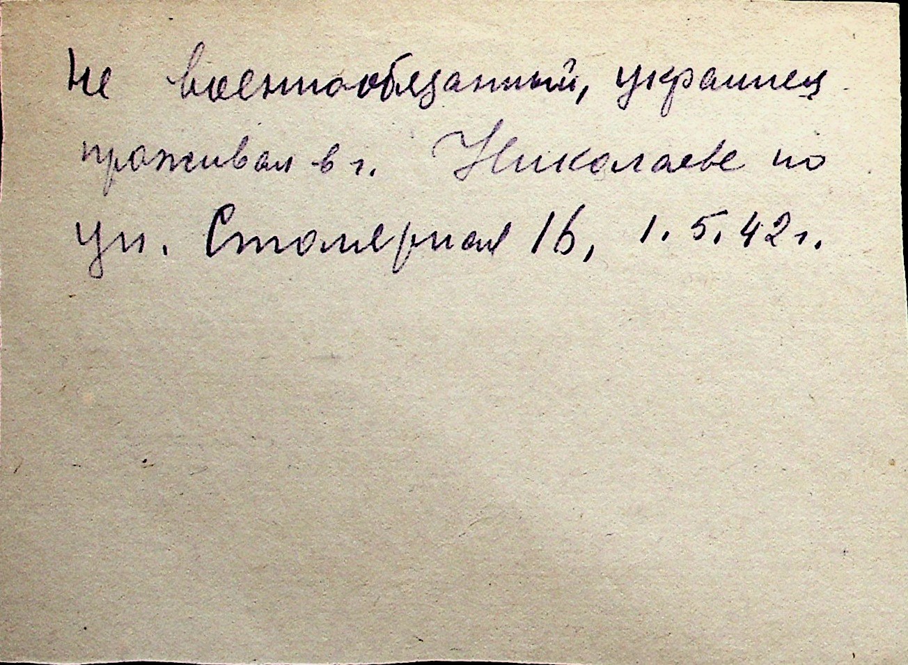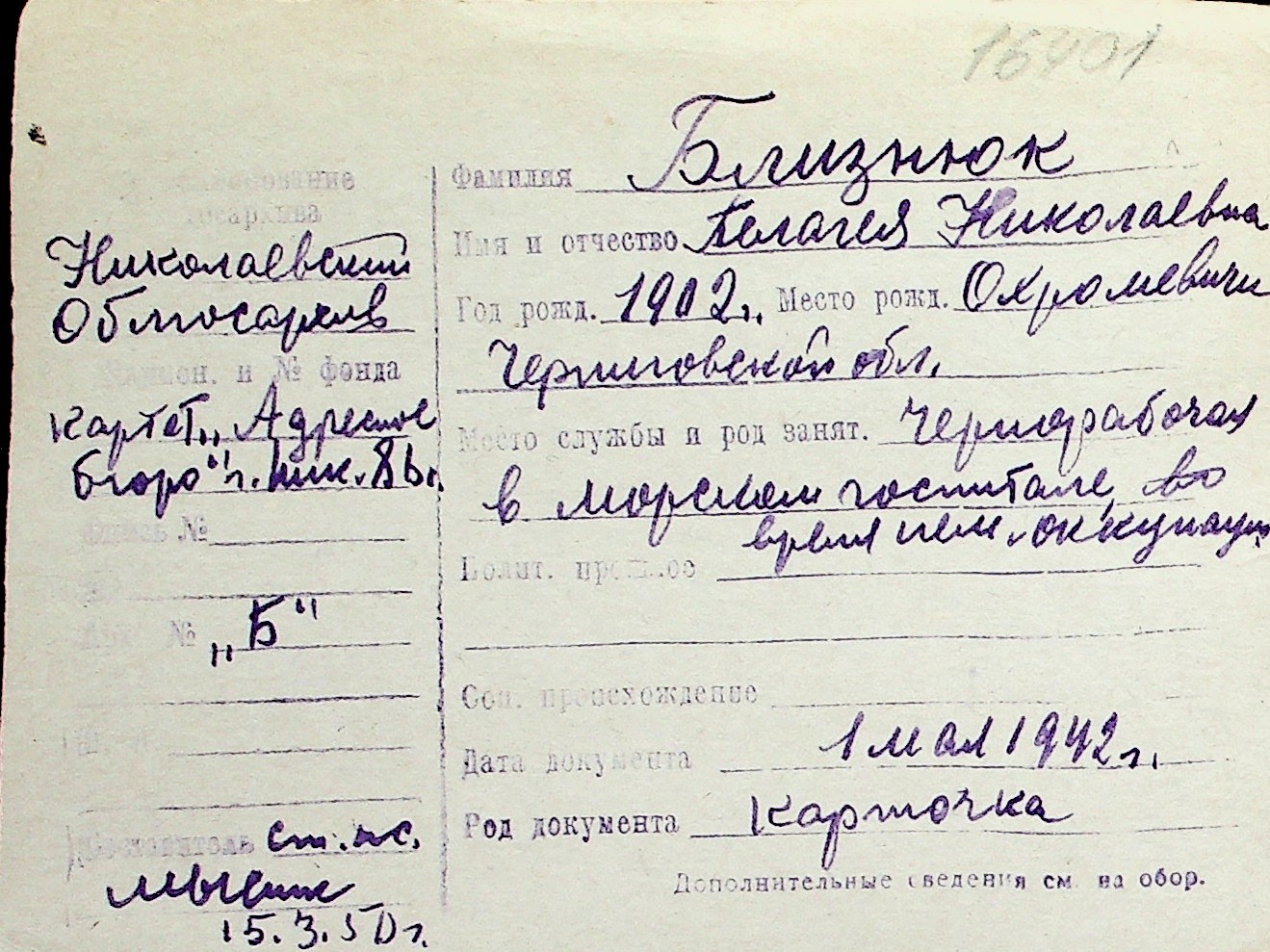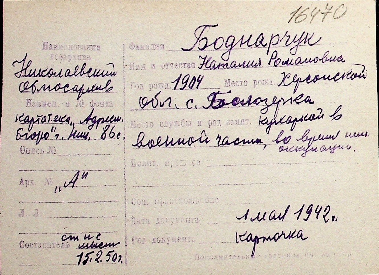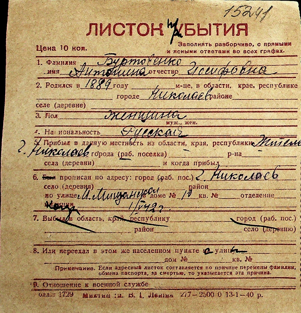 ◦ ◦ Перелік карток на осіб, які мешкали у м. Миколаїв у період окупації 1941–1944 років