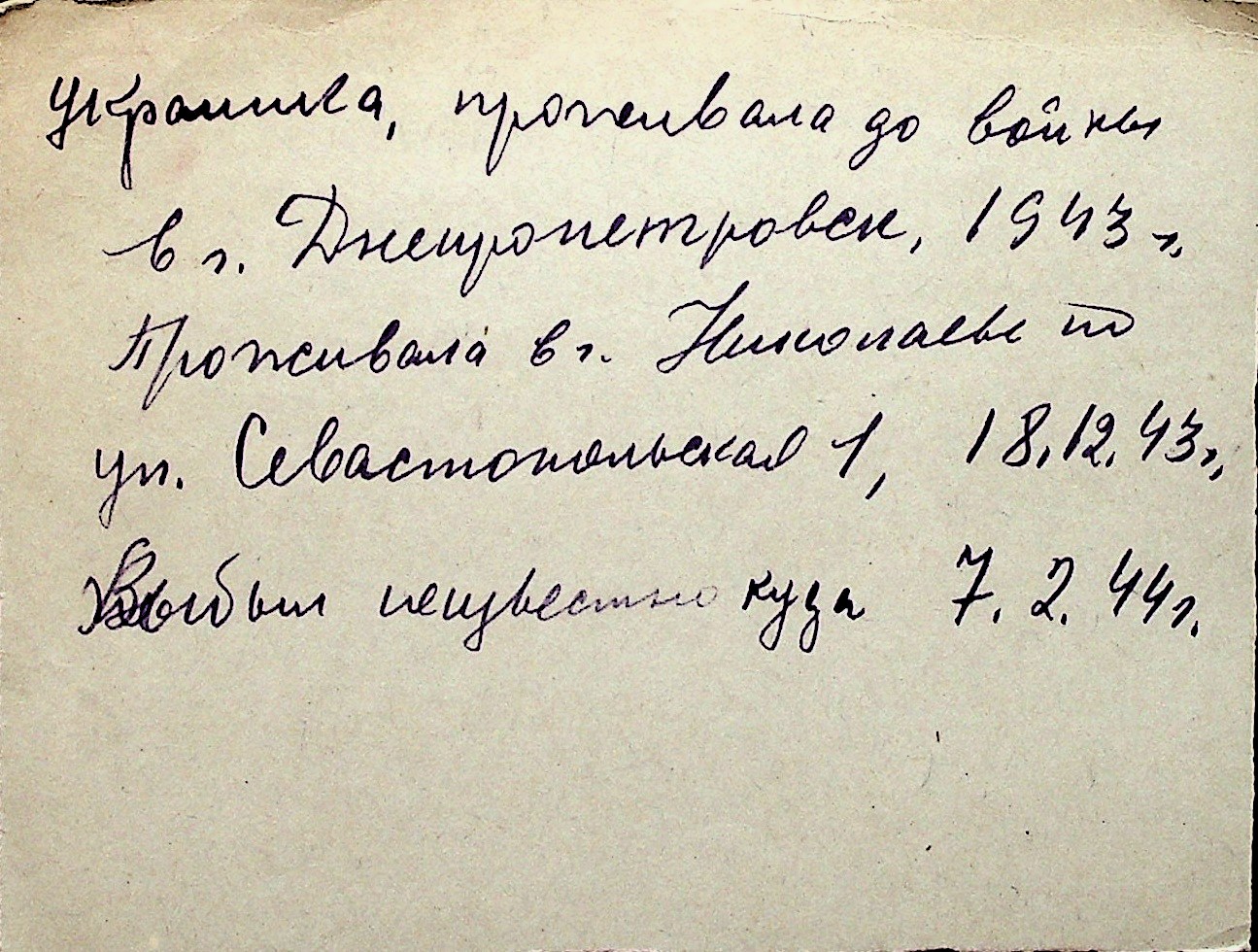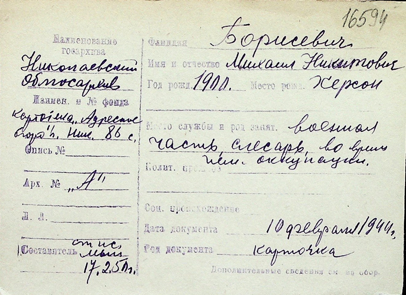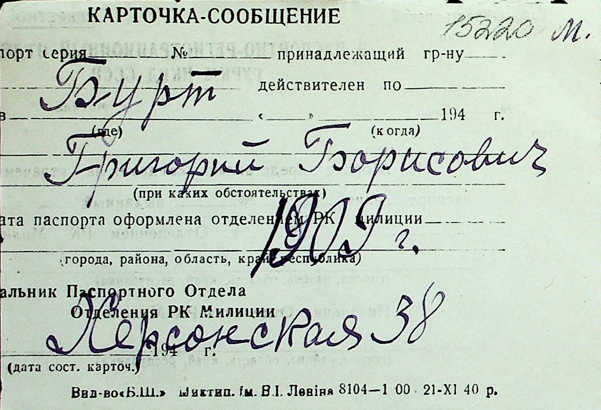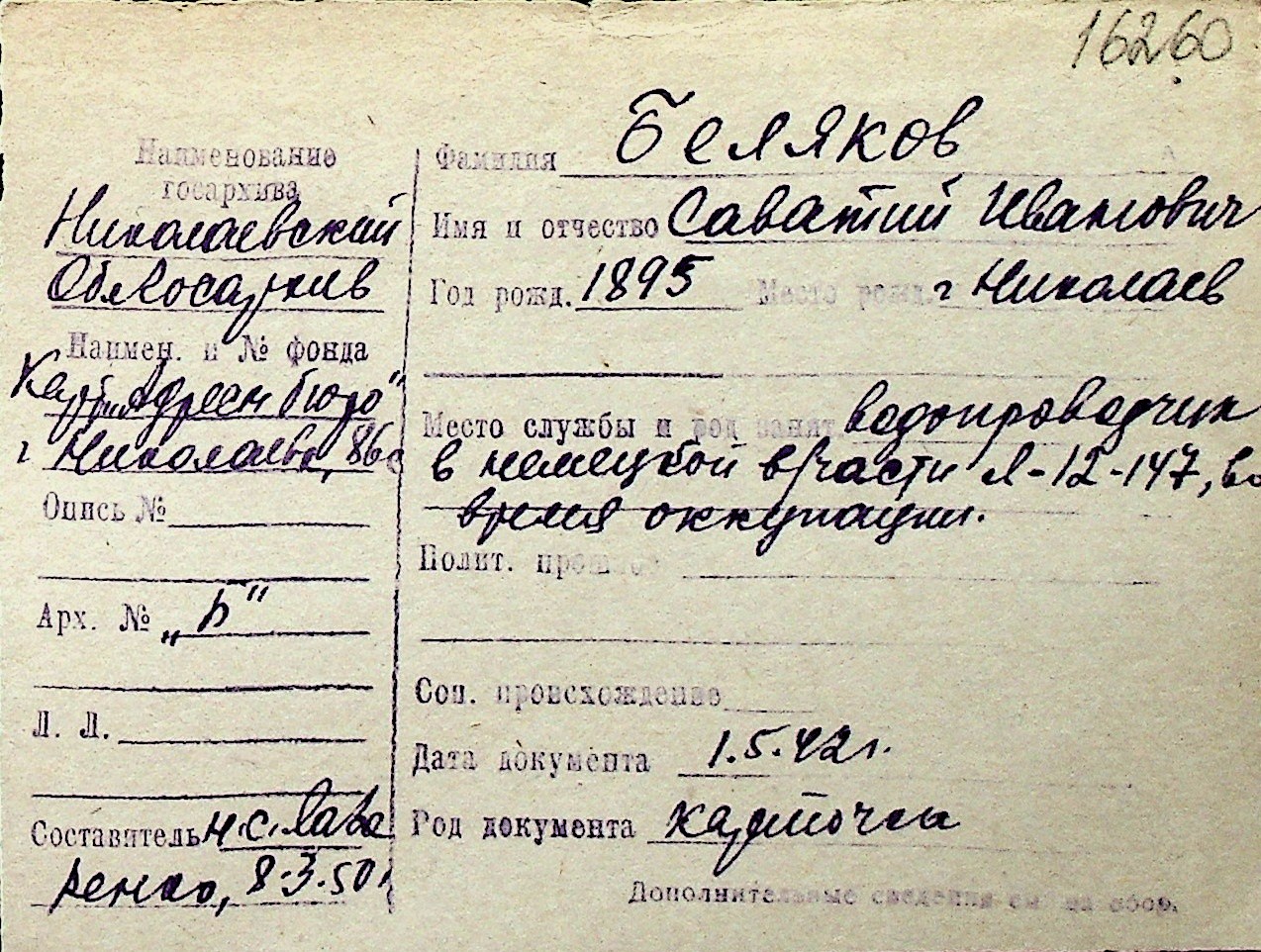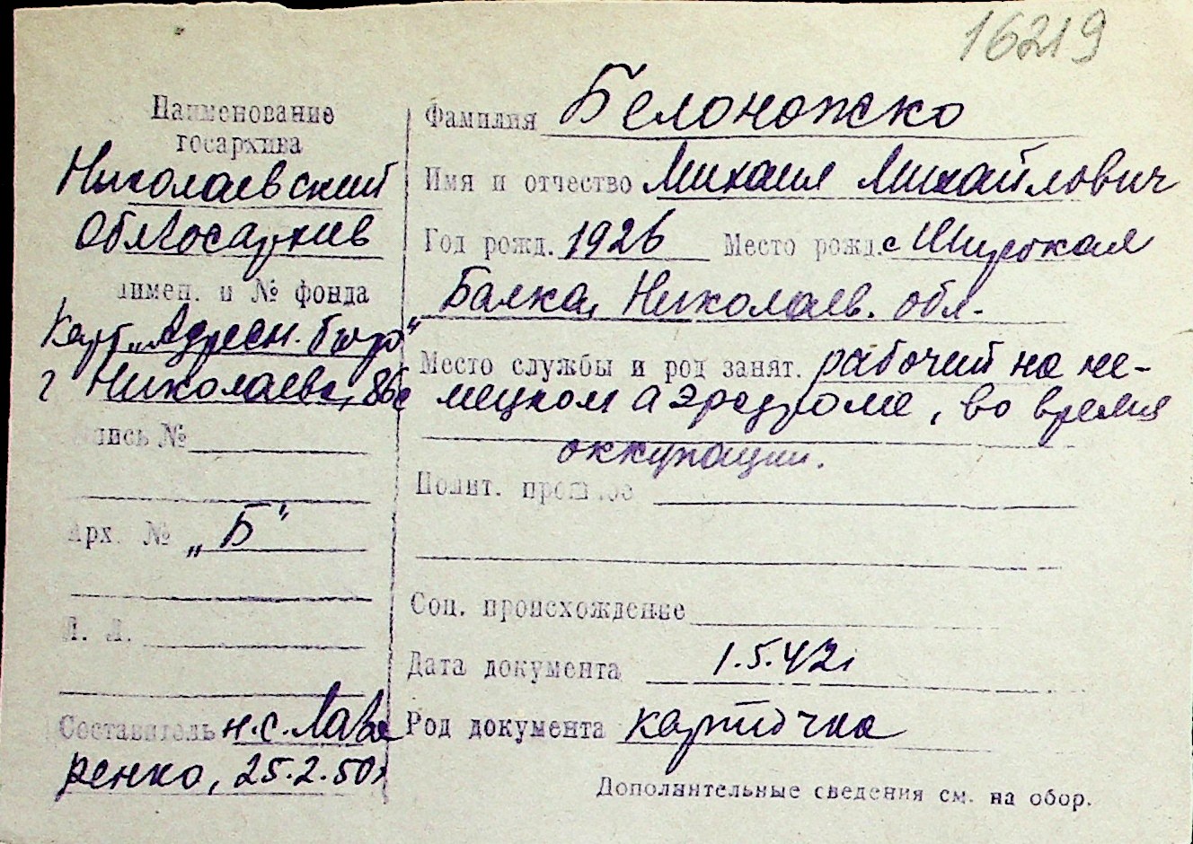 ◦ ◦ Перелік карток на осіб, які мешкали у м. Миколаїв у період окупації 1941–1944 років