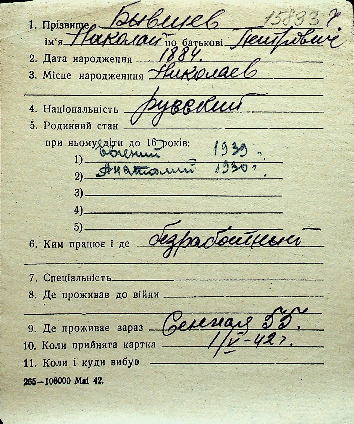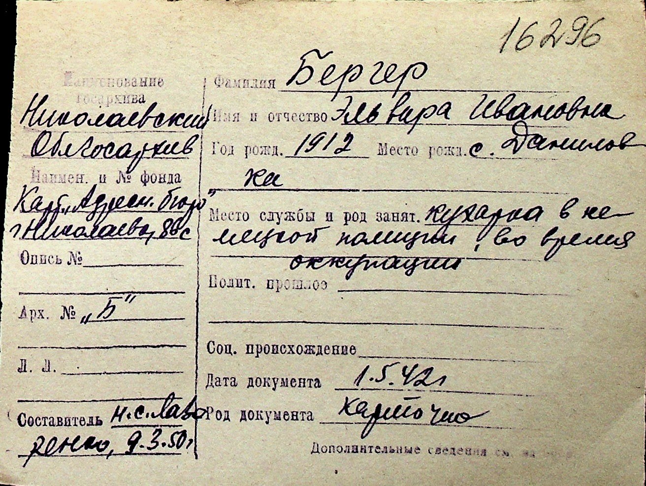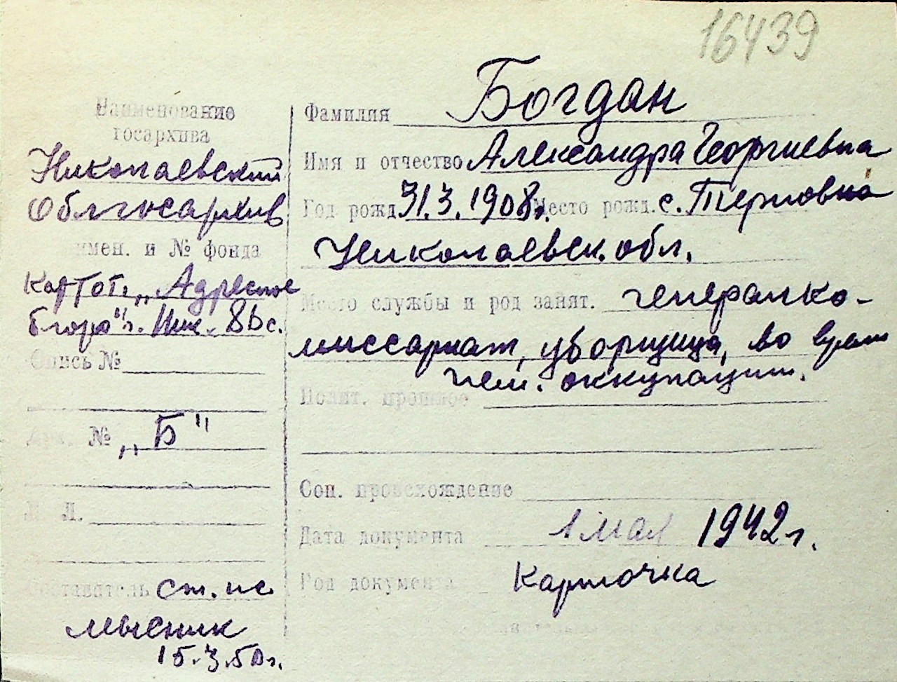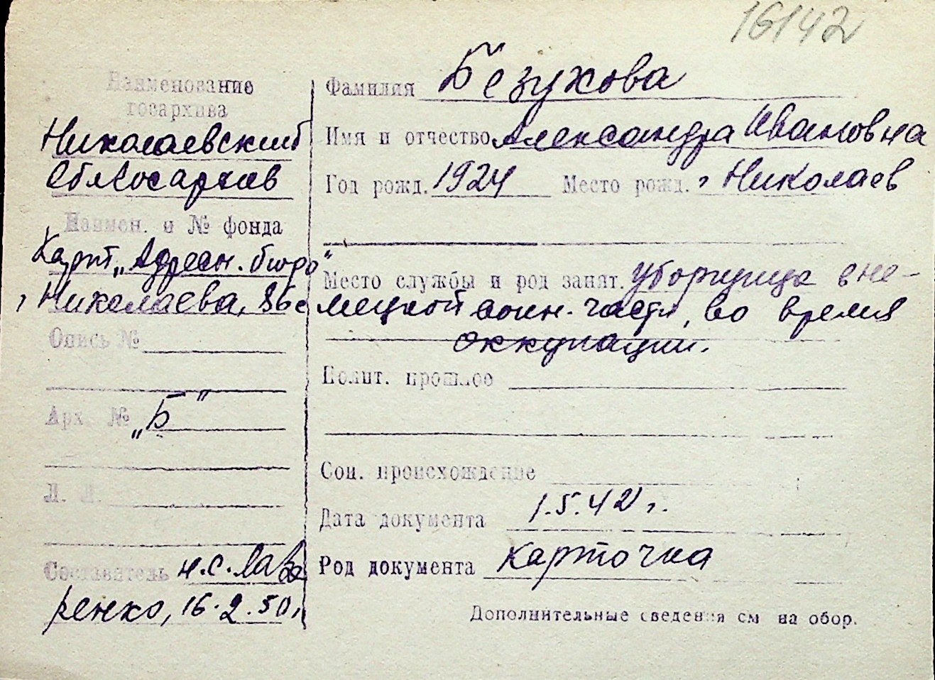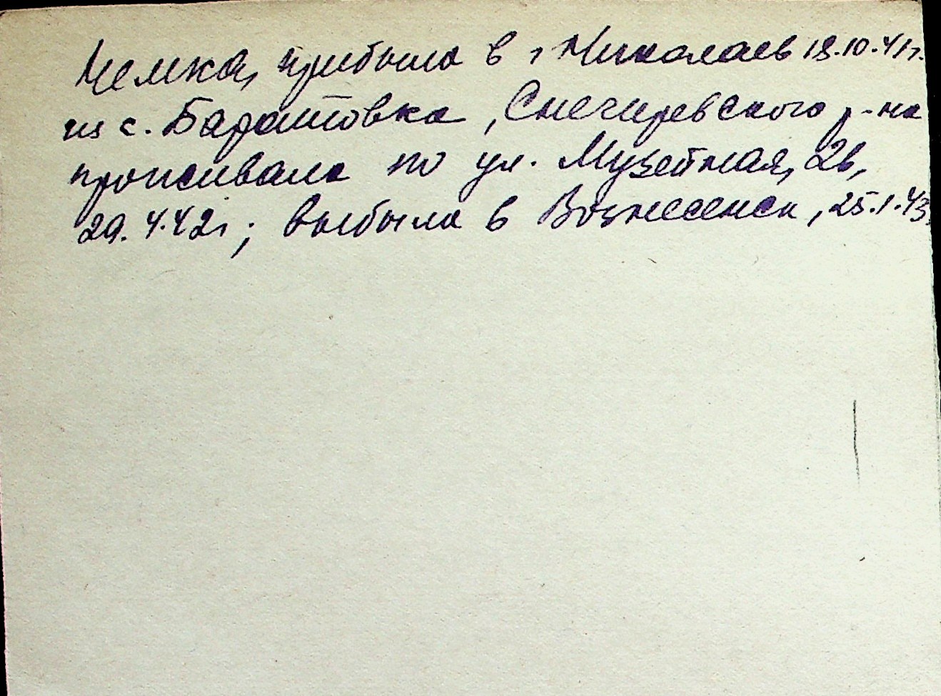 ◦ ◦ Перелік карток на осіб, які мешкали у м. Миколаїв у період окупації 1941–1944 років