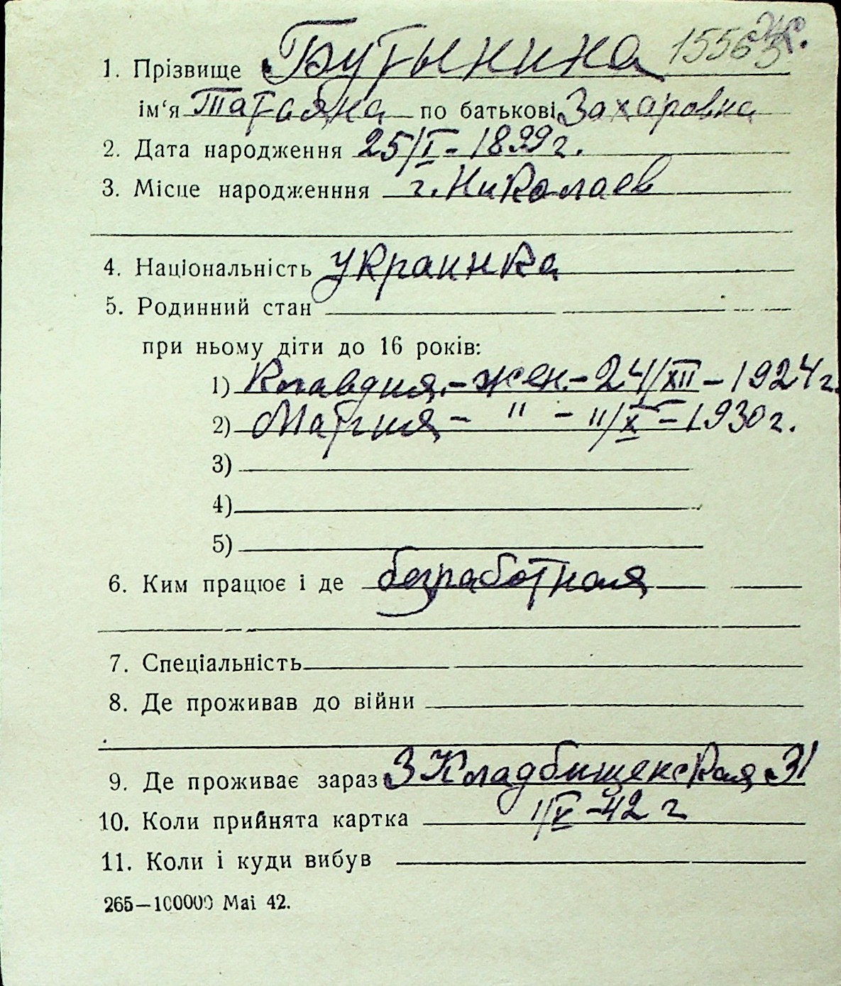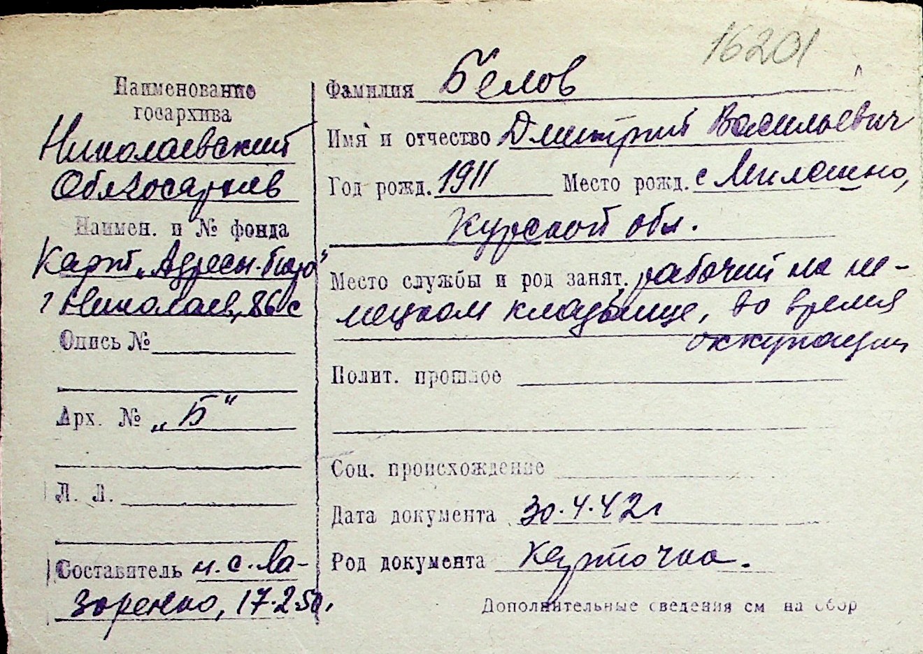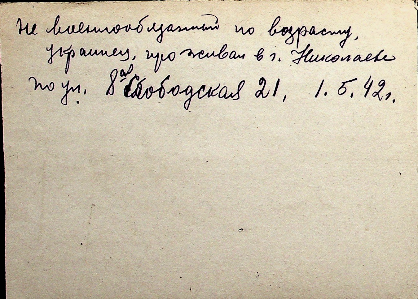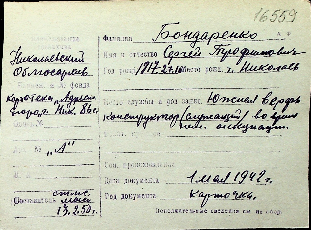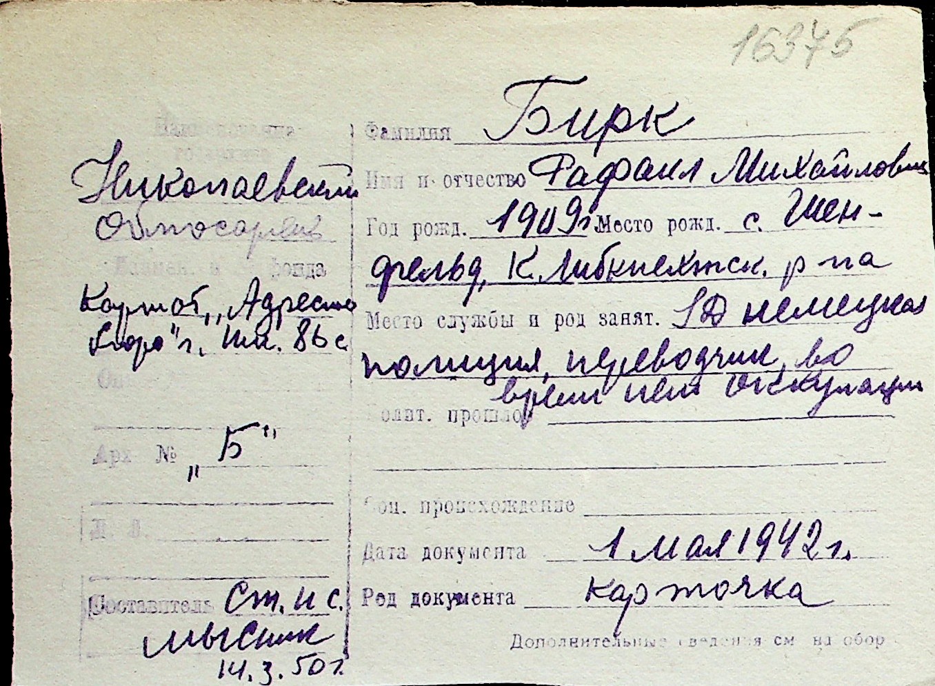 ◦ ◦ Перелік карток на осіб, які мешкали у м. Миколаїв у період окупації 1941–1944 років