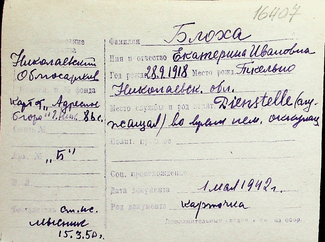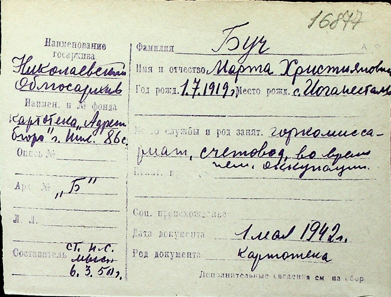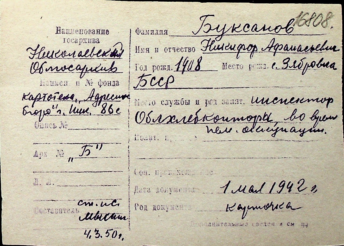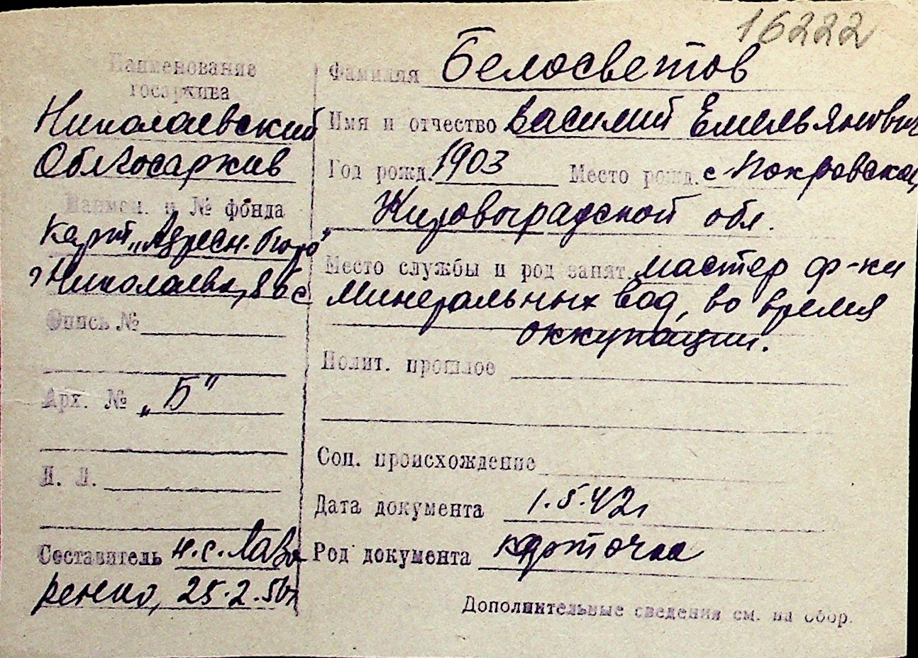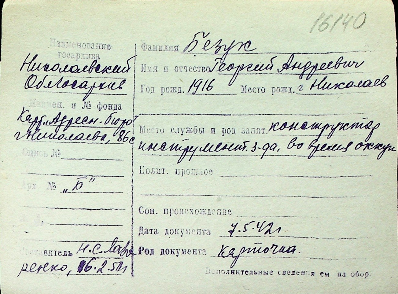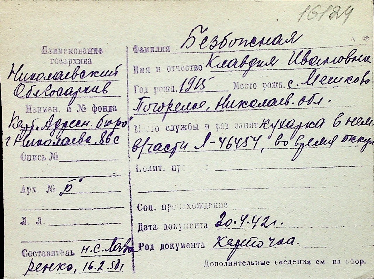 ◦ ◦ Перелік карток на осіб, які мешкали у м. Миколаїв у період окупації 1941–1944 років