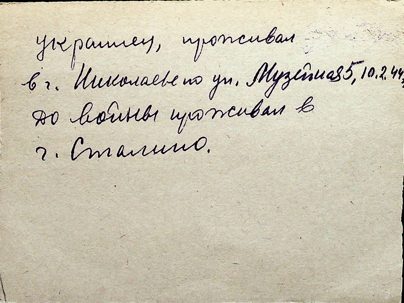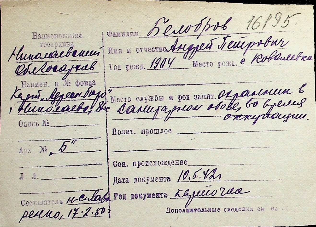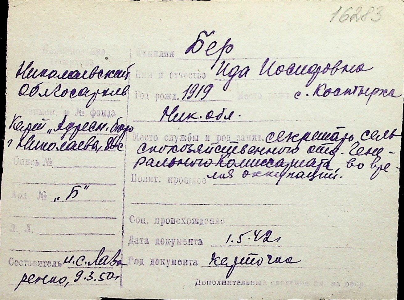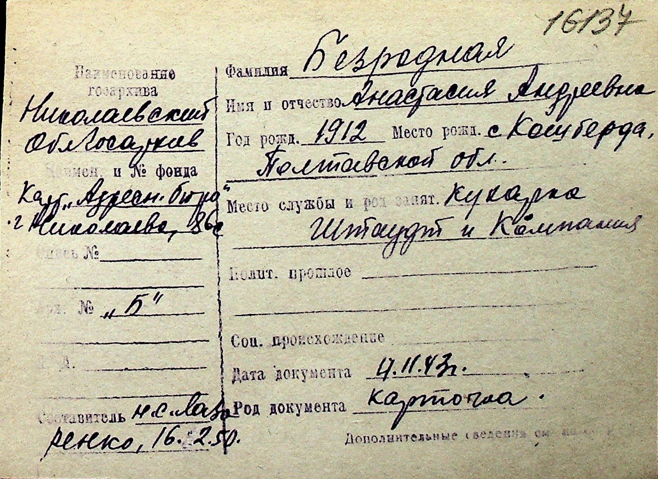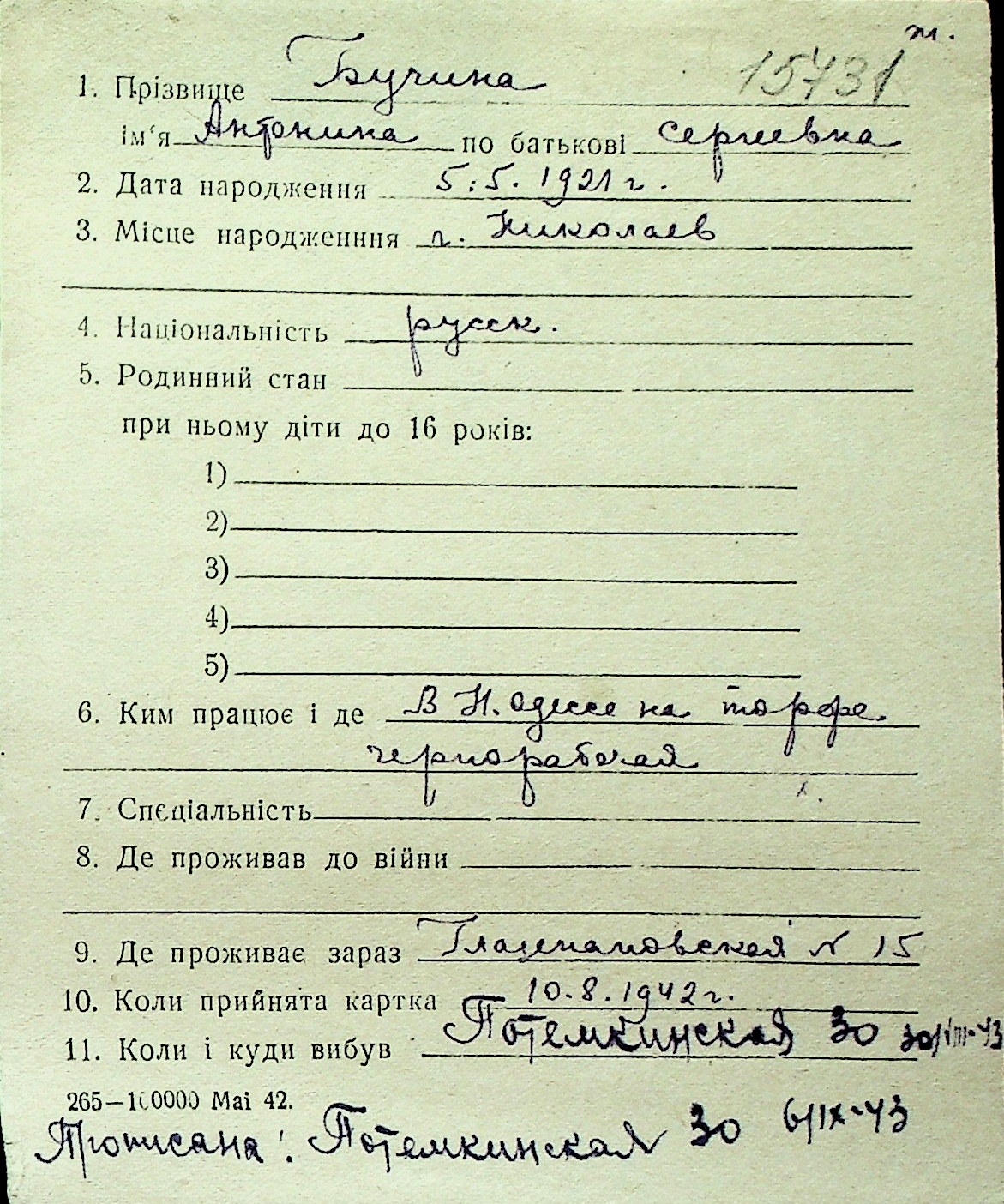 ◦ ◦ Перелік карток на осіб, які мешкали у м. Миколаїв у період окупації 1941–1944 років