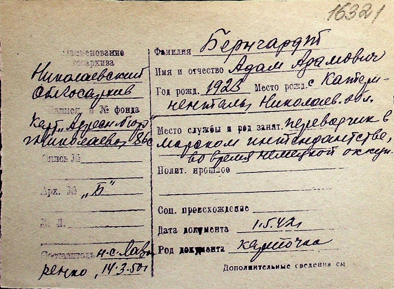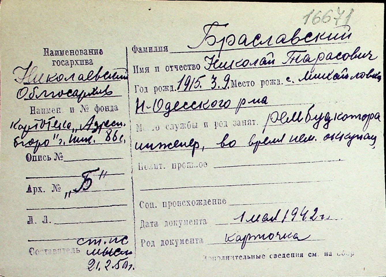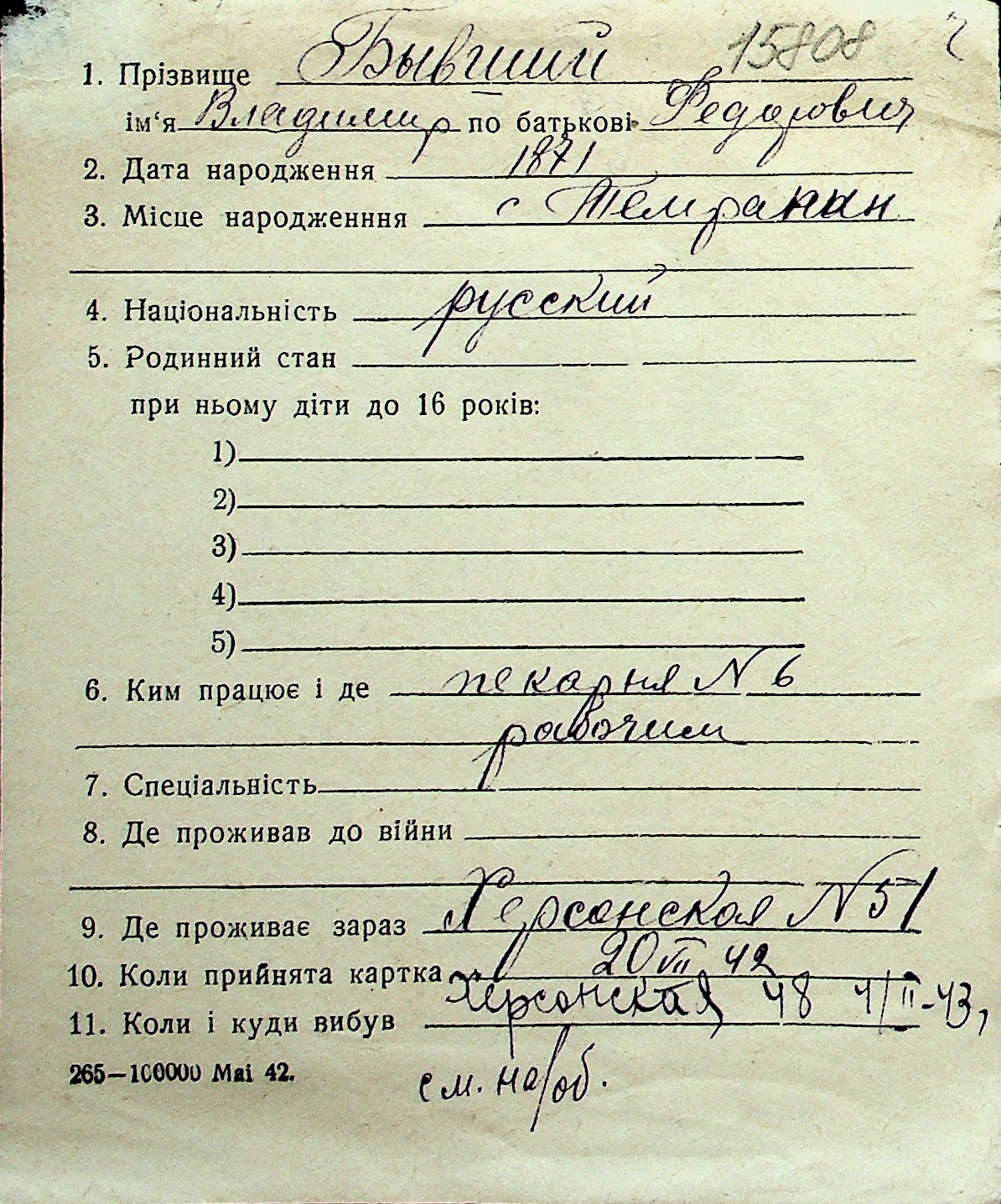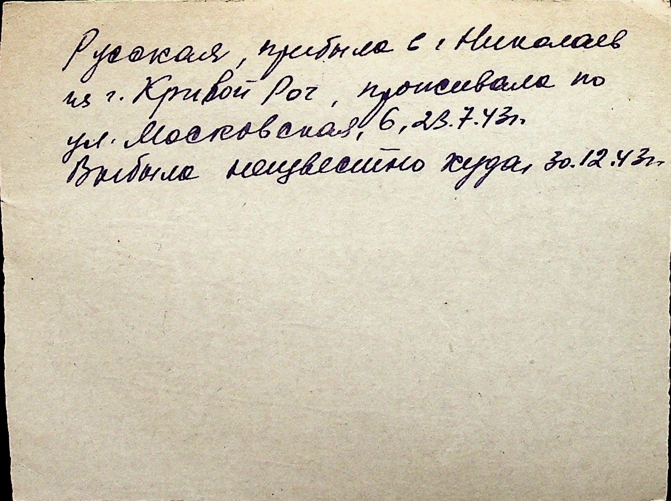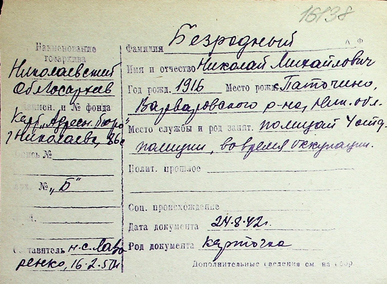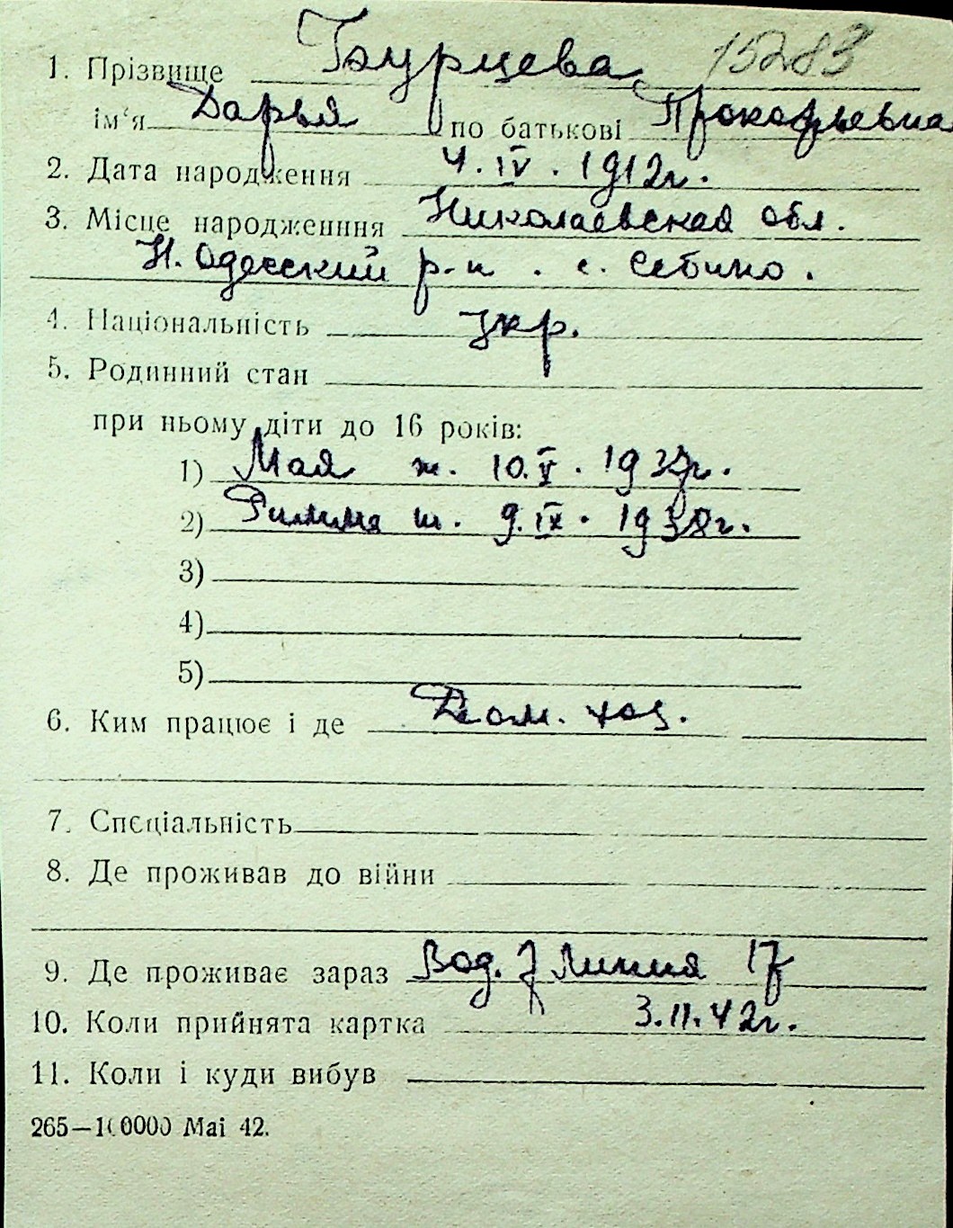 ◦ ◦ Перелік карток на осіб, які мешкали у м. Миколаїв у період окупації 1941–1944 років