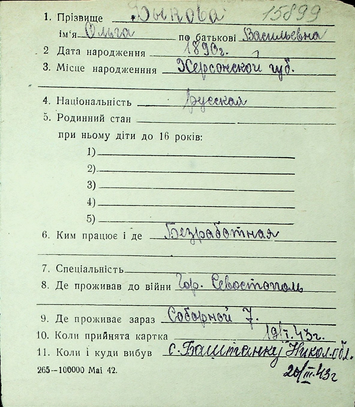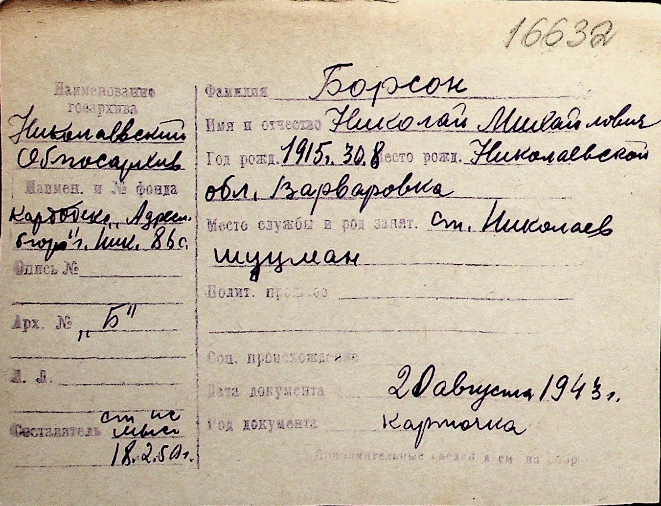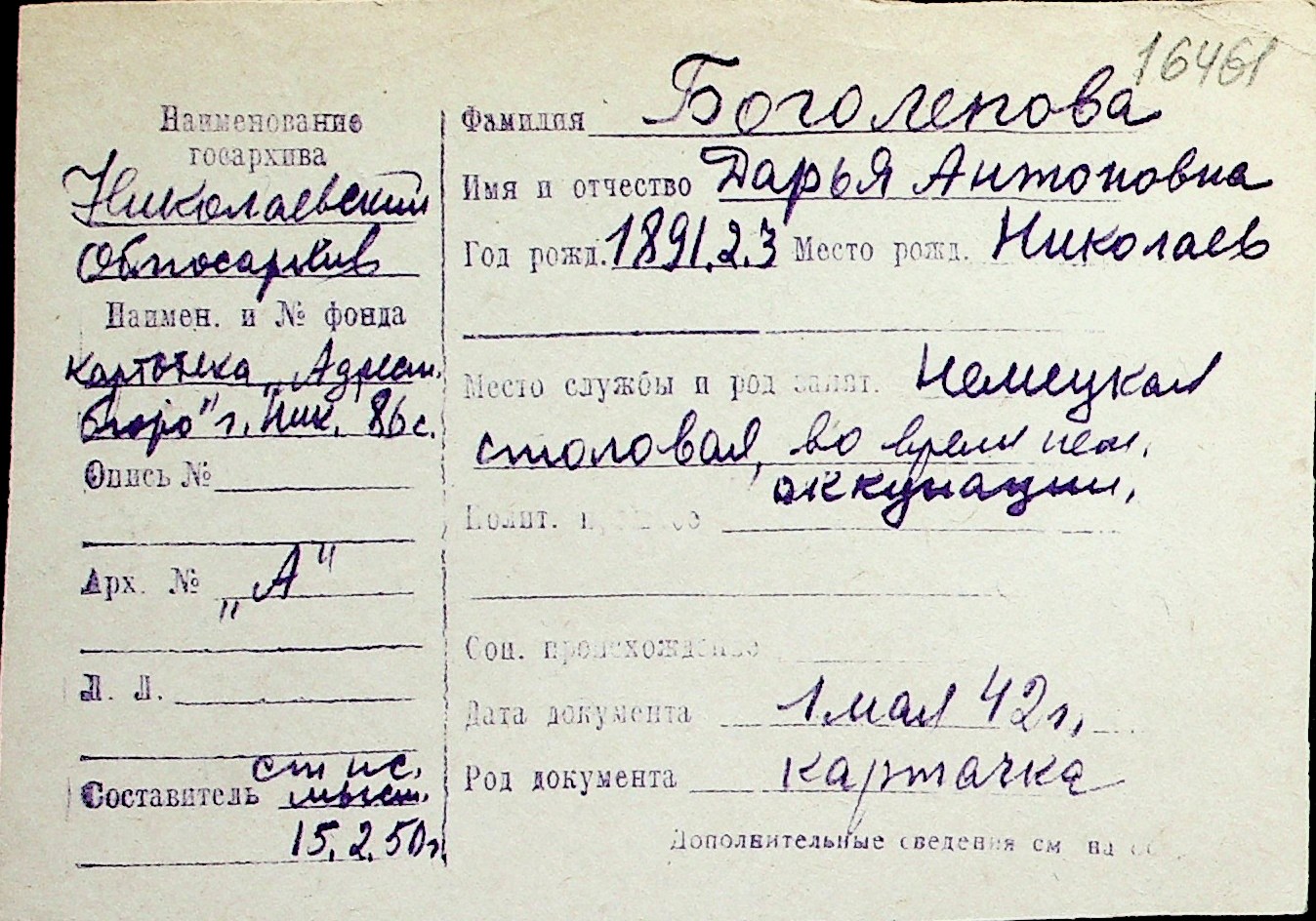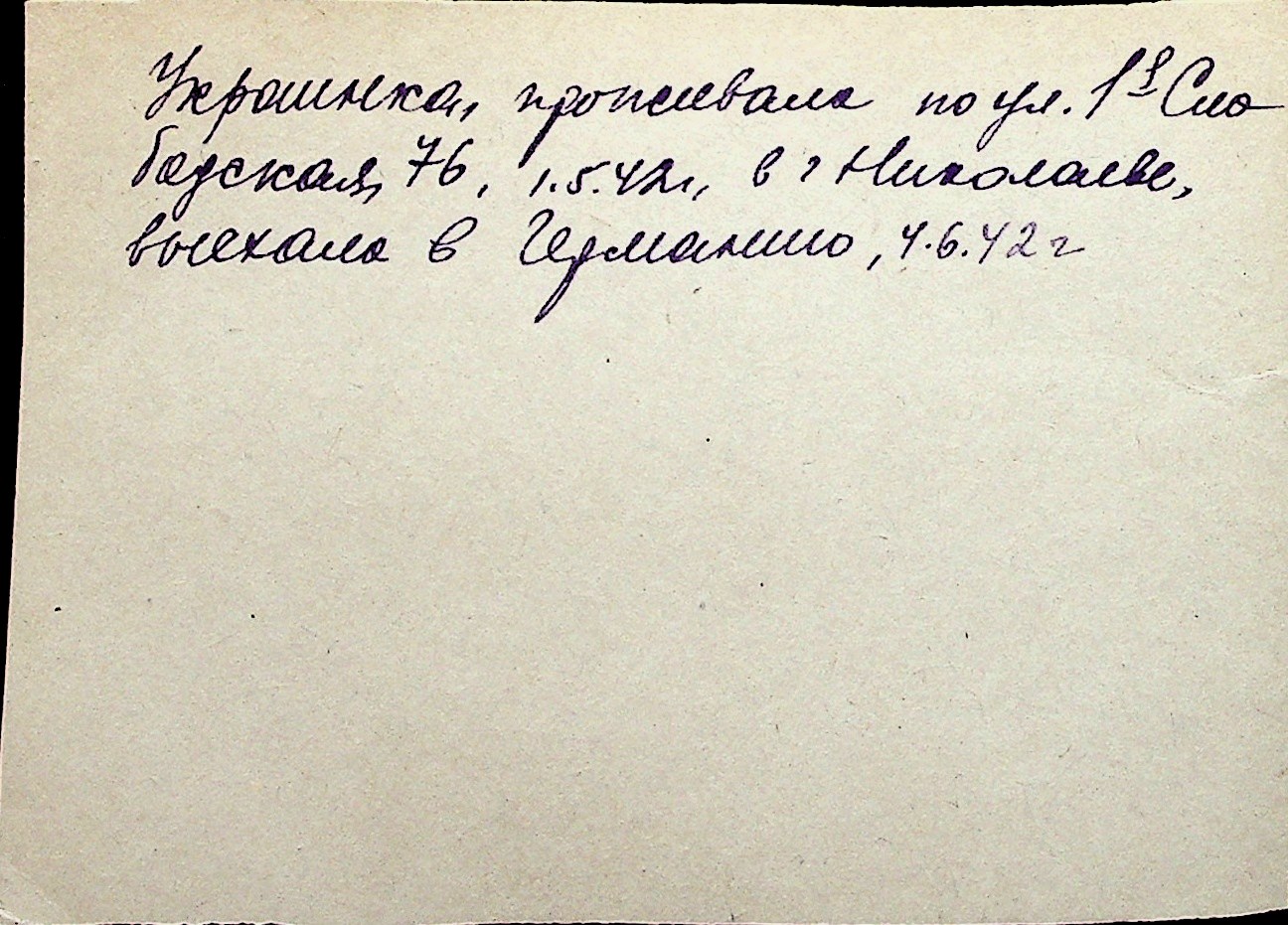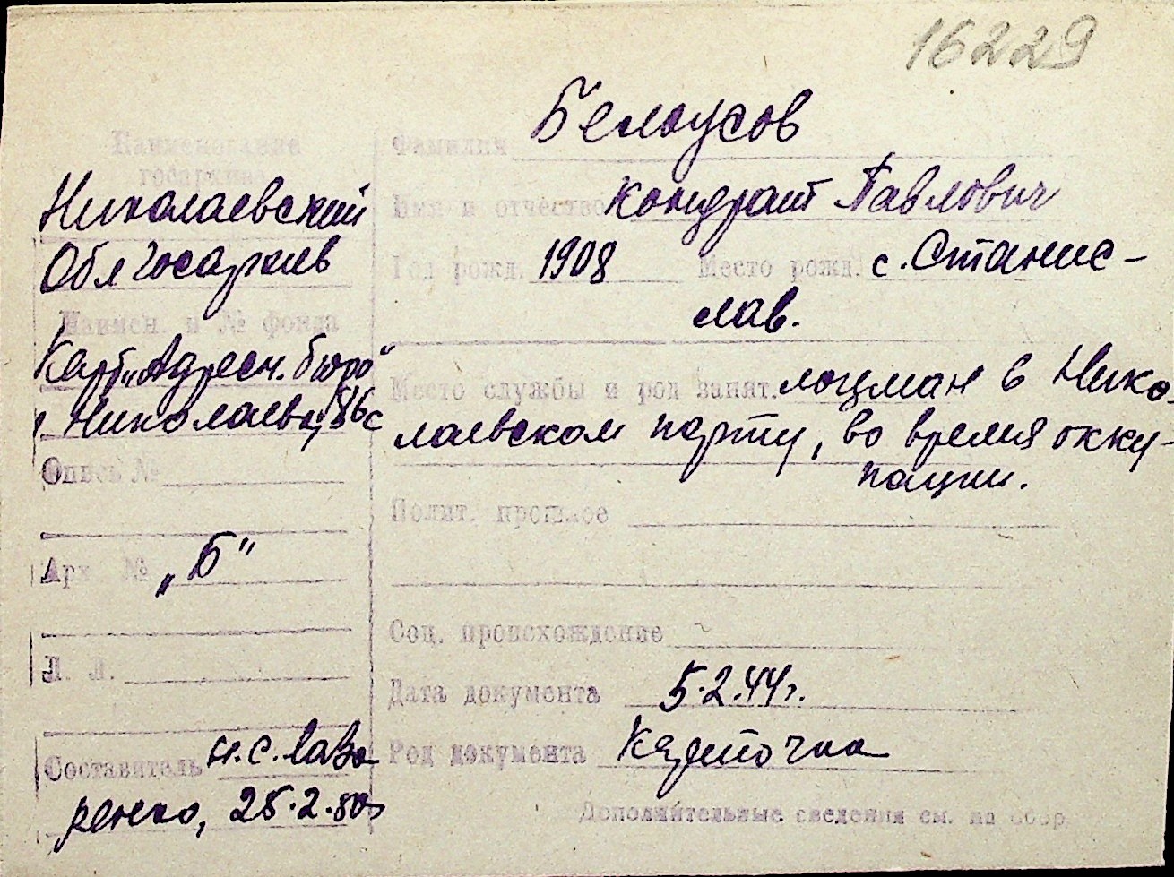 ◦ ◦ Перелік карток на осіб, які мешкали у м. Миколаїв у період окупації 1941–1944 років