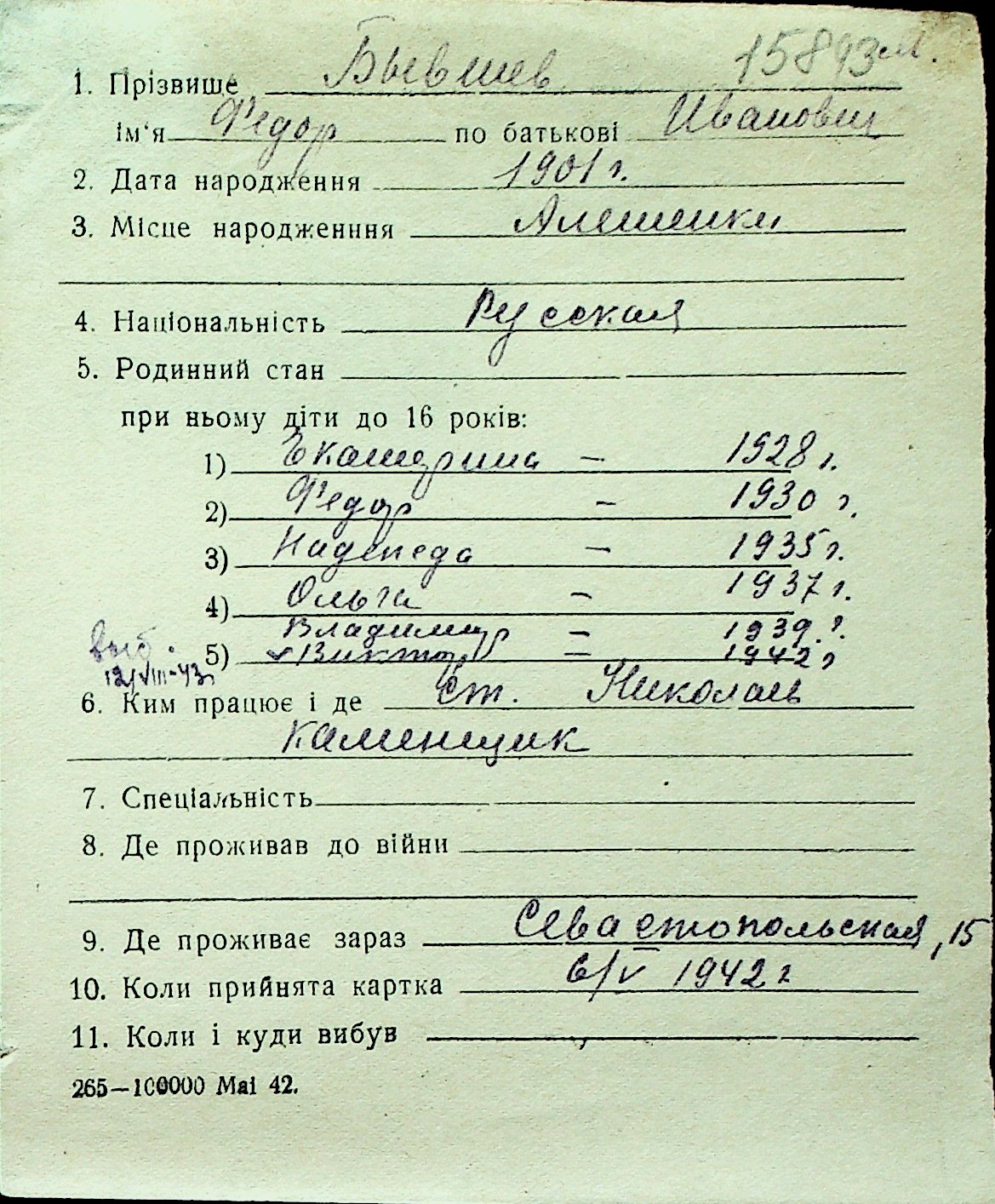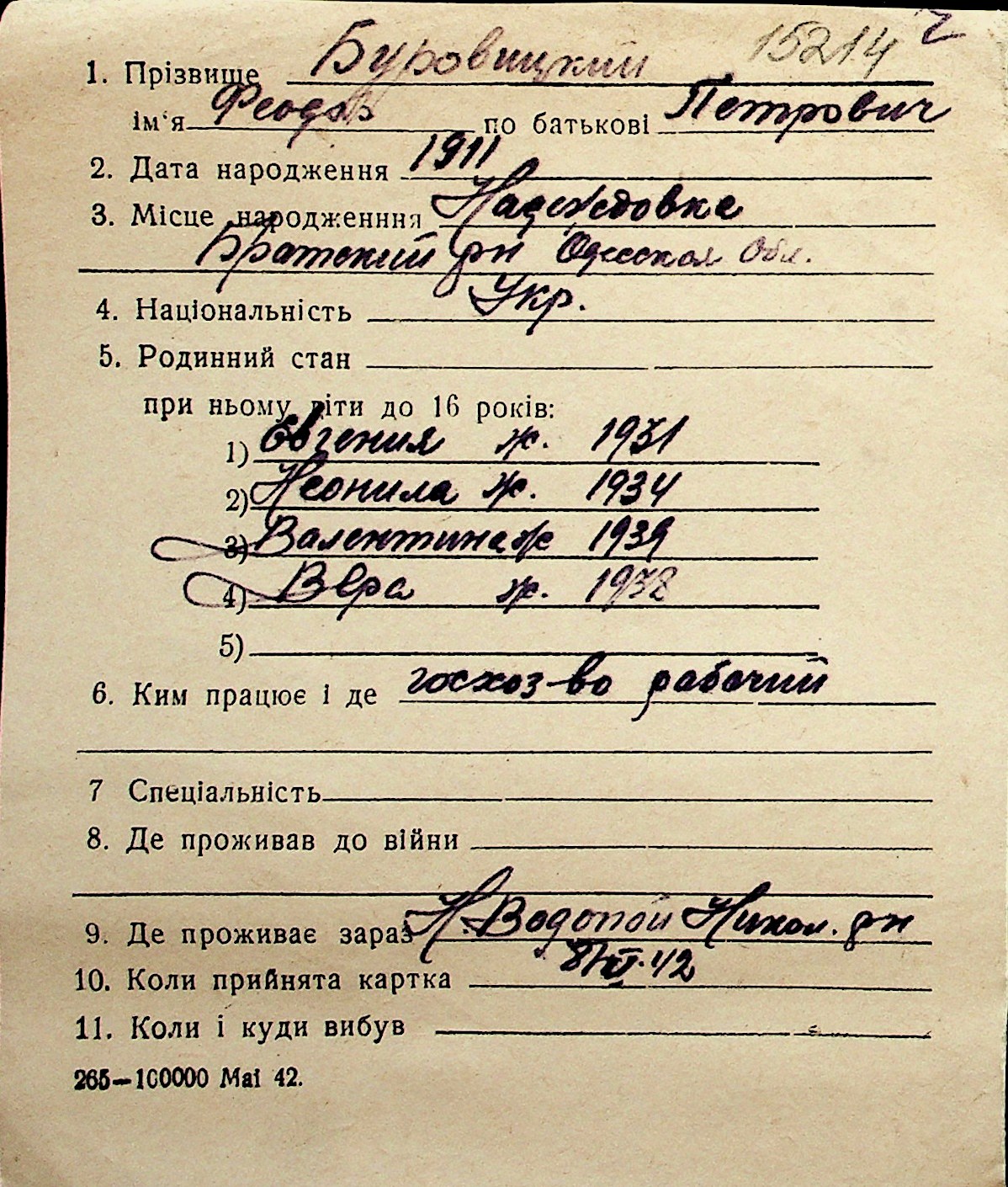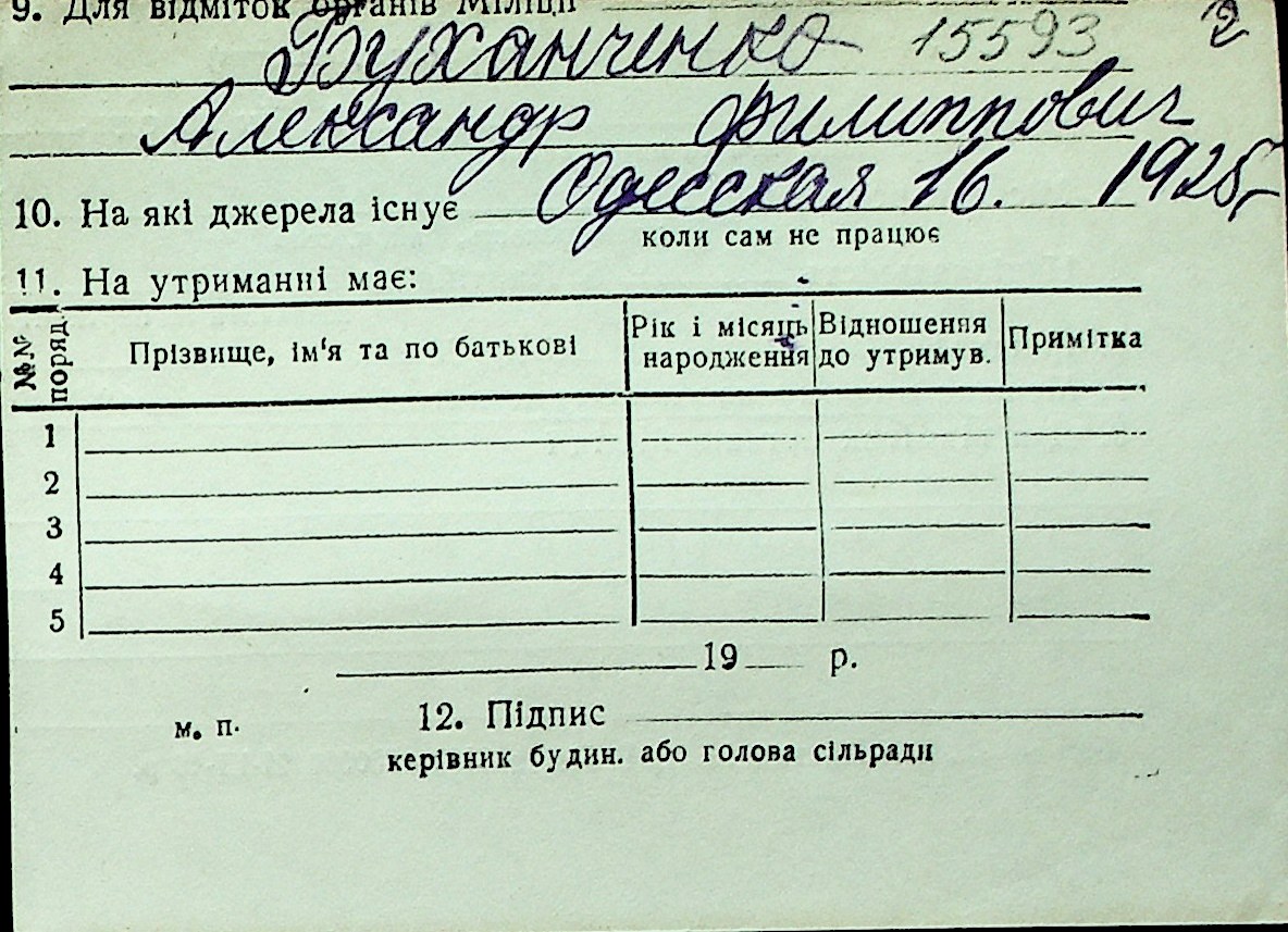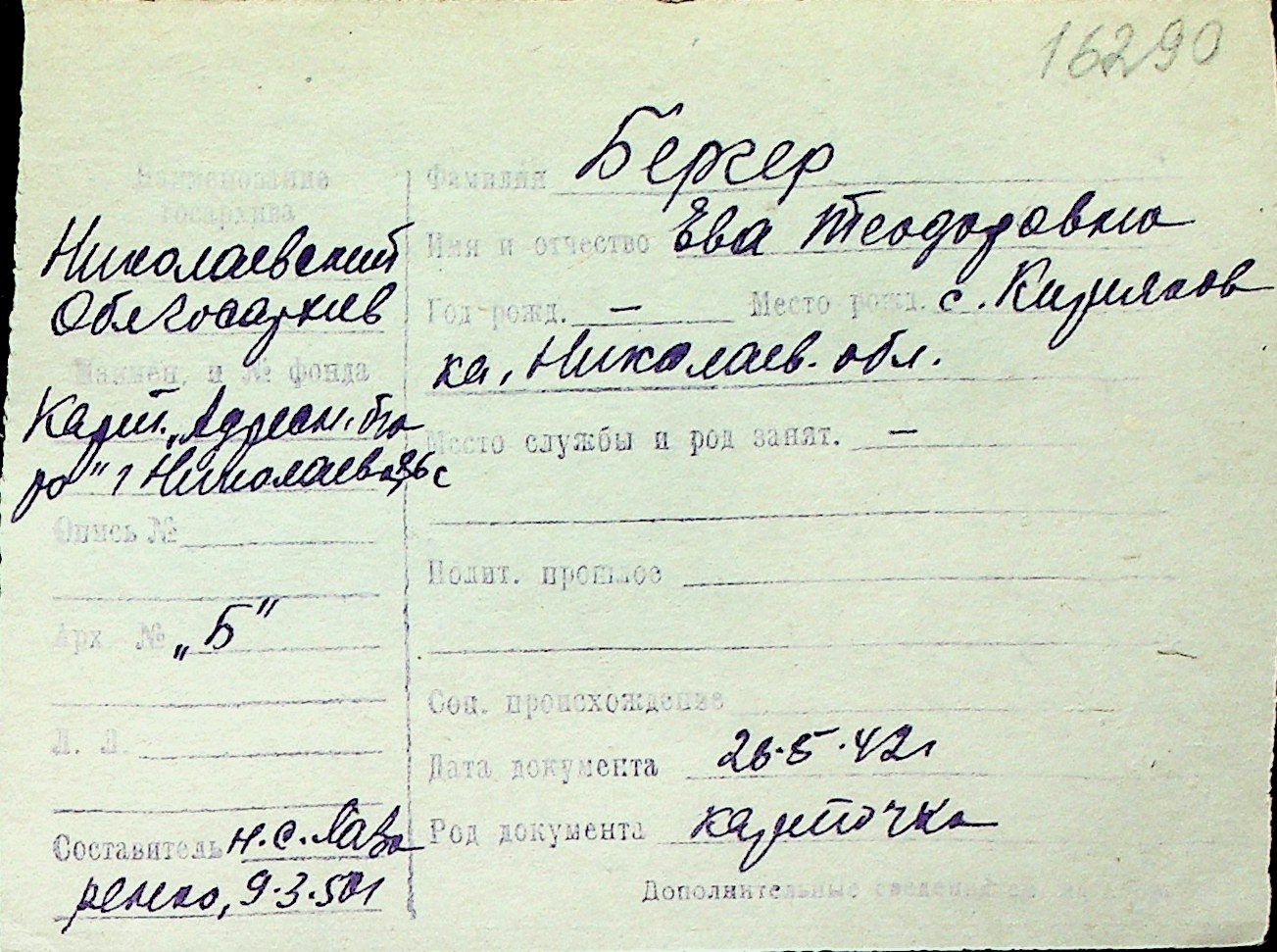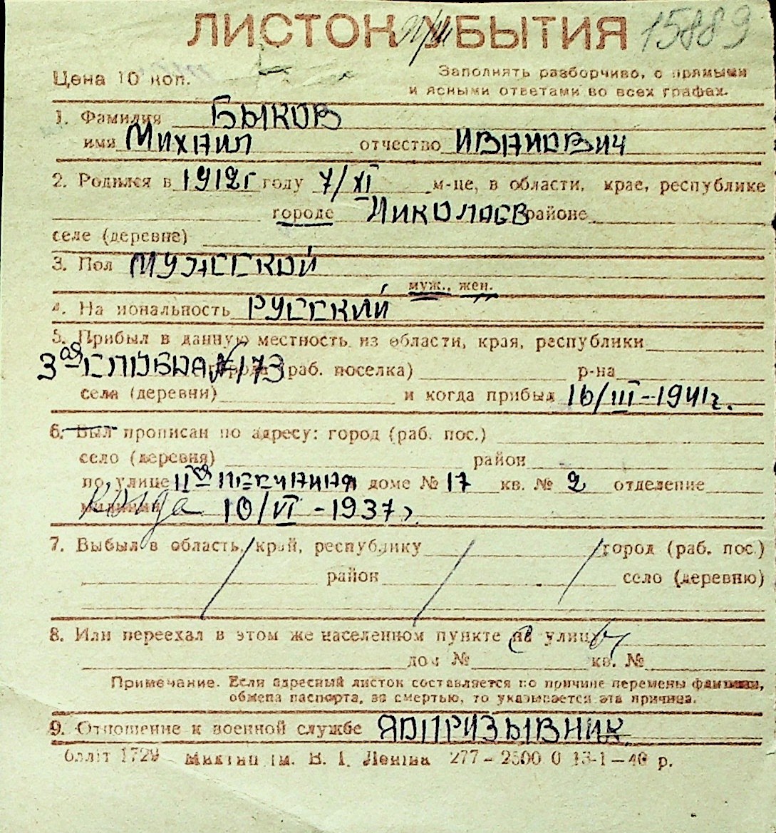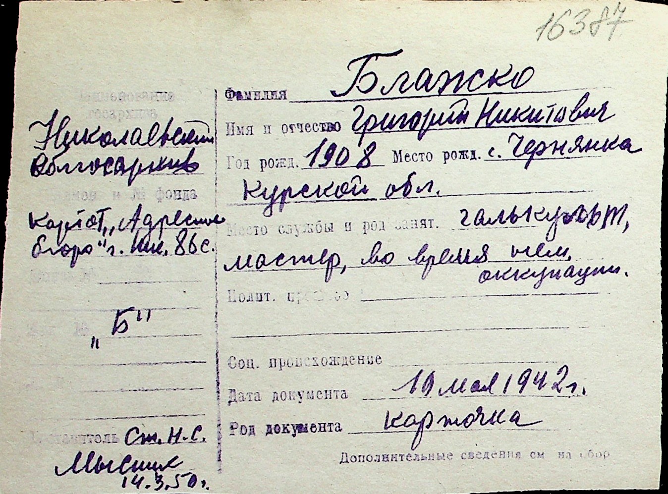 ◦ ◦ Перелік карток на осіб, які мешкали у м. Миколаїв у період окупації 1941–1944 років